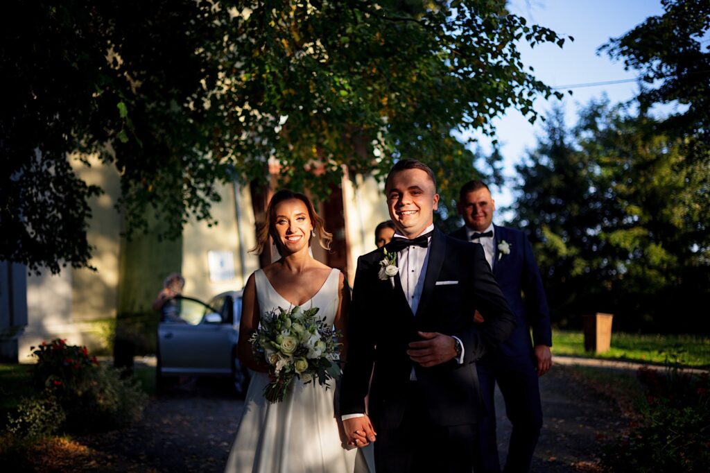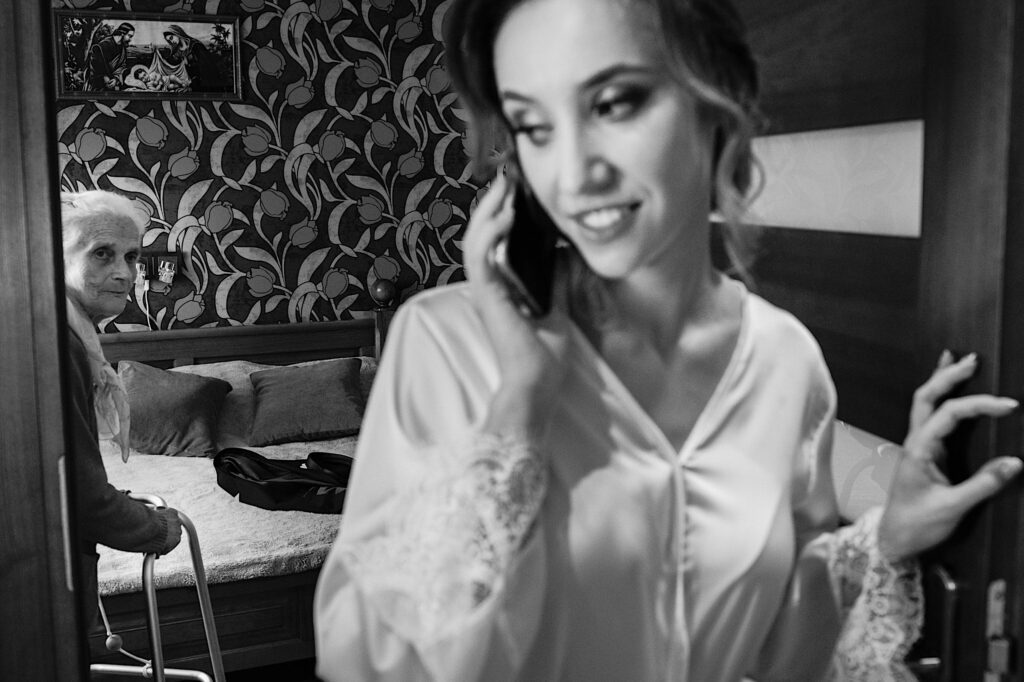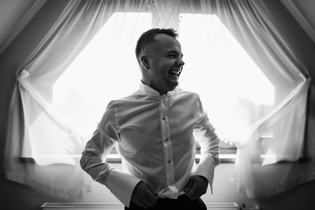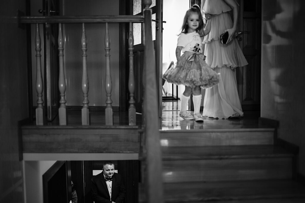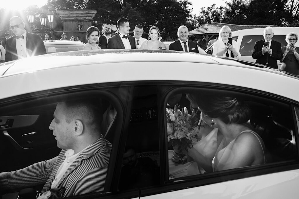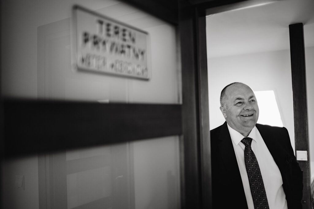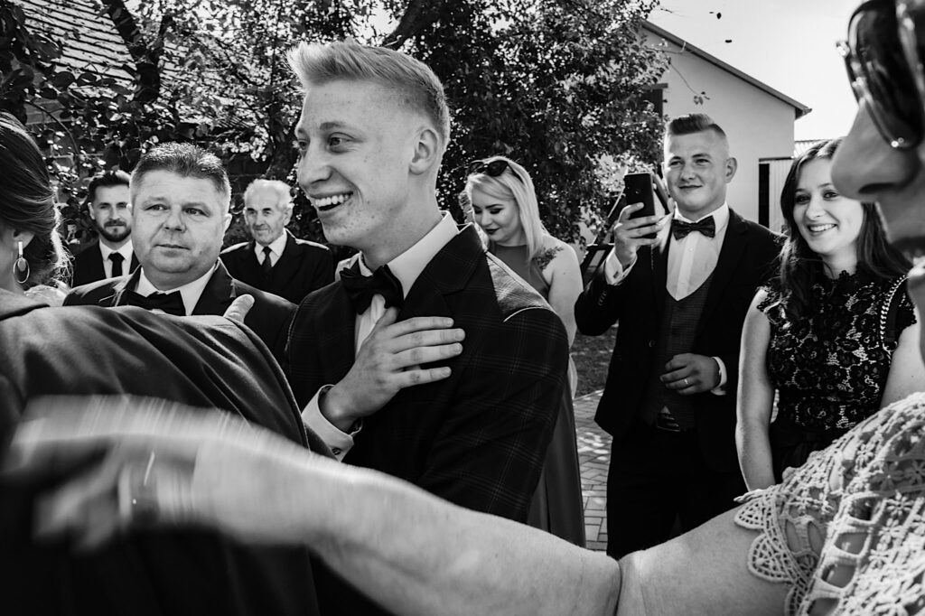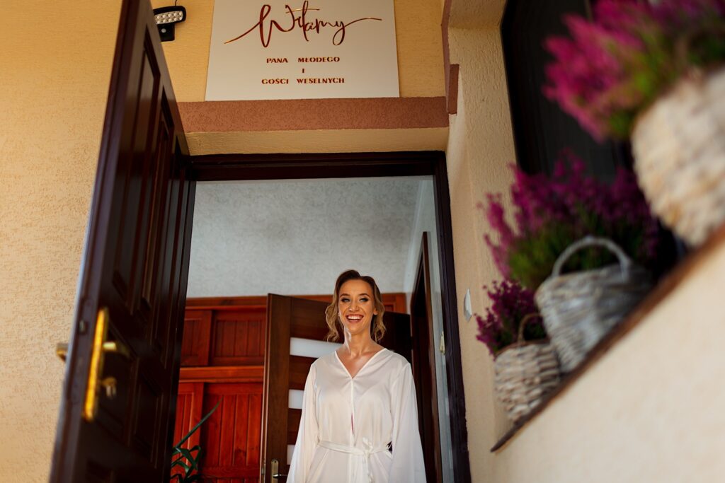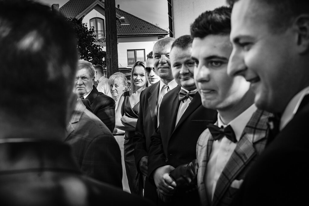 Dzień ślubu rozpocząłem razem z zaprzyjaźnioną ekipą BM Studio w posiadłości państwa Mazurów. Na miejscu więcej drewna niż w niejednym tartaku. Ba! Nawet w lesie bywa mniej 🙂 Na szczęście mam na myśli to prawdziwe! Jeśli chodzi o ludzi, to zero “drewna”. Wszyscy mega uśmiechnięci i ekspresyjni. Oczywiście najpierw usłyszałem, a dopiero później zobaczyłem Pana Młodego. Trochę żartów, oglądanie pojazdu rodem z ghostridera, lekkie kosztowanie dobrych trunków, krótkie ubieranie, kilka portretów i w drogę do Agaty. Przywitała nas oczywiście… uśmiechem od ucha do ucha. Jaka Agata, taka rodzinka. Od przeuroczej Babci po wnuki – wszyscy uśmiechnięci. Nawet pająki były w dobrym humorze. Ganianie za kotem, papierosek z Dziadziem, kilka toastów, szybkie ubieranko, portrety i przybył Mateusz, z całą bandą! Targowania zdawać by się nie było końca. Ale jak już skończyli to nasi zakochańce mogli wpaść w swoje ramiona. Błogosławieństwo, sesja rodzinna i czas na ceremonię, która odbyła się w Parafii pw. App Piotra i Pawła w Tarnawatce.