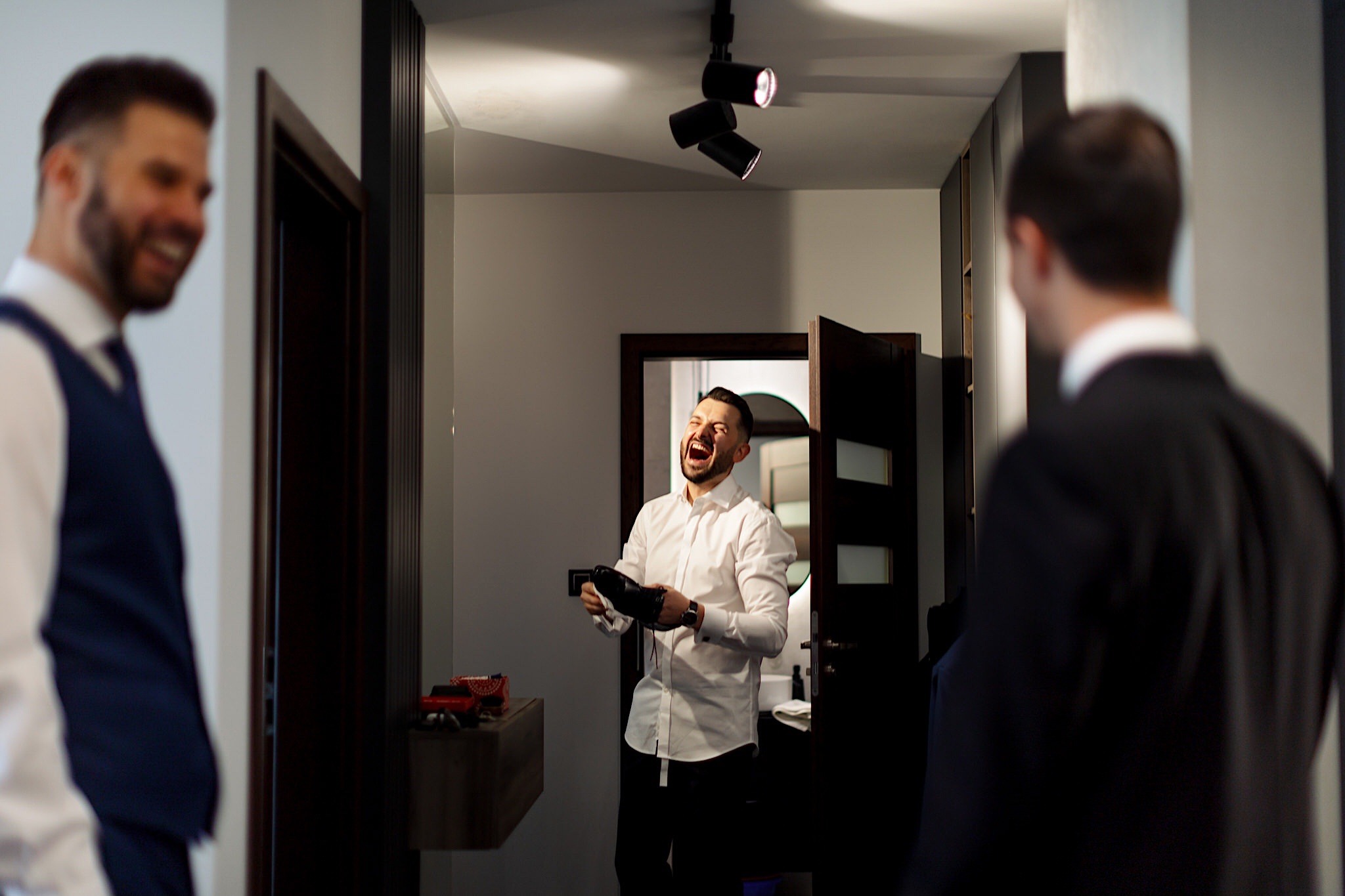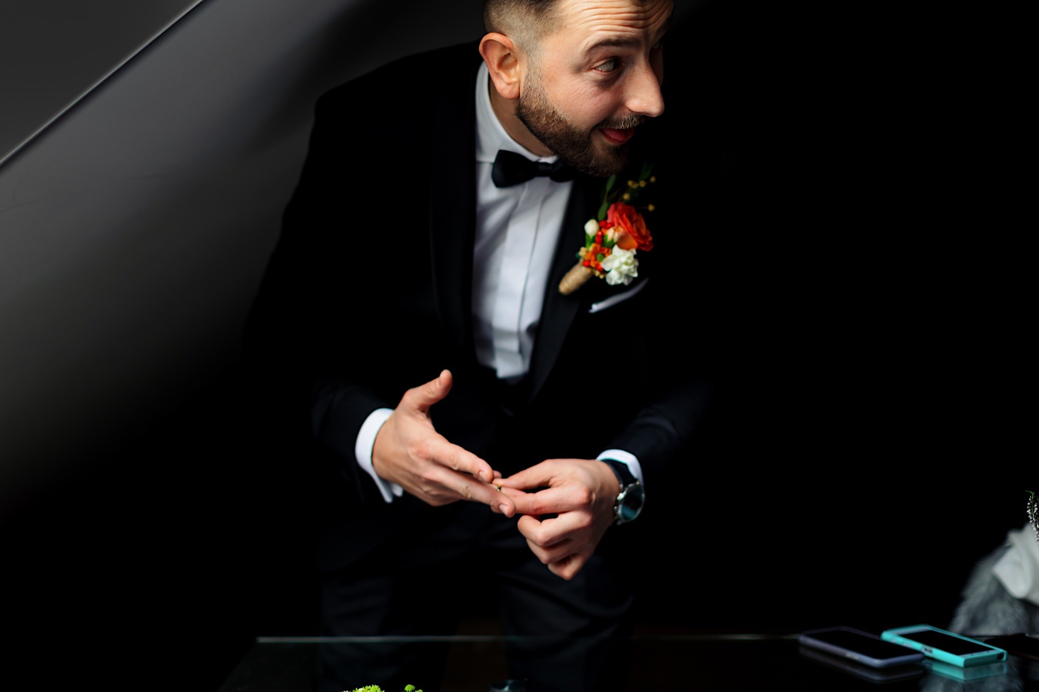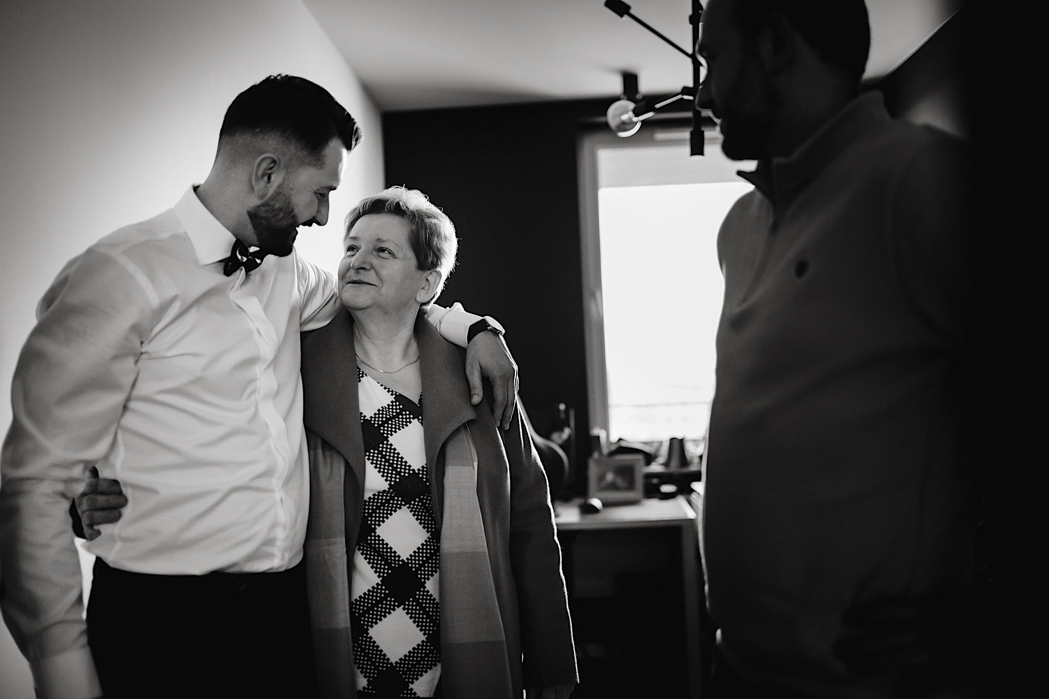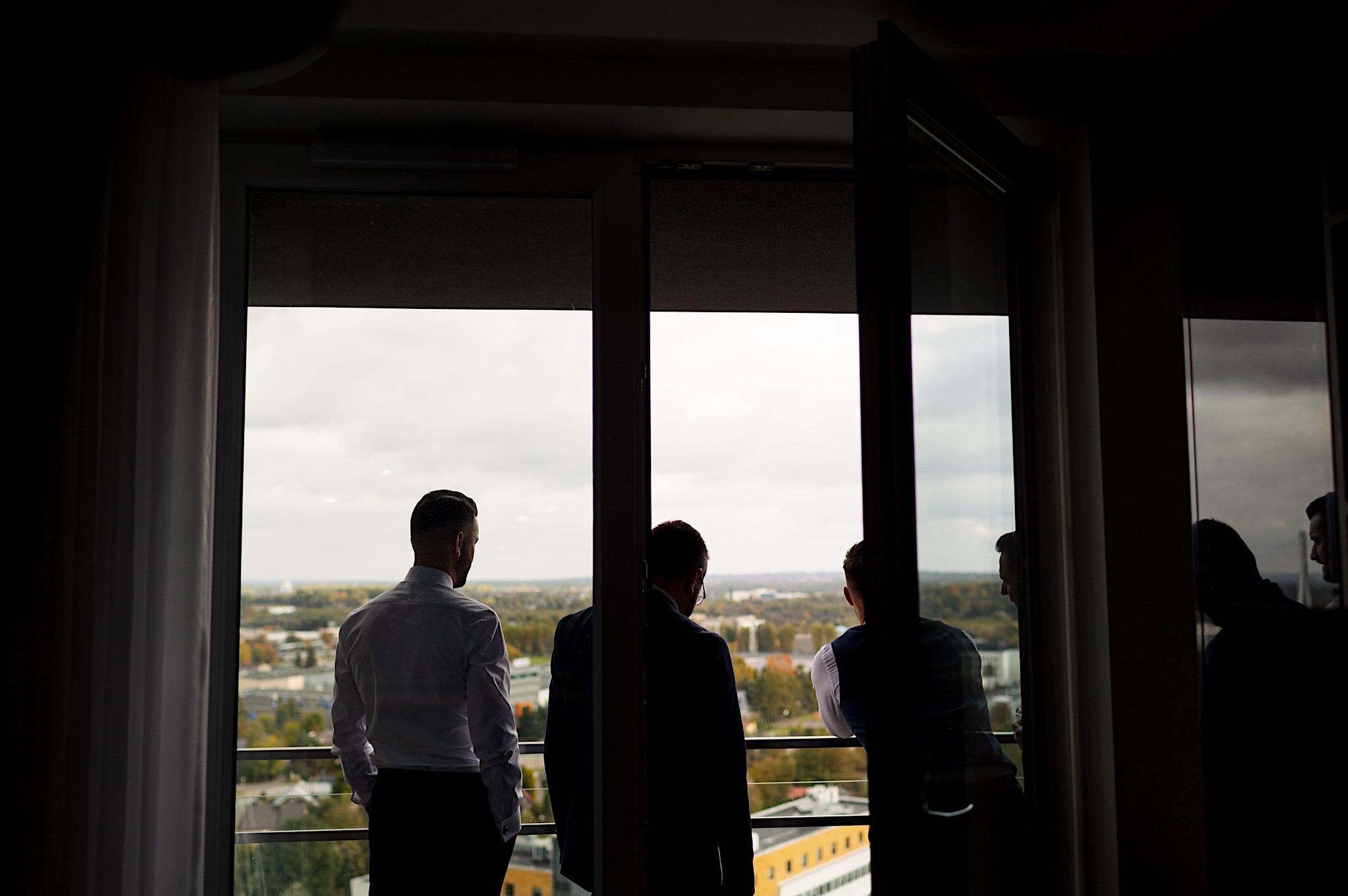 Dzień wesela rozpocząłem od podróży do Rzeszowa. Tam wysoko, wysoko w chmurach czekał na mnie Mariusz. To zapewne symbolizowało jego niebiański nastrój tego dnia. Krótkie czesanie i zaczęli się zjeżdżać kumple. Mnóstwo żartów, testy szwów w spodniach, przeglądanie się w bucie, wojna na megapixele, kilka drinków, wspominanie kawalerskiego, oficjalnie ubieranie butów i przyszedł czas na wizytę u Gosi. Na wstępie przywitały mnie…koty i jeszcze więcej Druhen. Wszystkie uśmiechnięte i rozbiegane. Sporo żartów, słuchania piosenek z panieńskiego, przenoszenia sukni z kąta w kąt, malowanie, ratowanie opasek, robienie nowego bukietu, kilka toastów, szybkie ubieranie, portrety i przybył Mariusz z bandą. Weszli z buta (dosłownie!). Uściski, całuski, błogosławieństwo, próba pierwszego tańca i czas na najważniejszy punkt tego dnia – Ceremonię.