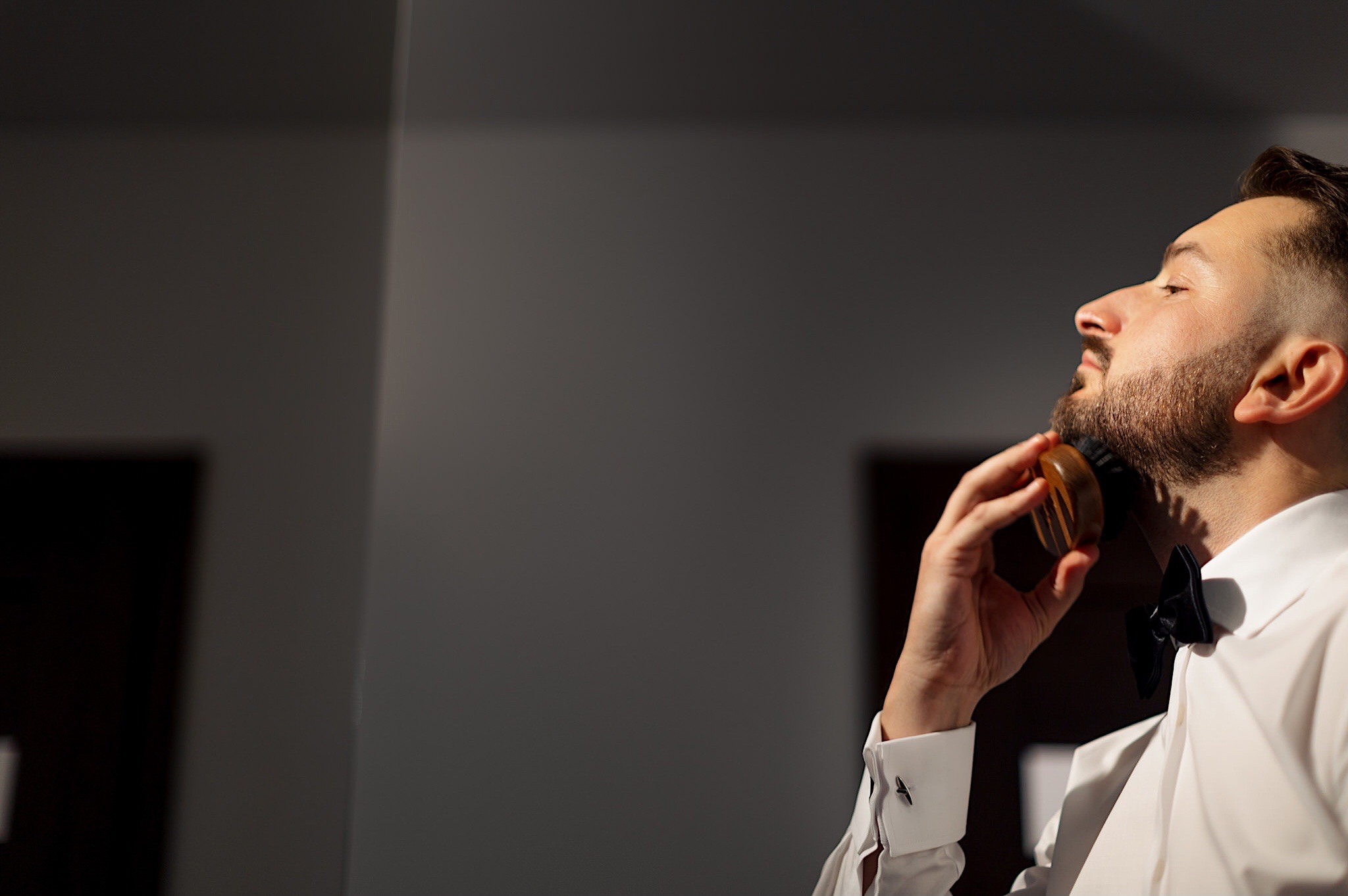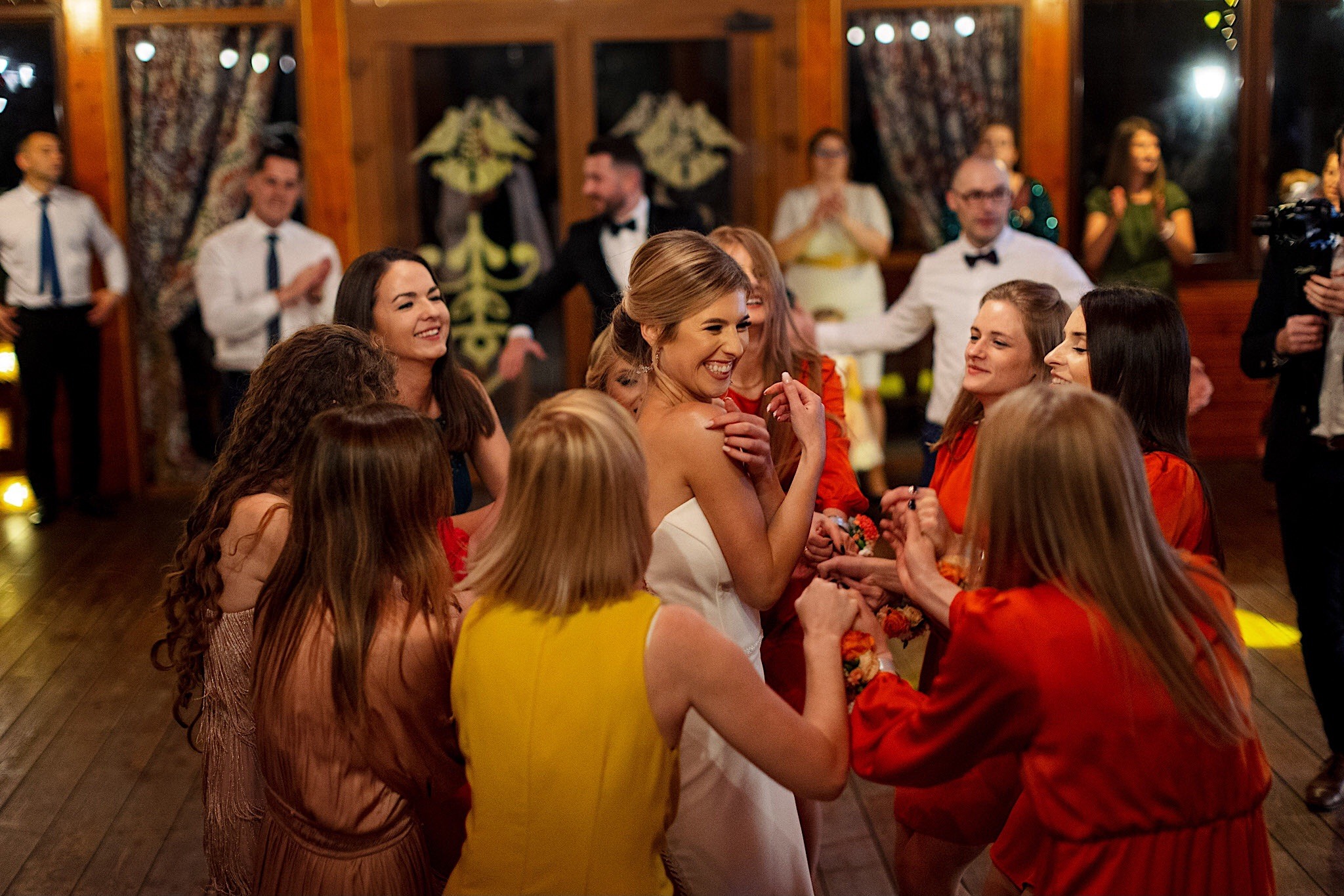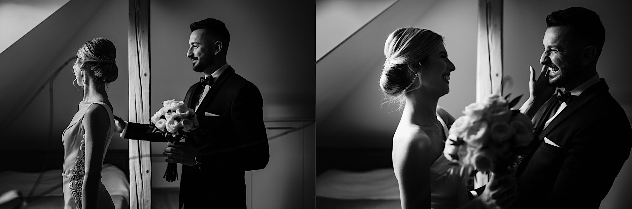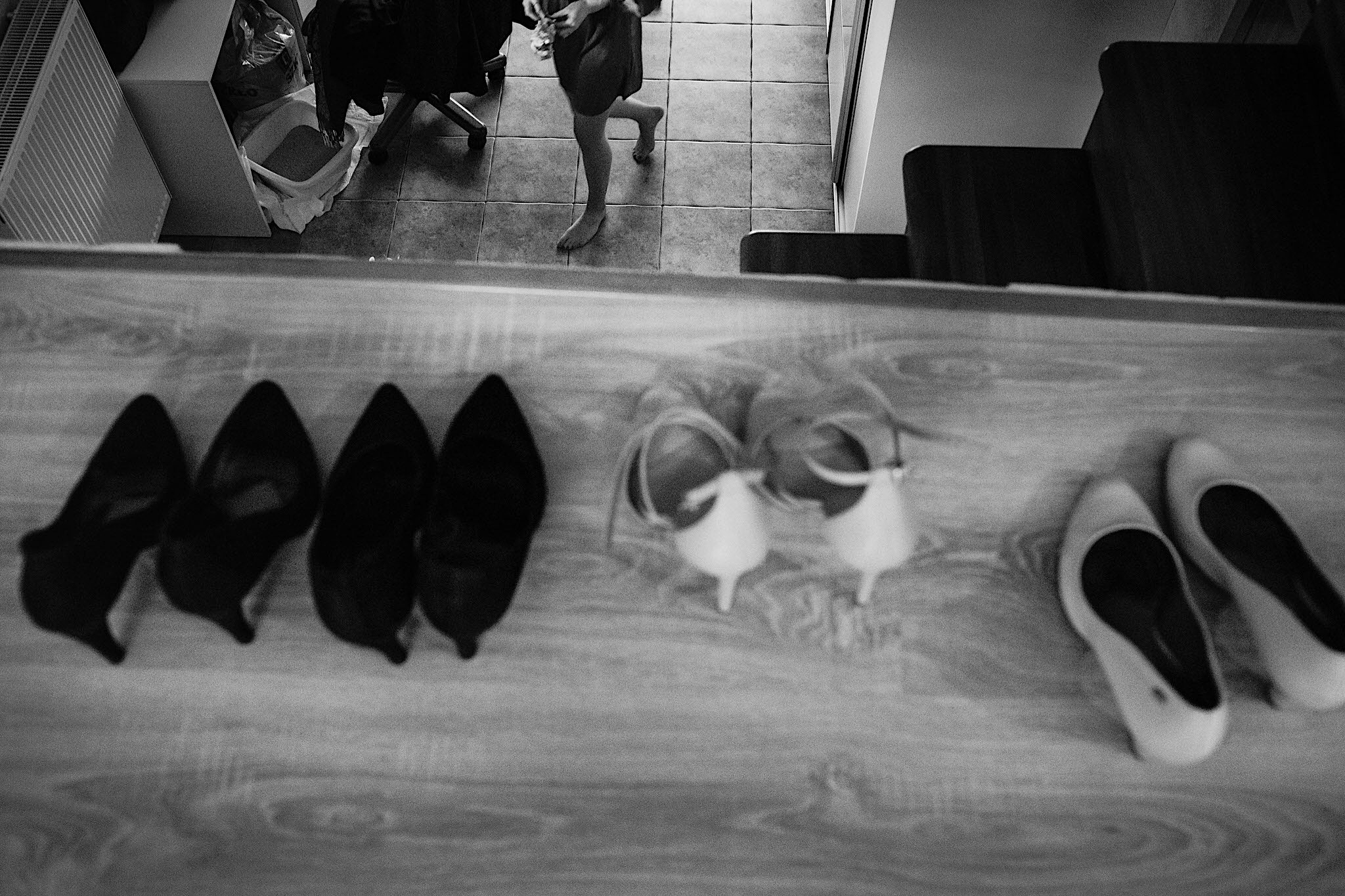 Dzień wesela rozpocząłem od podróży do Rzeszowa. Tam wysoko, wysoko w chmurach czekał na mnie Mariusz. To zapewne symbolizowało jego niebiański nastrój tego dnia. Krótkie czesanie i zaczęli się zjeżdżać kumple. Mnóstwo żartów, testy szwów w spodniach, przeglądanie się w bucie, wojna na megapixele, kilka drinków, wspominanie kawalerskiego, oficjalnie ubieranie butów i przyszedł czas na wizytę u Gosi. Na wstępie przywitały mnie…koty i jeszcze więcej Druhen. Wszystkie uśmiechnięte i rozbiegane. Sporo żartów, słuchania piosenek z panieńskiego, przenoszenia sukni z kąta w kąt, malowanie, ratowanie opasek, robienie nowego bukietu, kilka toastów, szybkie ubieranie, portrety i przybył Mariusz z bandą. Weszli z buta (dosłownie!). Uściski, całuski, błogosławieństwo, próba pierwszego tańca i czas na najważniejszy punkt tego dnia – Ceremonię.