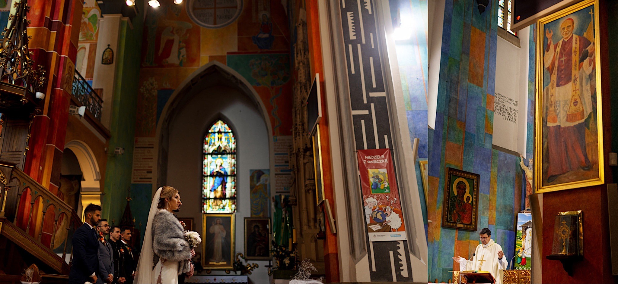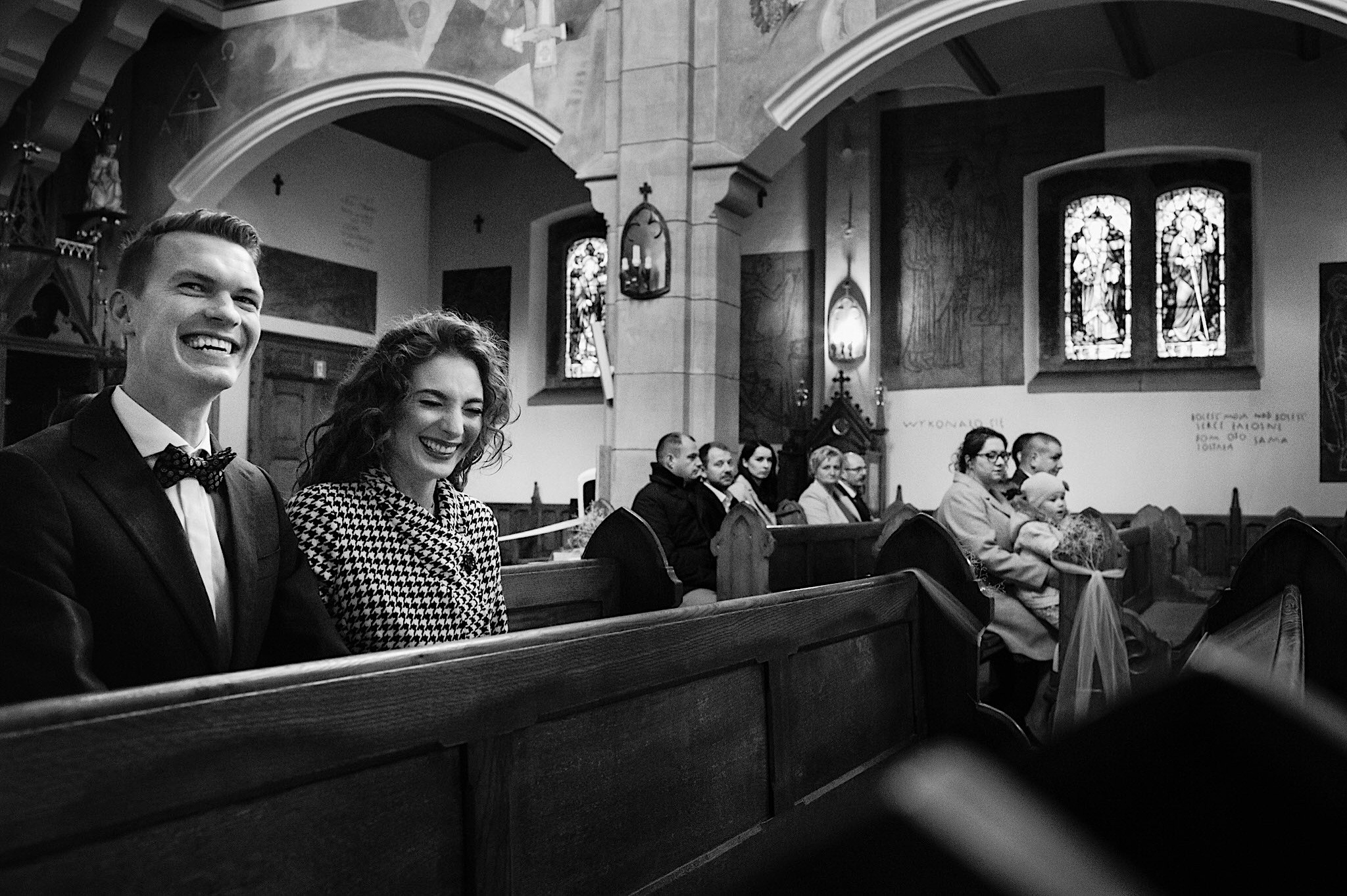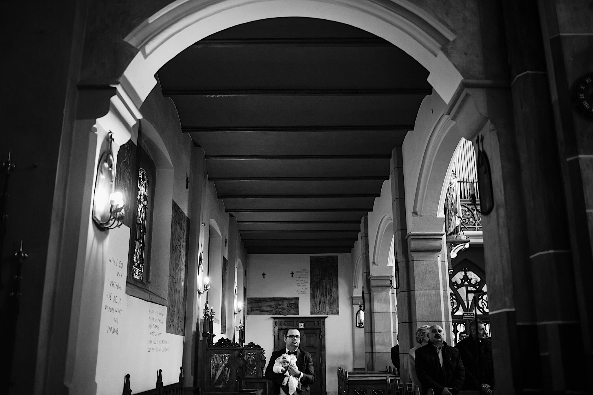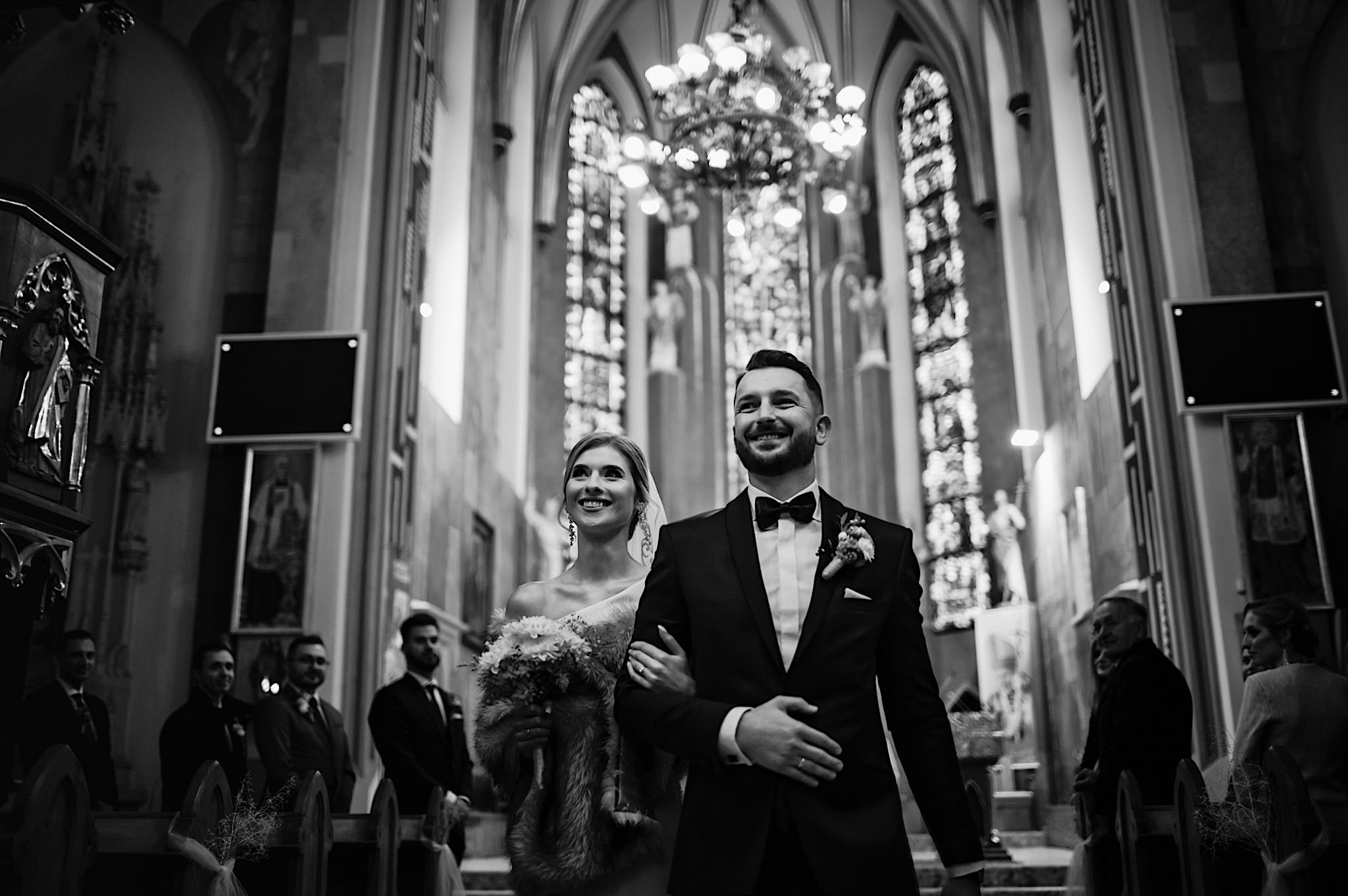 Ta odbyła się w Parafii św. Józefa w Rzeszowie. Spory przestrony kościół z ciekawą architekturą. A w środku mnóstwo uśmiechniętych twarzyczek. Na wstępie małe zamieszanie ze wstęgą, którą sam miałem okazję przeciąć 🙂 Msza skrojona na miarę naszych dzisiejszych bohaterów z wszechobecnymi emocjami i iście królewskim podaniu obrączek przez drużbę. Te wylądowały na właściwych paluszkach i po wystrzałach przyszedł czas na imprezę w Altanie Siwy Dym – Hotel Cztery Pory Roku.