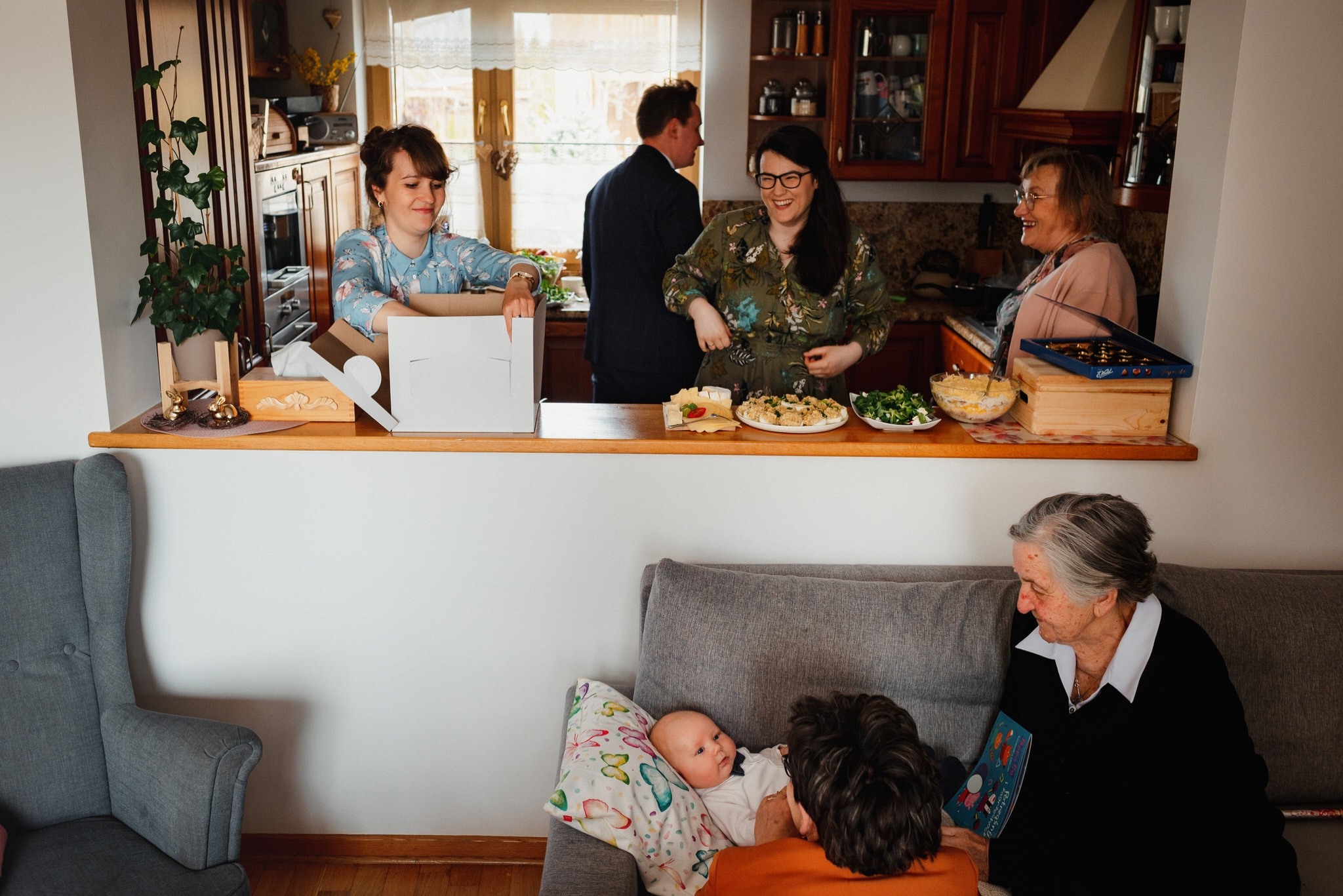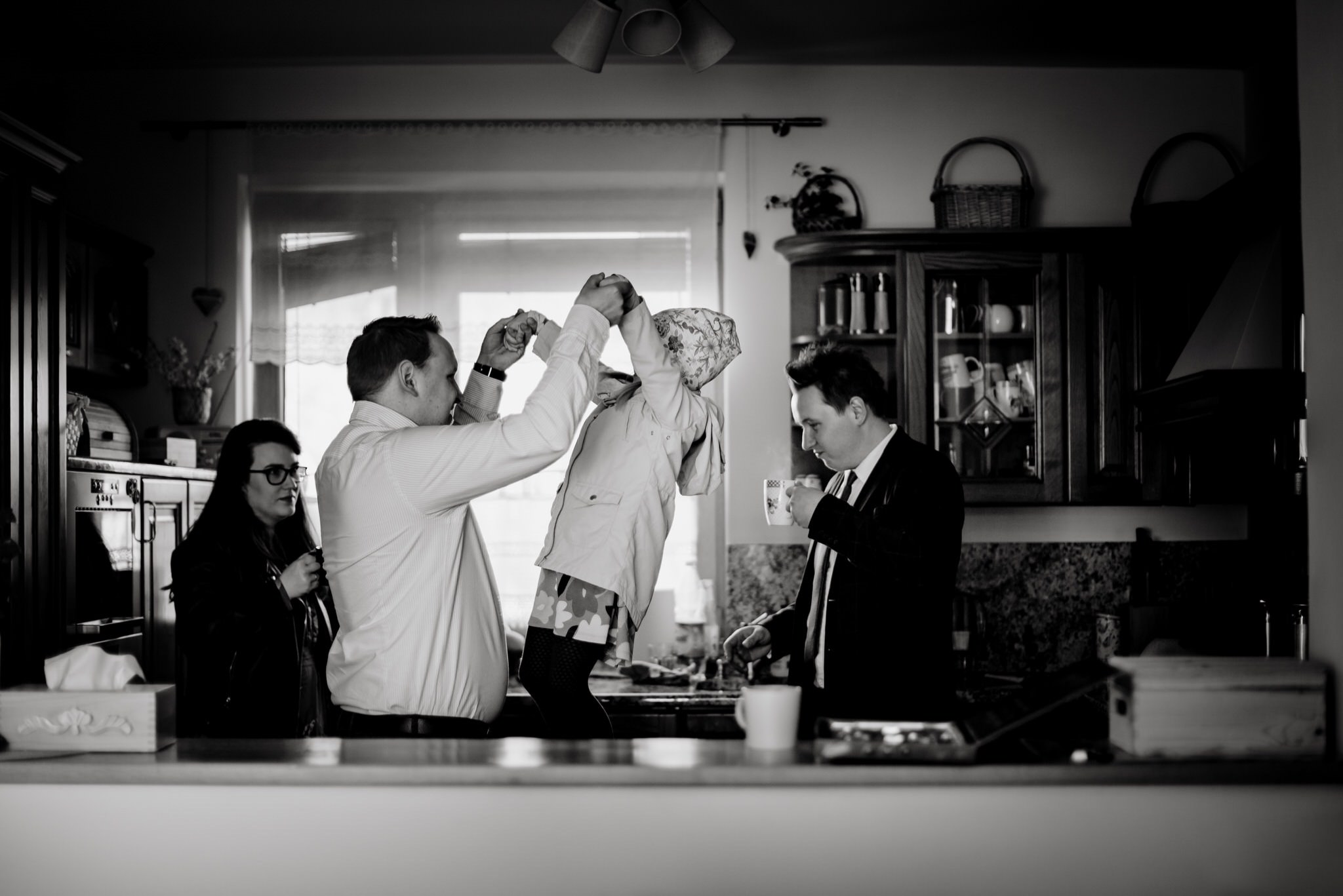 Ten wesoły dzień rozpoczęliśmy od “przygotowań” w rozśpiewanym domu. Od progu powitały mnie szerokie uśmiechy domowników i najbliższej rodziny. Mnóstwo zdjęć na ścianach pokazały mi jak ważne są dla nich zatrzymane w fotografiach chwile. Na szczęście miałem też stworzone idealne warunki do “łapania momentów”. Biegające dzieciaki, udawanie Mikołaja, wspólne rozmowy, żarty, krótkie ubieranie i wszechobecni rozweseleni domownicy.