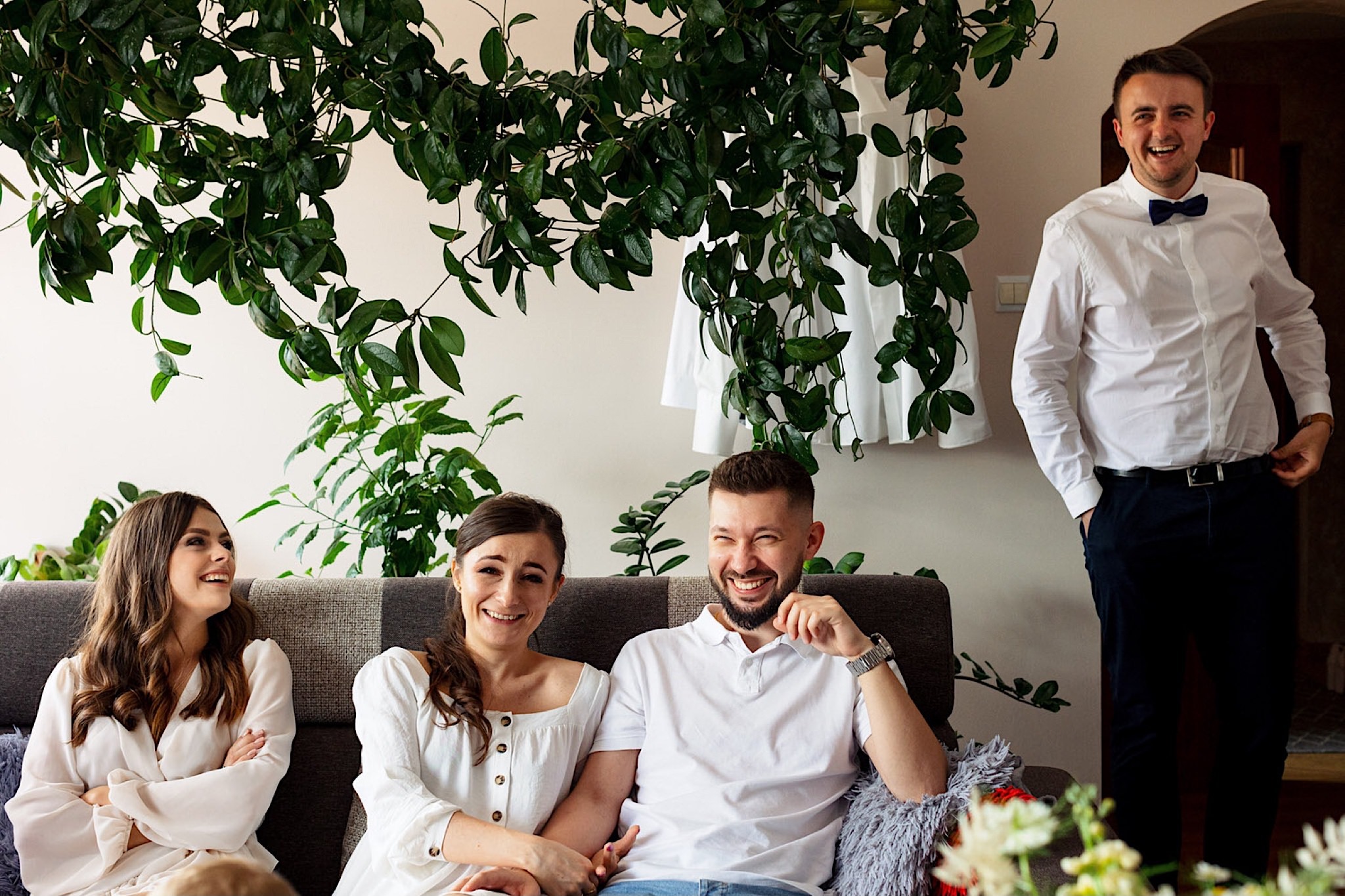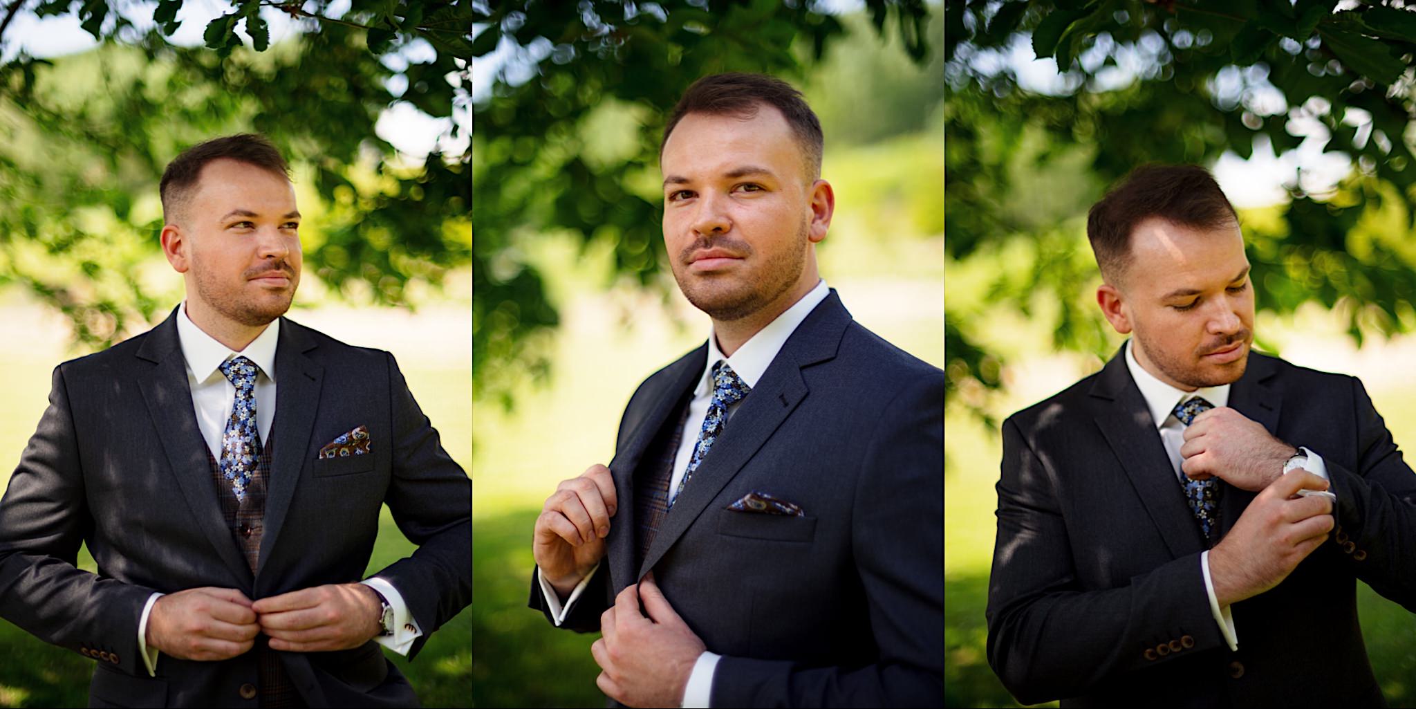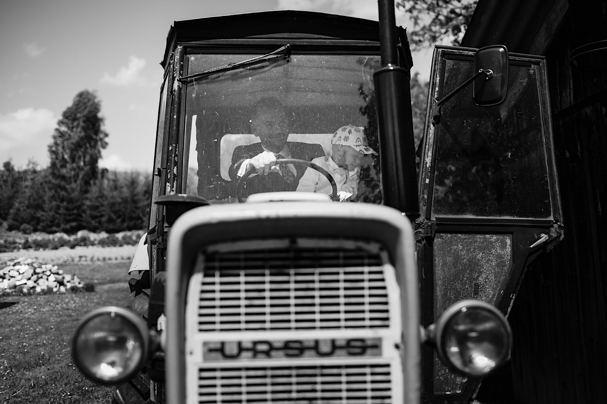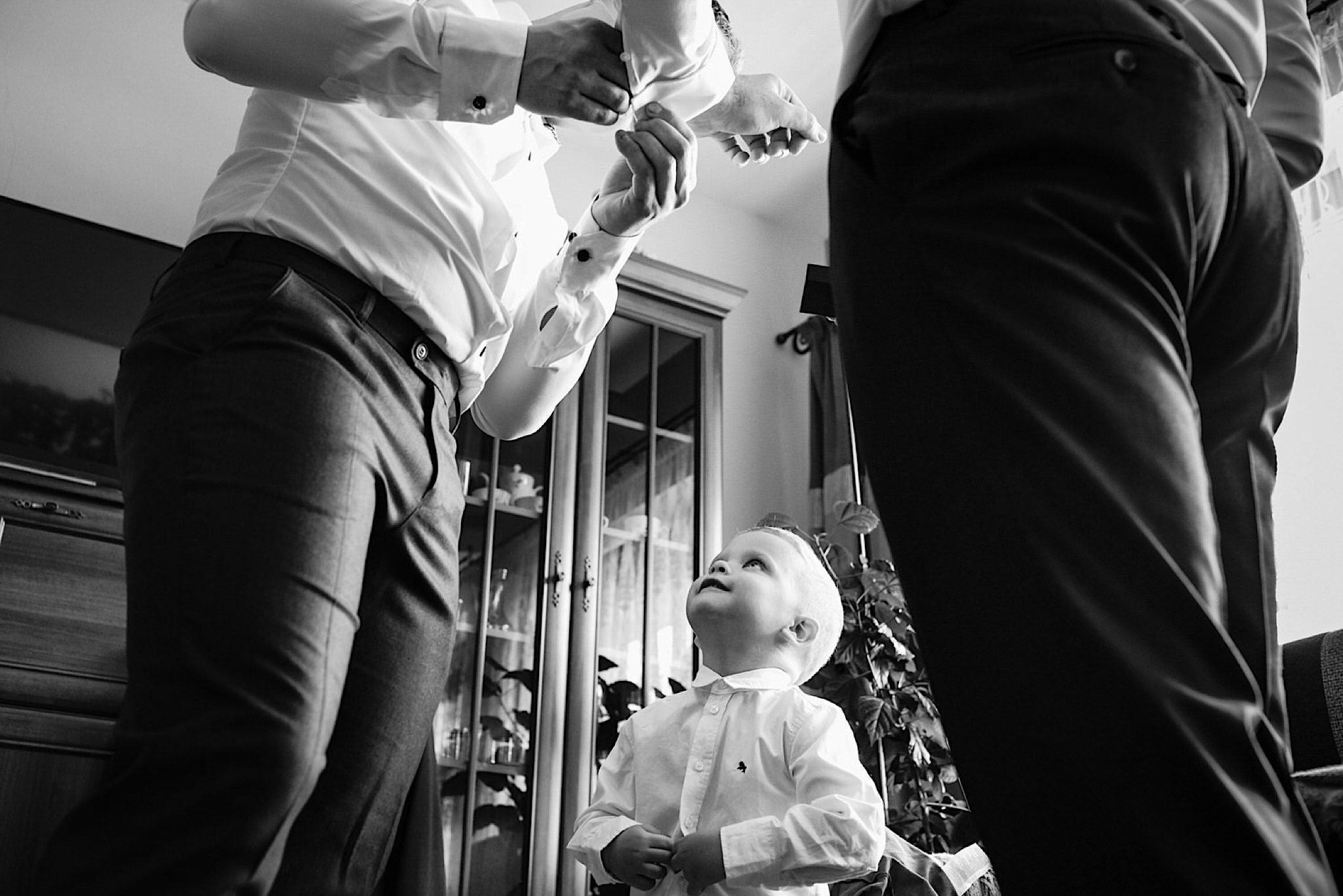 Dzień wesela rozpocząłem od wizyty w domu rodzinnym Kondzia. A tam to co lubię najbardziej. Sporo ludzi, duża przestrzeń i same uśmiechnięte Mordeczki. Do tego wszechobecny brzdąc. Nasz Pan Młody zaplanował wszystko, nawet kostki do whisky symbolizowały jego duszę romantyka 🙂 Sporo żartów, męskiej bielizny (o właśnie, będzie dopłata!:)), oglądania starych rodzinnych zdjęć, biegania po schodach, przejażdżka Ursusem, chwila na portrety i w drogę do Patrycji.