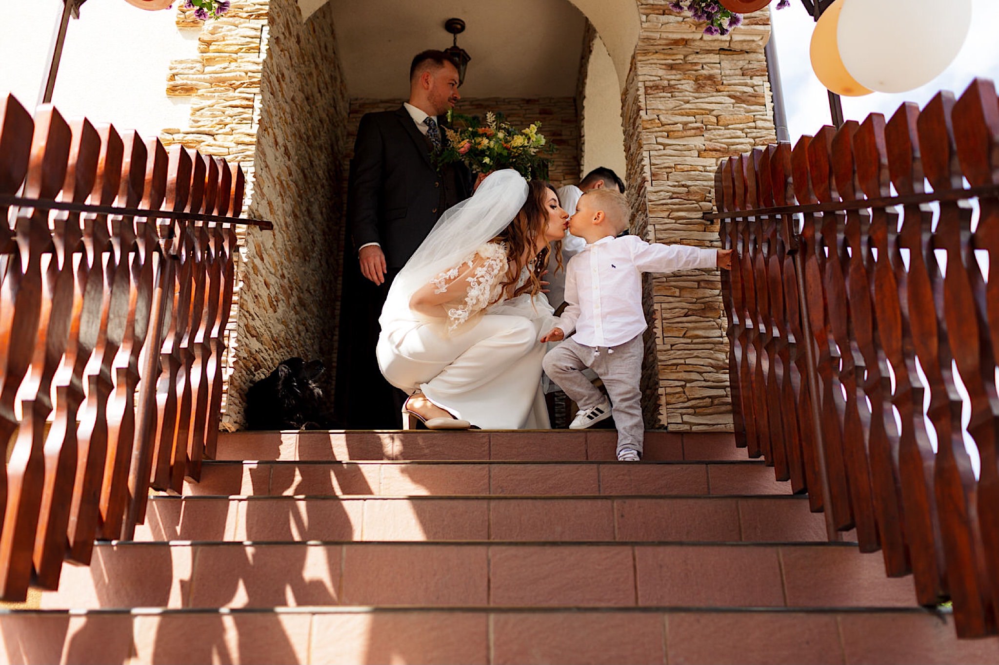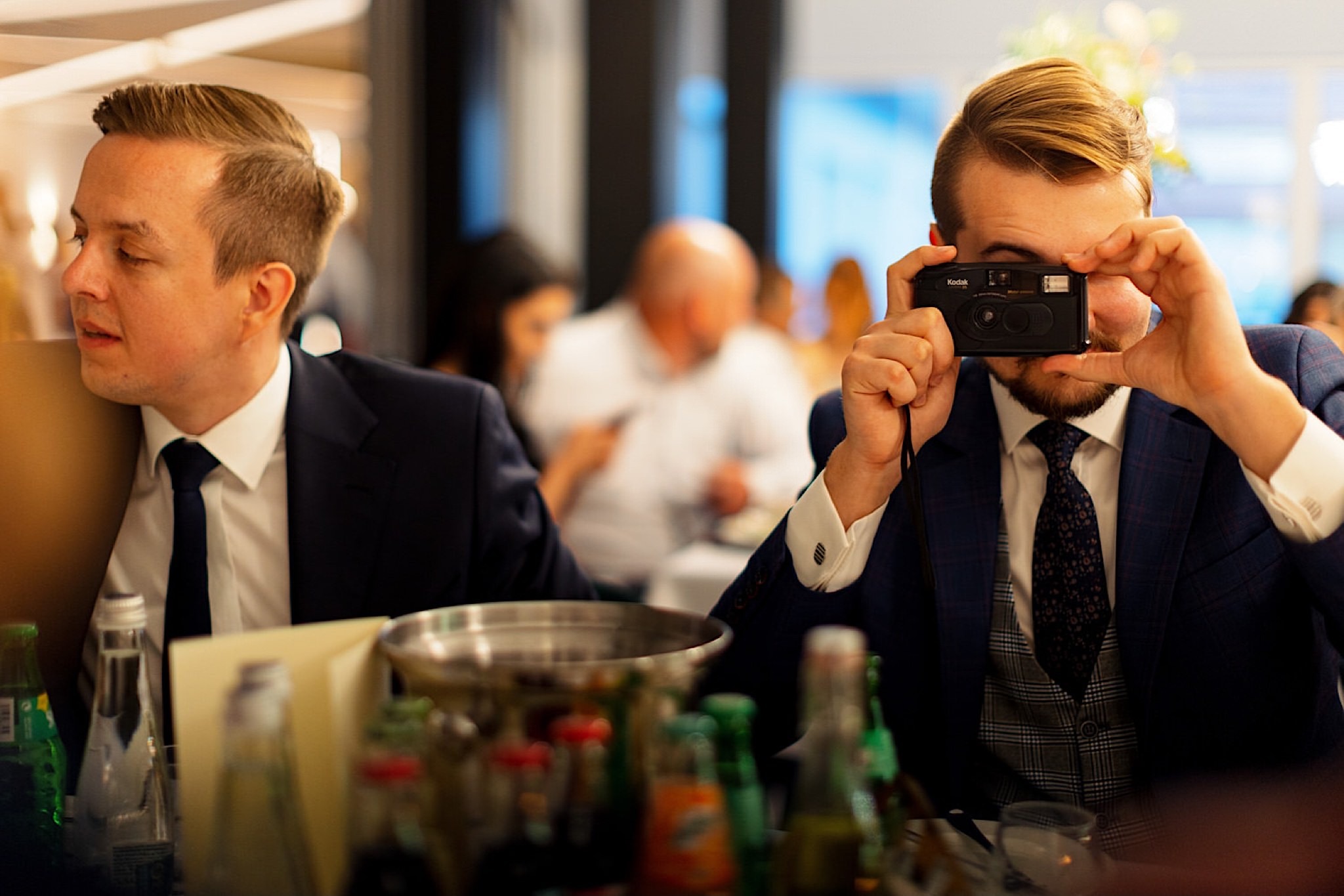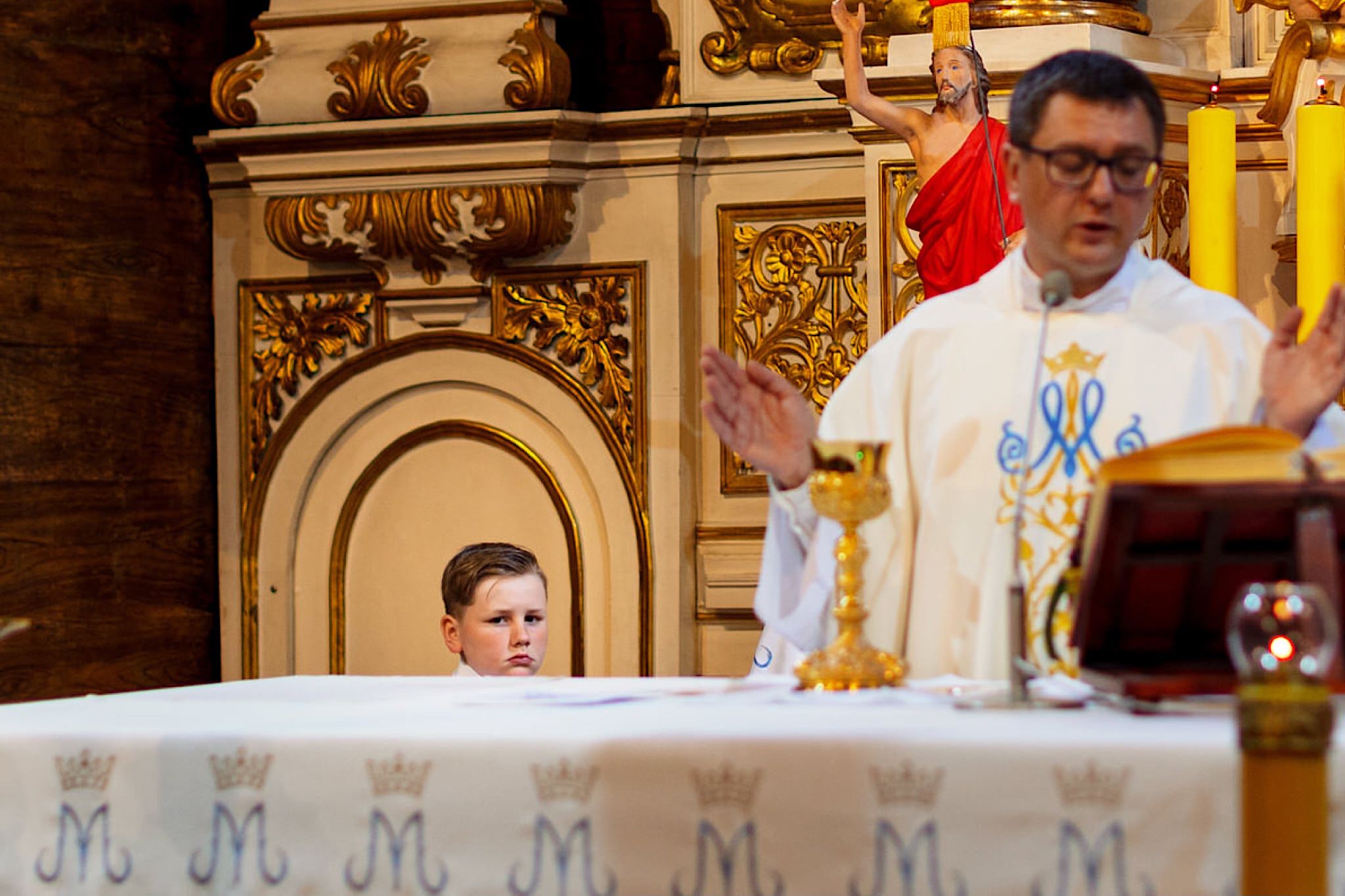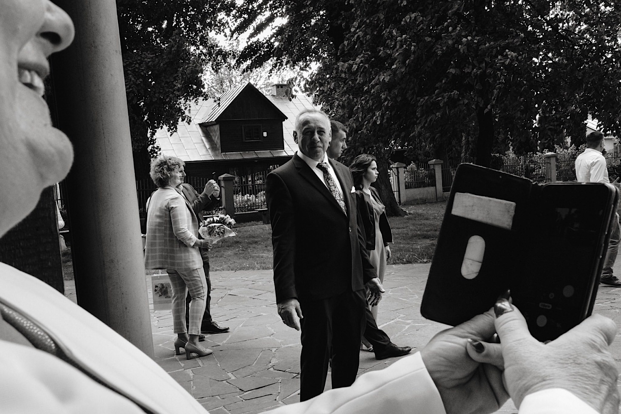 Dzień wesela rozpocząłem od wizyty w domu rodzinnym Kondzia. A tam to co lubię najbardziej. Sporo ludzi, duża przestrzeń i same uśmiechnięte Mordeczki. Do tego wszechobecny brzdąc. Nasz Pan Młody zaplanował wszystko, nawet kostki do whisky symbolizowały jego duszę romantyka 🙂 Sporo żartów, męskiej bielizny (o właśnie, będzie dopłata!:)), oglądania starych rodzinnych zdjęć, biegania po schodach, przejażdżka Ursusem, chwila na portrety i w drogę do Patrycji.