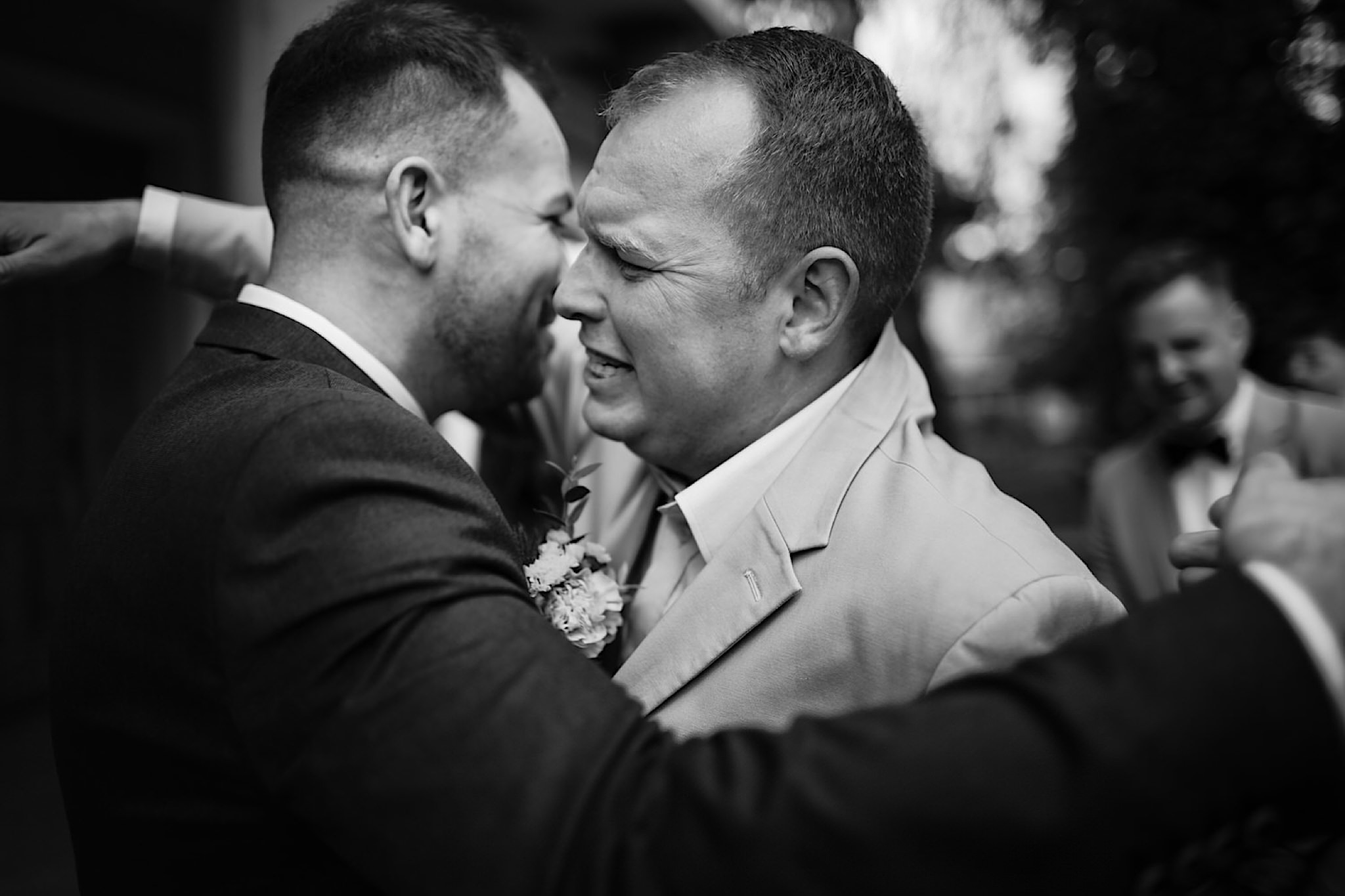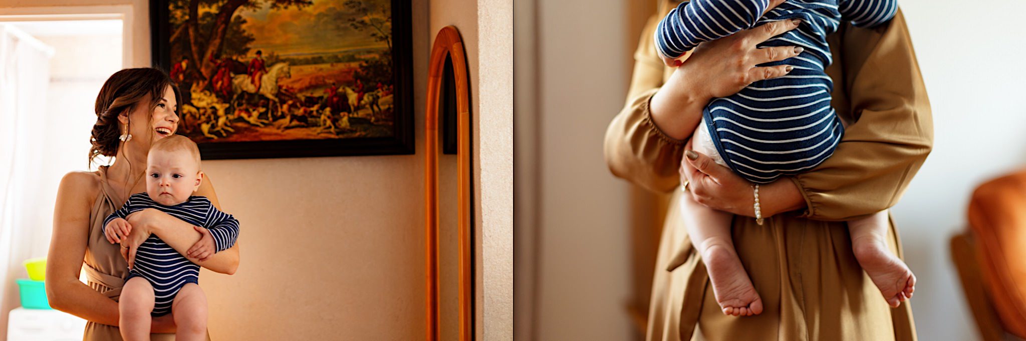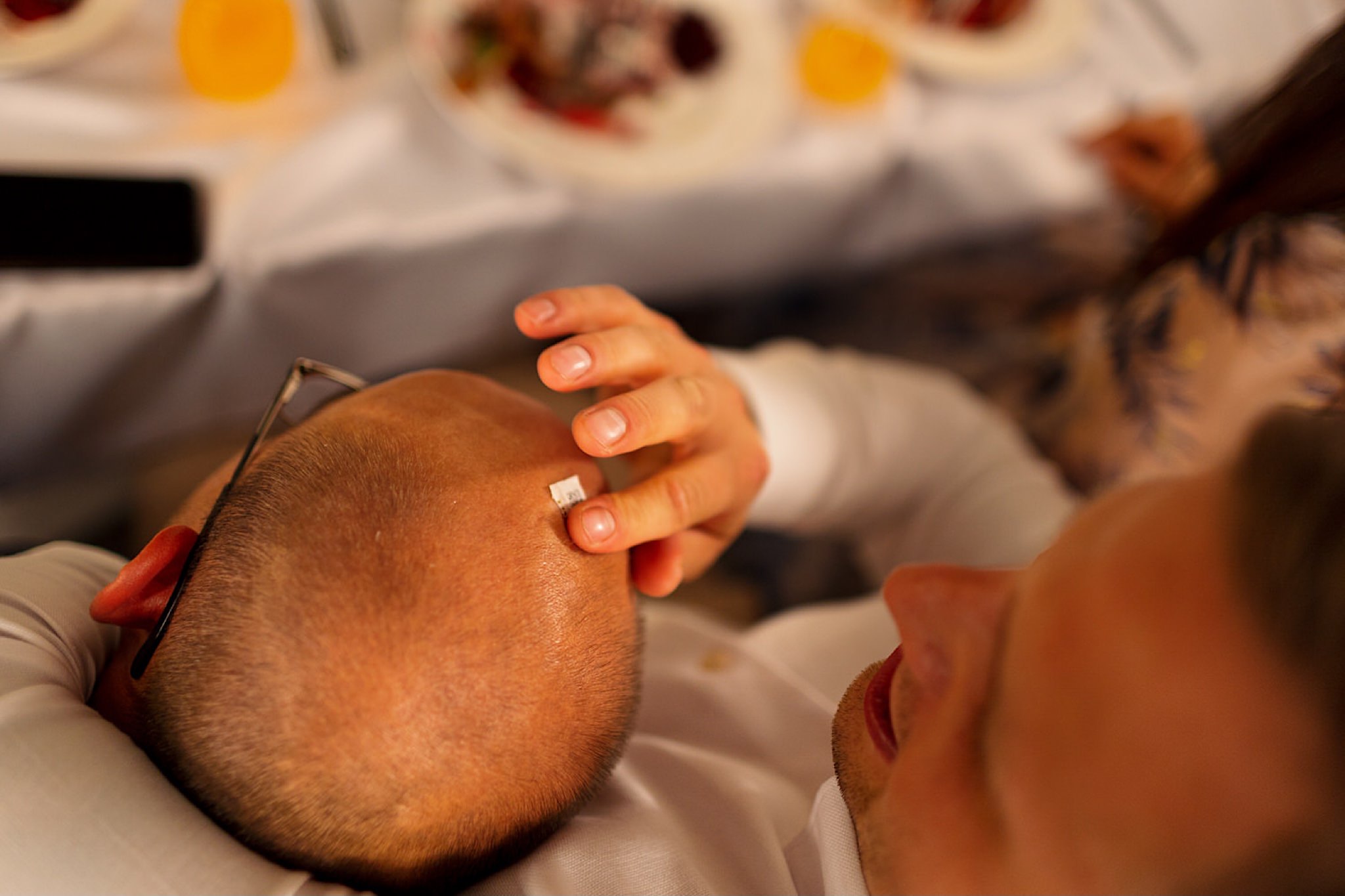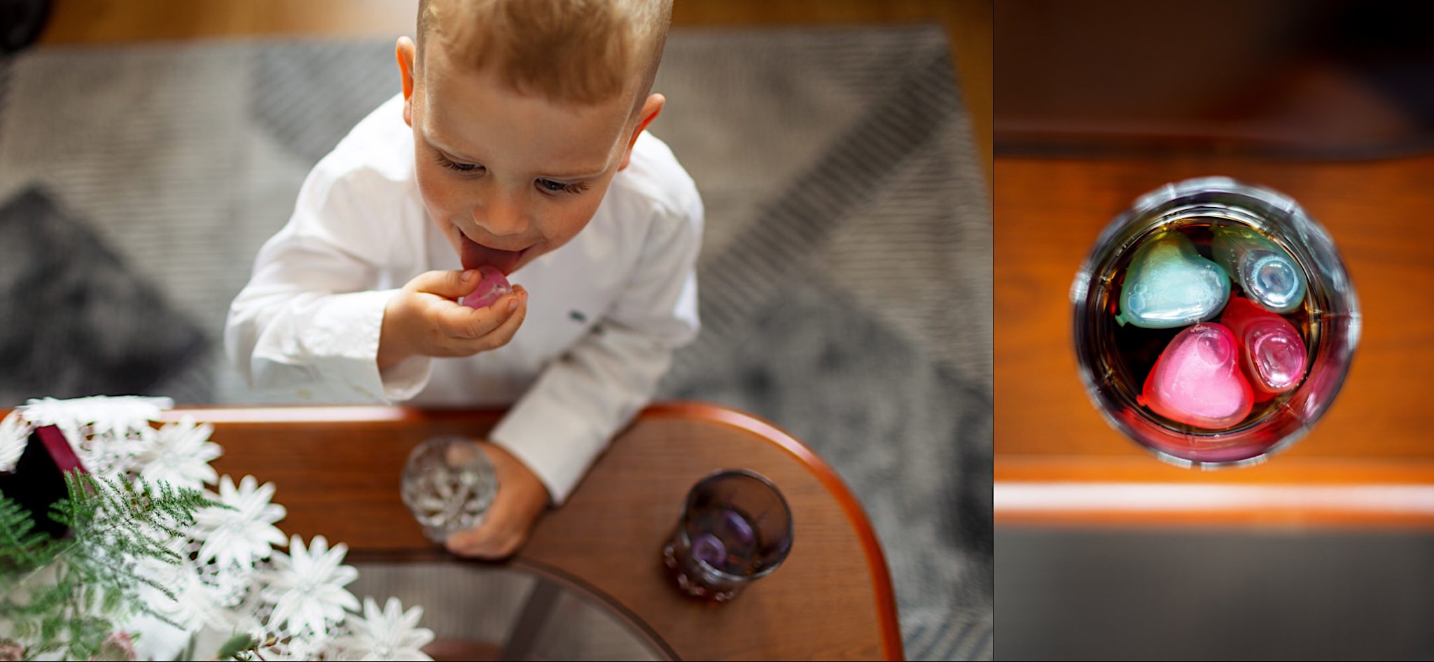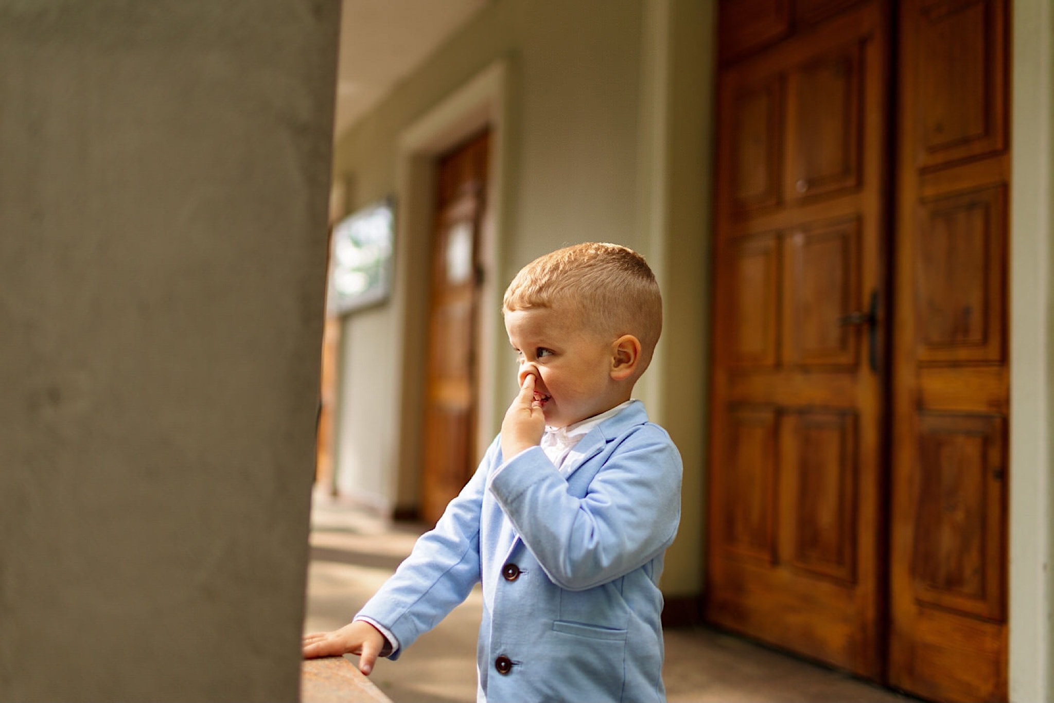Dzień wesela rozpocząłem od wizyty w domu rodzinnym Kondzia. A tam to co lubię najbardziej. Sporo ludzi, duża przestrzeń i same uśmiechnięte Mordeczki. Do tego wszechobecny brzdąc. Nasz Pan Młody zaplanował wszystko, nawet kostki do whisky symbolizowały jego duszę romantyka 🙂 Sporo żartów, męskiej bielizny (o właśnie, będzie dopłata!:)), oglądania starych rodzinnych zdjęć, biegania po schodach, przejażdżka Ursusem, chwila na portrety i w drogę do Patrycji.