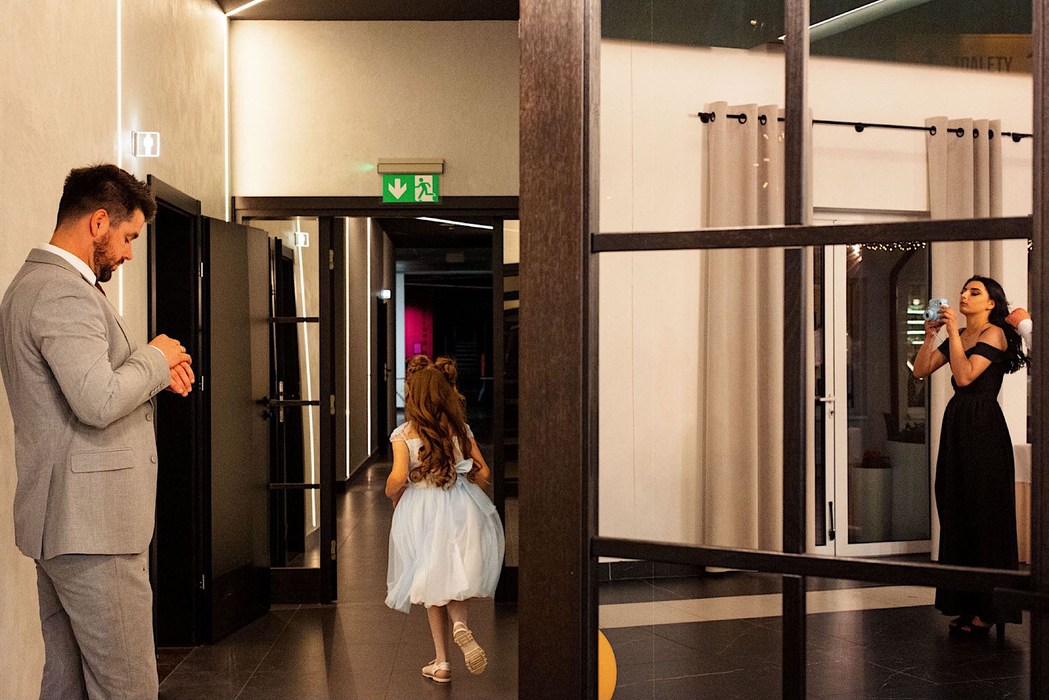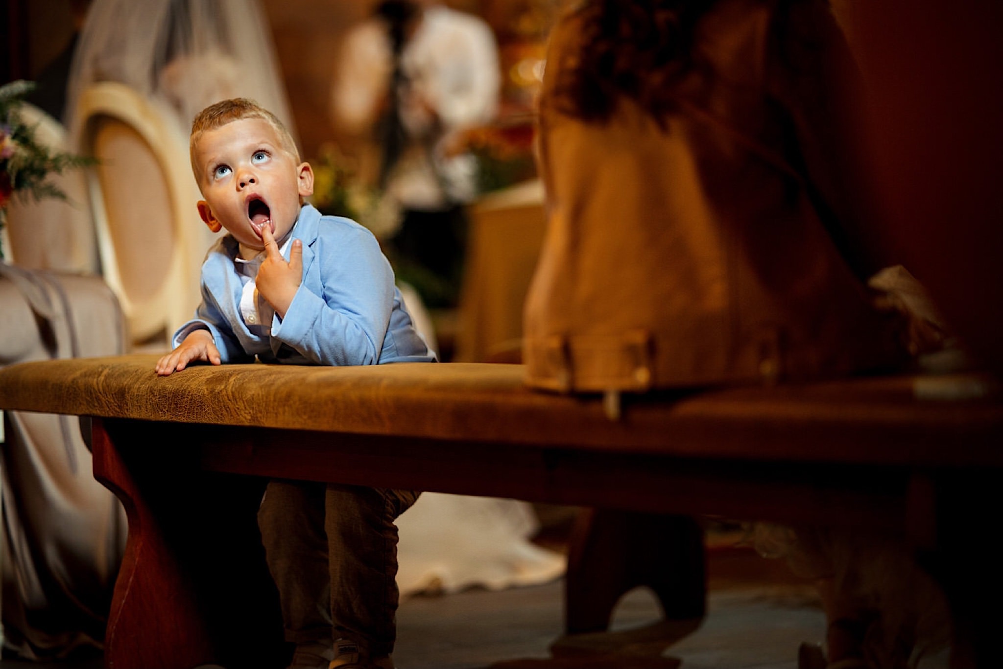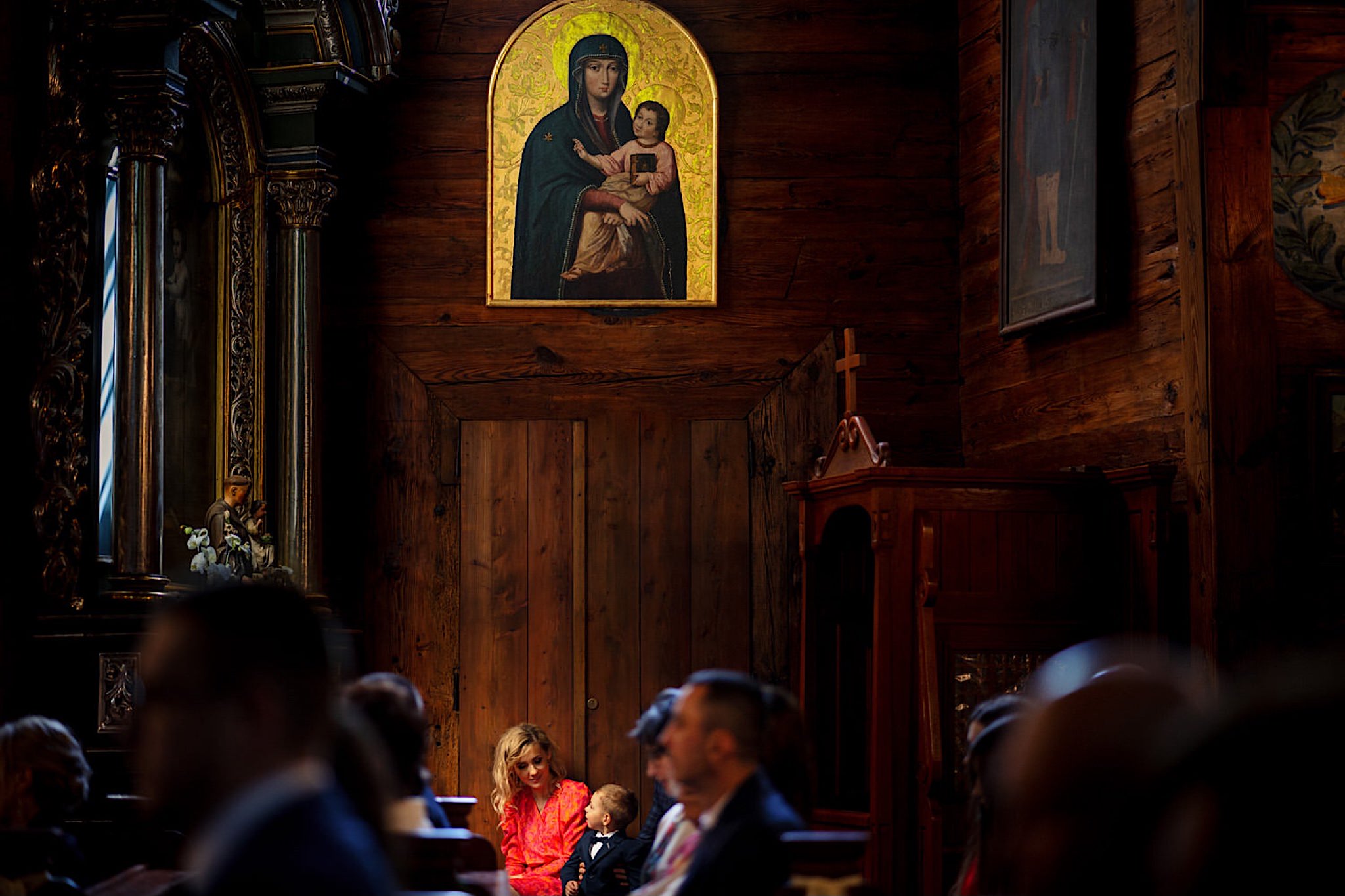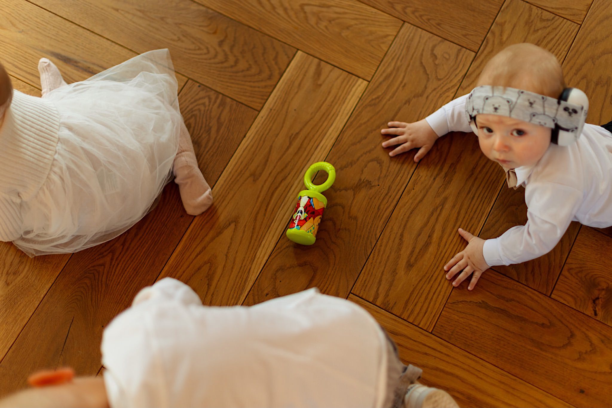 Dzień wesela rozpocząłem od wizyty w domu rodzinnym Kondzia. A tam to co lubię najbardziej. Sporo ludzi, duża przestrzeń i same uśmiechnięte Mordeczki. Do tego wszechobecny brzdąc. Nasz Pan Młody zaplanował wszystko, nawet kostki do whisky symbolizowały jego duszę romantyka 🙂 Sporo żartów, męskiej bielizny (o właśnie, będzie dopłata!:)), oglądania starych rodzinnych zdjęć, biegania po schodach, przejażdżka Ursusem, chwila na portrety i w drogę do Patrycji.