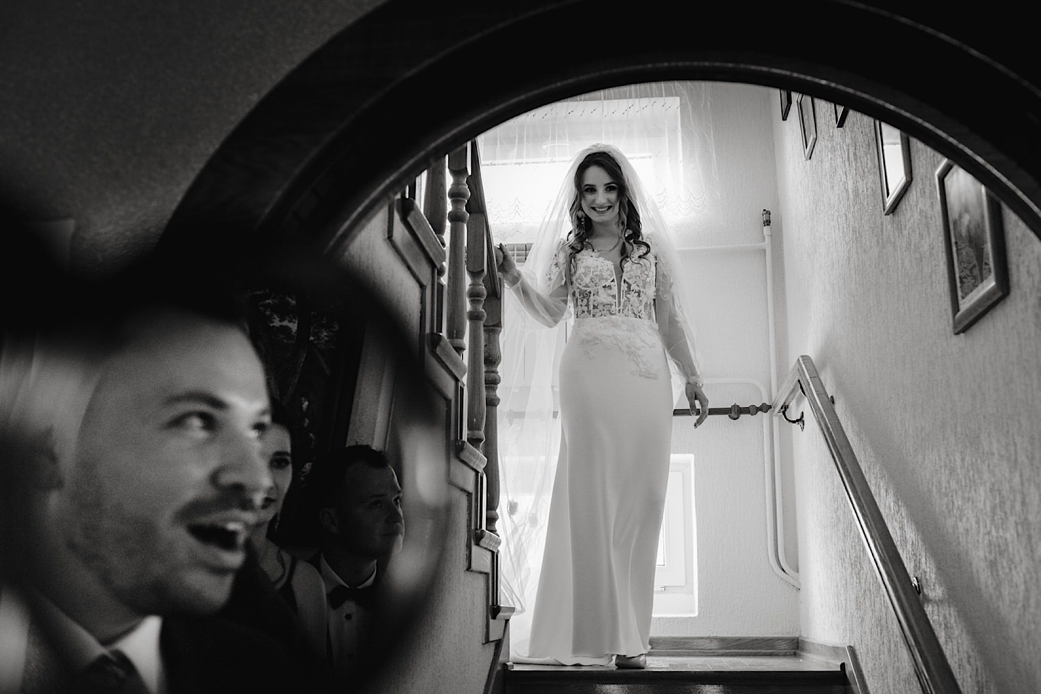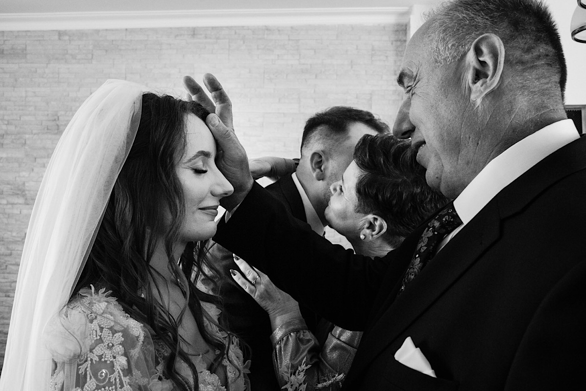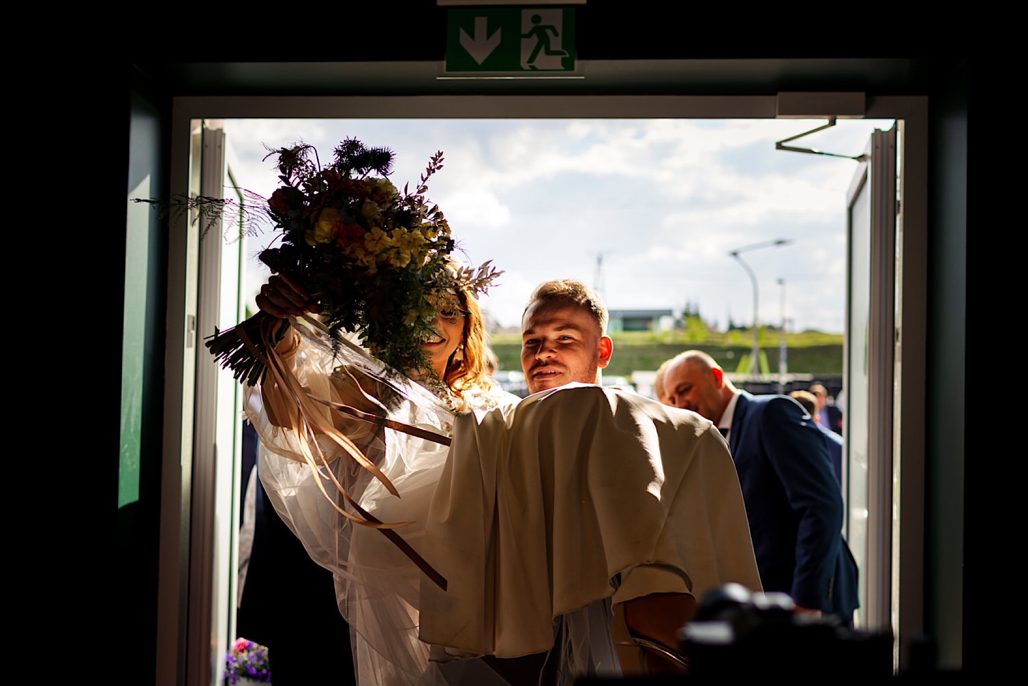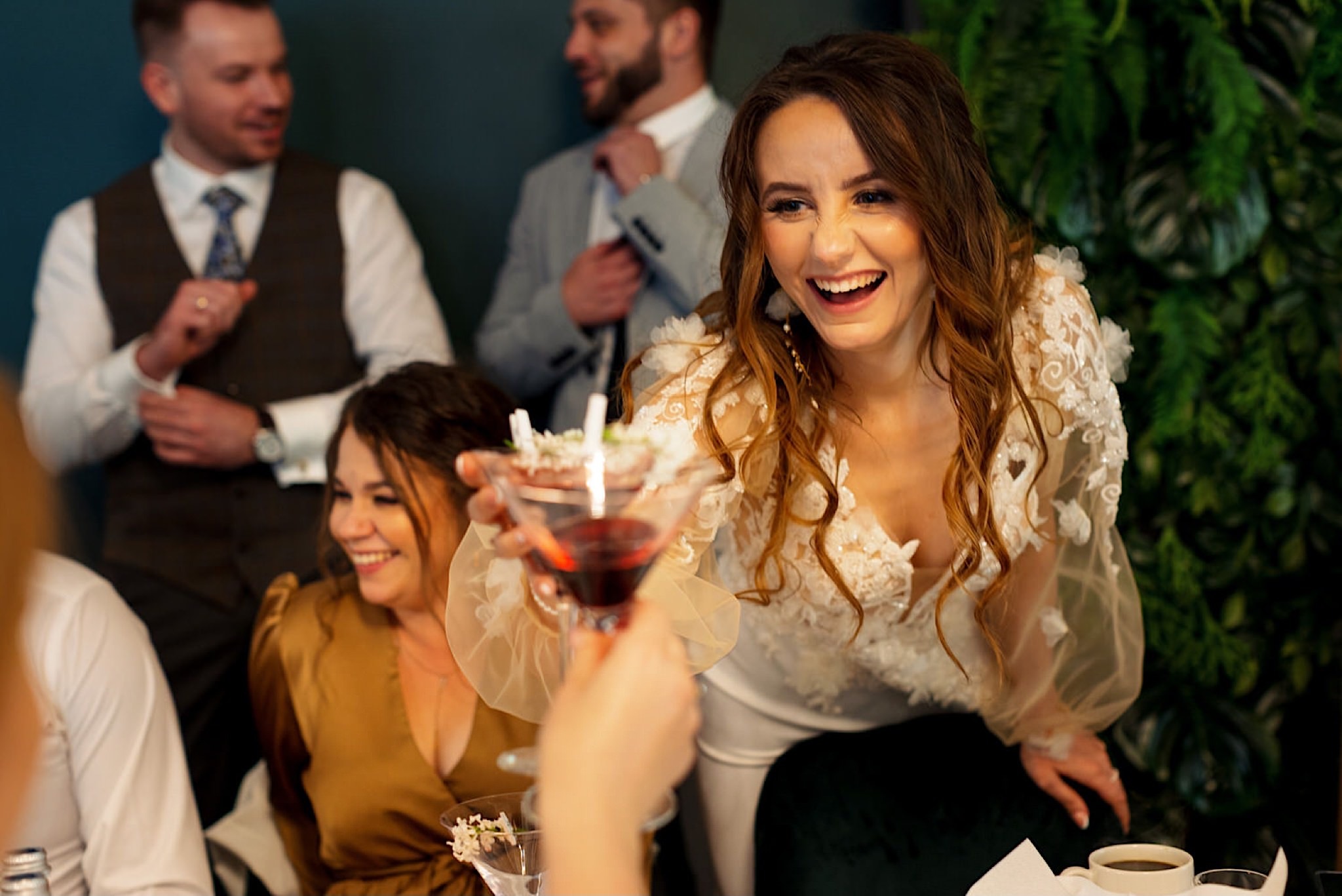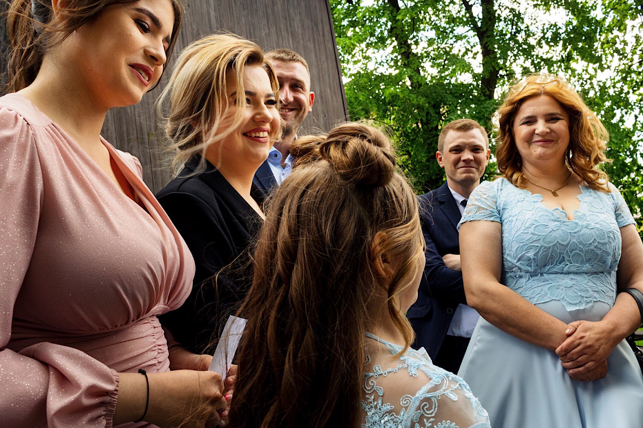 Panna Młoda chciała mieć wejście z przytupem i musieliśmy na nią troszkę poczekać. Na szczęście zadbała o to, abym się nie nudził i zostawiła dom pełen ludzi, uśmiechniętych ludzi 🙂 Jak już weszła to jak huragan, energii! A miała niemałą konkurencję bo wiało tego dnia okrutnie. Jedzenie kanapeczki, podziwianie sukni, wystrzały, spożywanie alkoholu, podziwianie nowego pierścionka zaręczynowego (tak, pierścionek Patrycja też zmieniła :)) tym razem była zmuszona bo pierwszy został zgnieciony ale było warto bo zrobił wielkie wrażenie), trochę krzaczkowych portretów, spacery na wietrze i przyjechał Kondzio. First Look z efektem wow! błogosławieństwo i czas na ceremonię.