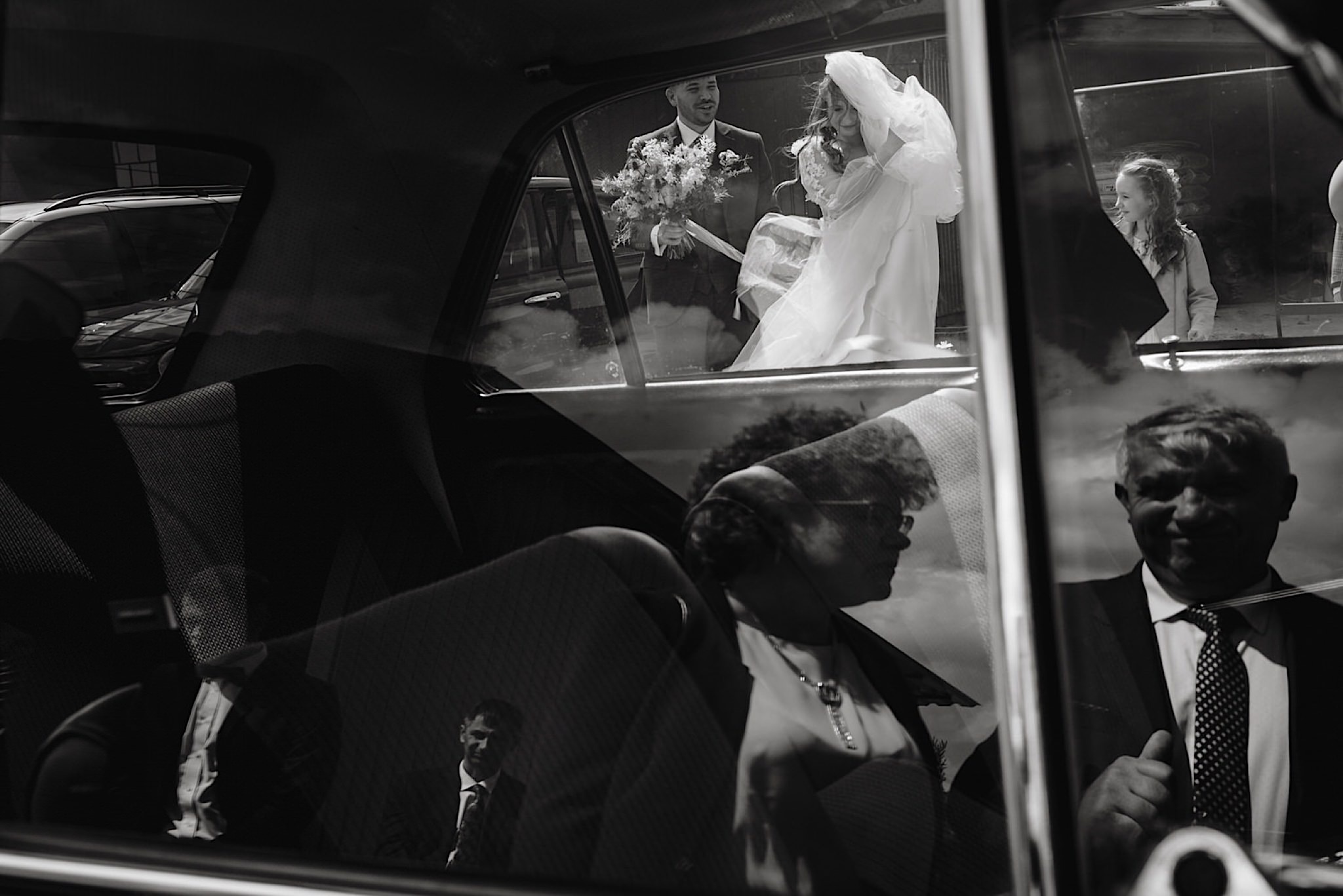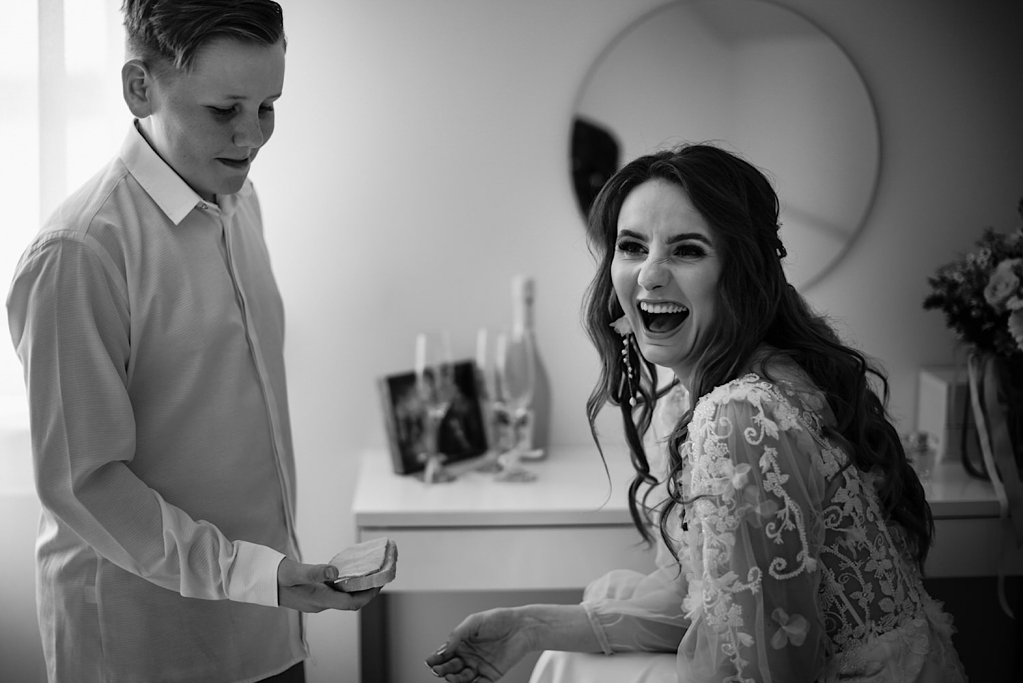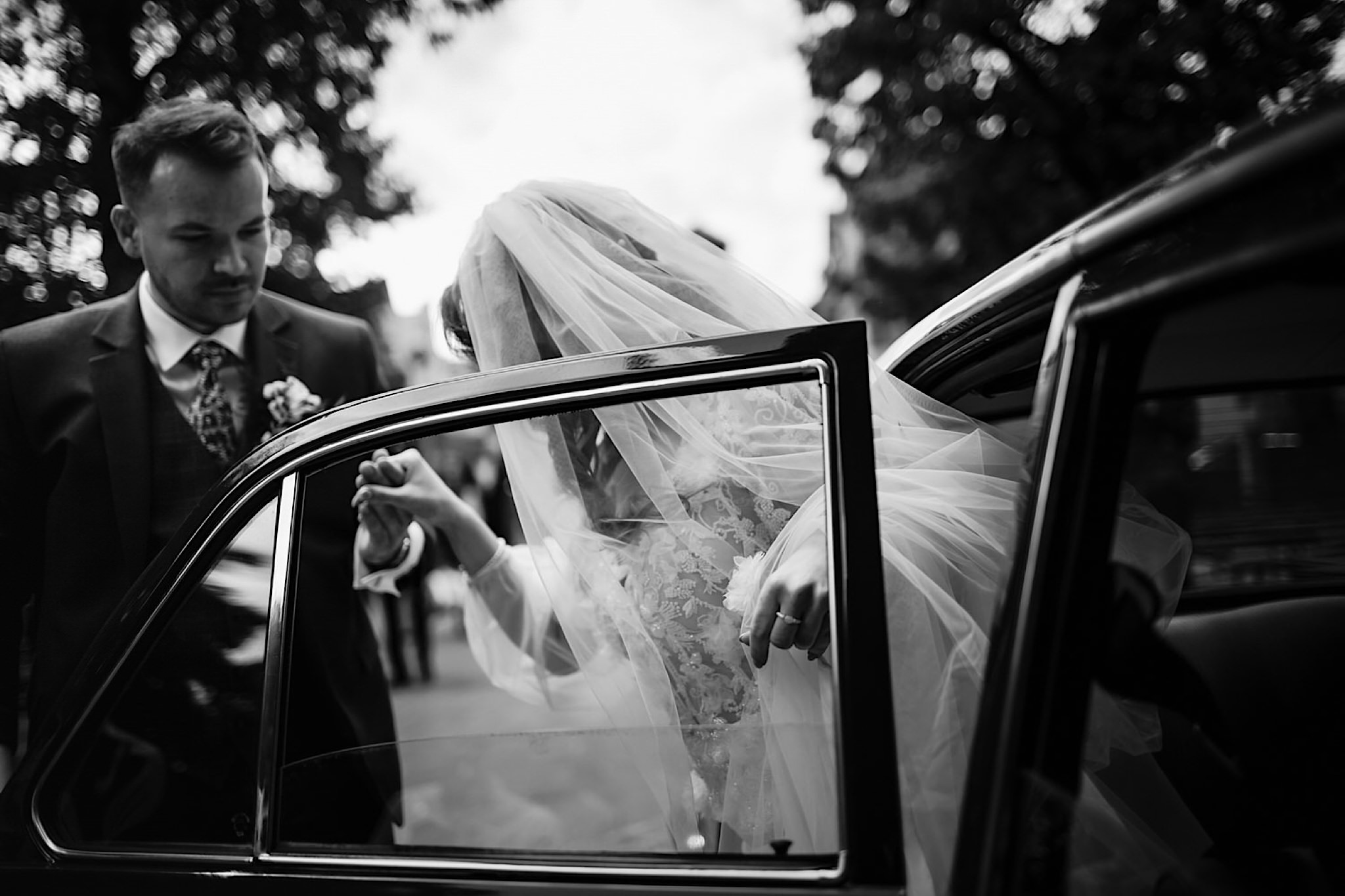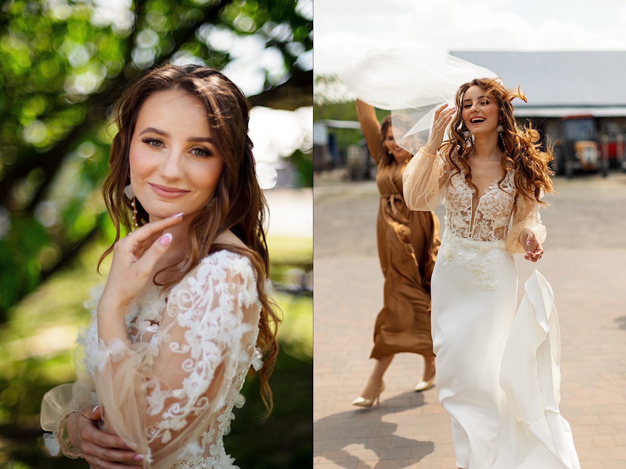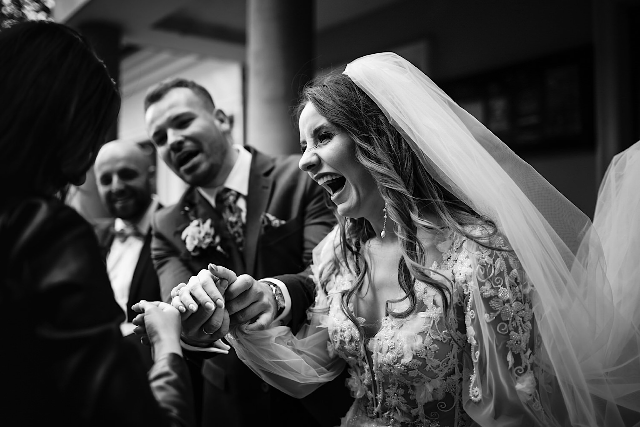 Panna Młoda chciała mieć wejście z przytupem i musieliśmy na nią troszkę poczekać. Na szczęście zadbała o to, abym się nie nudził i zostawiła dom pełen ludzi, uśmiechniętych ludzi 🙂 Jak już weszła to jak huragan, energii! A miała niemałą konkurencję bo wiało tego dnia okrutnie. Jedzenie kanapeczki, podziwianie sukni, wystrzały, spożywanie alkoholu, podziwianie nowego pierścionka zaręczynowego (tak, pierścionek Patrycja też zmieniła :)) tym razem była zmuszona bo pierwszy został zgnieciony ale było warto bo zrobił wielkie wrażenie), trochę krzaczkowych portretów, spacery na wietrze i przyjechał Kondzio. First Look z efektem wow! błogosławieństwo i czas na ceremonię.