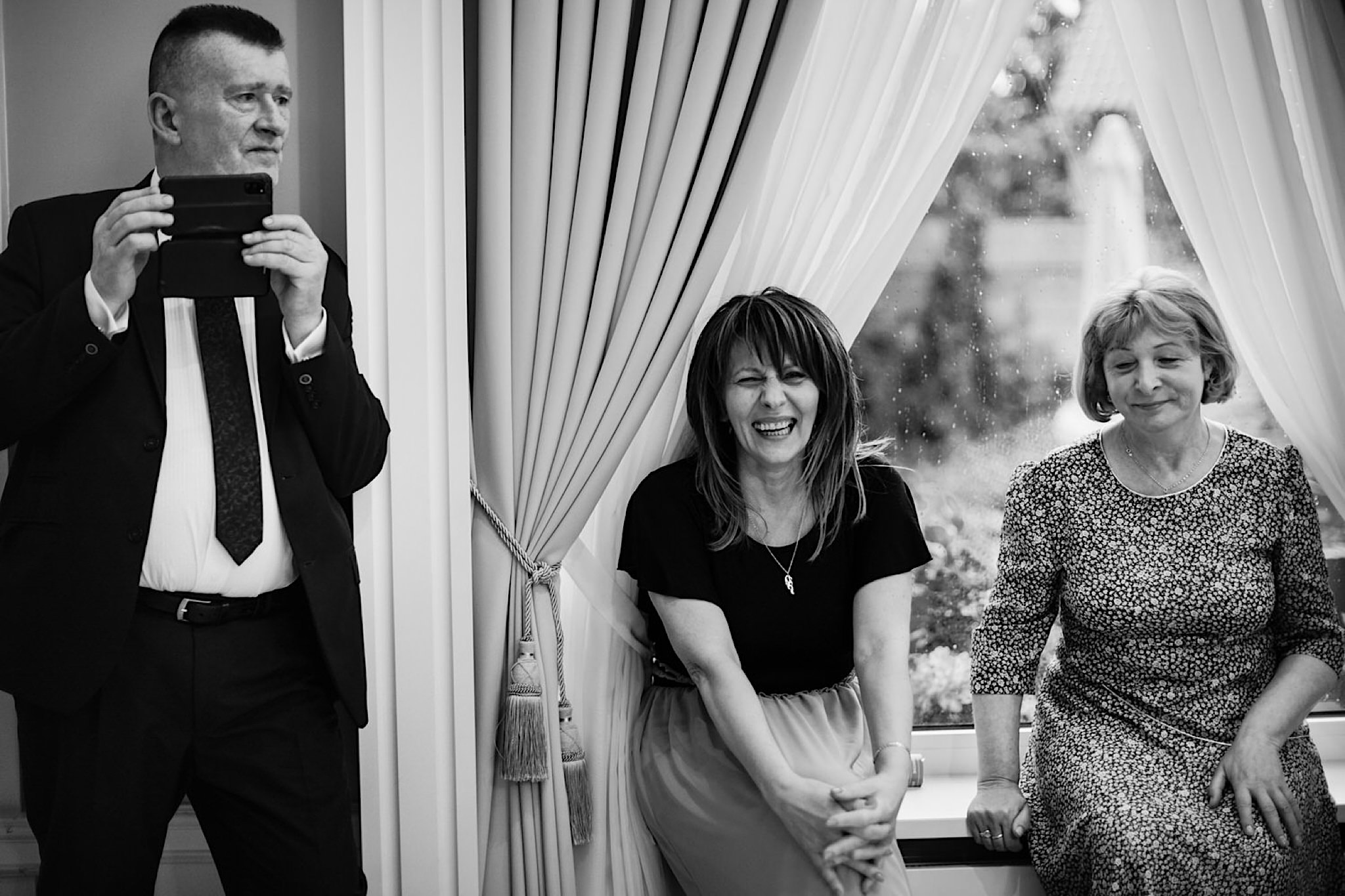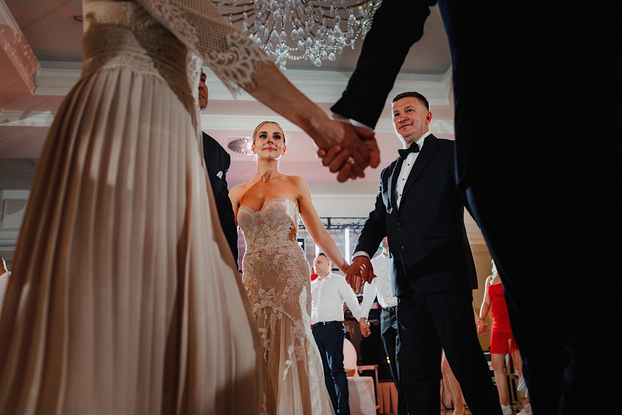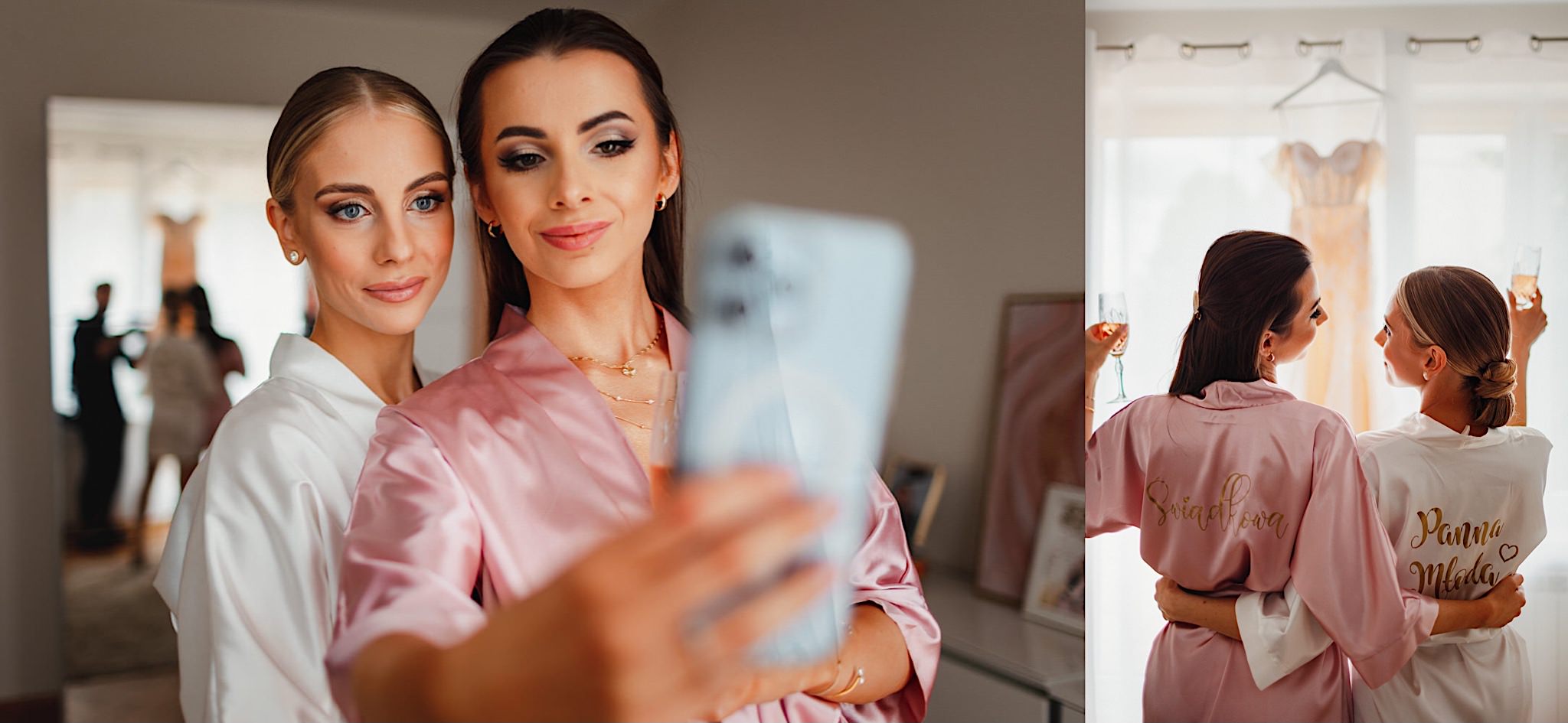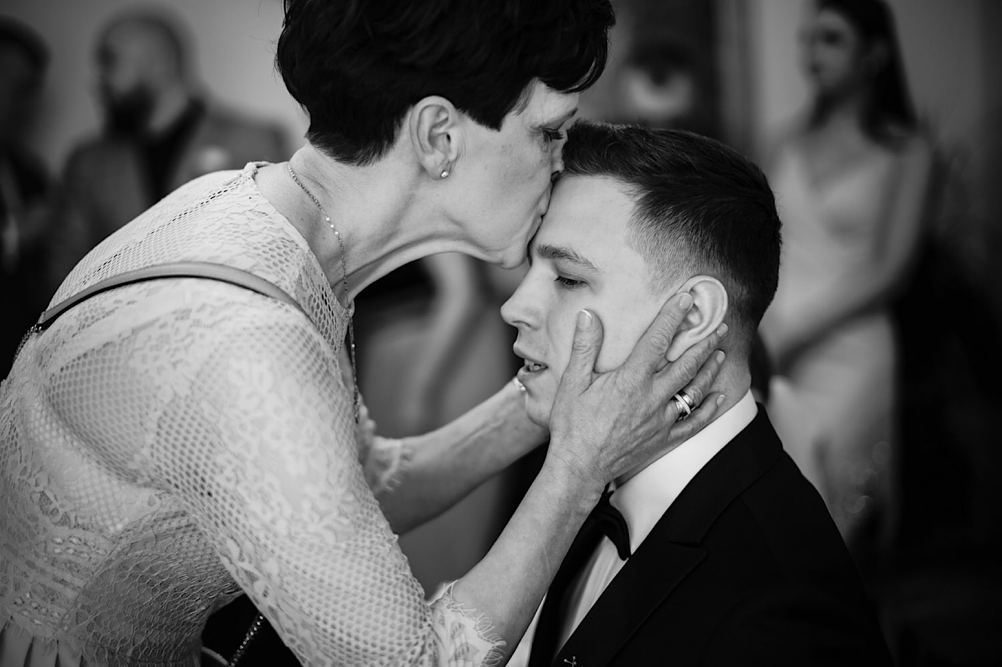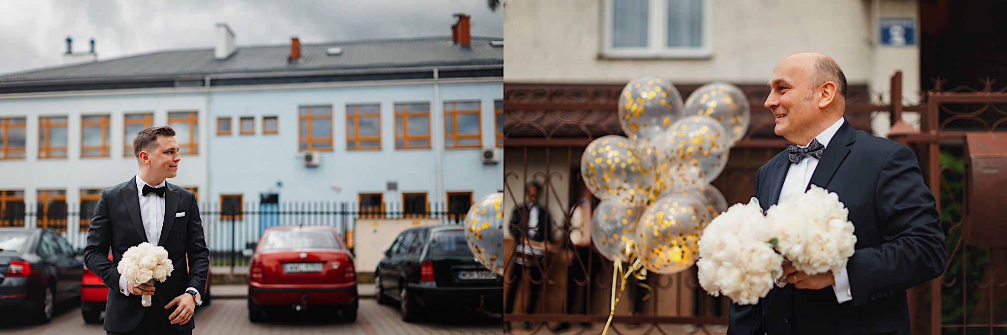 Dzień wesela rozpocząłem od przygotowań w mieszkaniu Pawła. Najbliższa rodzina z “synkiem” Dustinem na czele. Trochę wspominania starych, piłkarskich czasów, oglądanie kolekcji koszulek, prasowanko, latanie po schodach w tę i we w tę. Wszystko w luźnej i przyjaznej atmosferze. A o to żebyśmy mieli wystarczająco dużo czasu zadbał drużba, który się LEKKO spóźnił 😉 Jak już przyszedł to tak szybko ubierał Pana Młodego, że guzik w marynarce tego nie wytrzymał. Następnie przyszedł czas na wizytę w domu rodzinnym Natalii. Trzy pokolenia serdeczności i uśmiechu 🙂 Makijaż babci, historie z panieńskiego, małe problemy przy otwieraniu szampana, selfie dziewczyn z suknią w tle (szacun za kadrowanie!), konsumowanie szampejna, rapsy przy ubieraniu, kilka portretow i przyjechał Paweł. Chwile oczekiwania i przyszedł czas na jeden z najbardziej emocjonalnych first look’ow jakie widziałem (a było ich całkiem sporo). Mówią, że piłkarze to łobuzy, a wiadomo kto kocha najmocniej 🙂 Pawła na widok Natalii w sukni ślubnej rozwaliło całkowicie. Wzrusz totalny. Nie spokojniej było na błogosławieństwie.