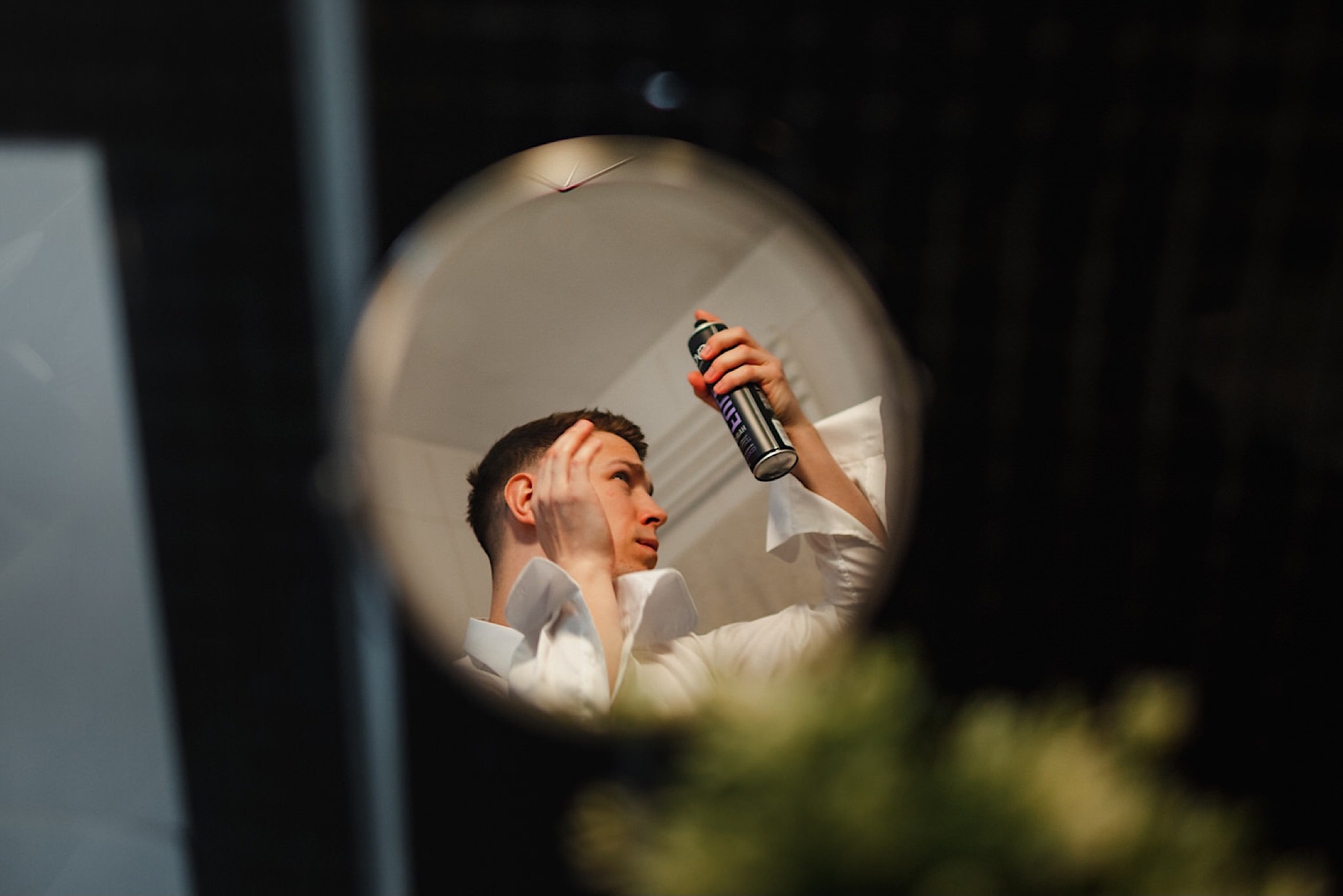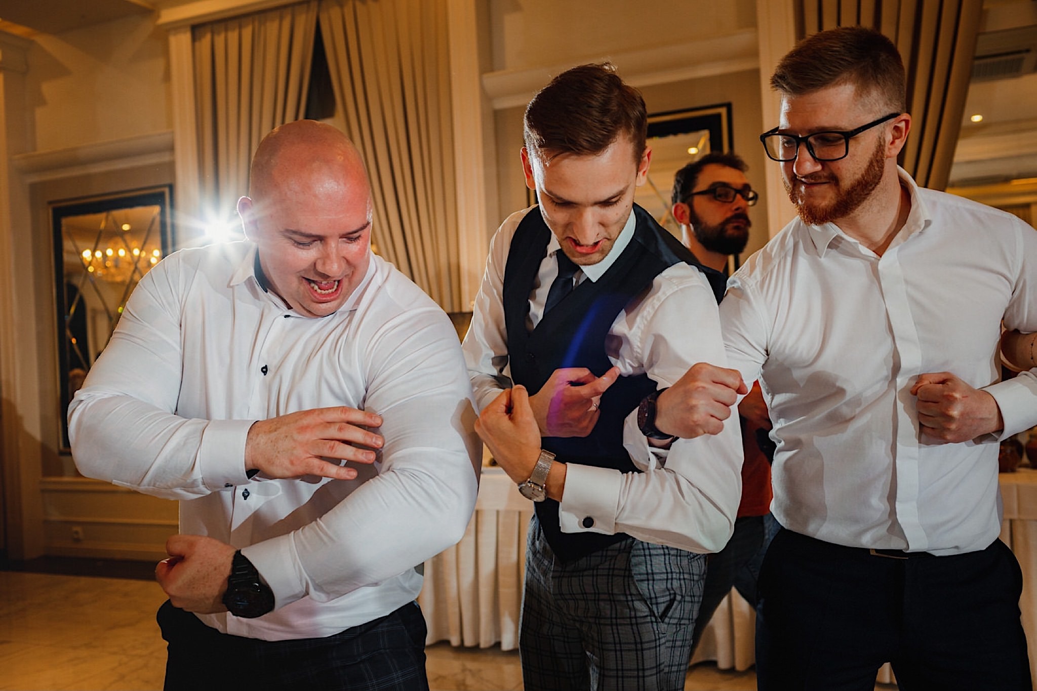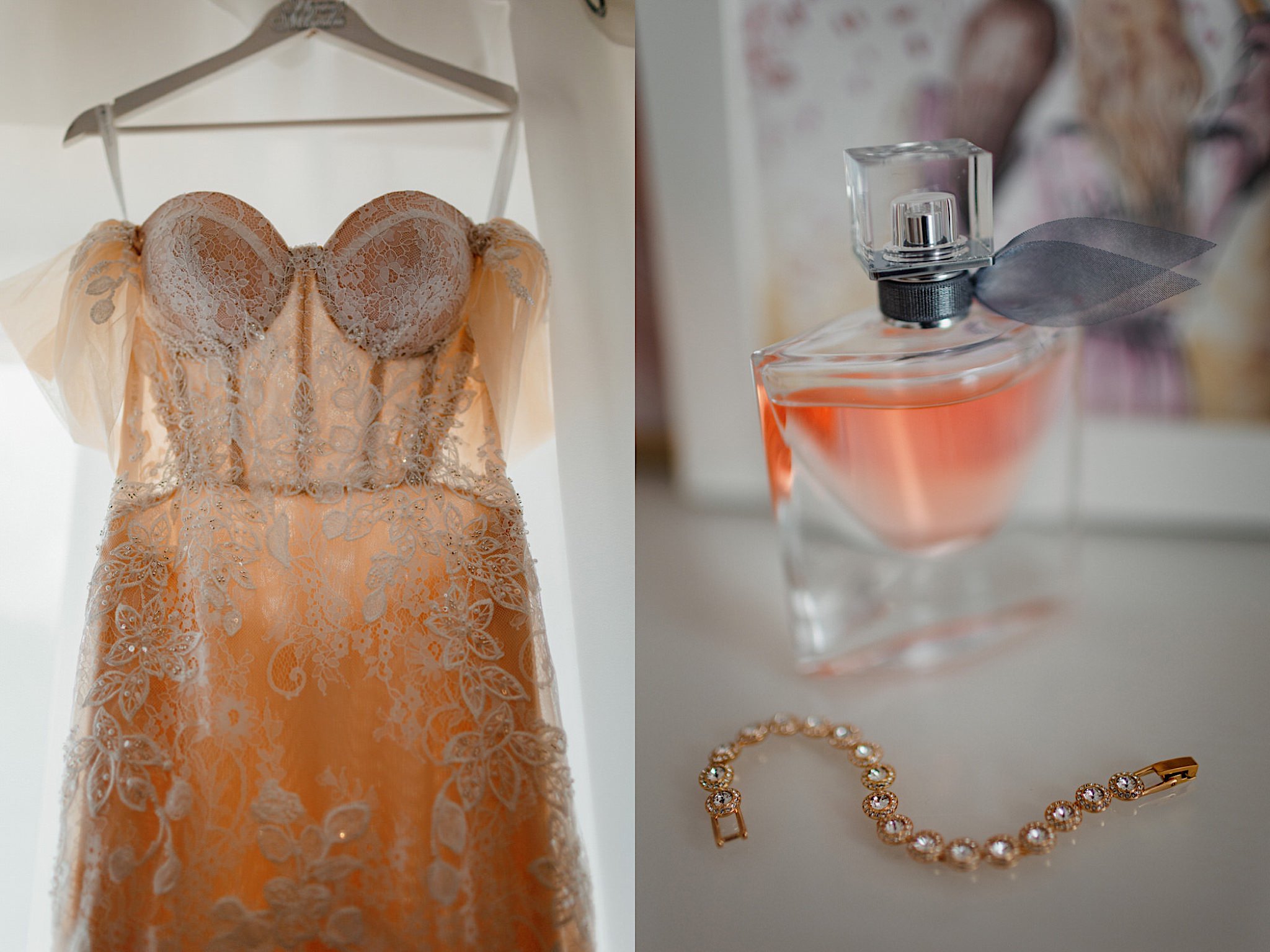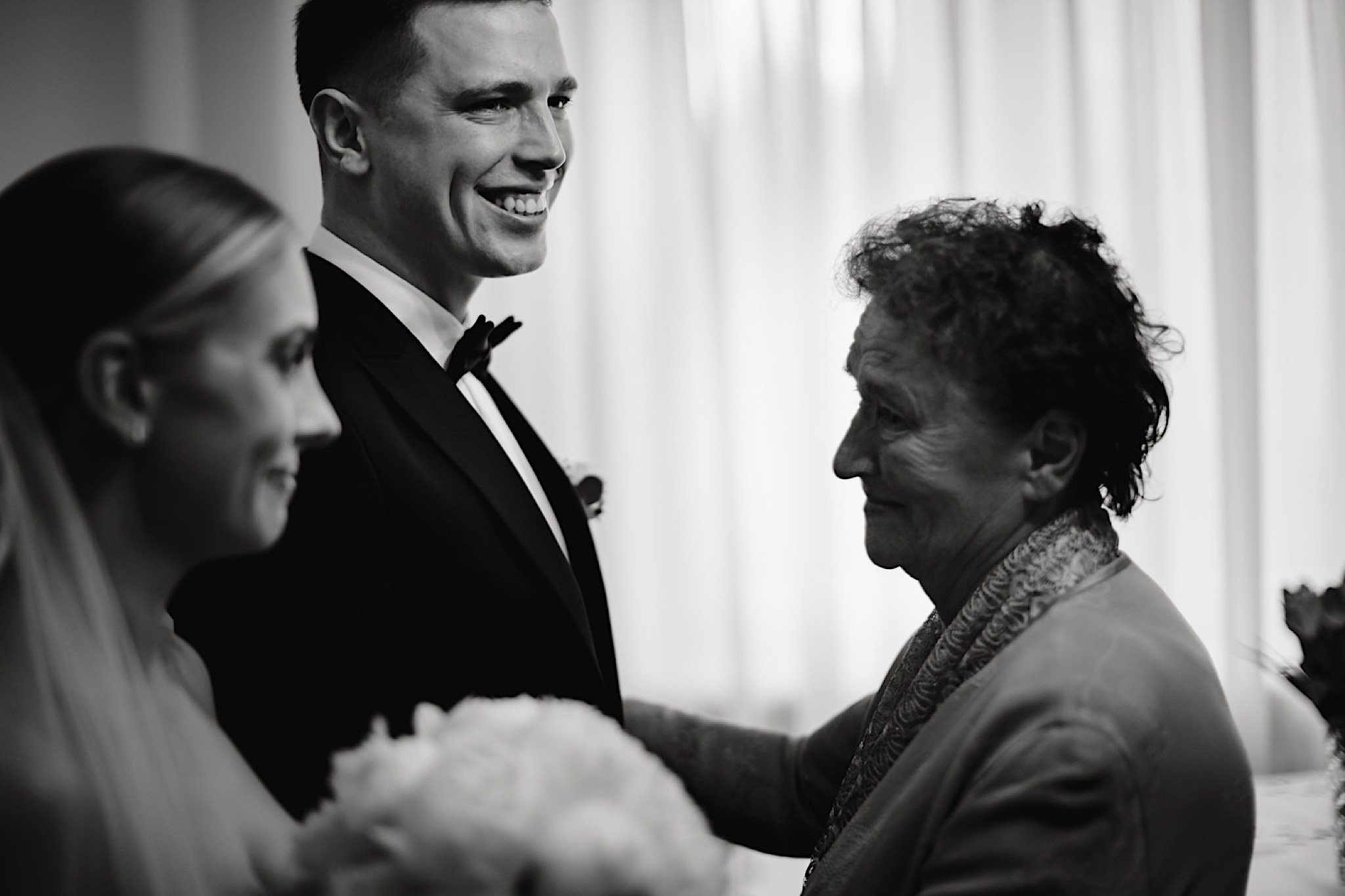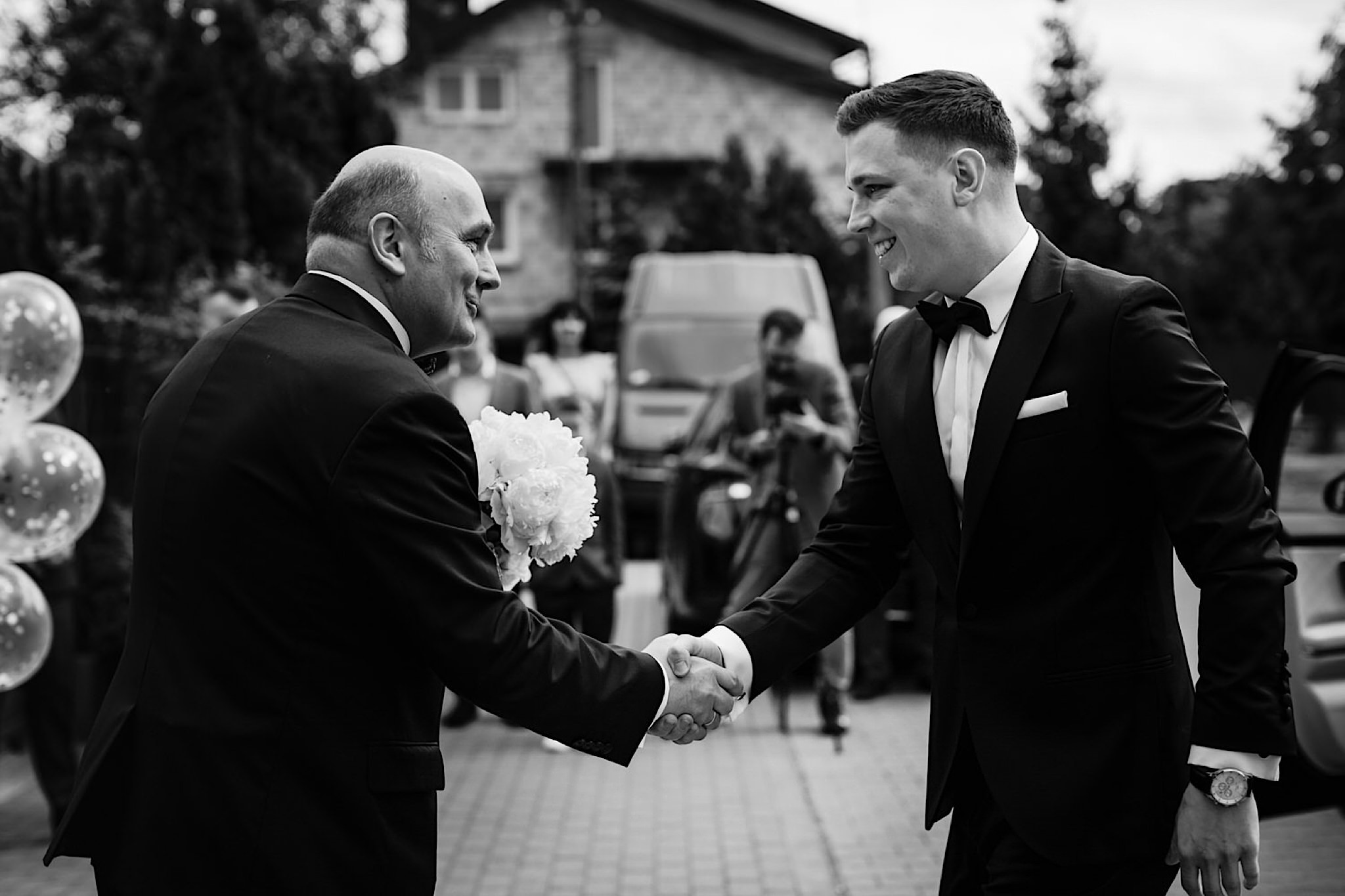 Dzień wesela rozpocząłem od przygotowań w mieszkaniu Pawła. Najbliższa rodzina z “synkiem” Dustinem na czele. Trochę wspominania starych, piłkarskich czasów, oglądanie kolekcji koszulek, prasowanko, latanie po schodach w tę i we w tę. Wszystko w luźnej i przyjaznej atmosferze. A o to żebyśmy mieli wystarczająco dużo czasu zadbał drużba, który się LEKKO spóźnił 😉 Jak już przyszedł to tak szybko ubierał Pana Młodego, że guzik w marynarce tego nie wytrzymał. Następnie przyszedł czas na wizytę w domu rodzinnym Natalii. Trzy pokolenia serdeczności i uśmiechu 🙂 Makijaż babci, historie z panieńskiego, małe problemy przy otwieraniu szampana, selfie dziewczyn z suknią w tle (szacun za kadrowanie!), konsumowanie szampejna, rapsy przy ubieraniu, kilka portretow i przyjechał Paweł. Chwile oczekiwania i przyszedł czas na jeden z najbardziej emocjonalnych first look’ow jakie widziałem (a było ich całkiem sporo). Mówią, że piłkarze to łobuzy, a wiadomo kto kocha najmocniej 🙂 Pawła na widok Natalii w sukni ślubnej rozwaliło całkowicie. Wzrusz totalny. Nie spokojniej było na błogosławieństwie.
