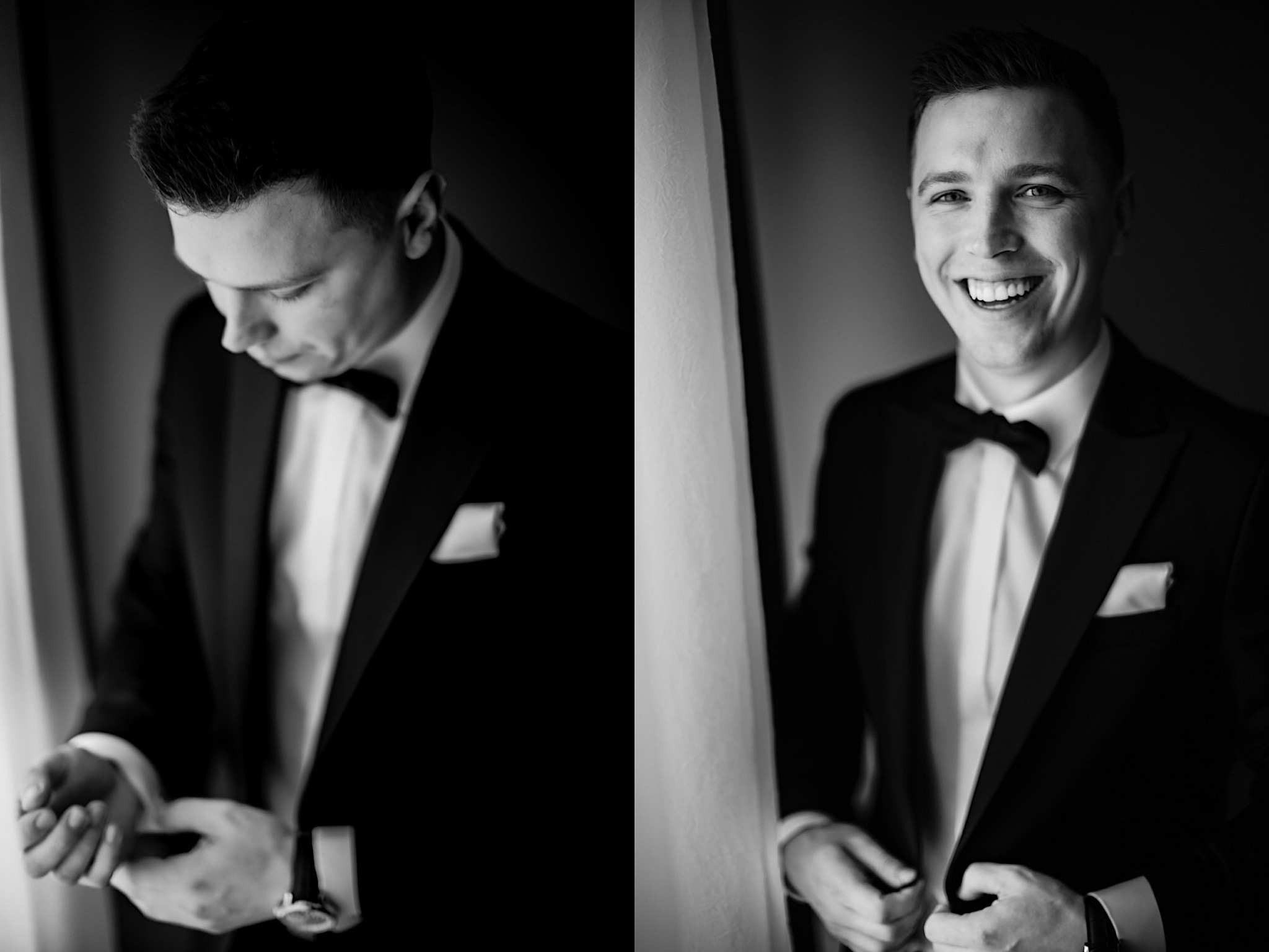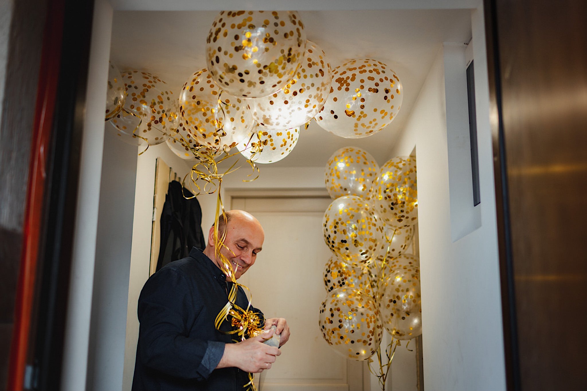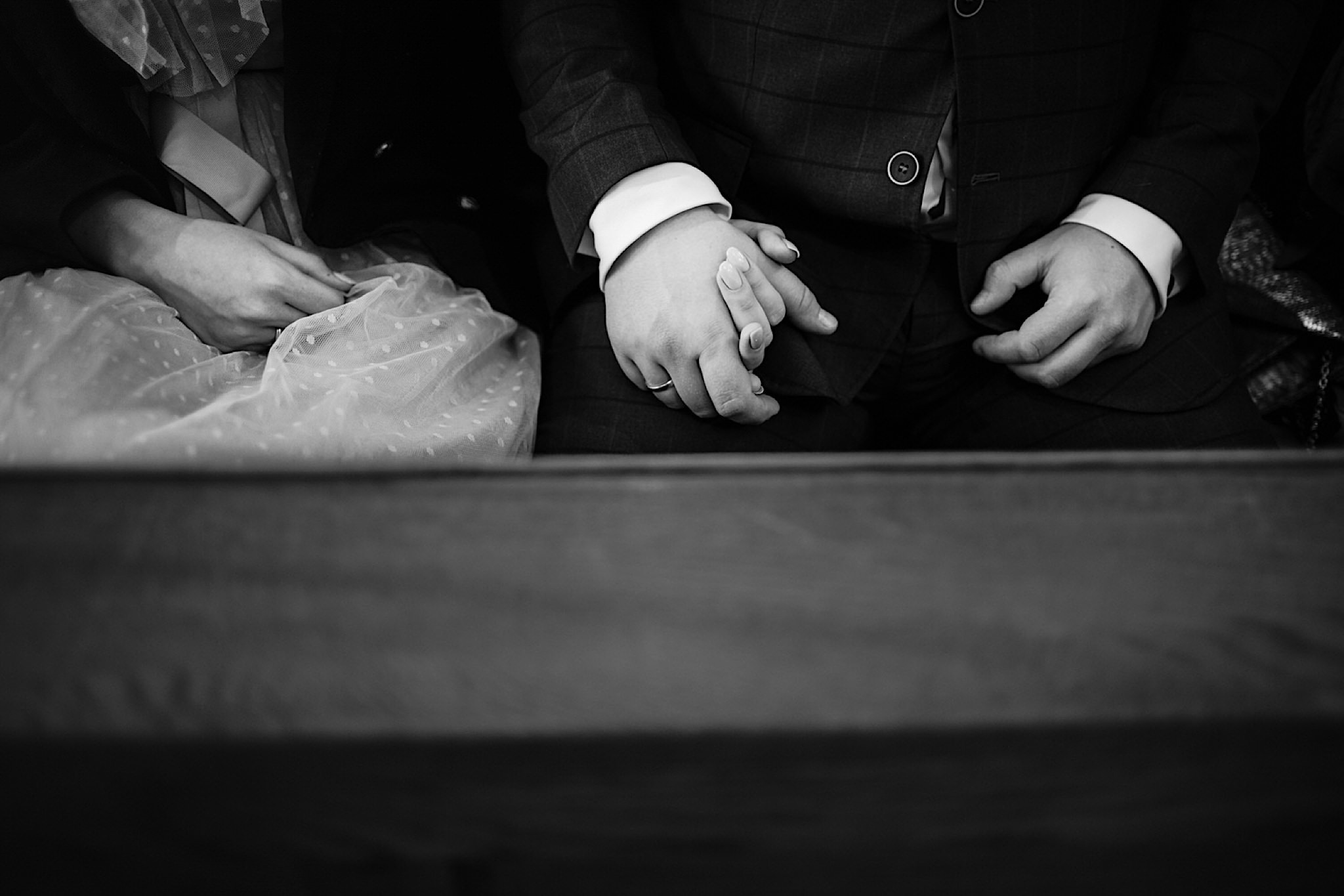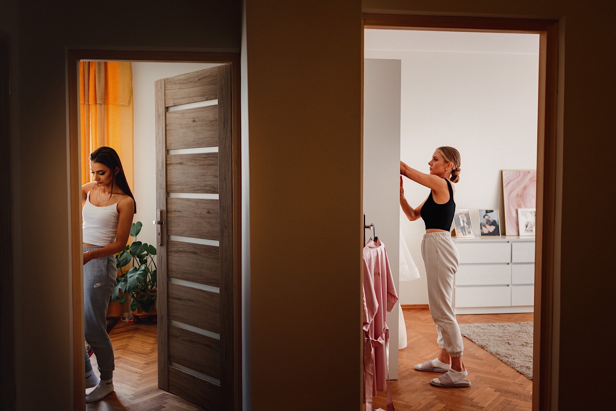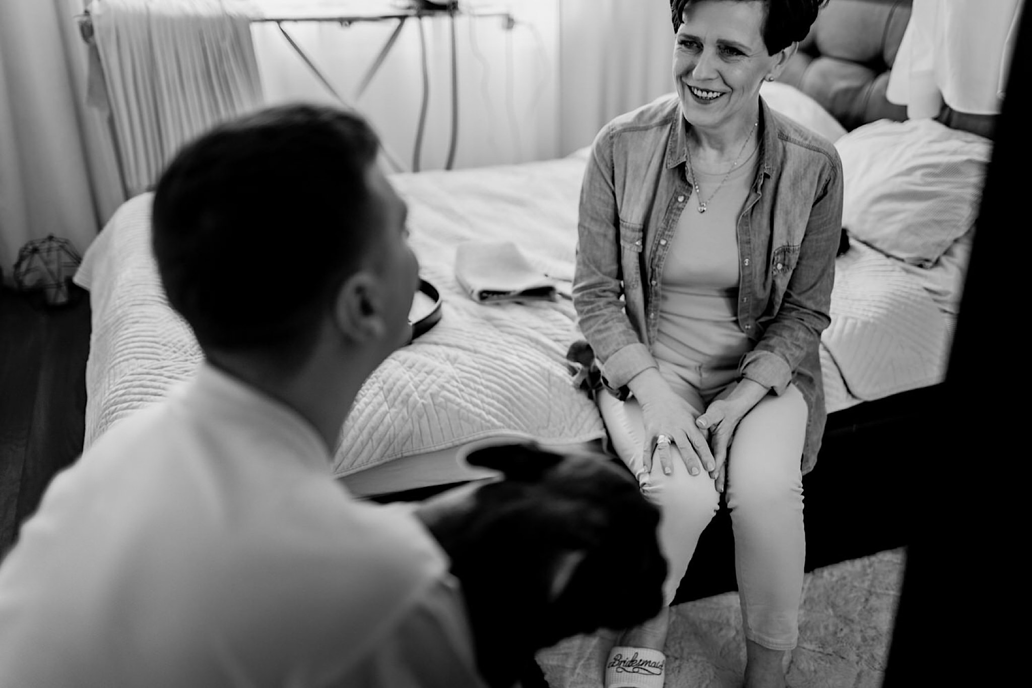 Dzień wesela rozpocząłem od przygotowań w mieszkaniu Pawła. Najbliższa rodzina z “synkiem” Dustinem na czele. Trochę wspominania starych, piłkarskich czasów, oglądanie kolekcji koszulek, prasowanko, latanie po schodach w tę i we w tę. Wszystko w luźnej i przyjaznej atmosferze. A o to żebyśmy mieli wystarczająco dużo czasu zadbał drużba, który się LEKKO spóźnił 😉 Jak już przyszedł to tak szybko ubierał Pana Młodego, że guzik w marynarce tego nie wytrzymał. Następnie przyszedł czas na wizytę w domu rodzinnym Natalii. Trzy pokolenia serdeczności i uśmiechu 🙂 Makijaż babci, historie z panieńskiego, małe problemy przy otwieraniu szampana, selfie dziewczyn z suknią w tle (szacun za kadrowanie!), konsumowanie szampejna, rapsy przy ubieraniu, kilka portretow i przyjechał Paweł. Chwile oczekiwania i przyszedł czas na jeden z najbardziej emocjonalnych first look’ow jakie widziałem (a było ich całkiem sporo). Mówią, że piłkarze to łobuzy, a wiadomo kto kocha najmocniej 🙂 Pawła na widok Natalii w sukni ślubnej rozwaliło całkowicie. Wzrusz totalny. Nie spokojniej było na błogosławieństwie.