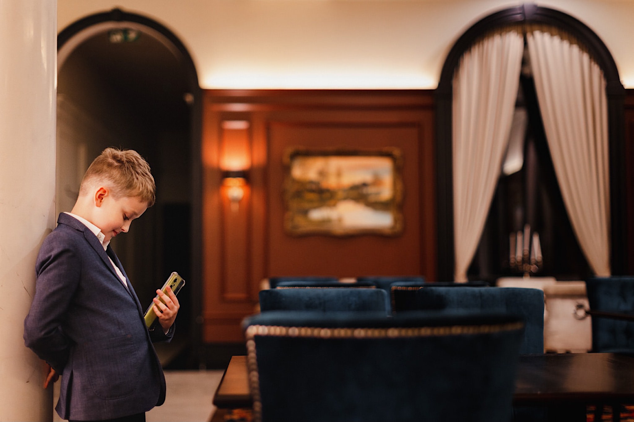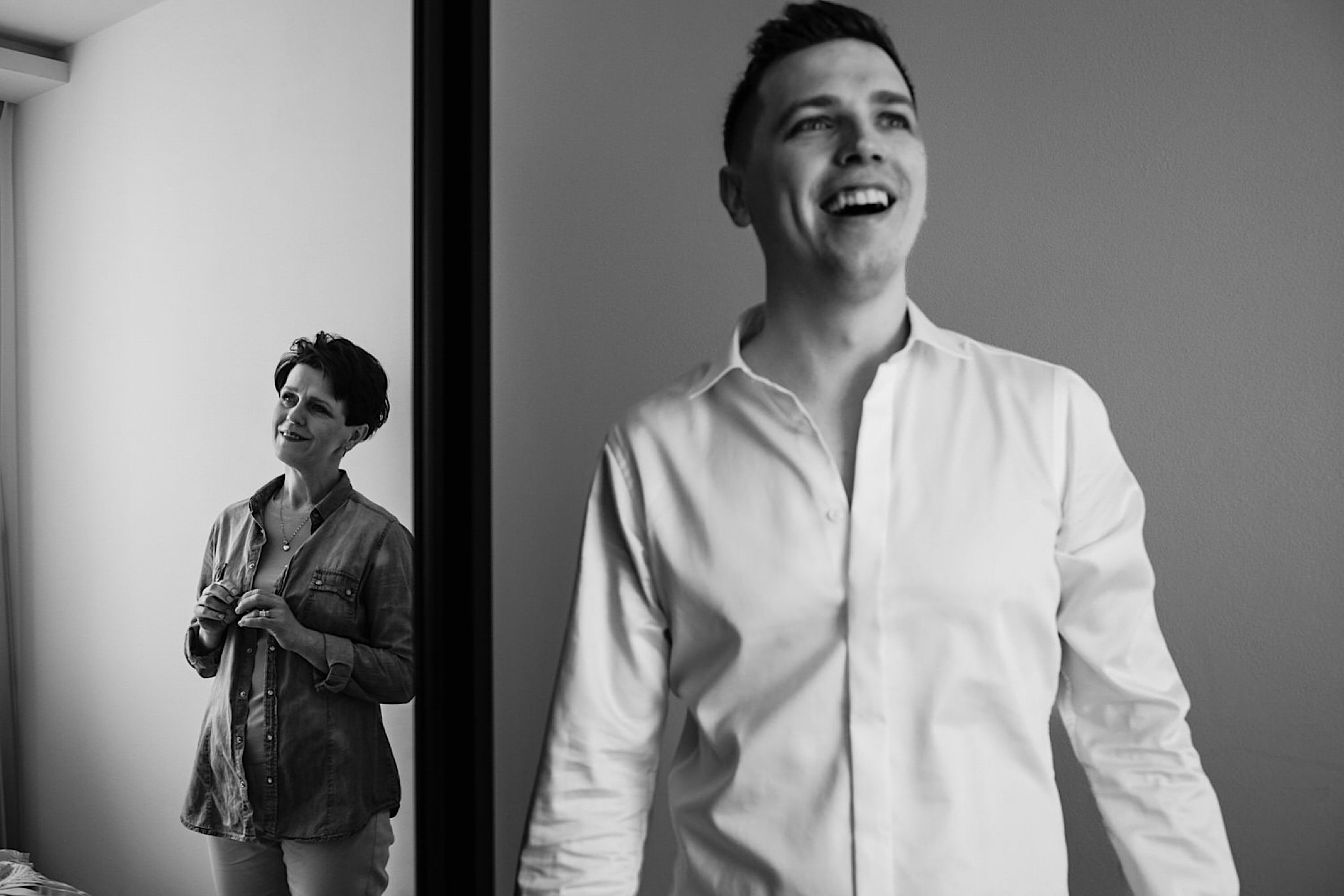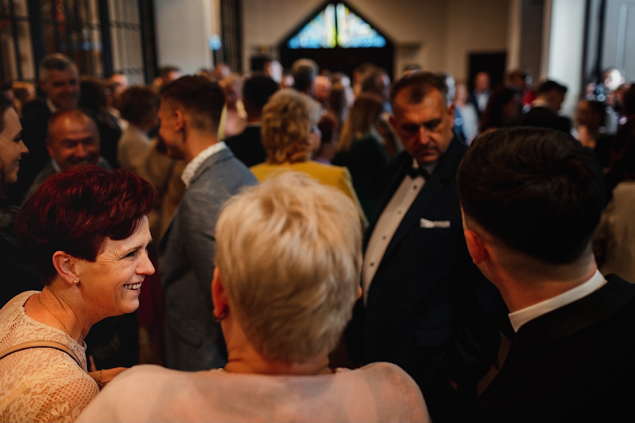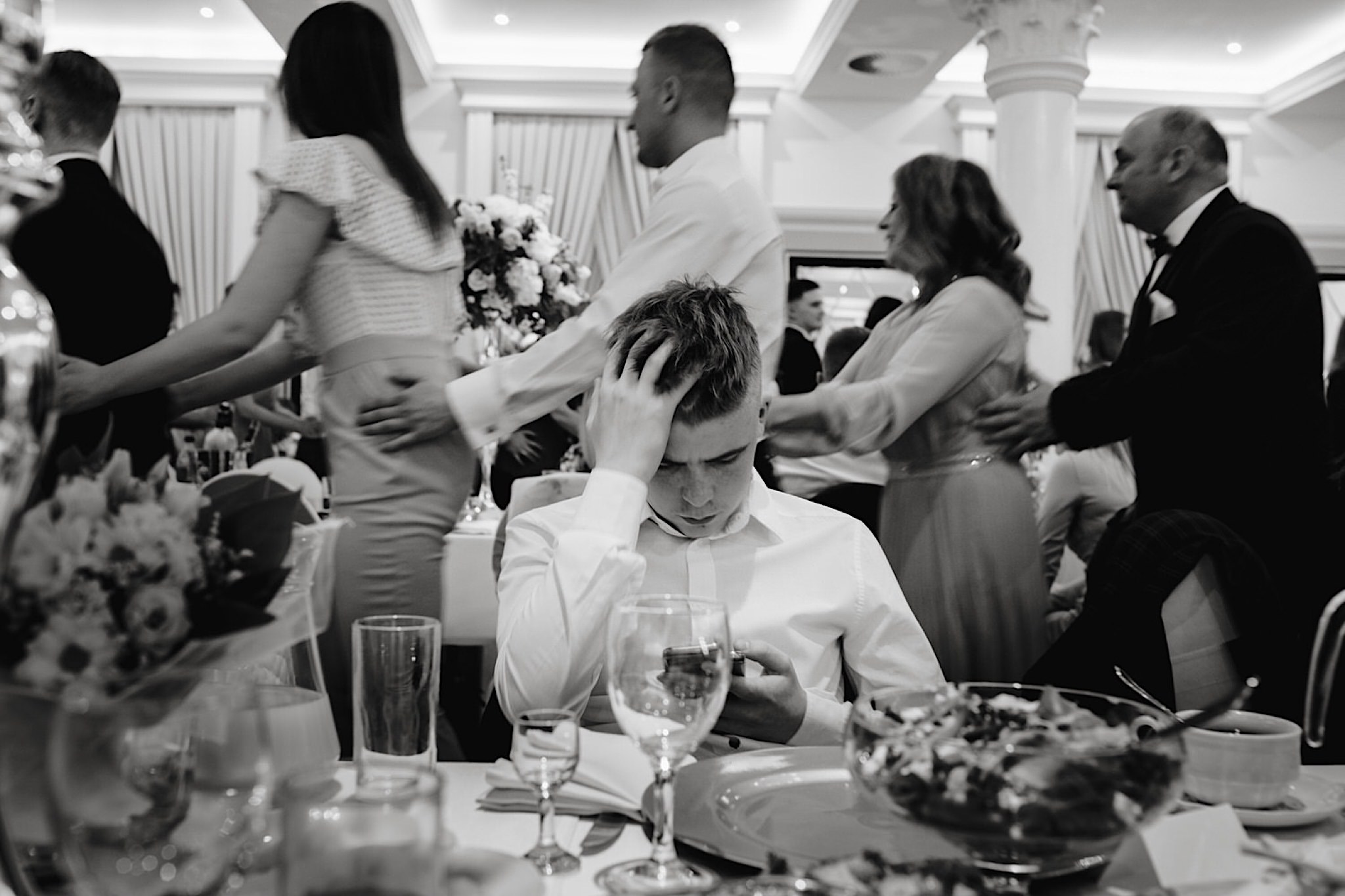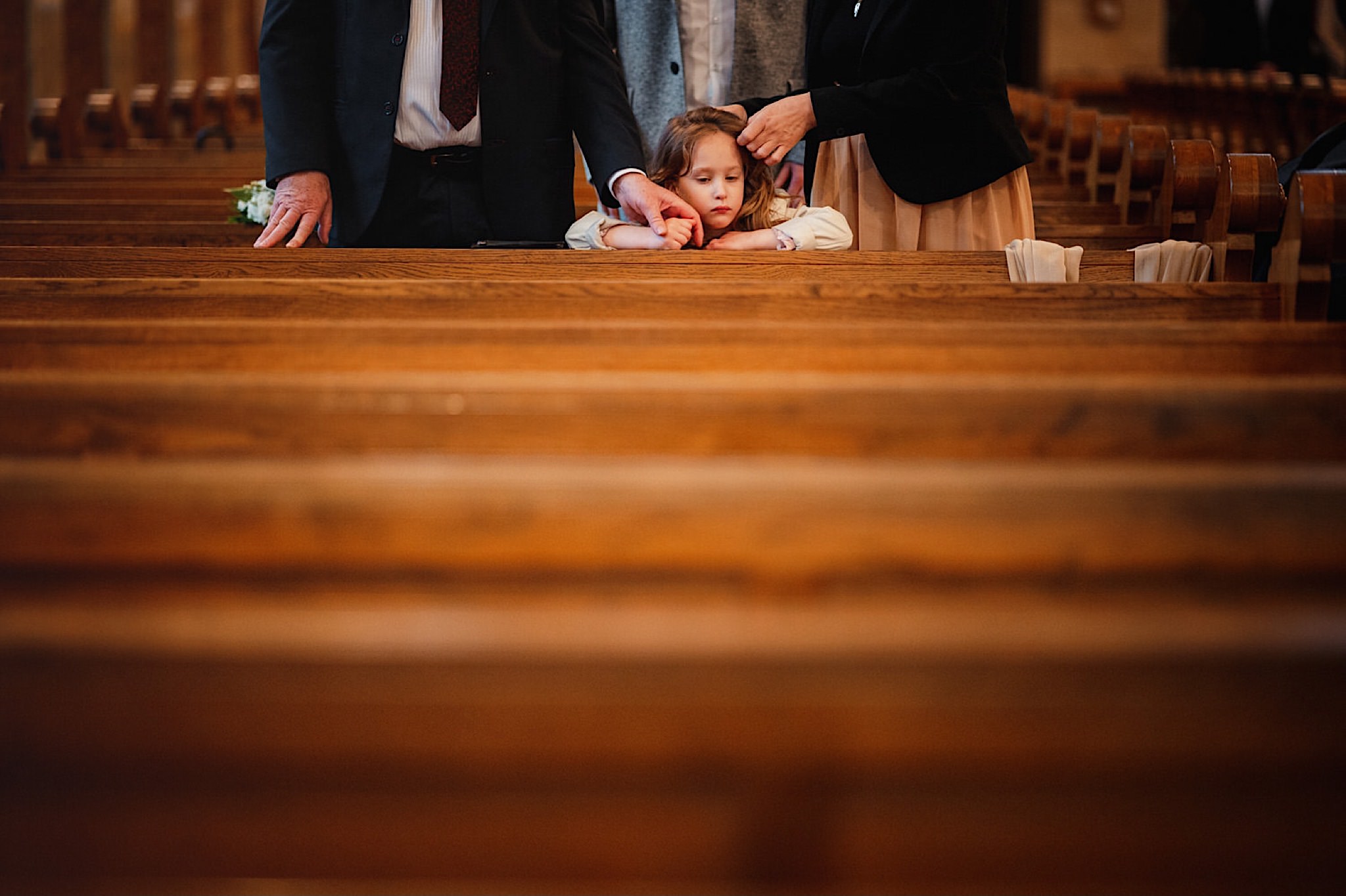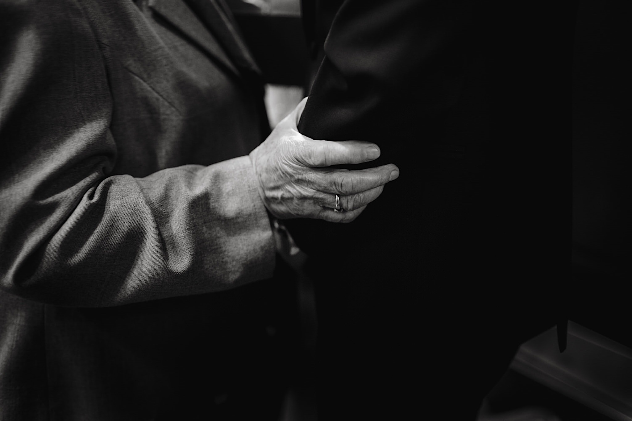 Dzień wesela rozpocząłem od przygotowań w mieszkaniu Pawła. Najbliższa rodzina z “synkiem” Dustinem na czele. Trochę wspominania starych, piłkarskich czasów, oglądanie kolekcji koszulek, prasowanko, latanie po schodach w tę i we w tę. Wszystko w luźnej i przyjaznej atmosferze. A o to żebyśmy mieli wystarczająco dużo czasu zadbał drużba, który się LEKKO spóźnił 😉 Jak już przyszedł to tak szybko ubierał Pana Młodego, że guzik w marynarce tego nie wytrzymał. Następnie przyszedł czas na wizytę w domu rodzinnym Natalii. Trzy pokolenia serdeczności i uśmiechu 🙂 Makijaż babci, historie z panieńskiego, małe problemy przy otwieraniu szampana, selfie dziewczyn z suknią w tle (szacun za kadrowanie!), konsumowanie szampejna, rapsy przy ubieraniu, kilka portretow i przyjechał Paweł. Chwile oczekiwania i przyszedł czas na jeden z najbardziej emocjonalnych first look’ow jakie widziałem (a było ich całkiem sporo). Mówią, że piłkarze to łobuzy, a wiadomo kto kocha najmocniej 🙂 Pawła na widok Natalii w sukni ślubnej rozwaliło całkowicie. Wzrusz totalny. Nie spokojniej było na błogosławieństwie.