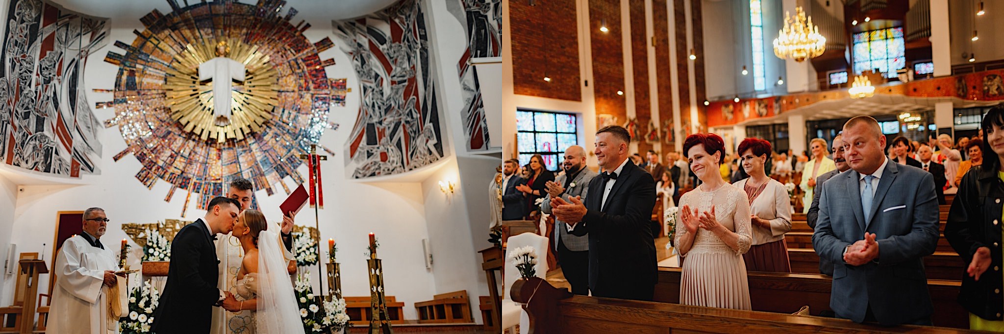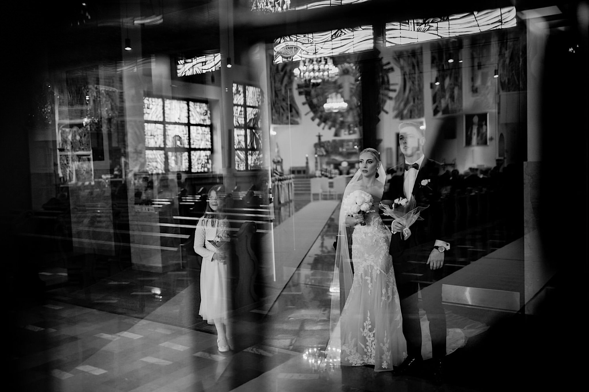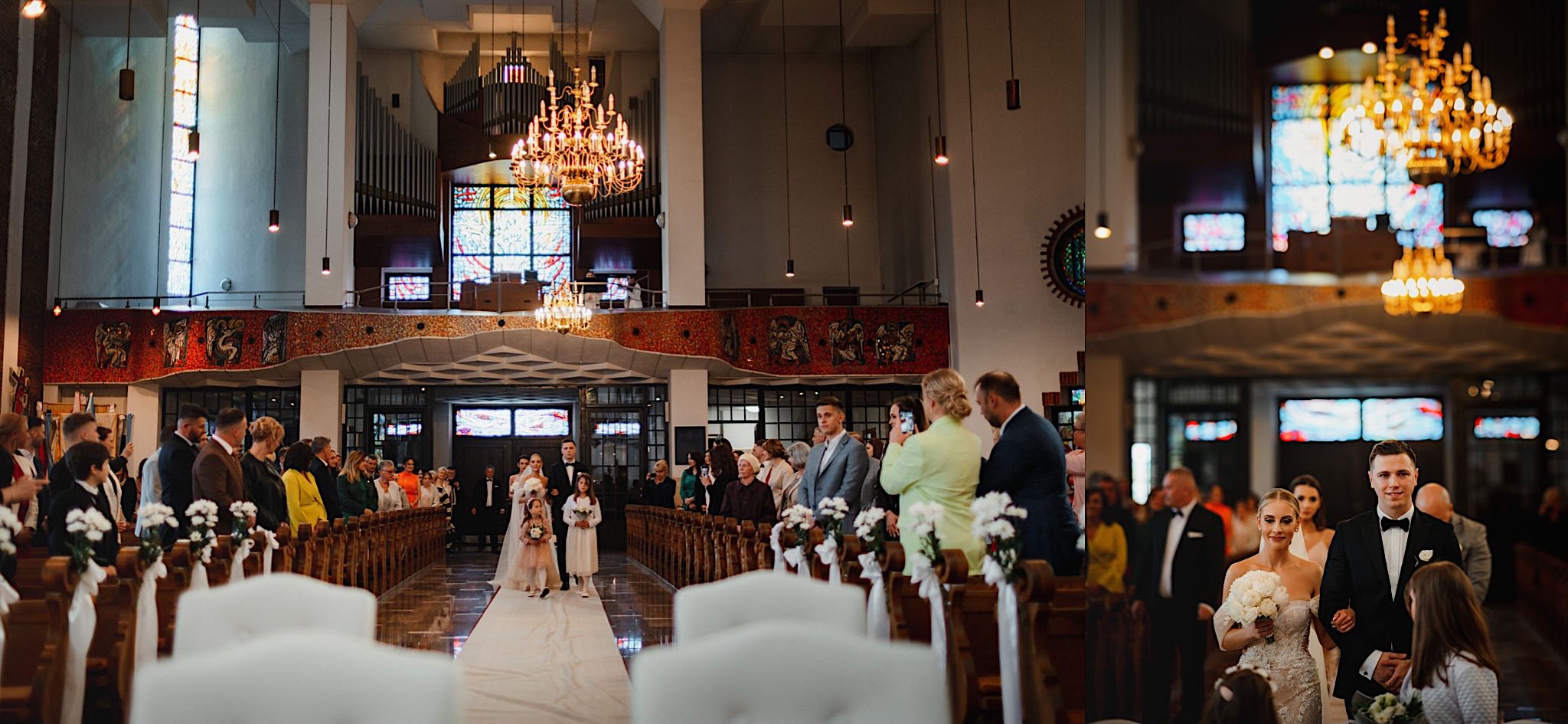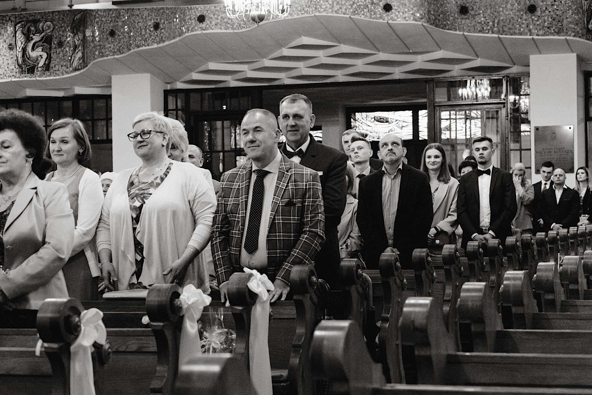 Przyszedł czas na najwazniejszy moment tego dnia czyli ceremonie, która odbyła się w Parafii Miłosierdzia Bożego w Ząbkach. Chwile przed wejściem do kościoła troszke pokropiło. Weszli do środka jak huragan, aż powyrywalo niektórym parasolki. Następnie małe kłopoty z rozwijaniem dywanu i później było już wszystko perfekcyjne! Uśmiechy, gesty, spojrzenia, całusy, brawa, emocjonalne życzenia i czas na imprezę!