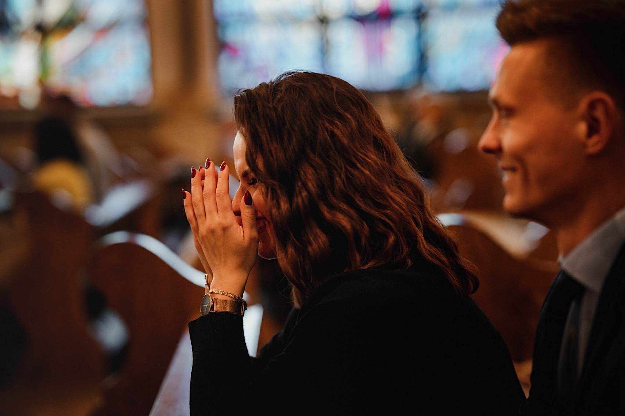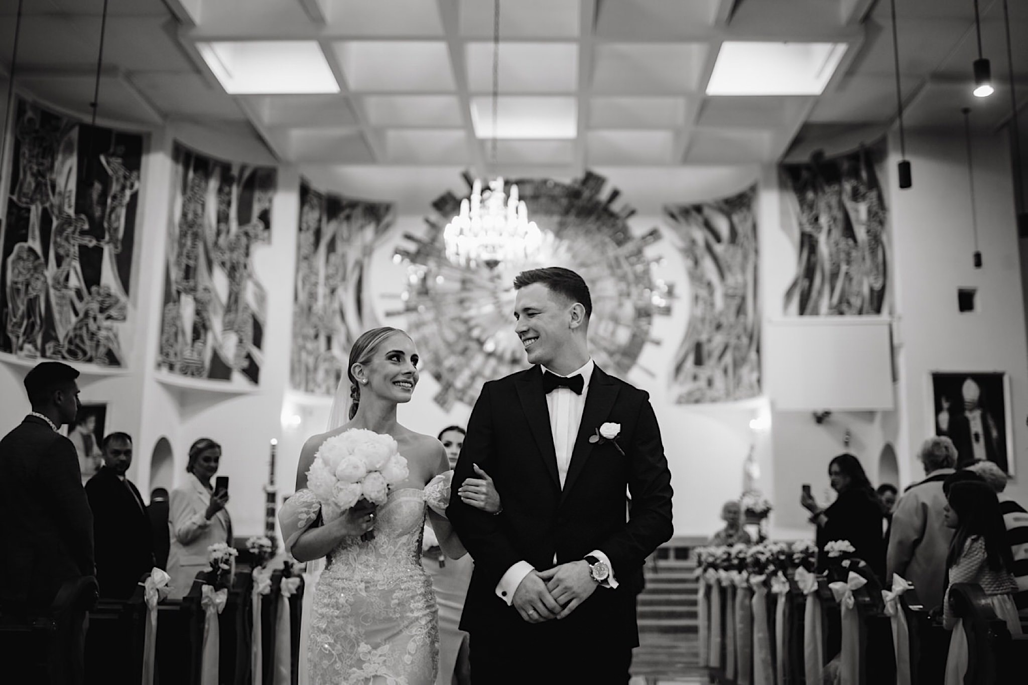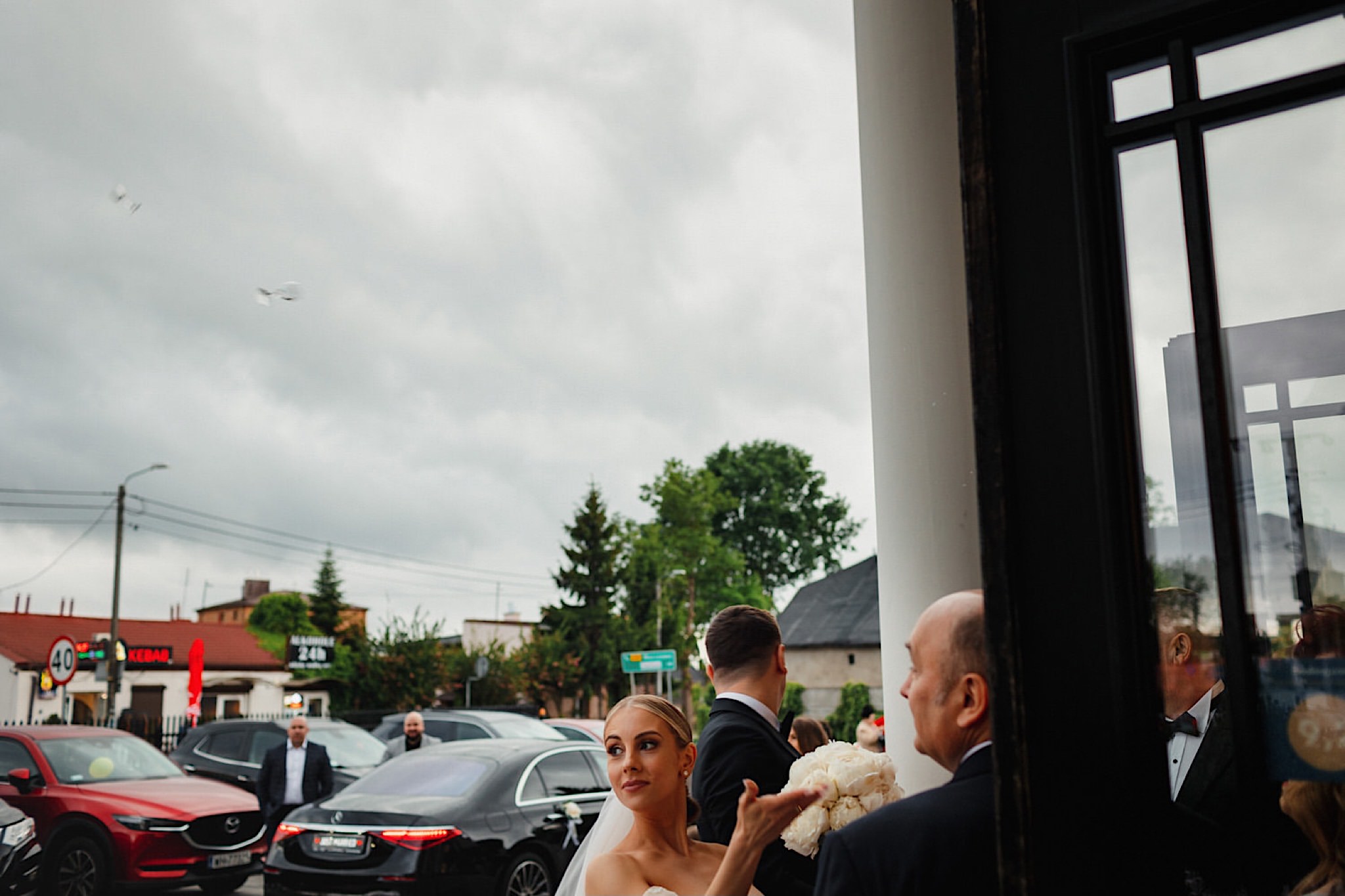 Przyszedł czas na najwazniejszy moment tego dnia czyli ceremonie, która odbyła się w Parafii Miłosierdzia Bożego w Ząbkach. Chwile przed wejściem do kościoła troszke pokropiło. Weszli do środka jak huragan, aż powyrywalo niektórym parasolki. Następnie małe kłopoty z rozwijaniem dywanu i później było już wszystko perfekcyjne! Uśmiechy, gesty, spojrzenia, całusy, brawa, emocjonalne życzenia i czas na imprezę!