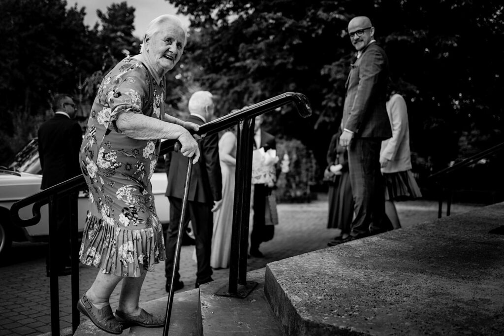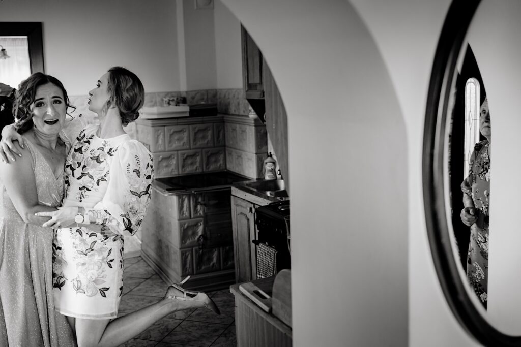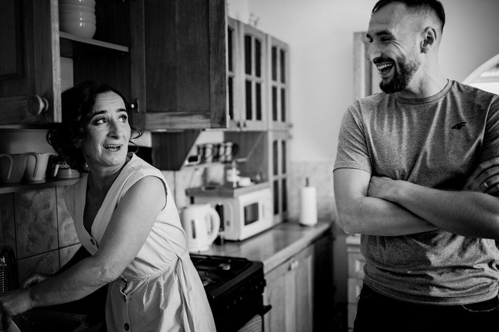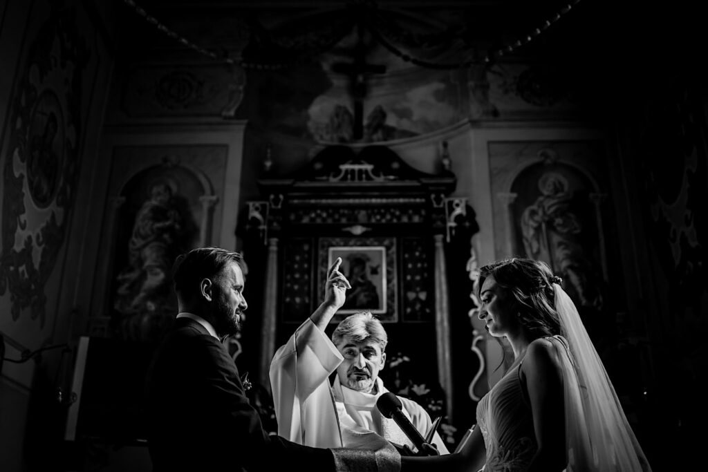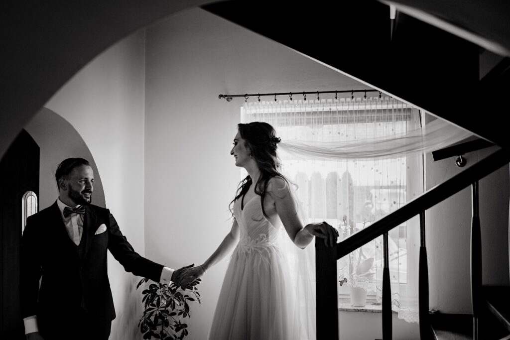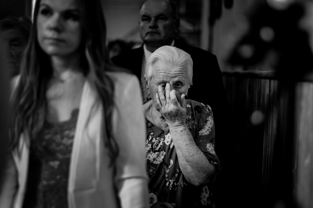 Z bohaterami tego wpisu spotkaliśmy się na sesji narzeczeńskiej. Z mojej perspektywy bardzo udanej (możecie ją obejrzeć tutaj). Miałem zatem spore oczekiwania i pędziłem do nich ponad 400km z uśmiechem na ustach. Choć ślub i wesele mieli nieopodal mnie. Już od samego początku wiedziałem, ze będzie dobrze. Wszechobecny chaos, który bardzo lubię! Wszyscy serdeczni, wyluzowani i uśmiechnięci. Było malowanko panny młodej przy playliście, która pokrywała się w 100% z moimi preferencjami muzycznymi, bieganie po schodach, pozdrawianie fotografa środkowym palcem (pozdro Anita, bez palca :p), jedzenie pizzy, pokaz mody Kubota, długo wyczekiwany first look (ale udany!) i w drogę do kościoła. Tak im się śpieszyło, że Paula po drodze zgubiła welon. Jeszcze tylko zabawna brama ustawiona przez sąsiadów, który skończył się praktycznym prezentem dla Panny Młodej 🙂 i czas na ceremonię.