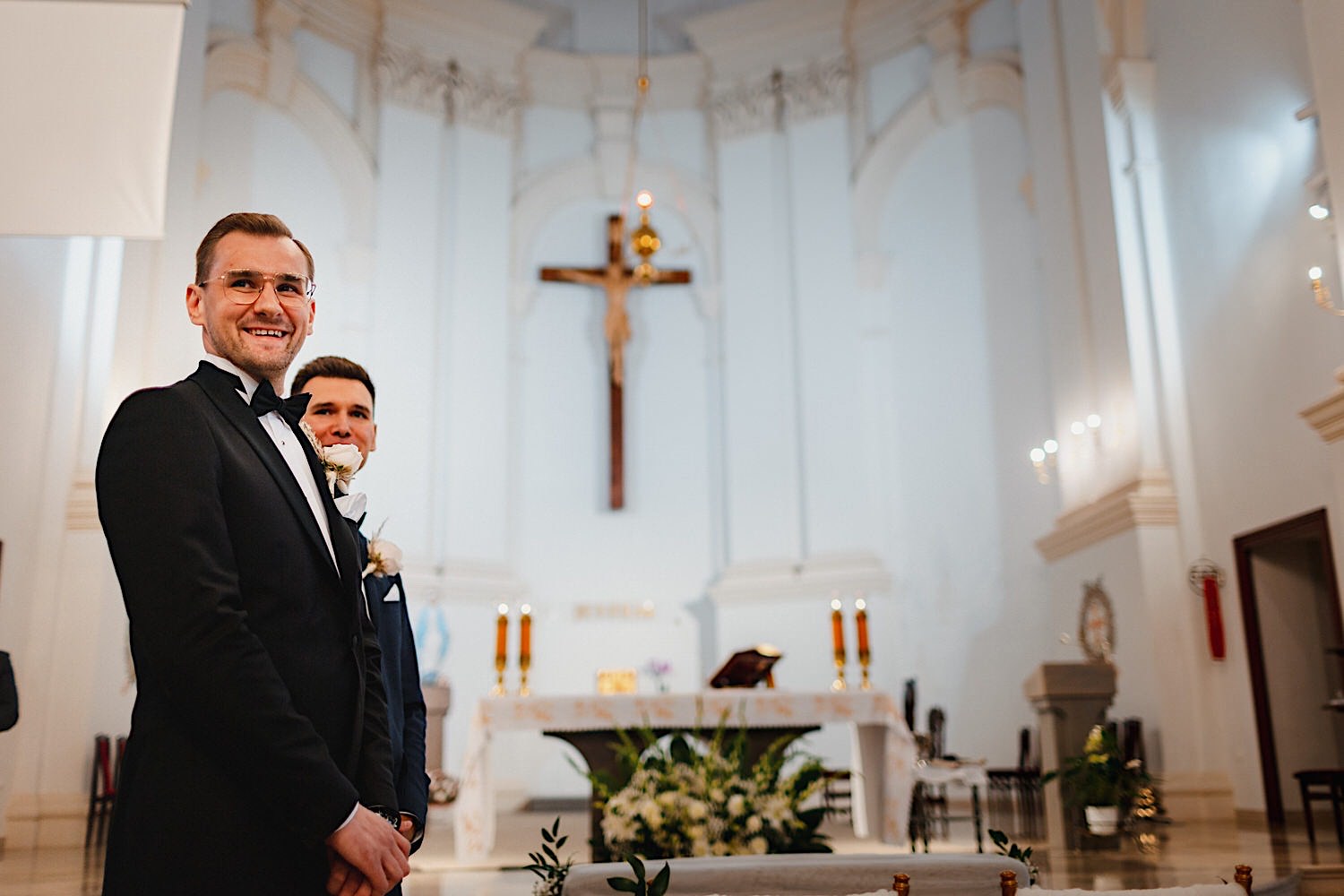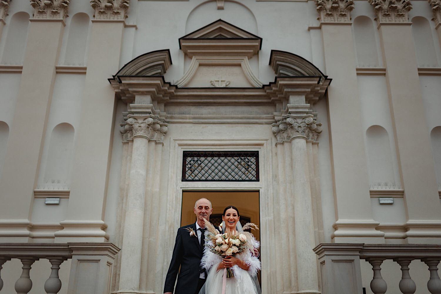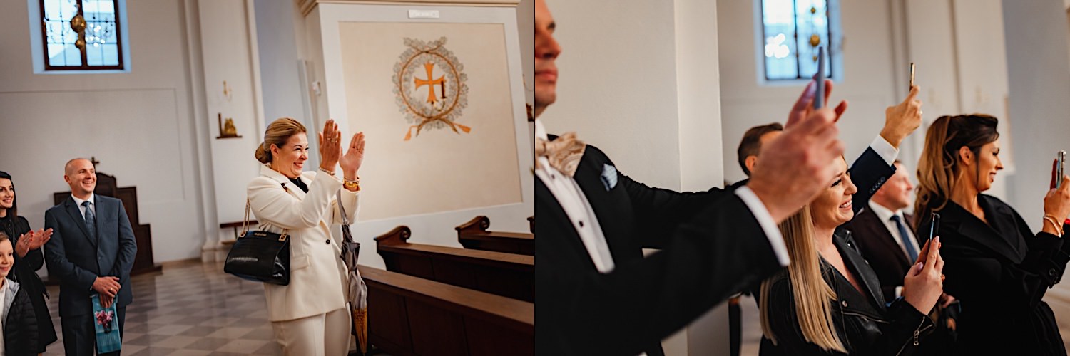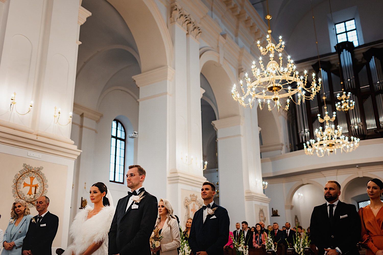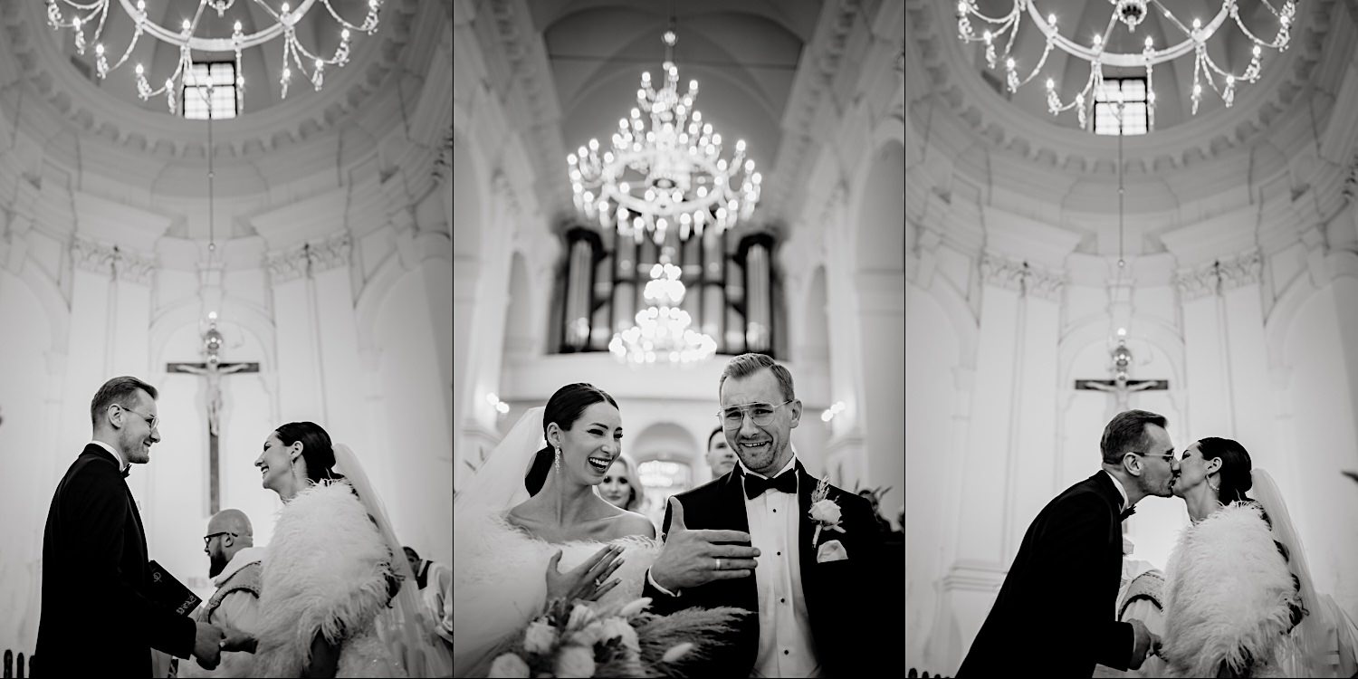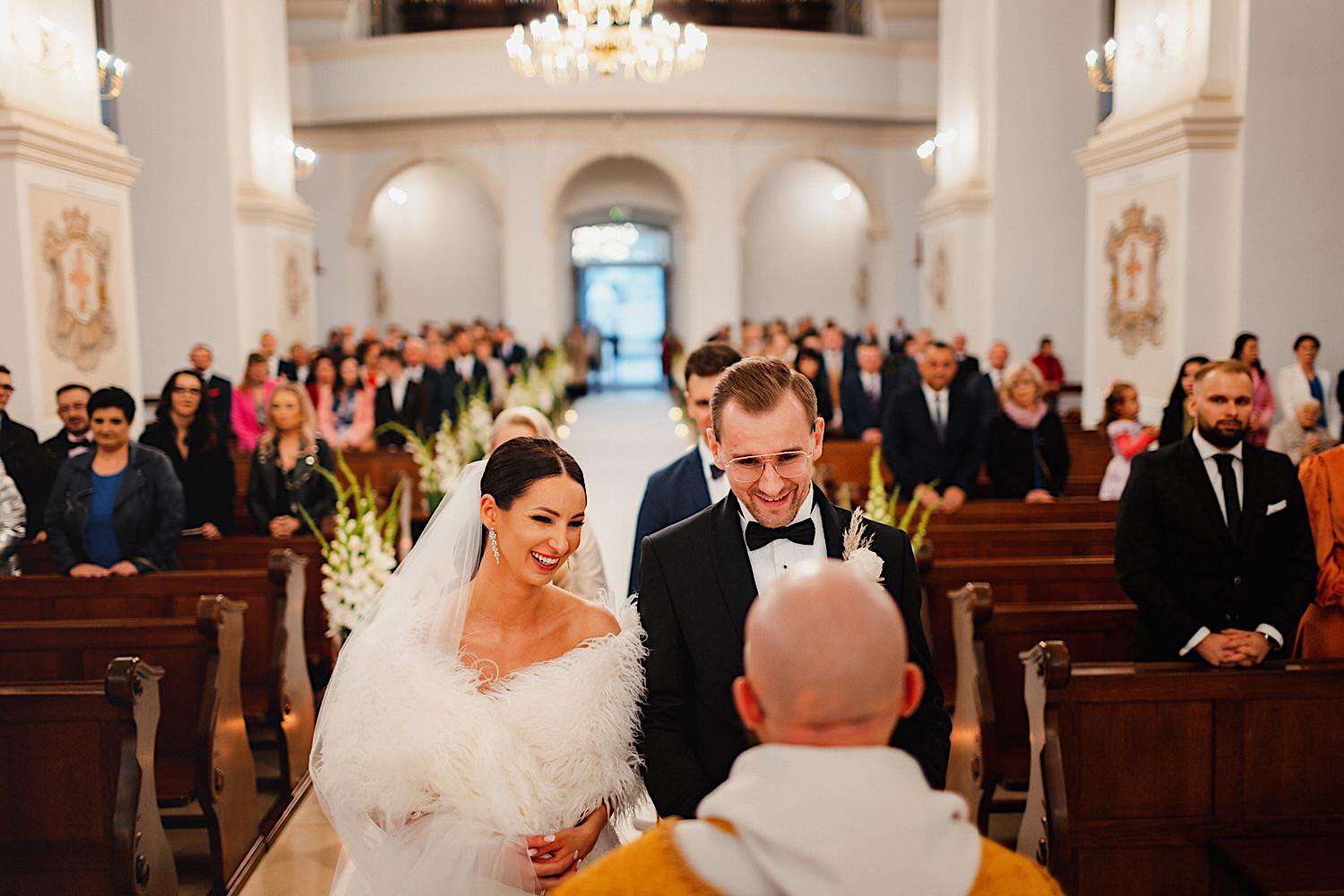 Następnie przyszedł czas na ceremonię, która odbyła się w Kościele Franciszkanów pw. Zwiastowania NMP. A rozpoczęła się od bardzo emocjonalnego wejścia Marioli z Tatusiem. Jak już wszyscy usiedli to zobaczyłem sporo znajomych i uśmiechniętych Mordeczek 🙂 O piękną muzykę, która potęgowała emocje zadbał – “Inny kwartet”. Atmosfera na przysiędze była tak podniosła, że pospadały złote bransolety. Przyszedł czas na mokre wyjście i wejście na imprezę!