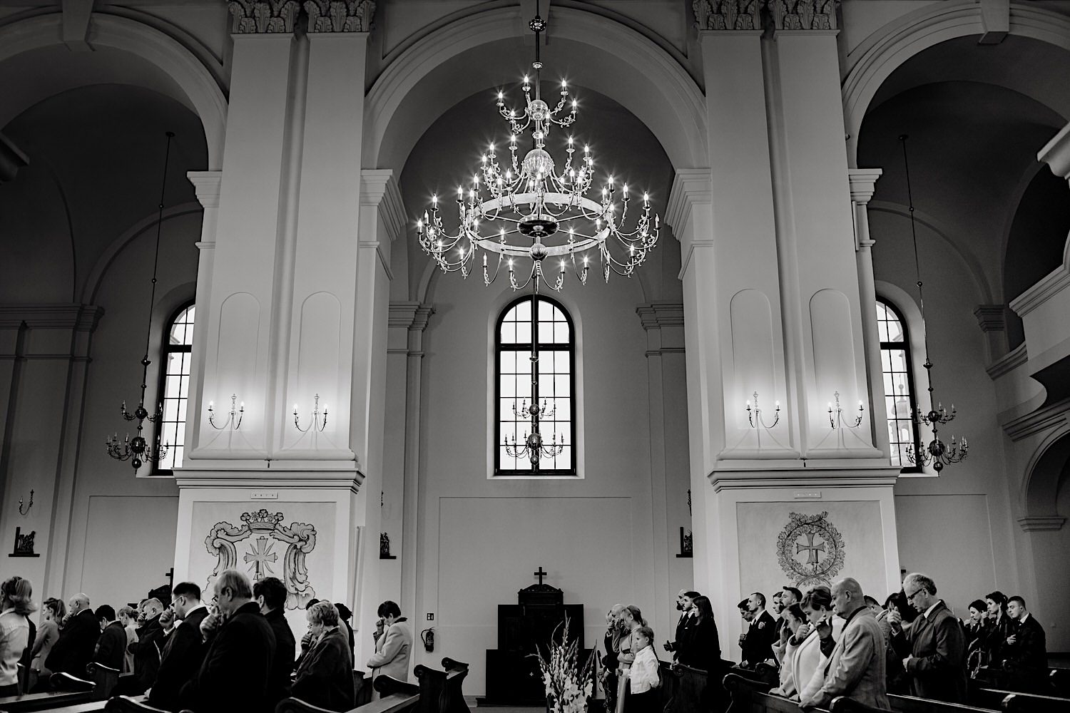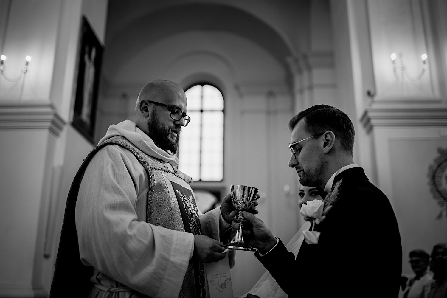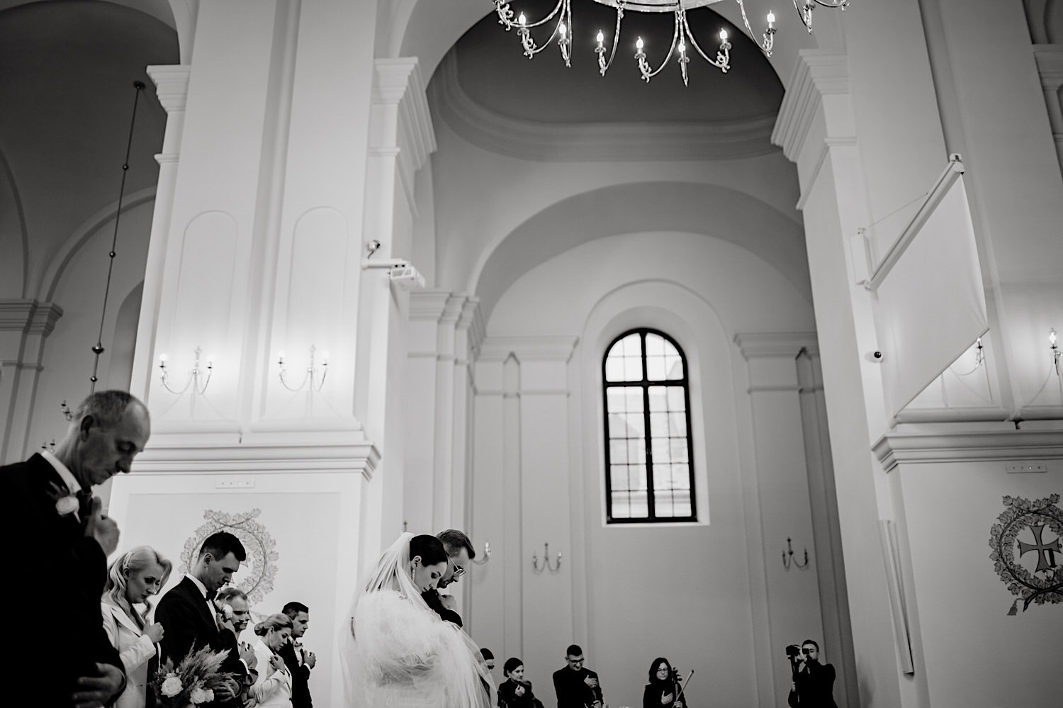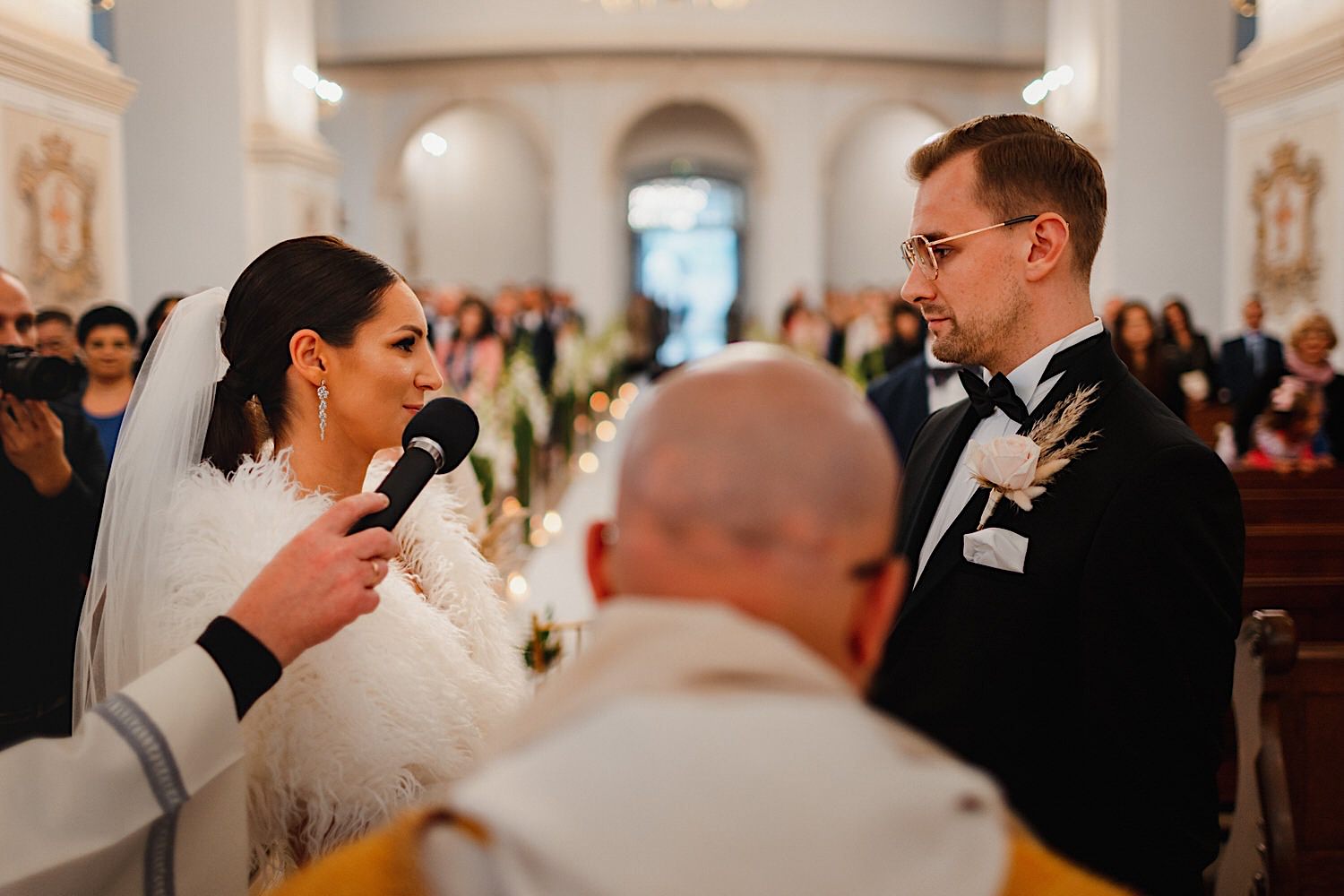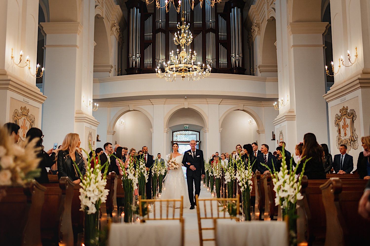 Następnie przyszedł czas na ceremonię, która odbyła się w Kościele Franciszkanów pw. Zwiastowania NMP. A rozpoczęła się od bardzo emocjonalnego wejścia Marioli z Tatusiem. Jak już wszyscy usiedli to zobaczyłem sporo znajomych i uśmiechniętych Mordeczek 🙂 O piękną muzykę, która potęgowała emocje zadbał – “Inny kwartet”. Atmosfera na przysiędze była tak podniosła, że pospadały złote bransolety. Przyszedł czas na mokre wyjście i wejście na imprezę!