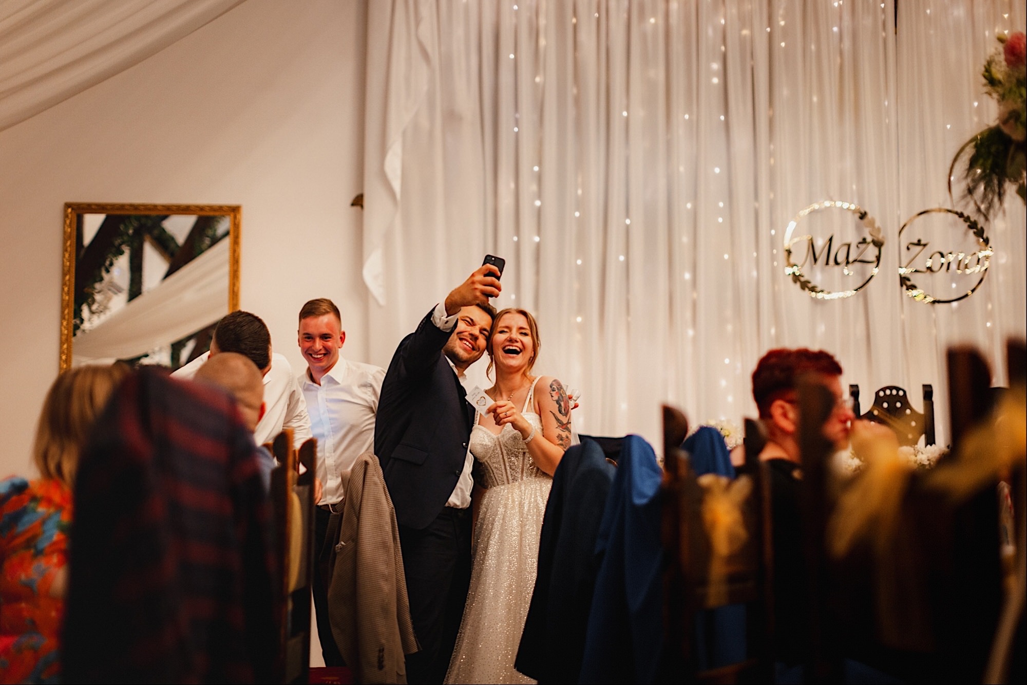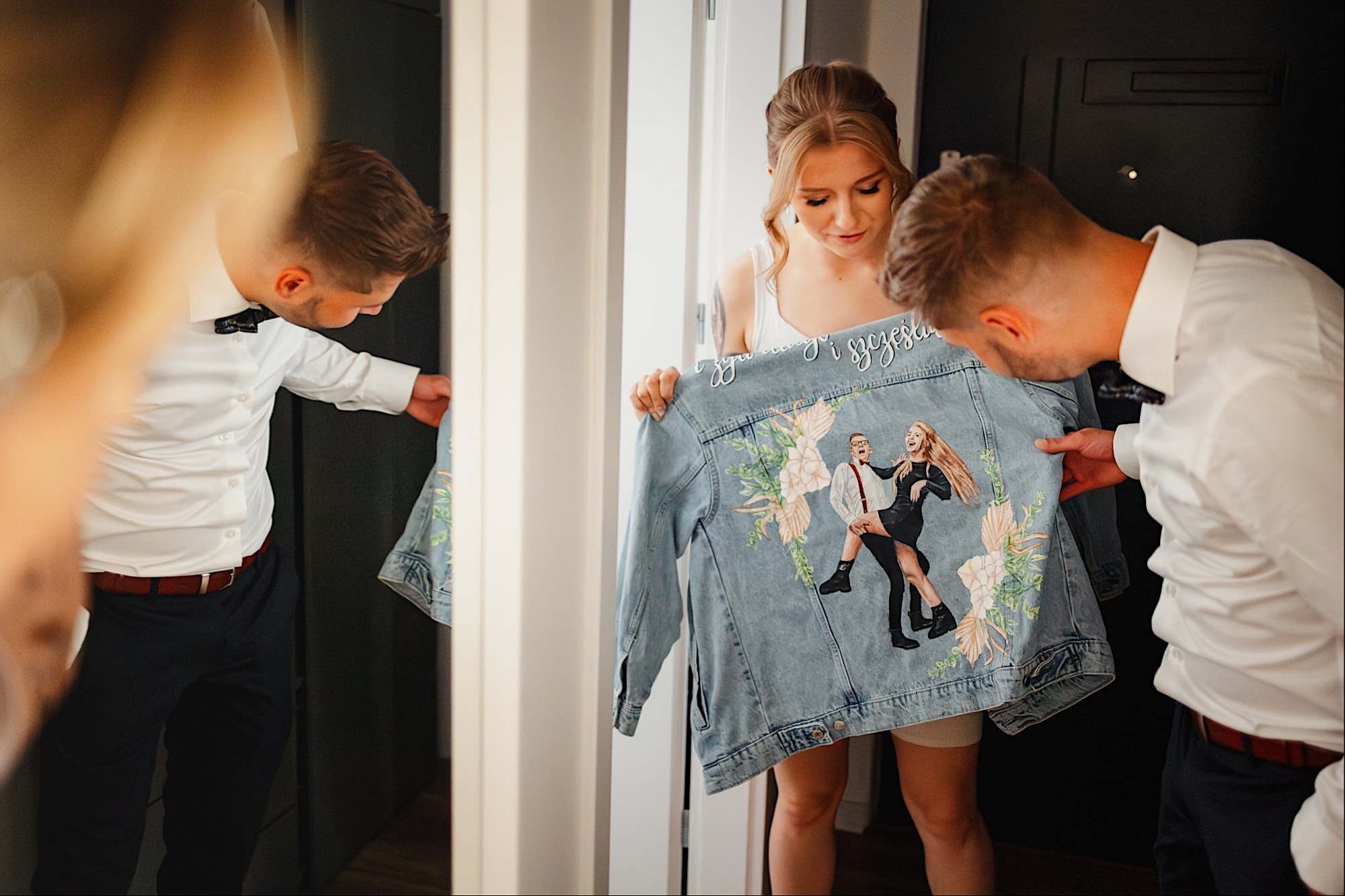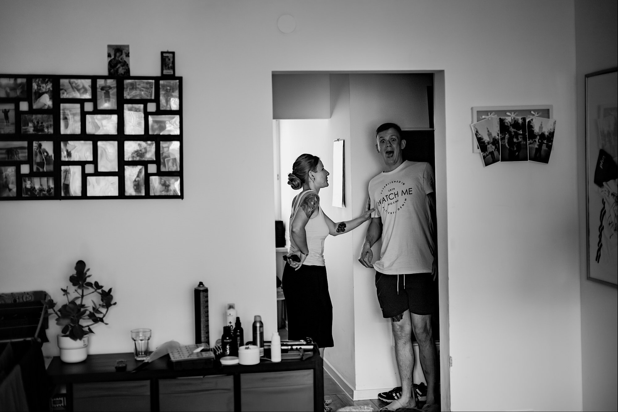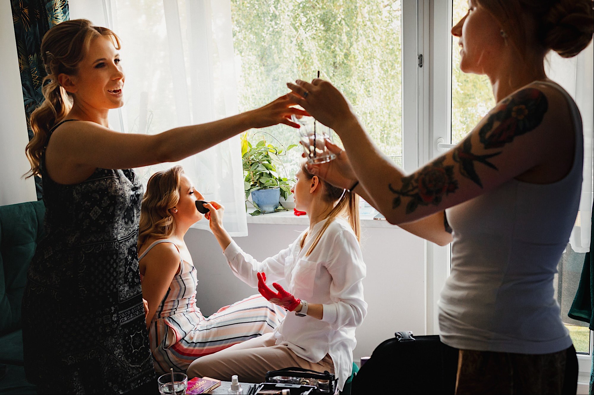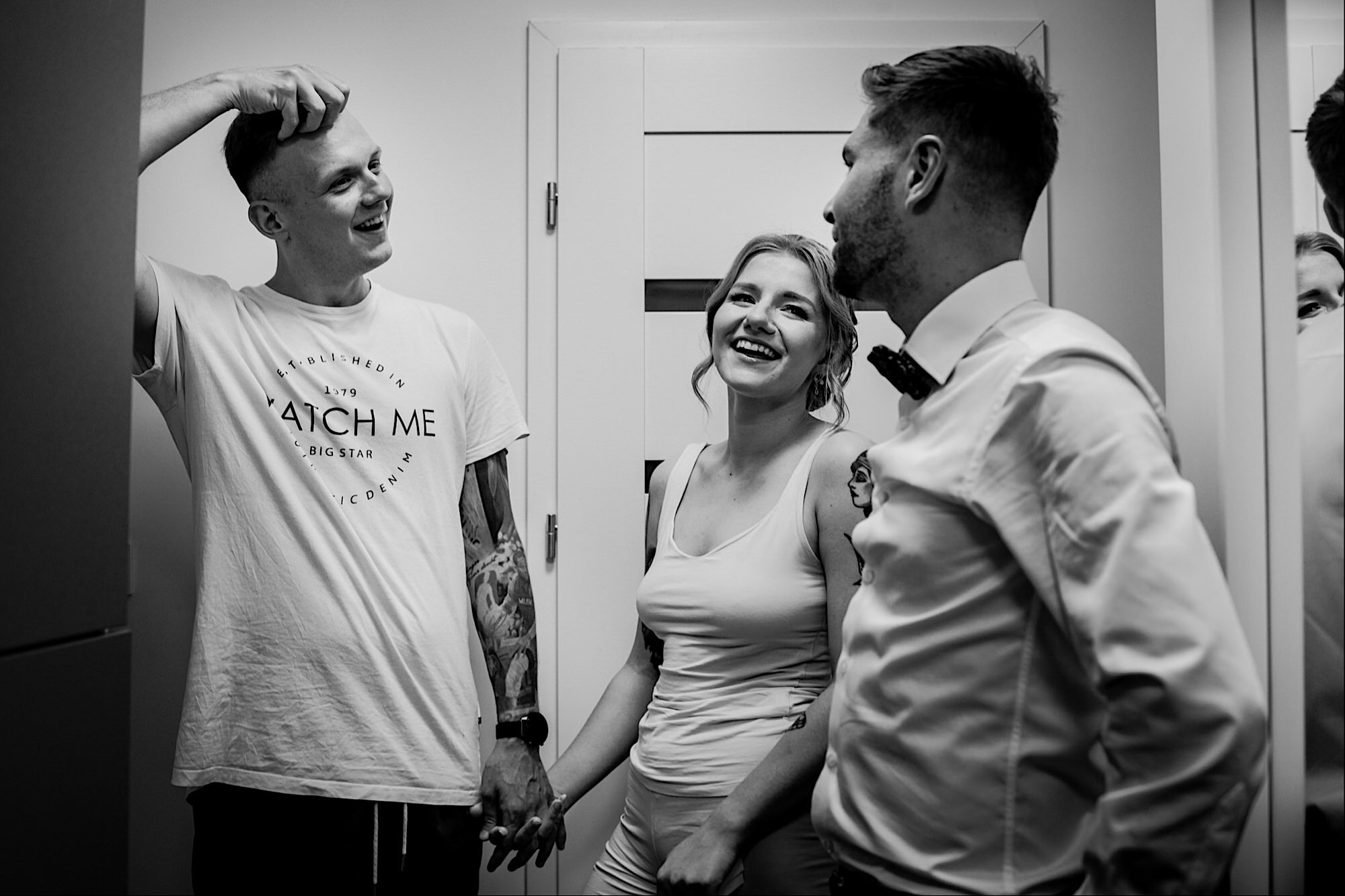 Pędziłem do nich do dalekiego (dla mnie) Pruszkowa. Pierwsze skojarzenie, wiadomo – gangsterka. Jak gangsterka to luz i zabawa. A to już całkiem blisko do naszych głównych bohaterów. Tak też było od samego początku. Sami najbliżsi, makijażystka, biegający i sikający pies (a to nie jedyne sikowaki tego dnia) czyli chaosik, który bardzo lubię 🙂 Mnóstwo śmiechu, niemniej tematów do rozmów – tatuaże, siatkówka, koszykówka, panieński… czyli wszystko co bywa bolesne, męczące ale dające finalnie sporo radościi 🙂 Był też niebieskowłosy Ninja. Kiedy ten chaos się trochę rozluźnił, zanim Maciek się ubrał mieliśmy też chwilę porozmawiać o poważniejszych tematach. To jeden z tych gości, których spotkało się kilka razy w życiu, a rozmawia się jak ze starym kumplem 🙂 Później szybka zmiana lokalizacji, równie szybkie wiązanie sukni i na sygnale do kościoła!