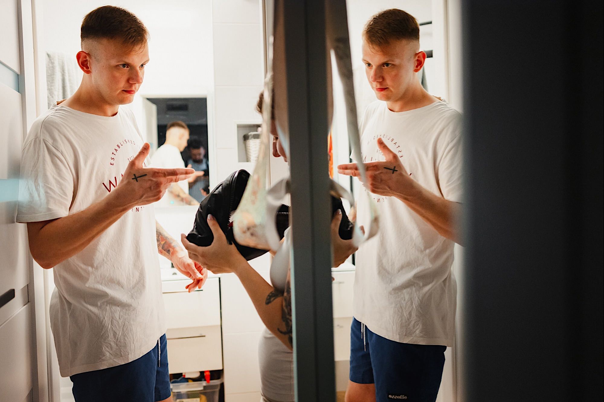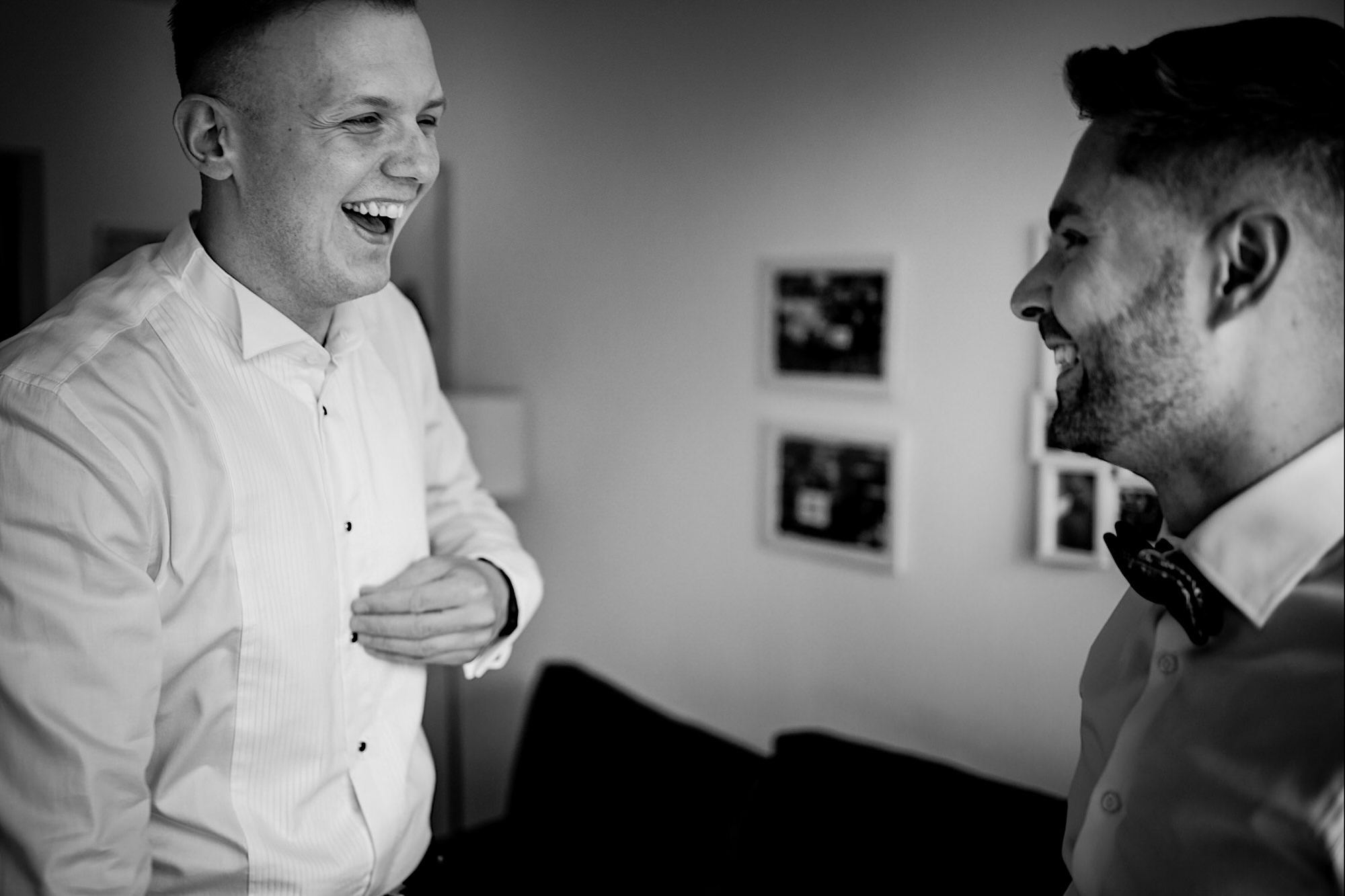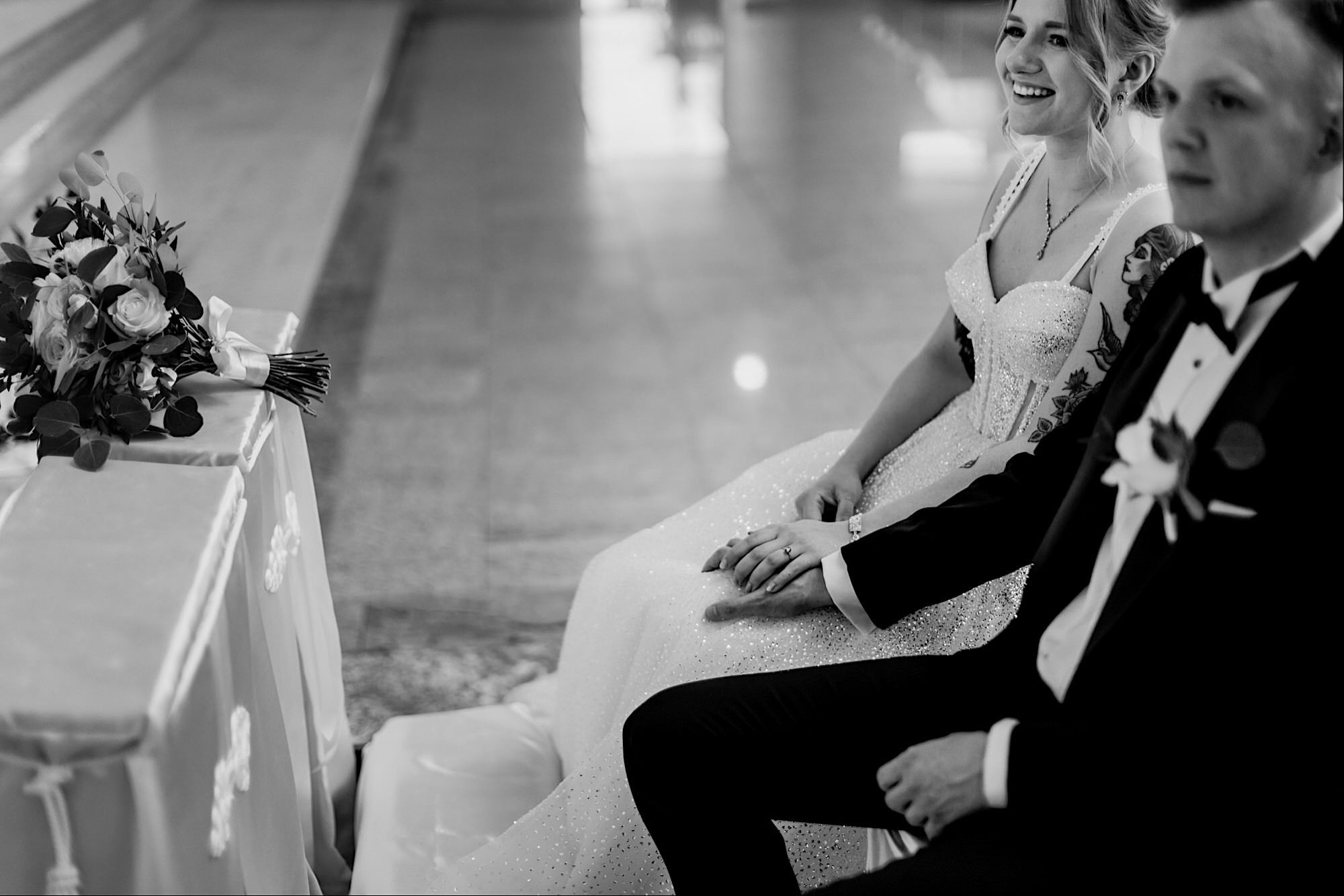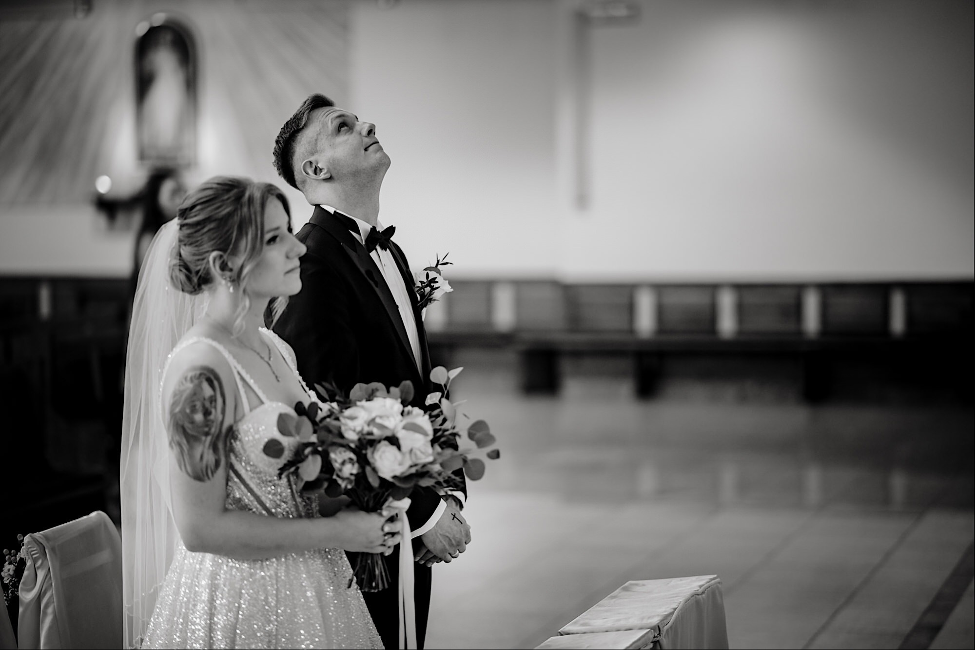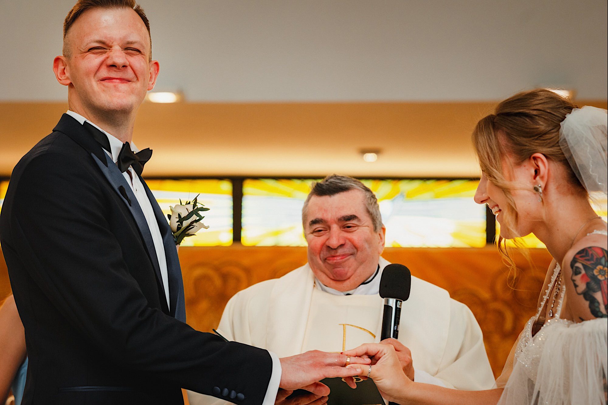 Pędziłem do nich do dalekiego (dla mnie) Pruszkowa. Pierwsze skojarzenie, wiadomo – gangsterka. Jak gangsterka to luz i zabawa. A to już całkiem blisko do naszych głównych bohaterów. Tak też było od samego początku. Sami najbliżsi, makijażystka, biegający i sikający pies (a to nie jedyne sikowaki tego dnia) czyli chaosik, który bardzo lubię 🙂 Mnóstwo śmiechu, niemniej tematów do rozmów – tatuaże, siatkówka, koszykówka, panieński… czyli wszystko co bywa bolesne, męczące ale dające finalnie sporo radościi 🙂 Był też niebieskowłosy Ninja. Kiedy ten chaos się trochę rozluźnił, zanim Maciek się ubrał mieliśmy też chwilę porozmawiać o poważniejszych tematach. To jeden z tych gości, których spotkało się kilka razy w życiu, a rozmawia się jak ze starym kumplem 🙂 Później szybka zmiana lokalizacji, równie szybkie wiązanie sukni i na sygnale do kościoła!