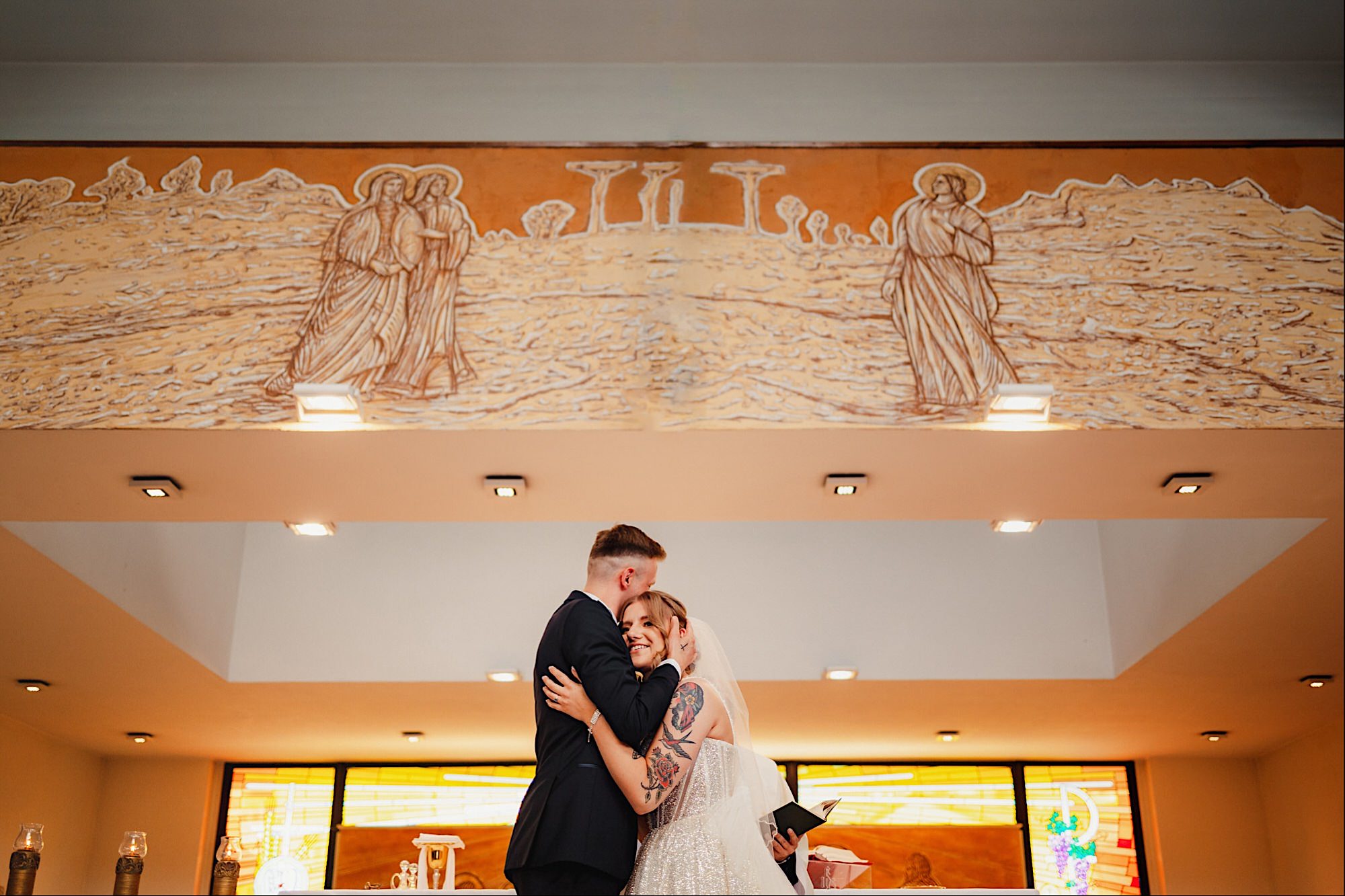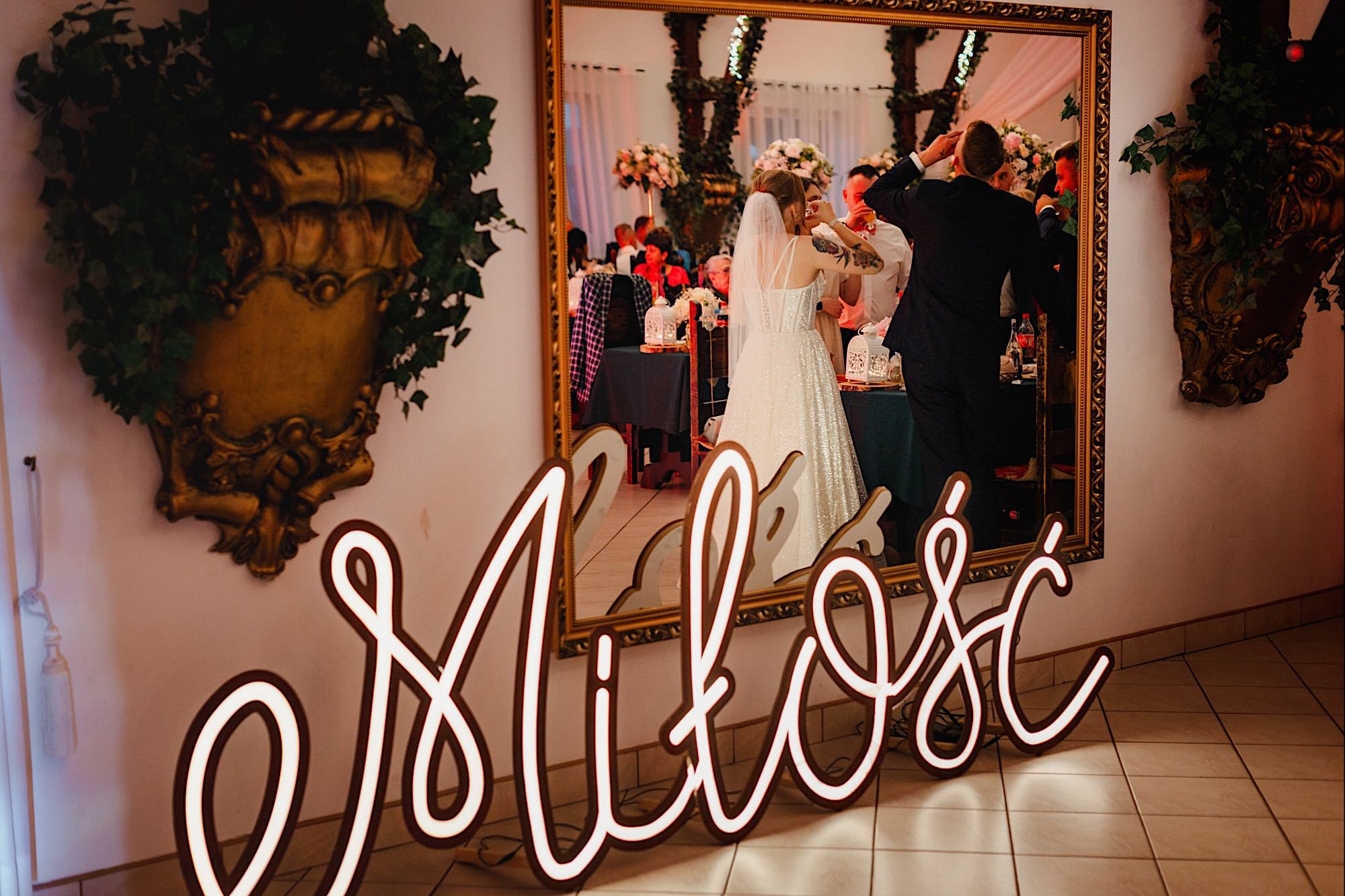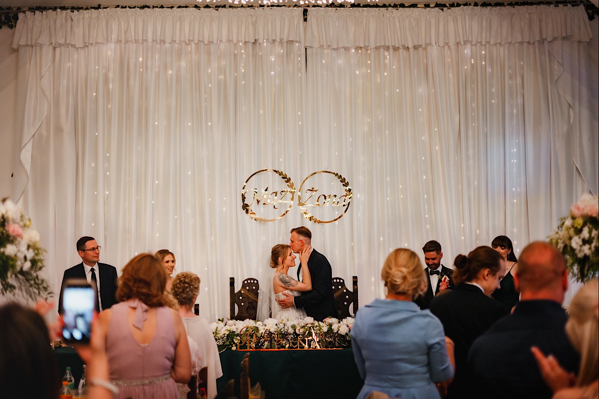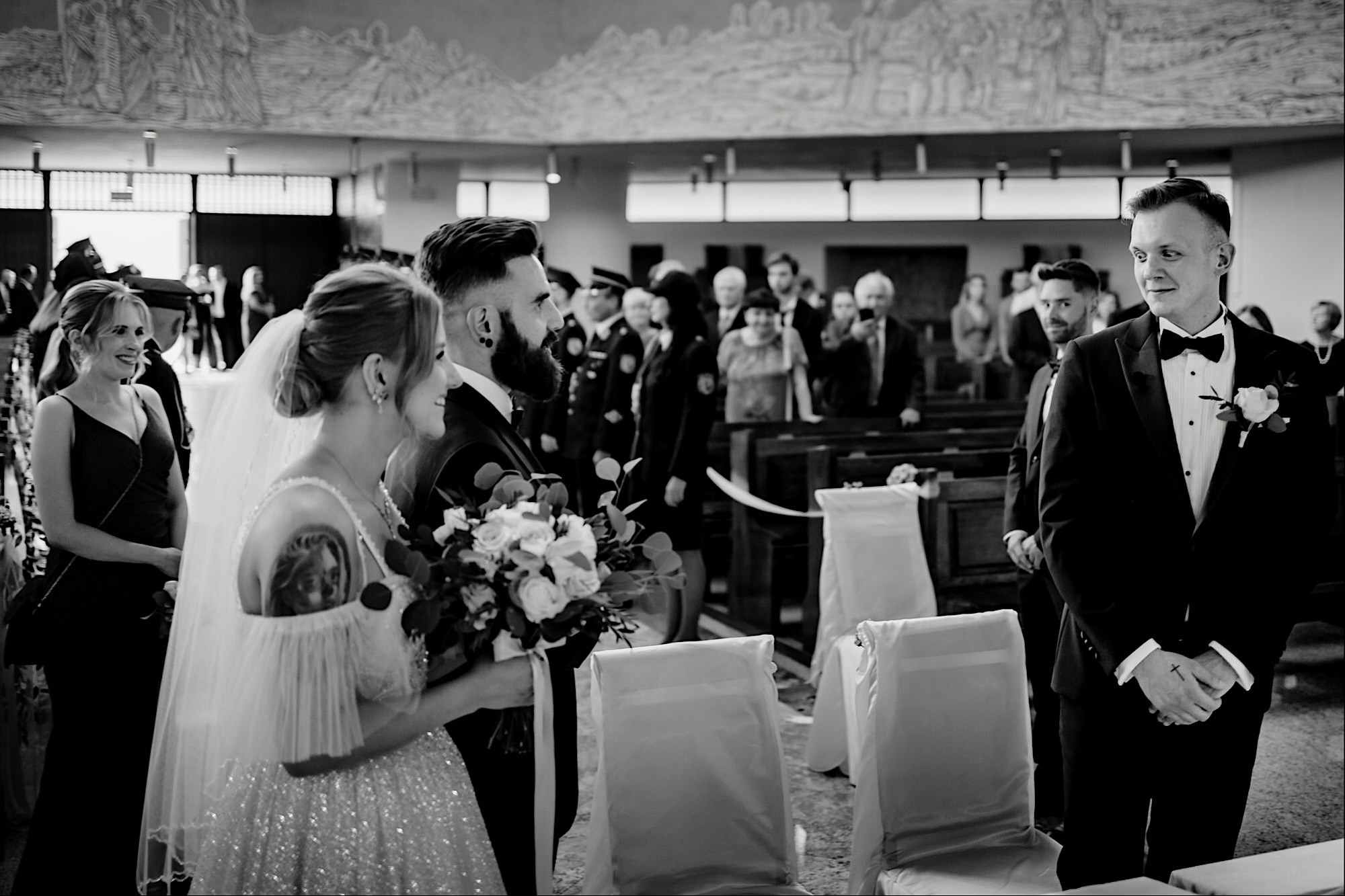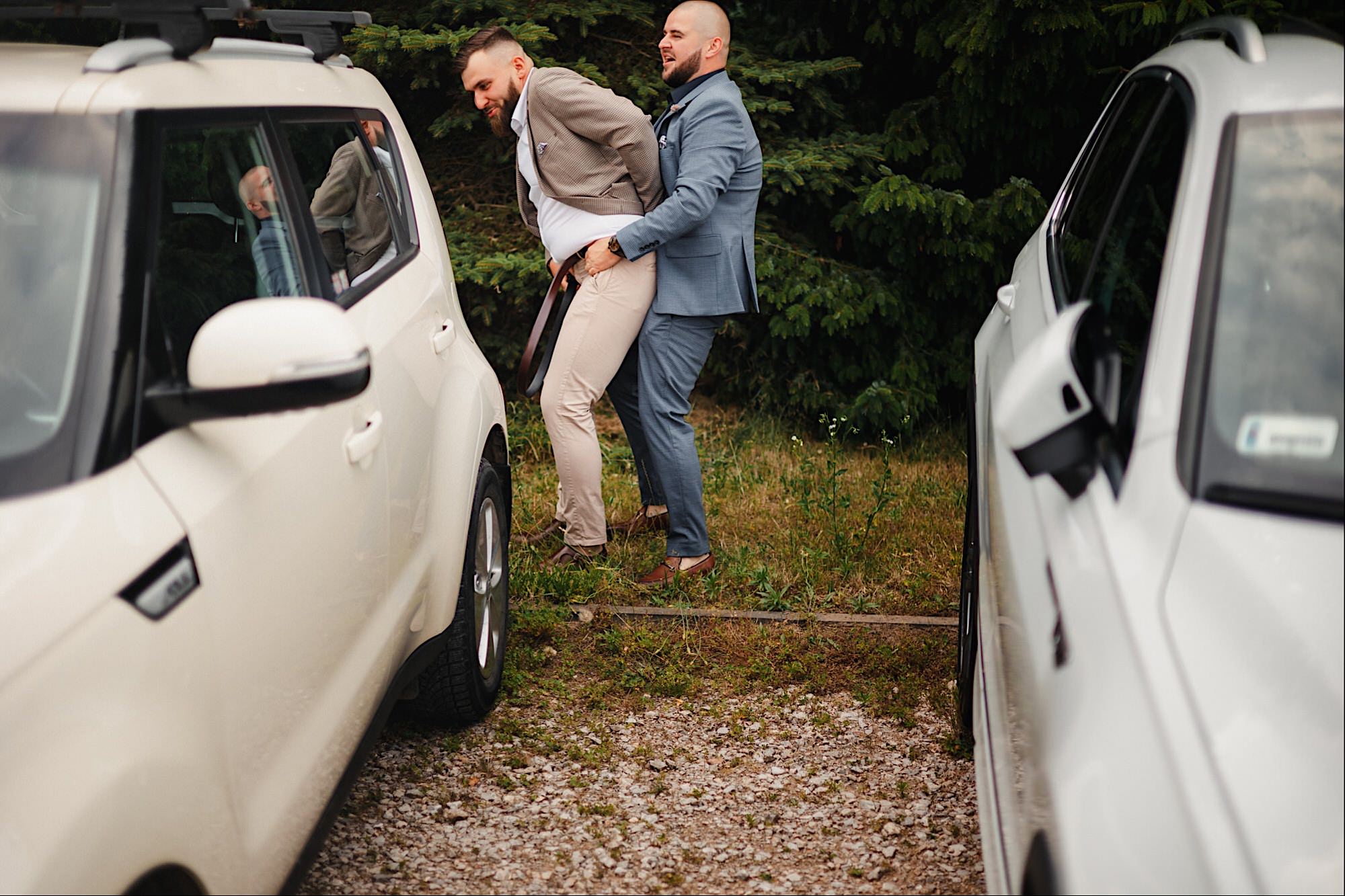 Pędziłem do nich do dalekiego (dla mnie) Pruszkowa. Pierwsze skojarzenie, wiadomo – gangsterka. Jak gangsterka to luz i zabawa. A to już całkiem blisko do naszych głównych bohaterów. Tak też było od samego początku. Sami najbliżsi, makijażystka, biegający i sikający pies (a to nie jedyne sikowaki tego dnia) czyli chaosik, który bardzo lubię 🙂 Mnóstwo śmiechu, niemniej tematów do rozmów – tatuaże, siatkówka, koszykówka, panieński… czyli wszystko co bywa bolesne, męczące ale dające finalnie sporo radościi 🙂 Był też niebieskowłosy Ninja. Kiedy ten chaos się trochę rozluźnił, zanim Maciek się ubrał mieliśmy też chwilę porozmawiać o poważniejszych tematach. To jeden z tych gości, których spotkało się kilka razy w życiu, a rozmawia się jak ze starym kumplem 🙂 Później szybka zmiana lokalizacji, równie szybkie wiązanie sukni i na sygnale do kościoła!