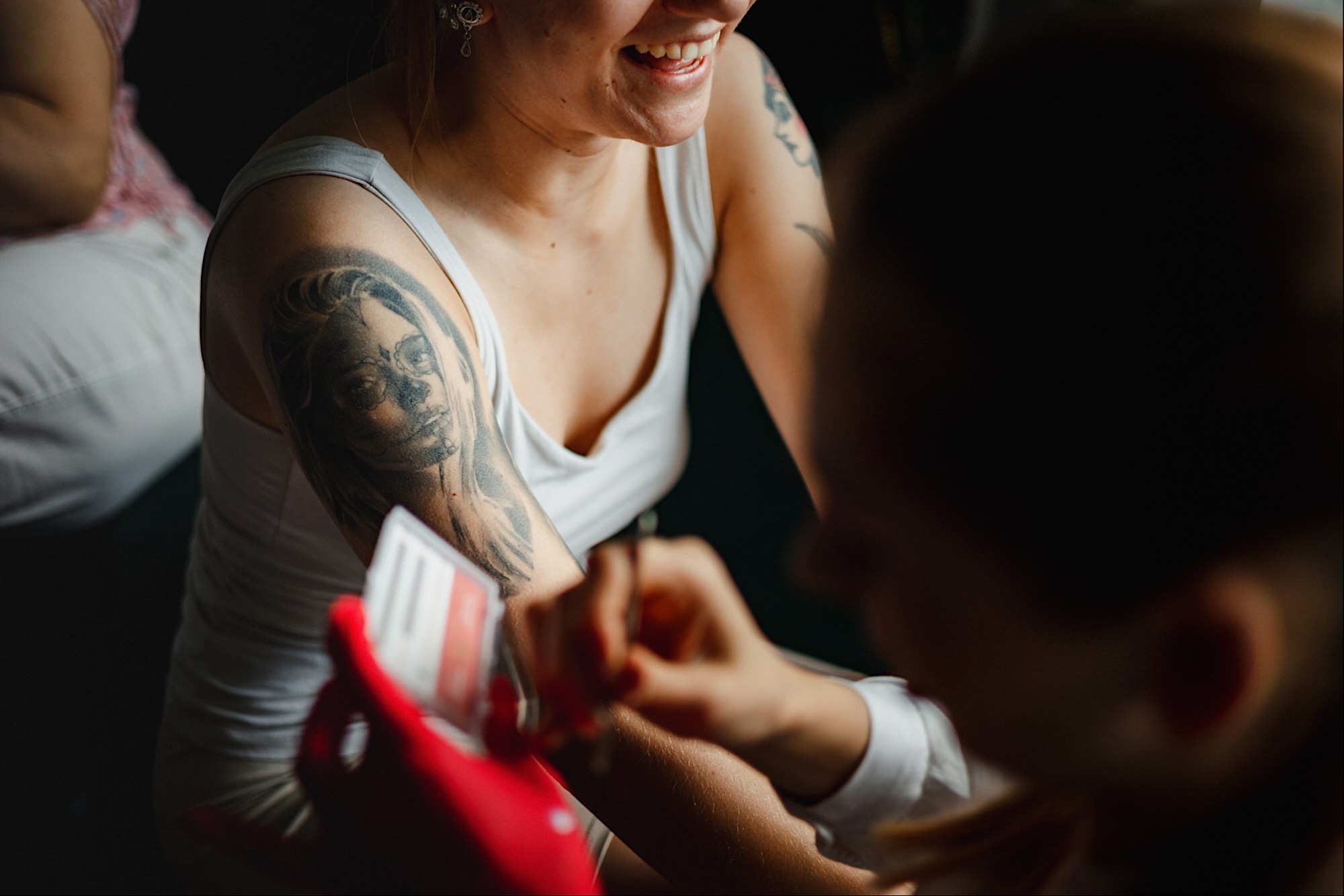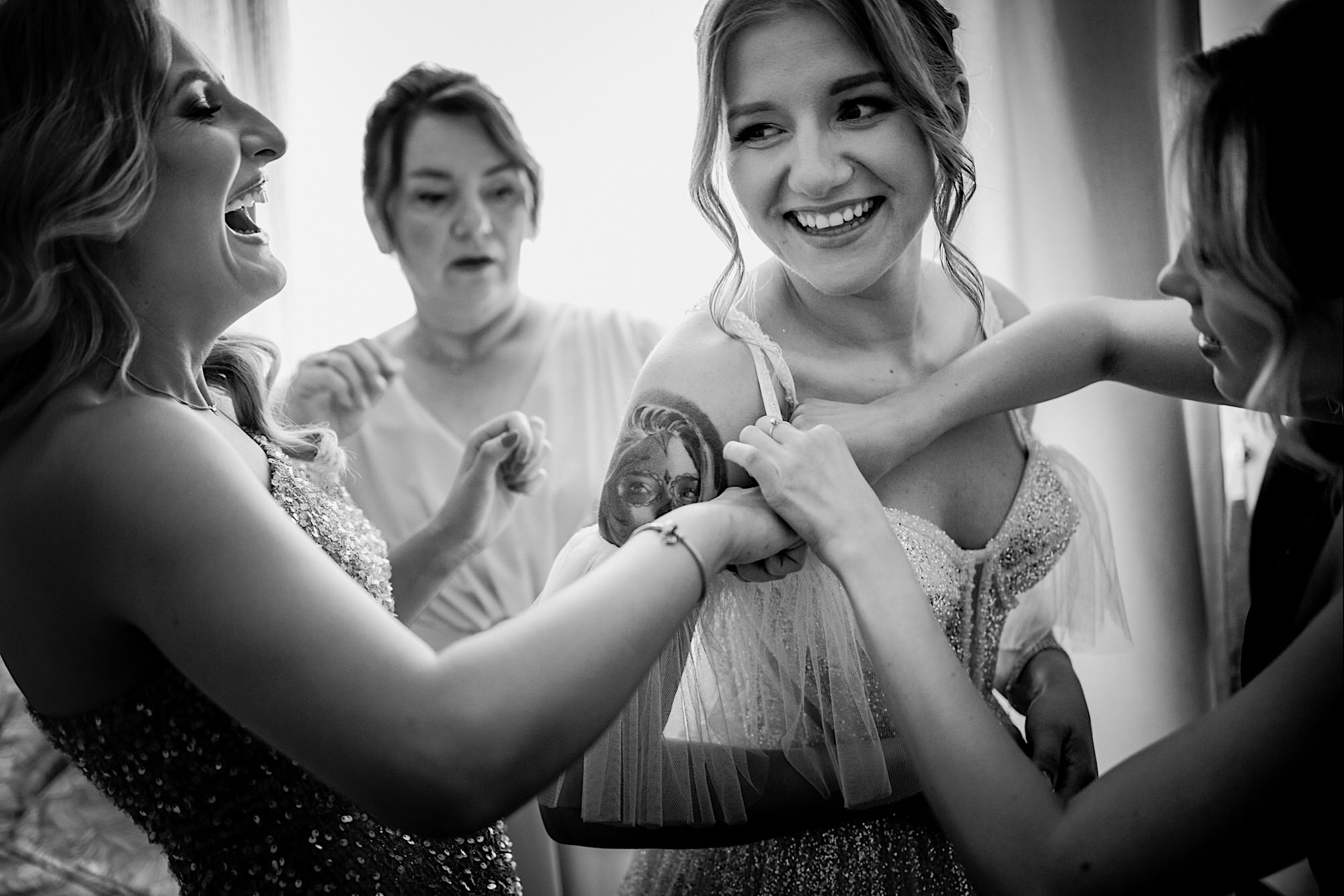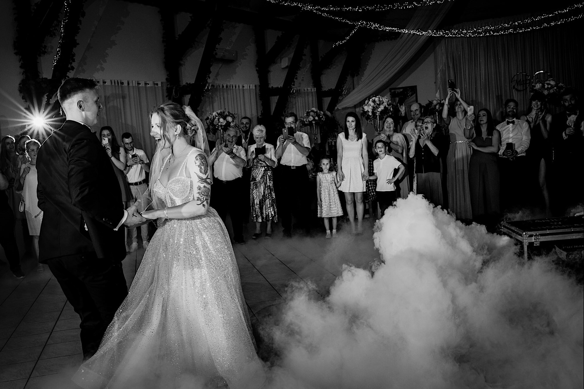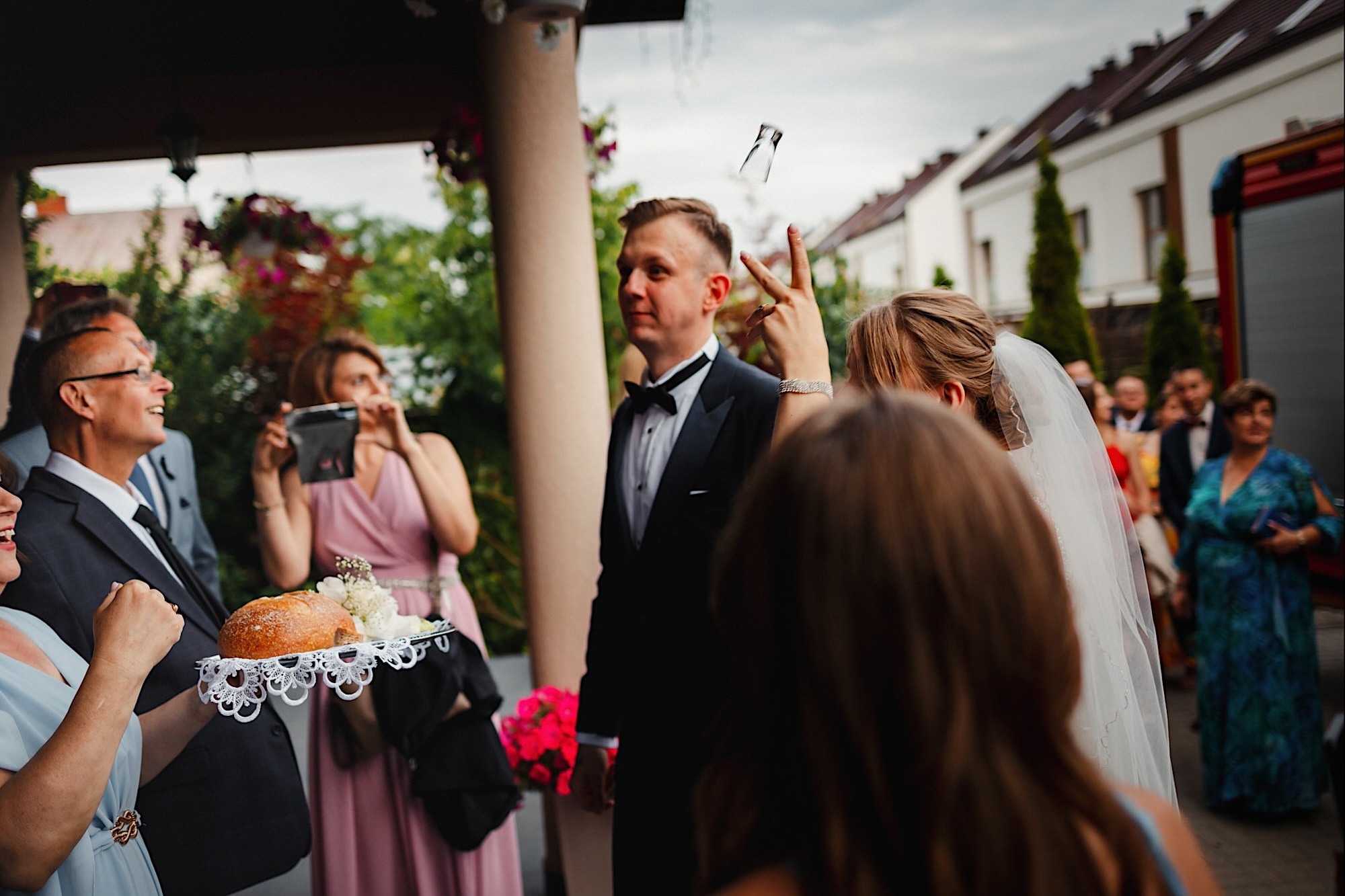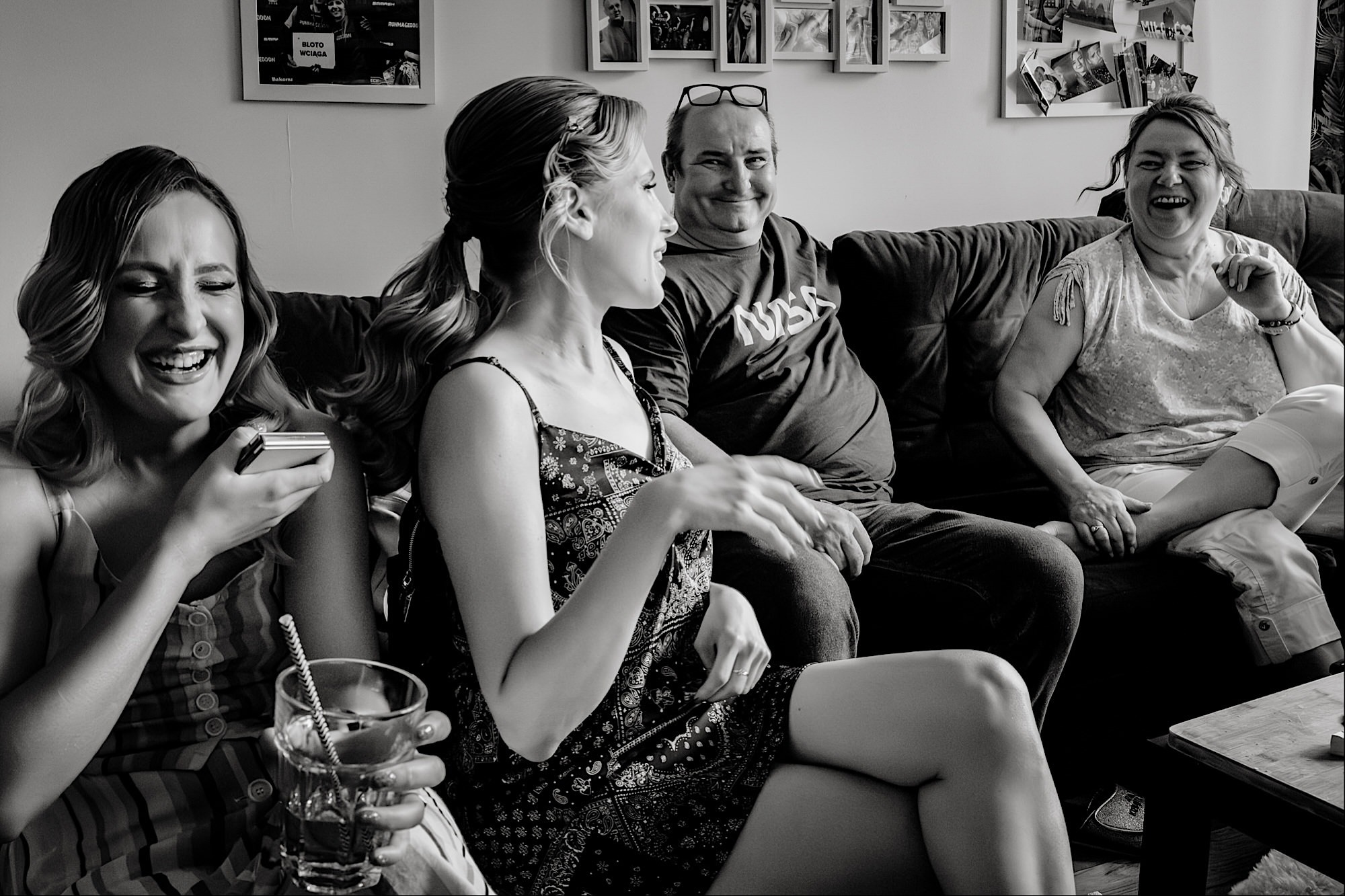 Pędziłem do nich do dalekiego (dla mnie) Pruszkowa. Pierwsze skojarzenie, wiadomo – gangsterka. Jak gangsterka to luz i zabawa. A to już całkiem blisko do naszych głównych bohaterów. Tak też było od samego początku. Sami najbliżsi, makijażystka, biegający i sikający pies (a to nie jedyne sikowaki tego dnia) czyli chaosik, który bardzo lubię 🙂 Mnóstwo śmiechu, niemniej tematów do rozmów – tatuaże, siatkówka, koszykówka, panieński… czyli wszystko co bywa bolesne, męczące ale dające finalnie sporo radościi 🙂 Był też niebieskowłosy Ninja. Kiedy ten chaos się trochę rozluźnił, zanim Maciek się ubrał mieliśmy też chwilę porozmawiać o poważniejszych tematach. To jeden z tych gości, których spotkało się kilka razy w życiu, a rozmawia się jak ze starym kumplem 🙂 Później szybka zmiana lokalizacji, równie szybkie wiązanie sukni i na sygnale do kościoła!