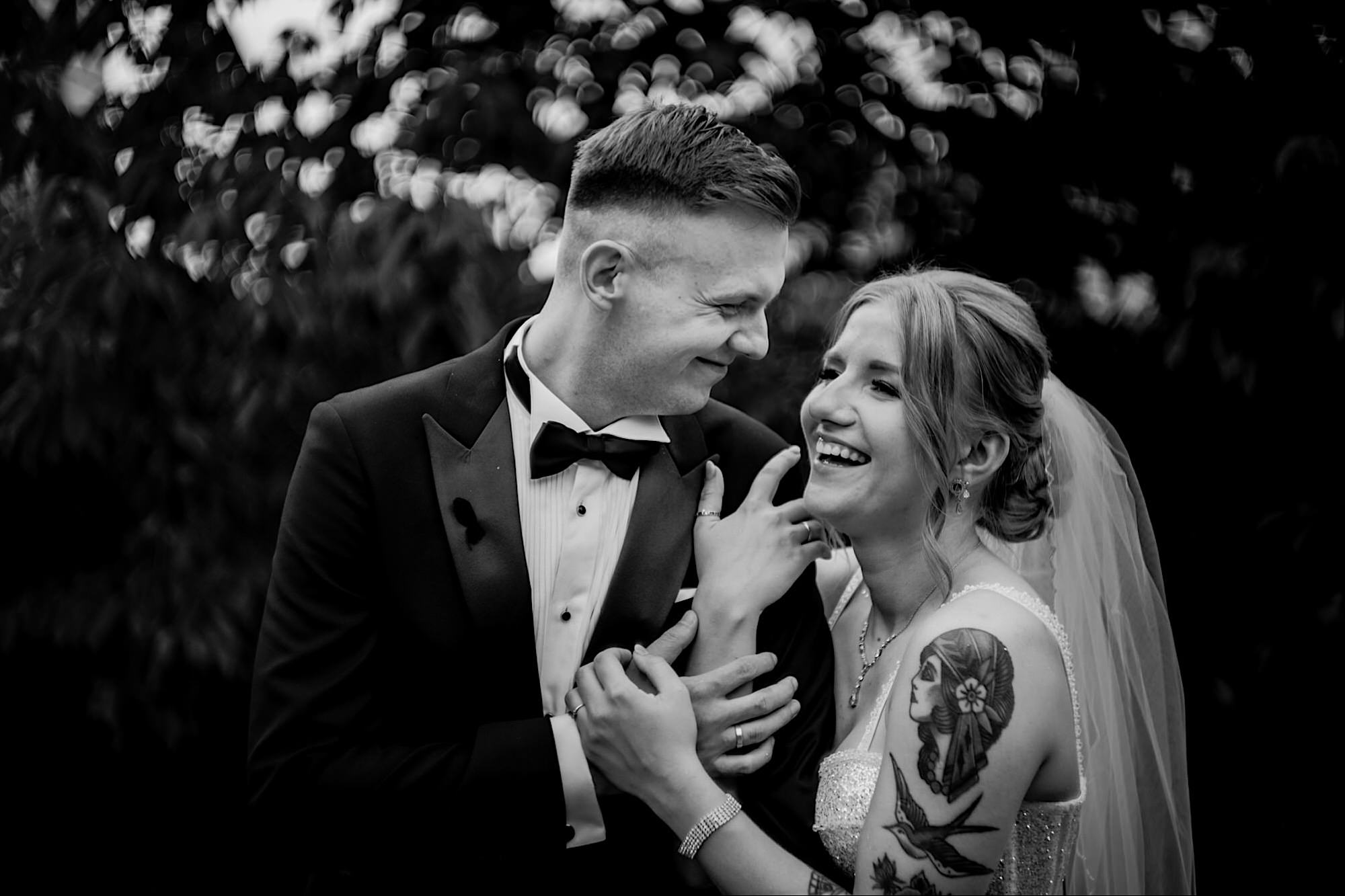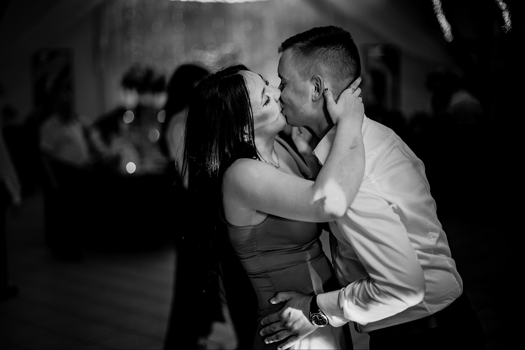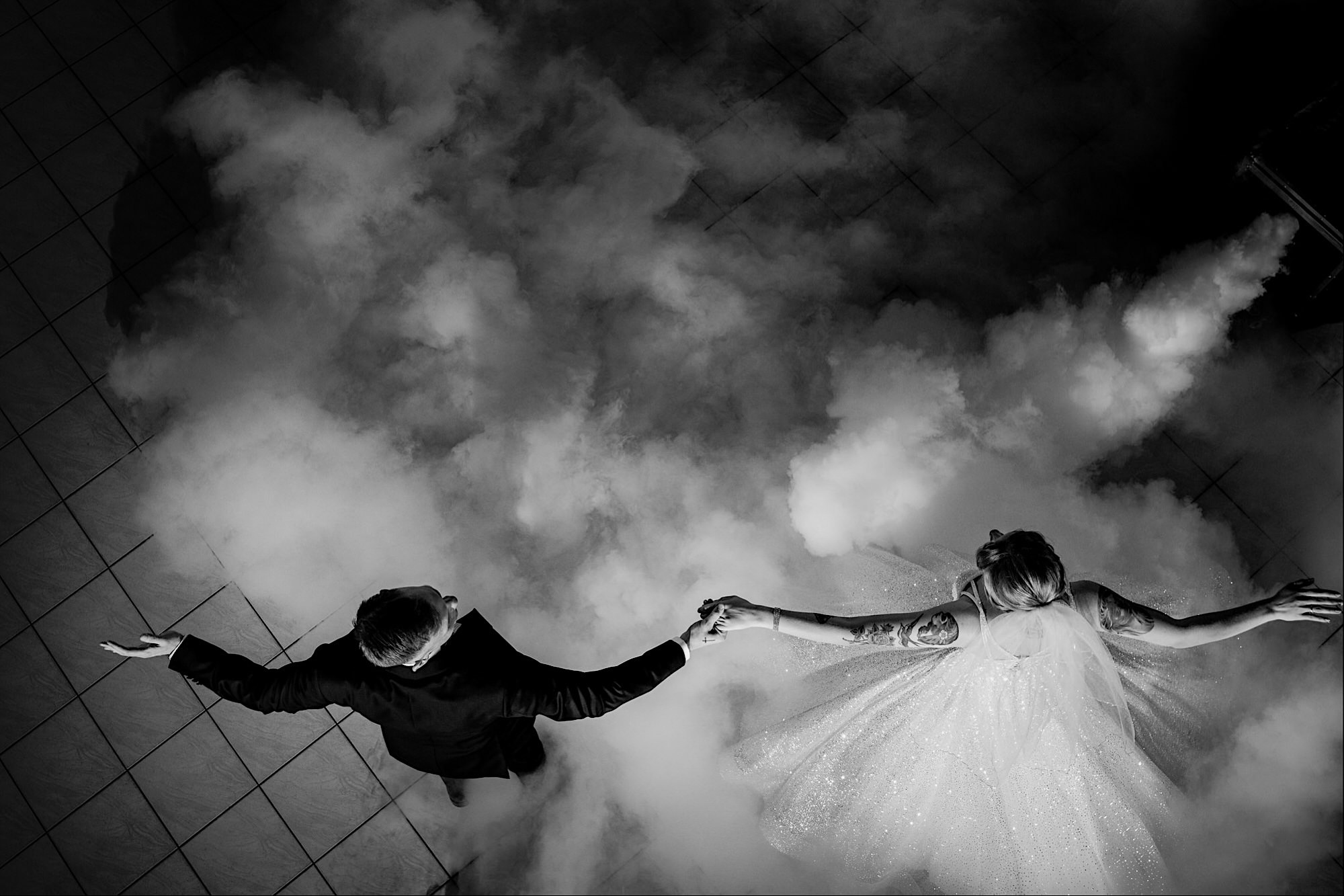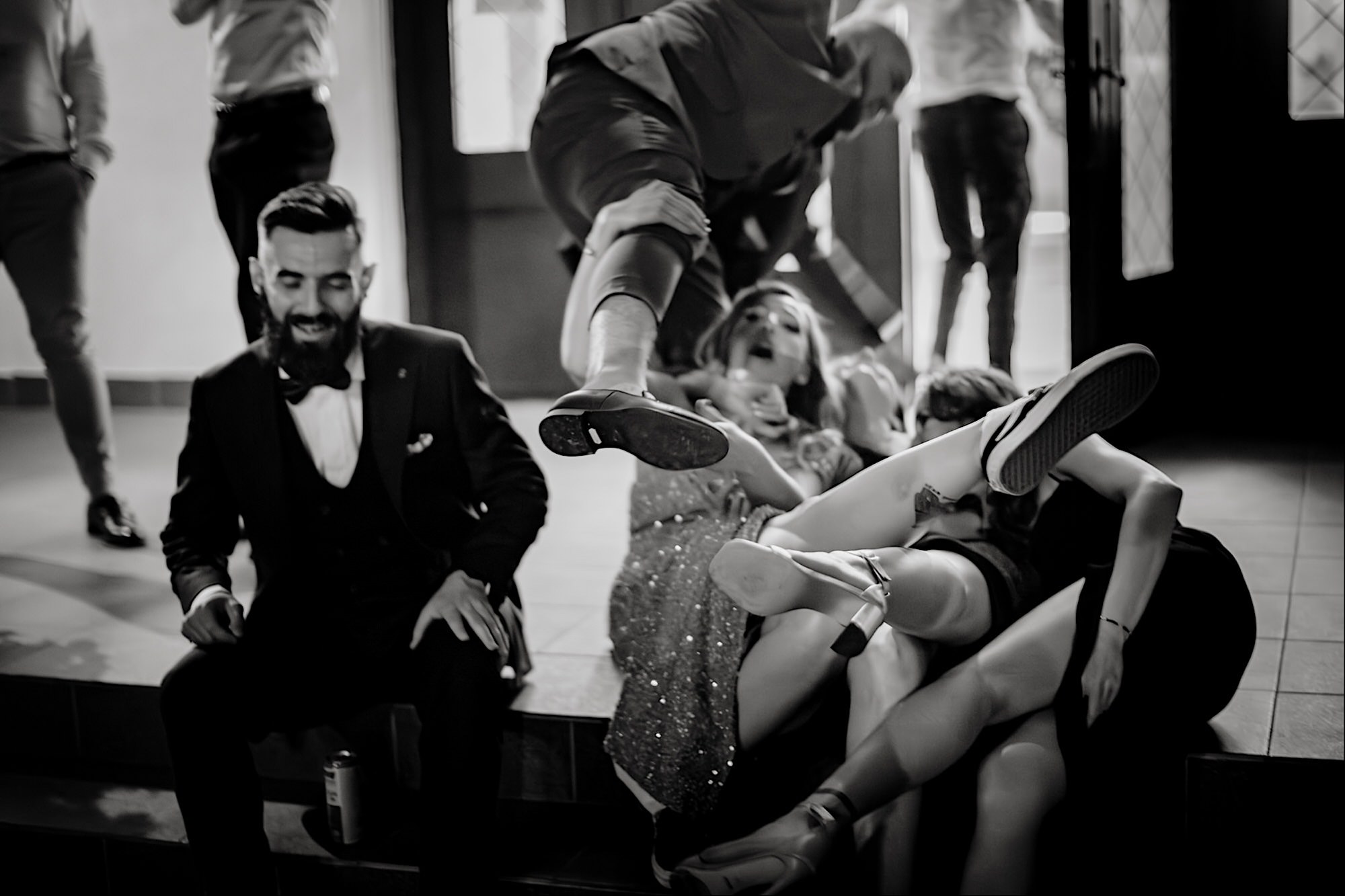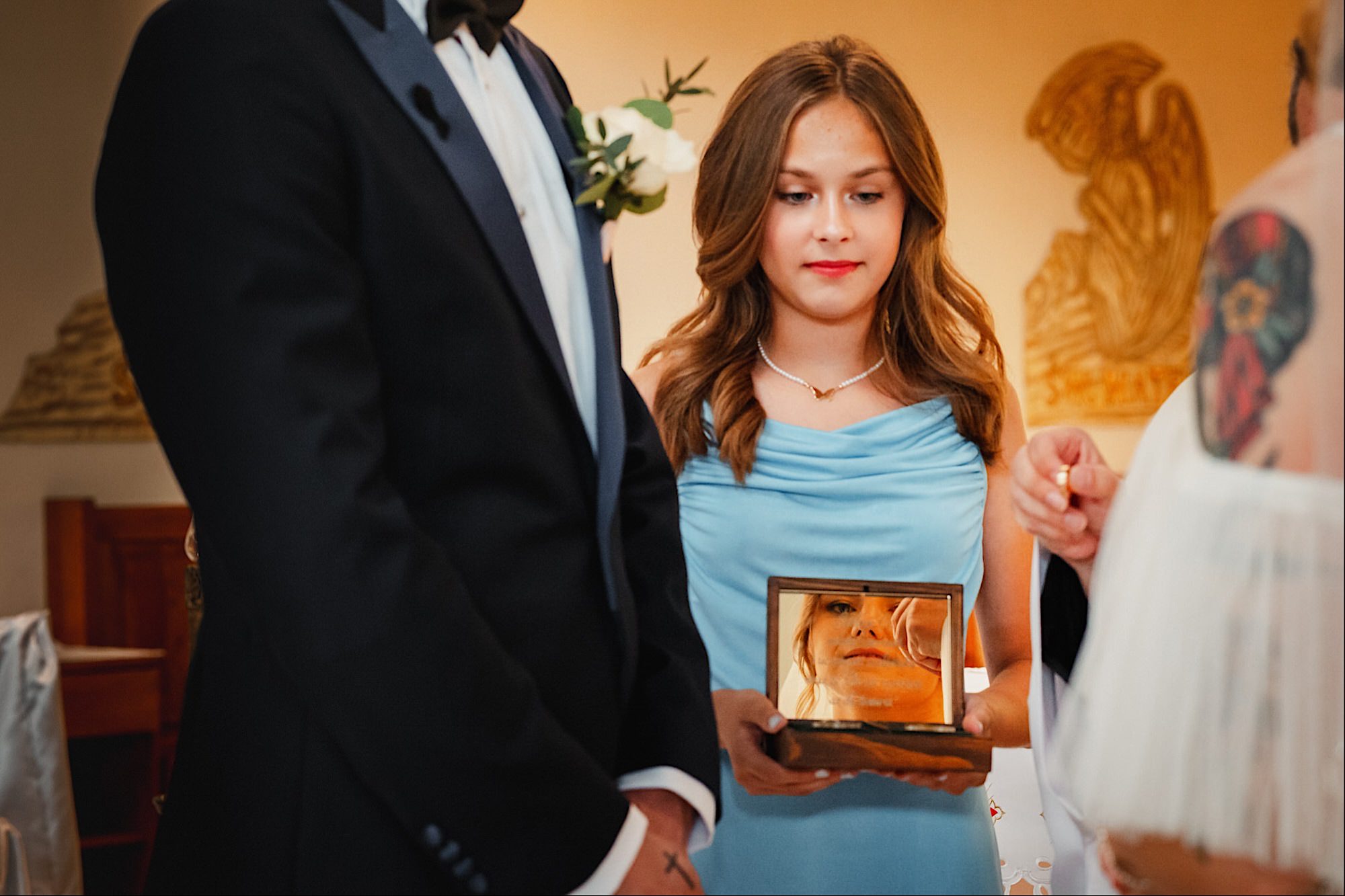 Pędziłem do nich do dalekiego (dla mnie) Pruszkowa. Pierwsze skojarzenie, wiadomo – gangsterka. Jak gangsterka to luz i zabawa. A to już całkiem blisko do naszych głównych bohaterów. Tak też było od samego początku. Sami najbliżsi, makijażystka, biegający i sikający pies (a to nie jedyne sikowaki tego dnia) czyli chaosik, który bardzo lubię 🙂 Mnóstwo śmiechu, niemniej tematów do rozmów – tatuaże, siatkówka, koszykówka, panieński… czyli wszystko co bywa bolesne, męczące ale dające finalnie sporo radościi 🙂 Był też niebieskowłosy Ninja. Kiedy ten chaos się trochę rozluźnił, zanim Maciek się ubrał mieliśmy też chwilę porozmawiać o poważniejszych tematach. To jeden z tych gości, których spotkało się kilka razy w życiu, a rozmawia się jak ze starym kumplem 🙂 Później szybka zmiana lokalizacji, równie szybkie wiązanie sukni i na sygnale do kościoła!