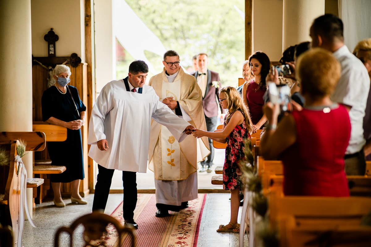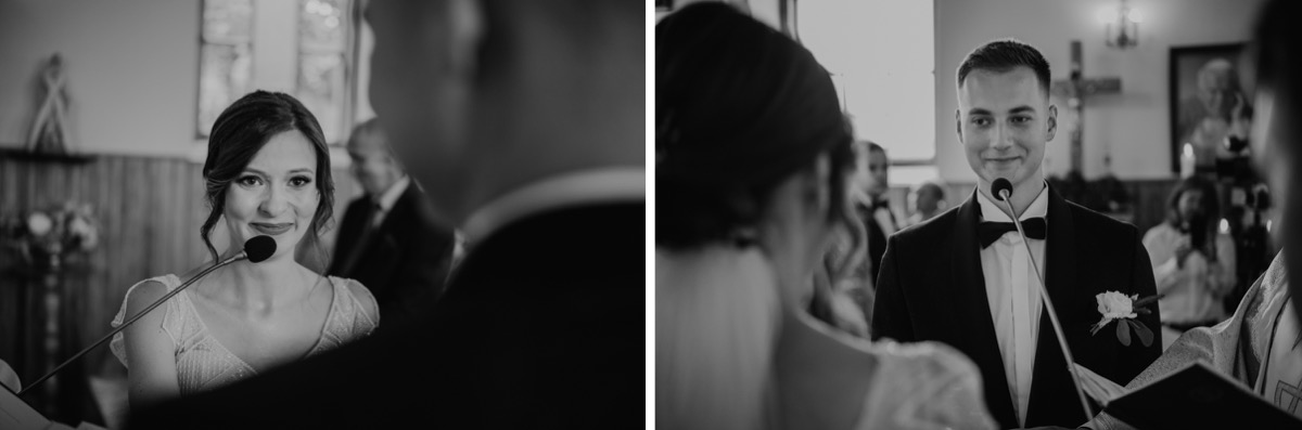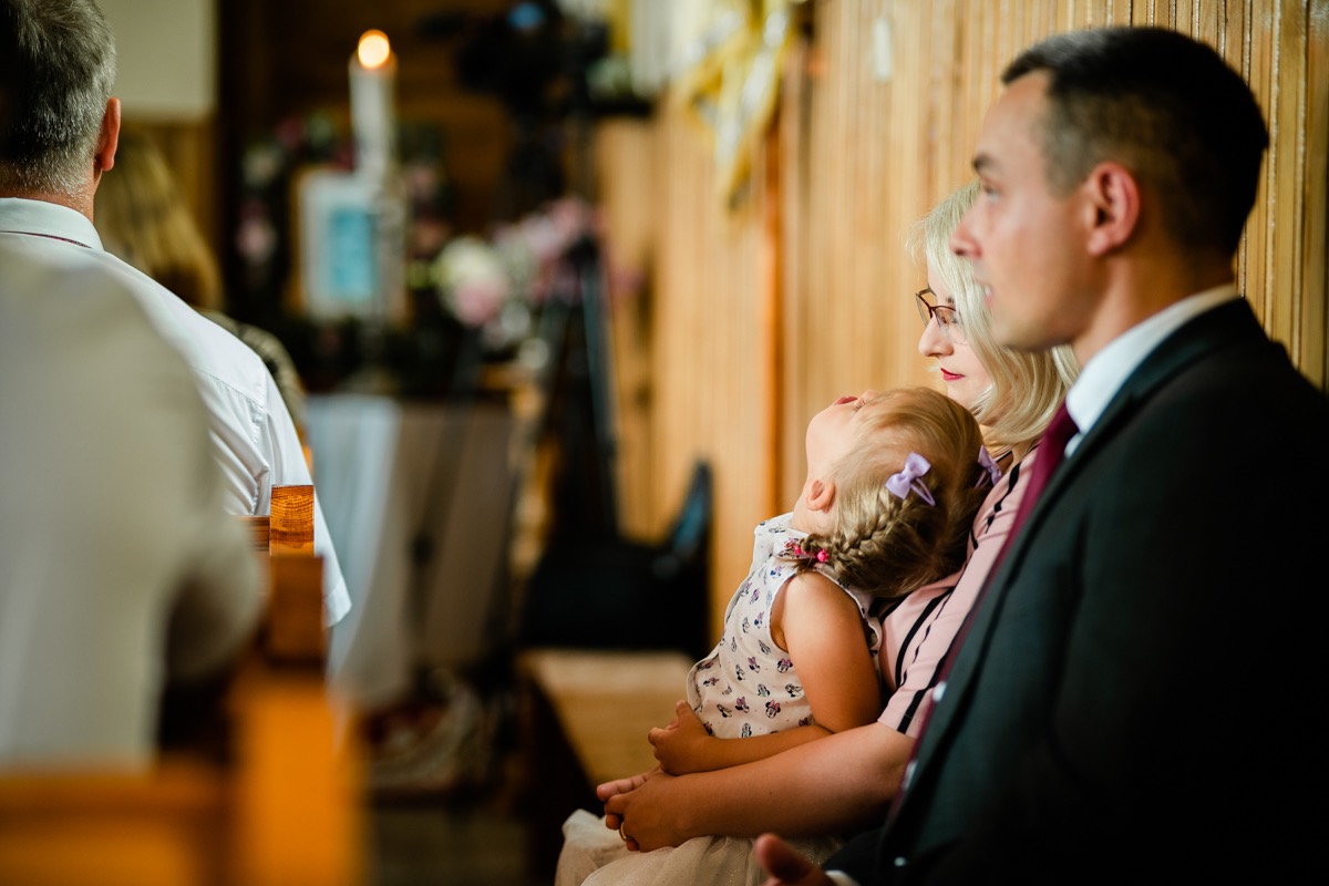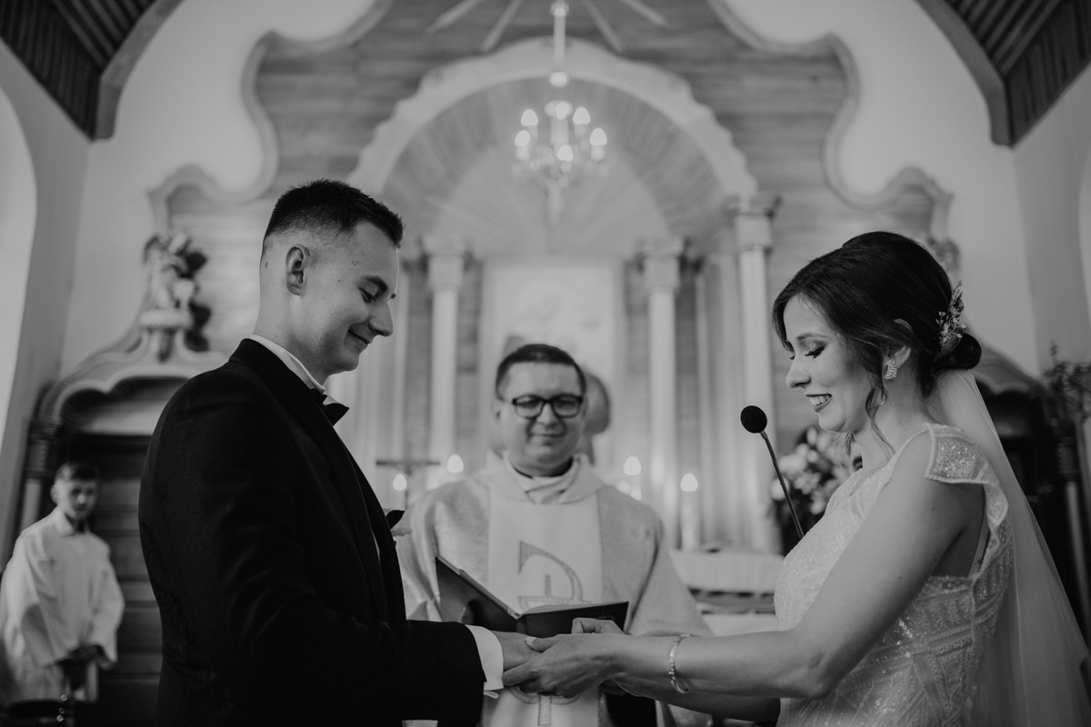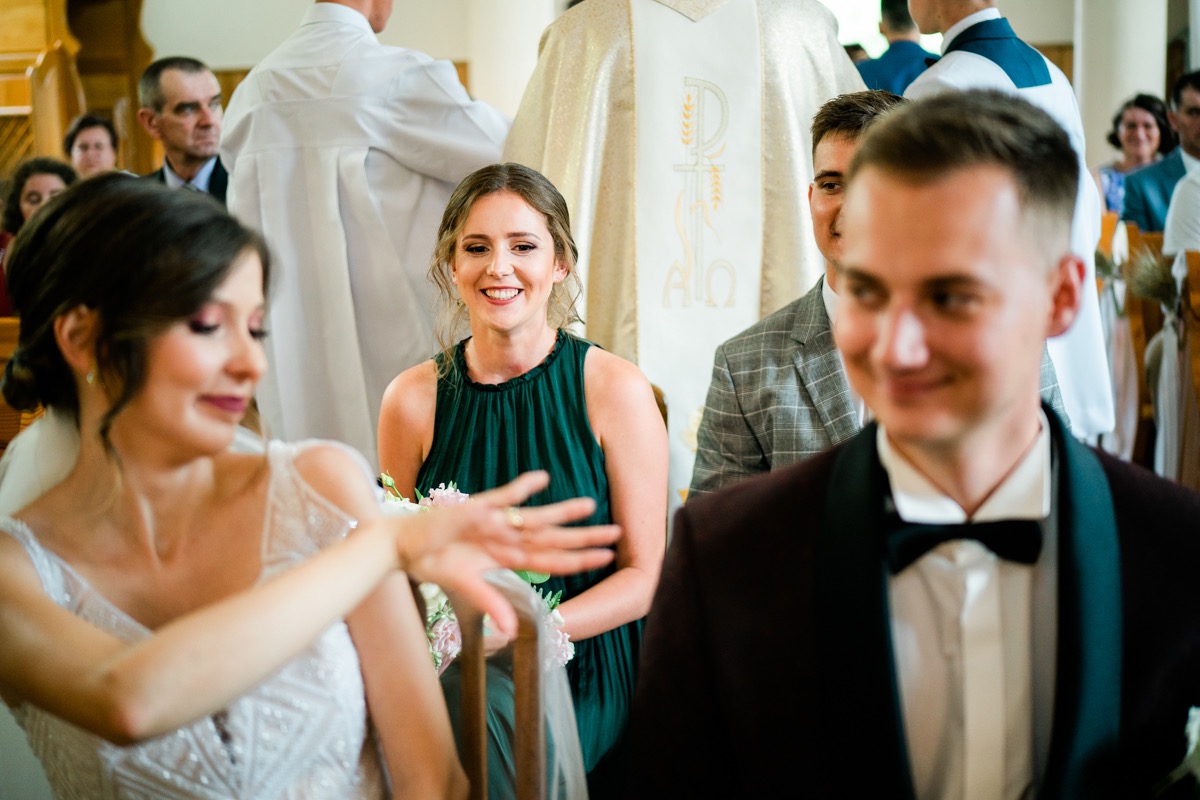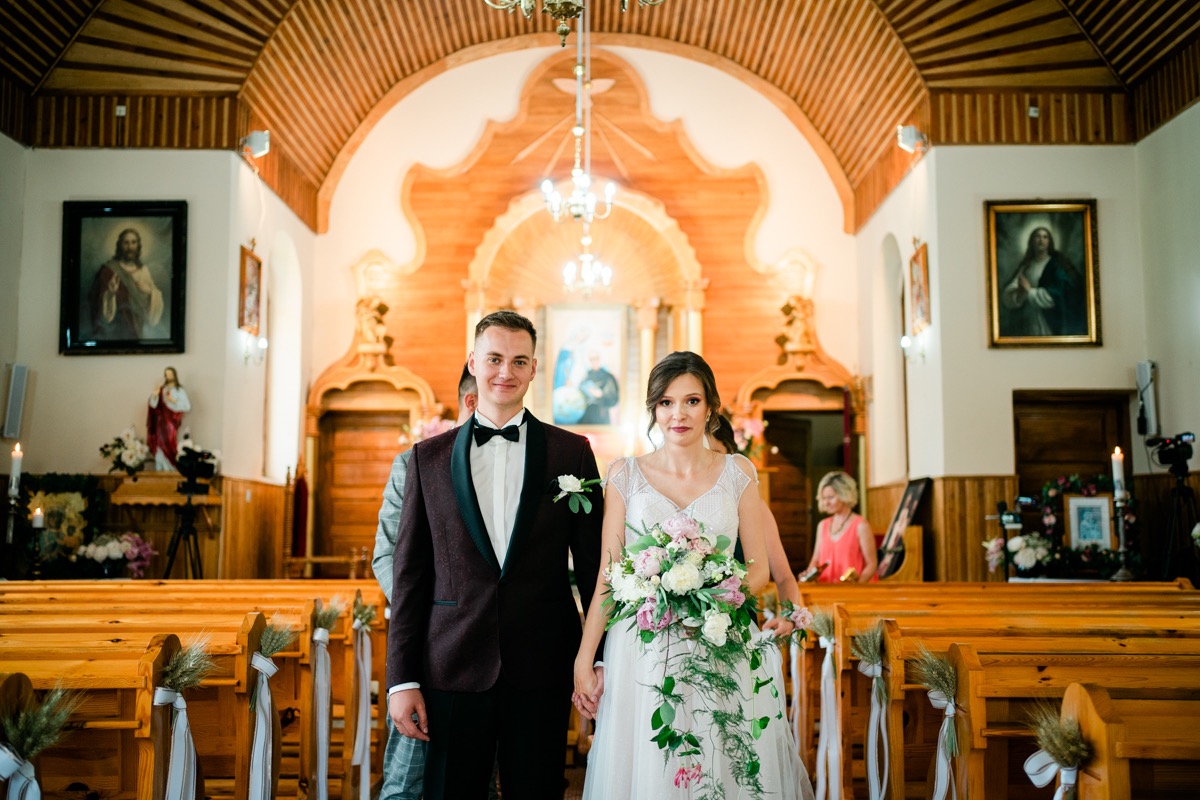Ceremonia zaślubin odbyła się w pobliskim urokliwym kościele. Ksiądz poprowadził mszę skrojoną pod naszą parę młodą. Było na luzie i z wszechobecnym uśmiechem. Moc spojrzeń, gestów i uczuć. Szybkie życzenia i na imprezę!