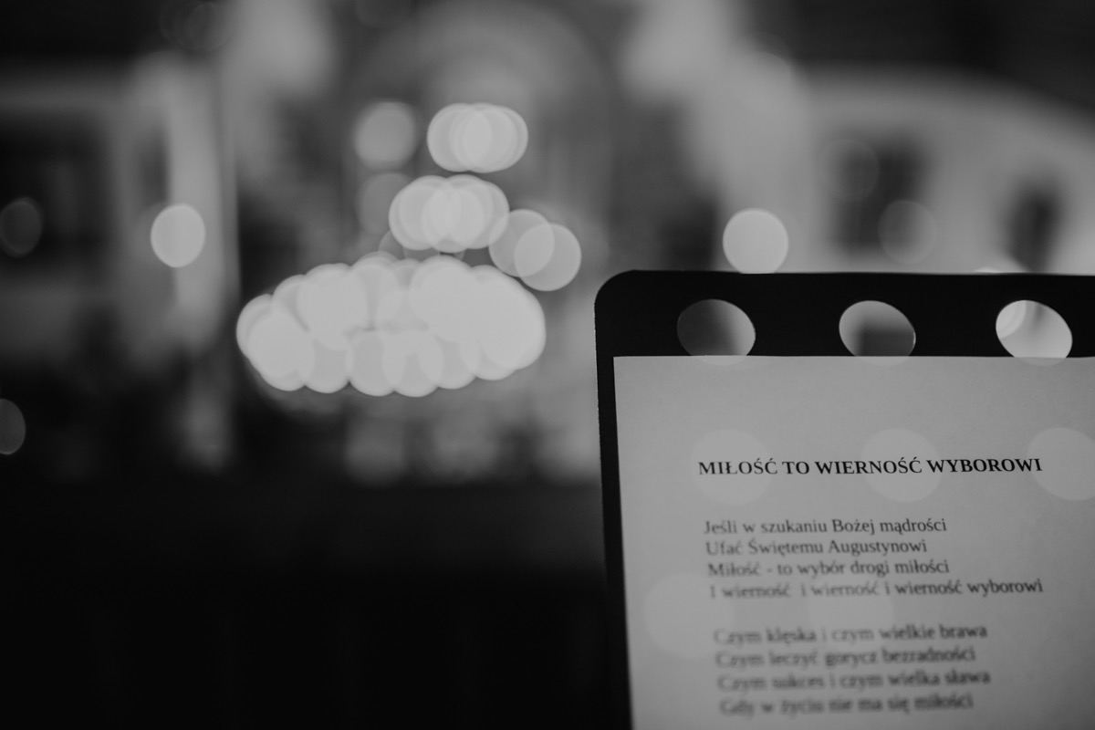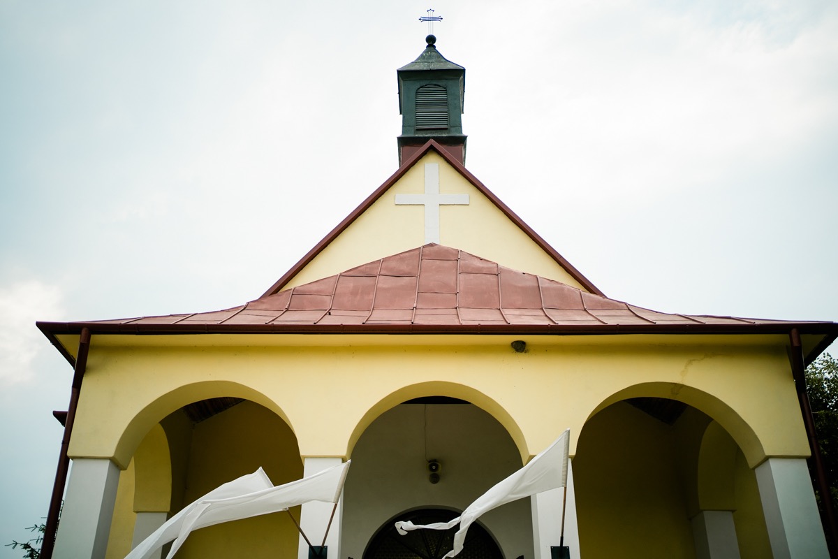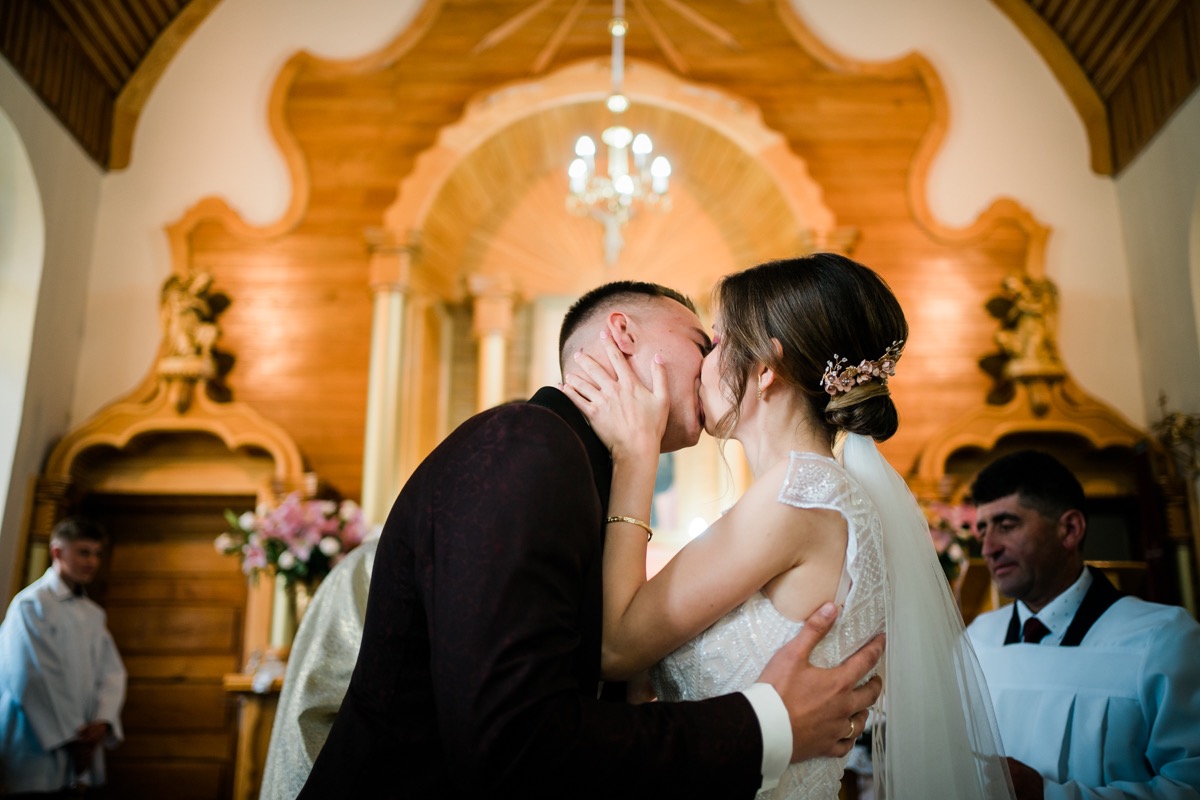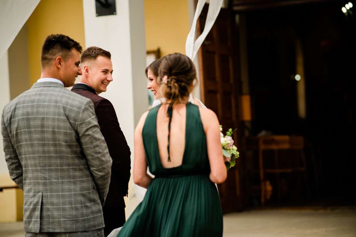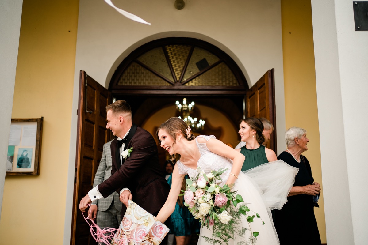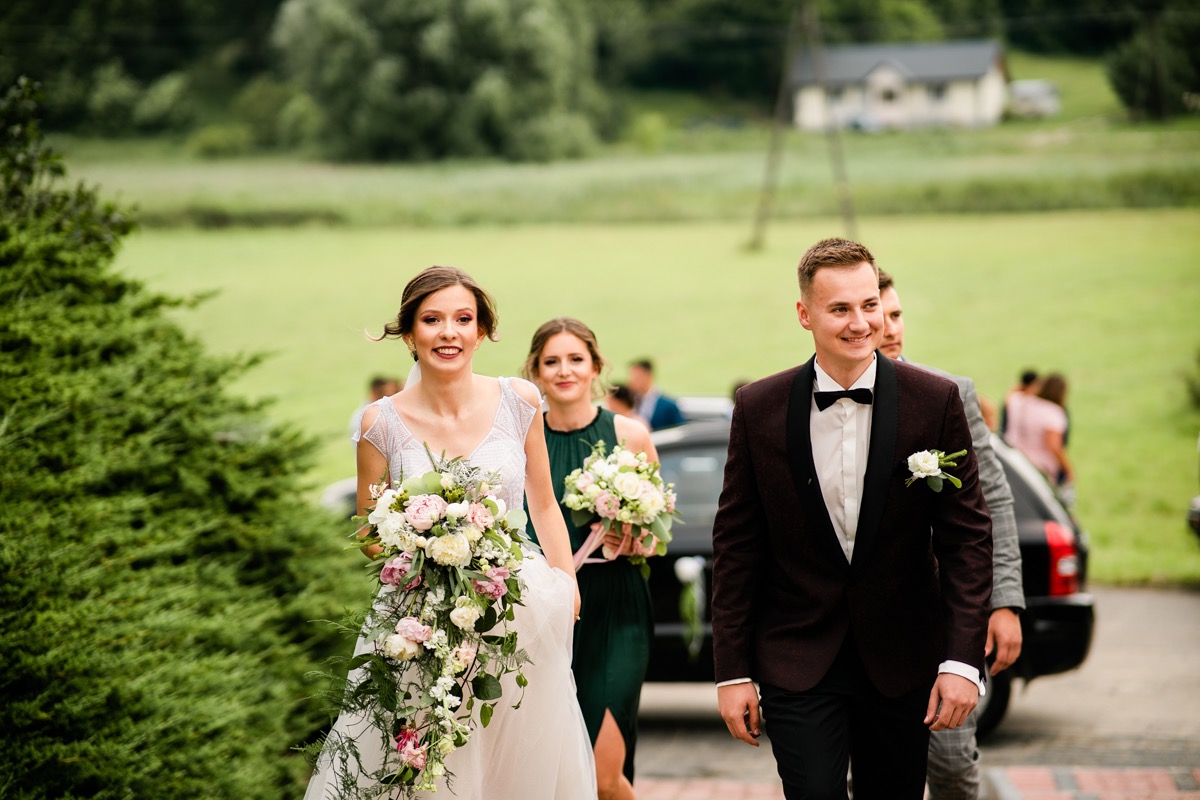 Ceremonia zaślubin odbyła się w pobliskim urokliwym kościele. Ksiądz poprowadził mszę skrojoną pod naszą parę młodą. Było na luzie i z wszechobecnym uśmiechem. Moc spojrzeń, gestów i uczuć. Szybkie życzenia i na imprezę!