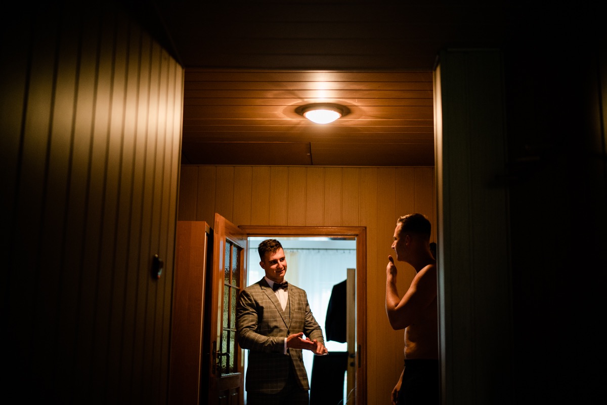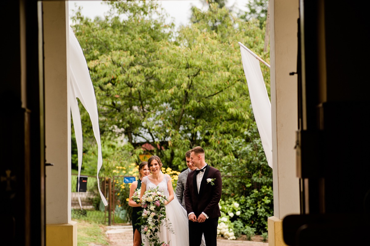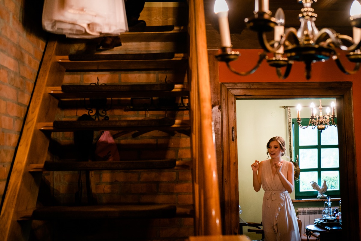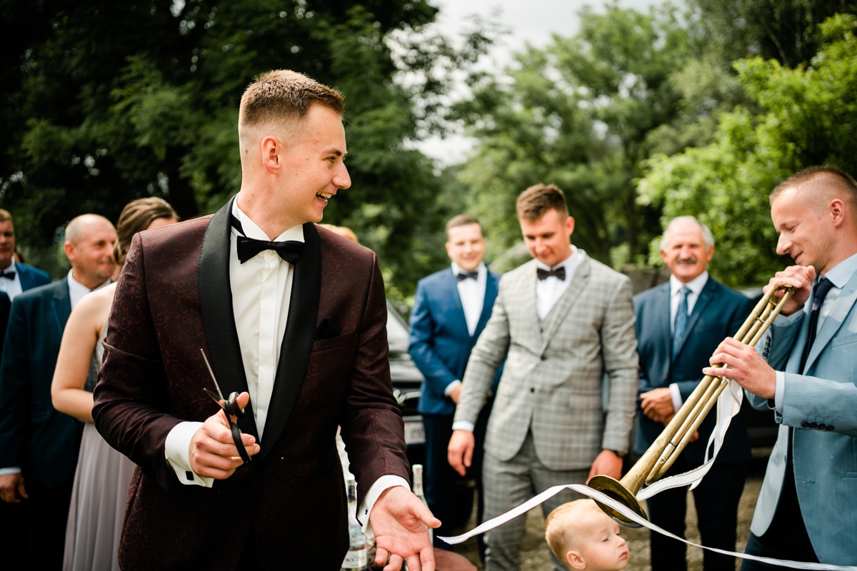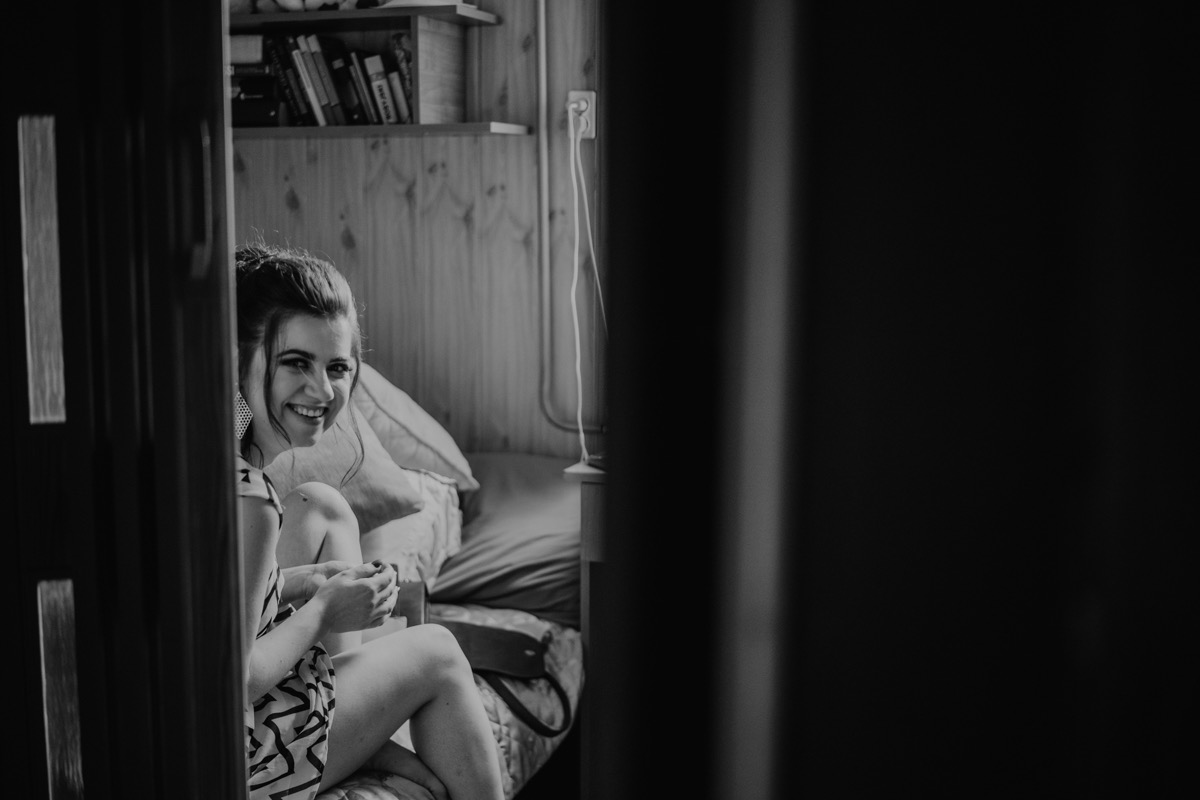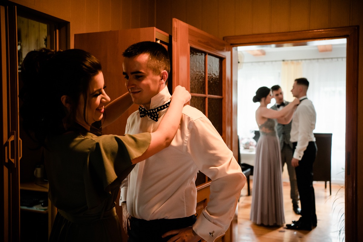 Przygotowania zaczęliśmy skoro świt, od mejkapu Ani w salonie urody – Kejt Maluje. Luźna, przyjazna atmosfera, pozwoliła nastroić się mega pozytywnie na resztę dnia i dać realną nadzieję na ciekawy reportaż. Kilka godzin odpoczynku i zawitałem u Szymona. Tam niemal cała rodzina, kilka pokoleń z uroczymi dziadkami na czele. Trochę śmiechów, ubierania, rozluźniaczy i Szymek gotowy! Do Ani udałem się ich mostkiem miłości. Mostek zarówno metaforyczny jak i dosłowny. Stworzonym przez nich samych, symbolizujący ich uczucie i łączący dwa podwórka. A jak wyglądały przygotowania u Ani? Tak jak jej dom – niezwykle klimatycznie, ciepło i rodzinnie:) Na miejscu okazało się, że świat jest mały. Mama Ani uczyła mnie języka niemieckiego w szkole, a na ścianie wśród wielu rodzinnych zdjęć wisiało to Ani i Szymona mojego autorstwa. Byłem fotografem na ich studniówce. Wiedziałem, że skądś znam te mordki 🙂 Trochę deszczu, kilka szybkich kanapeczek, ubieranie, dwa portrety i… przybył ten jeden jedyny. W asyście całej rodziny z pannami pod pachami 🙂 Zatrąbił – nie klaksonem, a prawdziwą trąbą! Przeciął wstęgę i ruszył do ukochanej. Następnie miał miejsce najbardziej wzruszający first look jaki miałem okazje zobaczyć. Łezka zakręciła się nie tylko narzeczonym ale chyba wszystkim obecnym. Jak dobrze, że mogłem schować się za aparatem i dalej udawać niewzruszonego twardziela 🙂