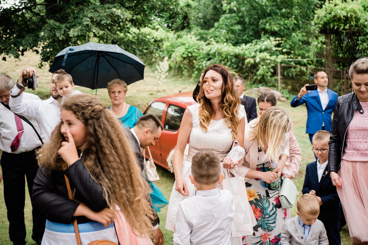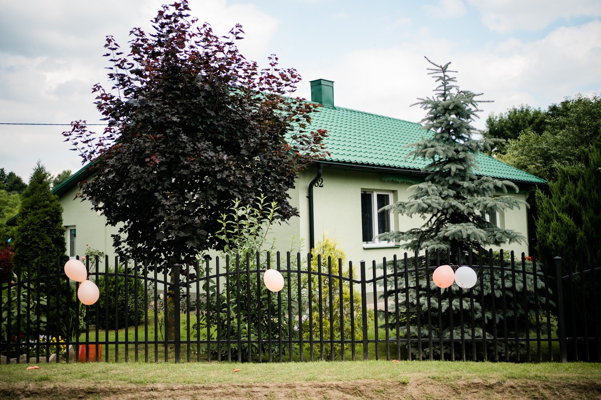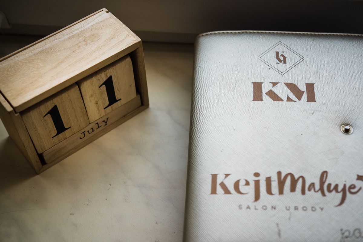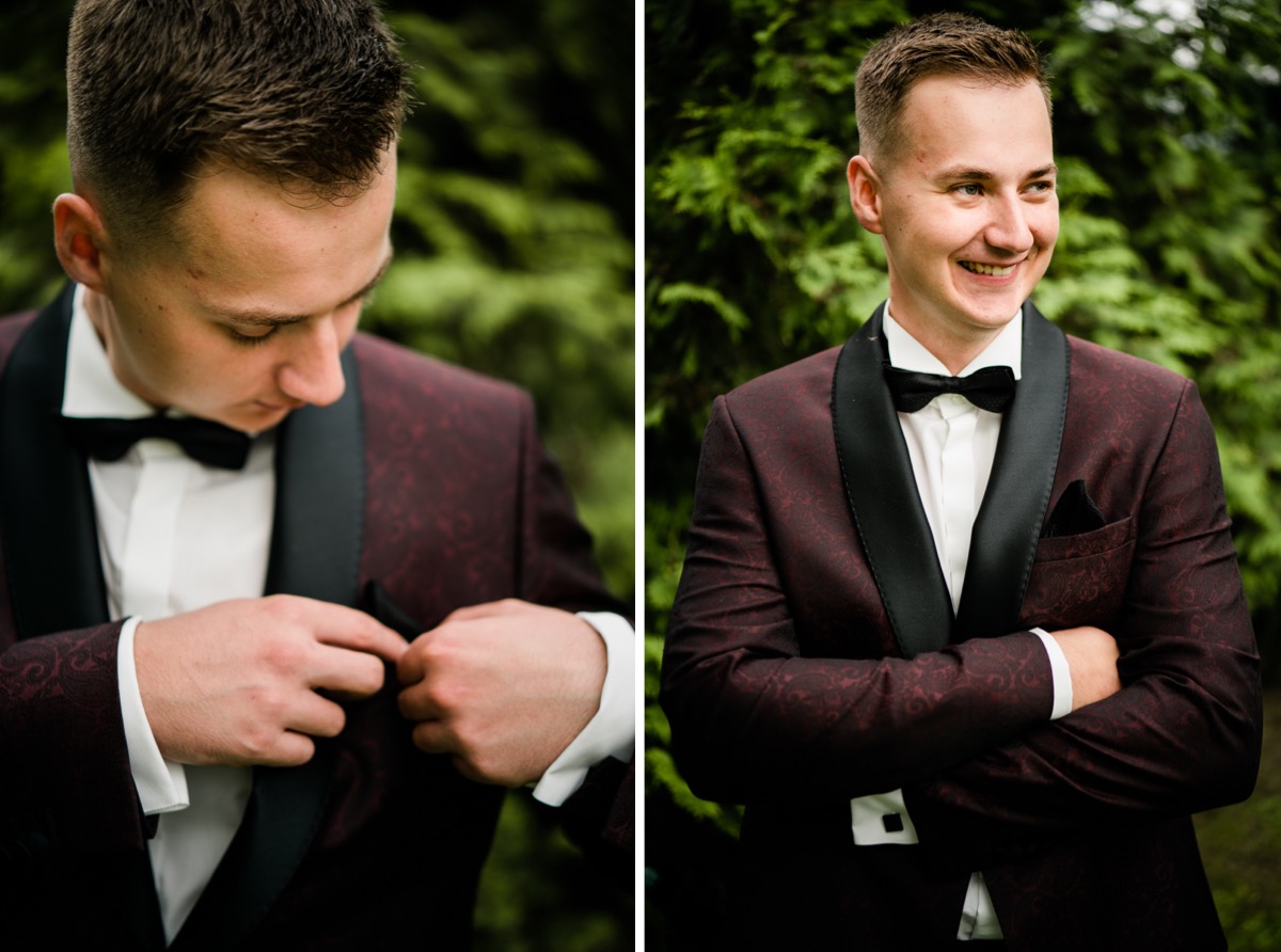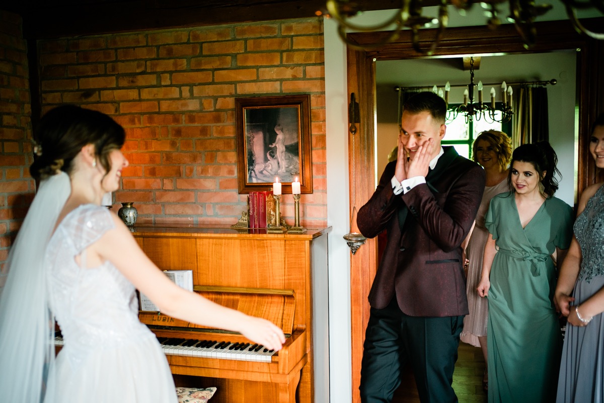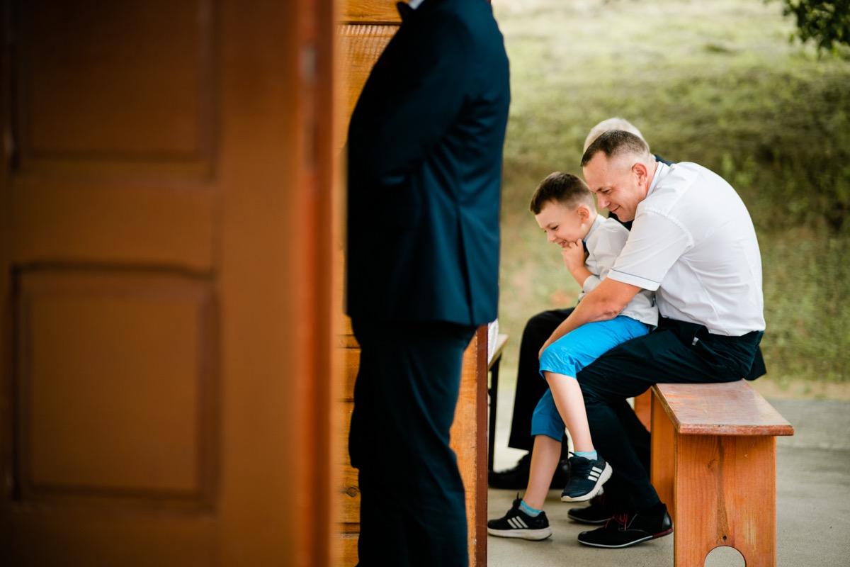 Przygotowania zaczęliśmy skoro świt, od mejkapu Ani w salonie urody – Kejt Maluje. Luźna, przyjazna atmosfera, pozwoliła nastroić się mega pozytywnie na resztę dnia i dać realną nadzieję na ciekawy reportaż. Kilka godzin odpoczynku i zawitałem u Szymona. Tam niemal cała rodzina, kilka pokoleń z uroczymi dziadkami na czele. Trochę śmiechów, ubierania, rozluźniaczy i Szymek gotowy! Do Ani udałem się ich mostkiem miłości. Mostek zarówno metaforyczny jak i dosłowny. Stworzonym przez nich samych, symbolizujący ich uczucie i łączący dwa podwórka. A jak wyglądały przygotowania u Ani? Tak jak jej dom – niezwykle klimatycznie, ciepło i rodzinnie:) Na miejscu okazało się, że świat jest mały. Mama Ani uczyła mnie języka niemieckiego w szkole, a na ścianie wśród wielu rodzinnych zdjęć wisiało to Ani i Szymona mojego autorstwa. Byłem fotografem na ich studniówce. Wiedziałem, że skądś znam te mordki 🙂 Trochę deszczu, kilka szybkich kanapeczek, ubieranie, dwa portrety i… przybył ten jeden jedyny. W asyście całej rodziny z pannami pod pachami 🙂 Zatrąbił – nie klaksonem, a prawdziwą trąbą! Przeciął wstęgę i ruszył do ukochanej. Następnie miał miejsce najbardziej wzruszający first look jaki miałem okazje zobaczyć. Łezka zakręciła się nie tylko narzeczonym ale chyba wszystkim obecnym. Jak dobrze, że mogłem schować się za aparatem i dalej udawać niewzruszonego twardziela 🙂