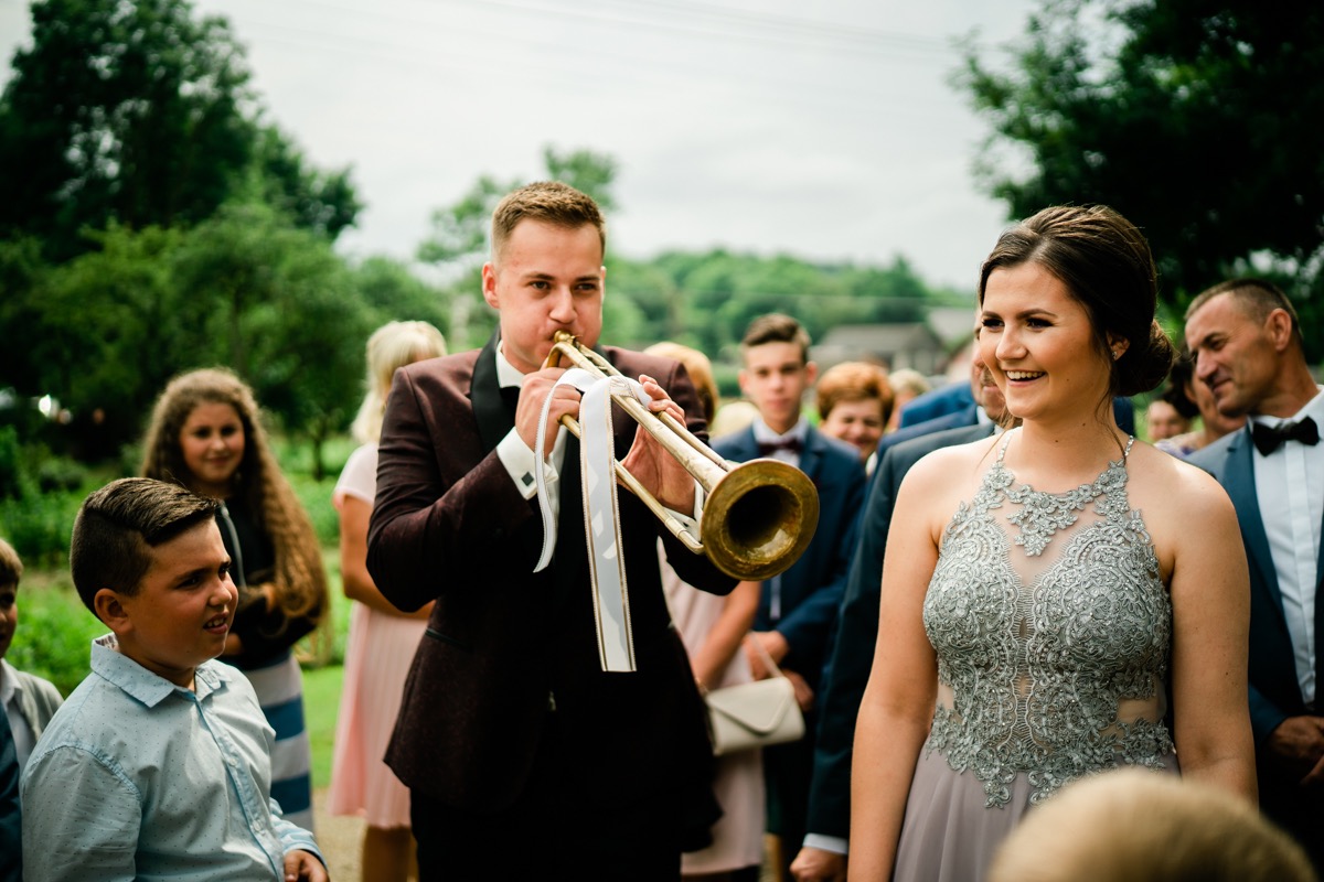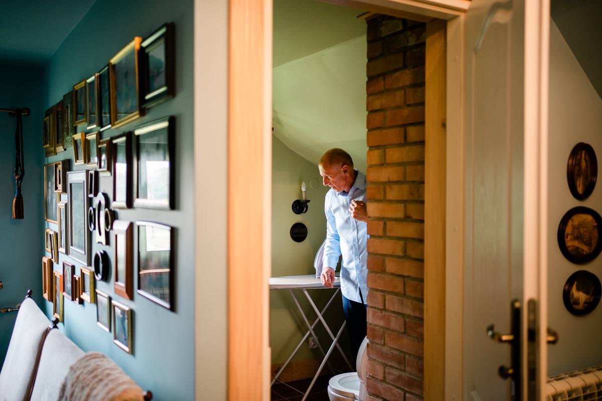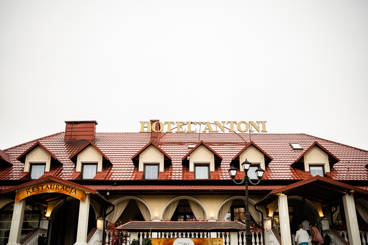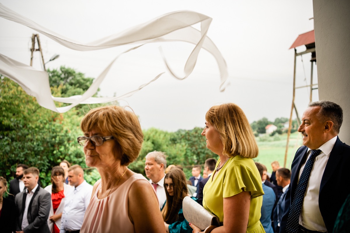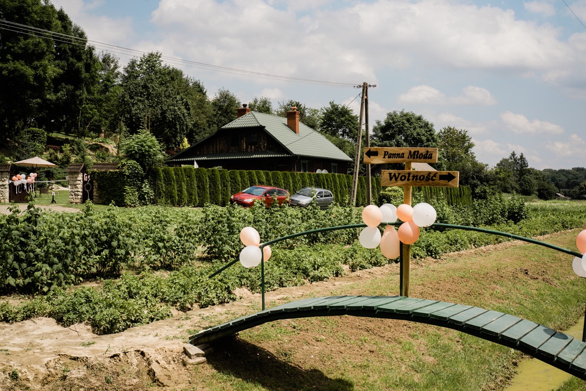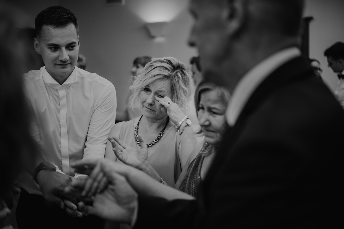 Przygotowania zaczęliśmy skoro świt, od mejkapu Ani w salonie urody – Kejt Maluje. Luźna, przyjazna atmosfera, pozwoliła nastroić się mega pozytywnie na resztę dnia i dać realną nadzieję na ciekawy reportaż. Kilka godzin odpoczynku i zawitałem u Szymona. Tam niemal cała rodzina, kilka pokoleń z uroczymi dziadkami na czele. Trochę śmiechów, ubierania, rozluźniaczy i Szymek gotowy! Do Ani udałem się ich mostkiem miłości. Mostek zarówno metaforyczny jak i dosłowny. Stworzonym przez nich samych, symbolizujący ich uczucie i łączący dwa podwórka. A jak wyglądały przygotowania u Ani? Tak jak jej dom – niezwykle klimatycznie, ciepło i rodzinnie:) Na miejscu okazało się, że świat jest mały. Mama Ani uczyła mnie języka niemieckiego w szkole, a na ścianie wśród wielu rodzinnych zdjęć wisiało to Ani i Szymona mojego autorstwa. Byłem fotografem na ich studniówce. Wiedziałem, że skądś znam te mordki 🙂 Trochę deszczu, kilka szybkich kanapeczek, ubieranie, dwa portrety i… przybył ten jeden jedyny. W asyście całej rodziny z pannami pod pachami 🙂 Zatrąbił – nie klaksonem, a prawdziwą trąbą! Przeciął wstęgę i ruszył do ukochanej. Następnie miał miejsce najbardziej wzruszający first look jaki miałem okazje zobaczyć. Łezka zakręciła się nie tylko narzeczonym ale chyba wszystkim obecnym. Jak dobrze, że mogłem schować się za aparatem i dalej udawać niewzruszonego twardziela 🙂