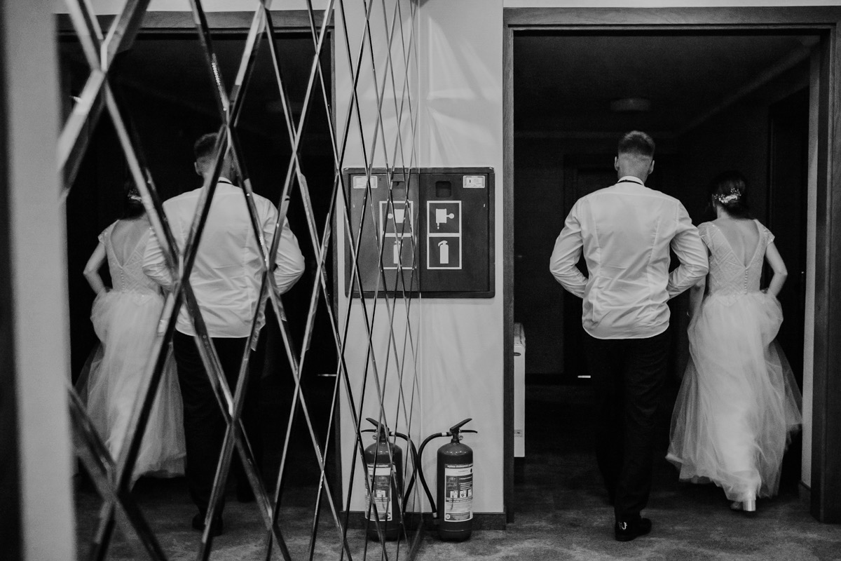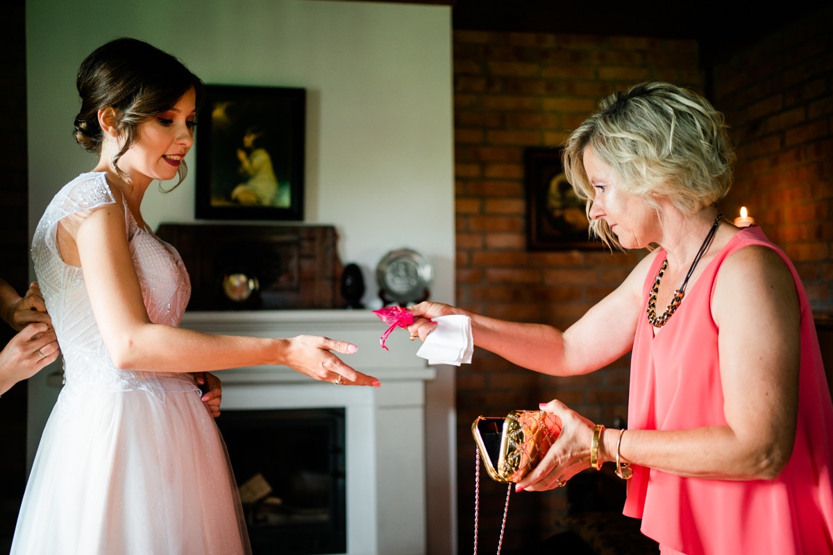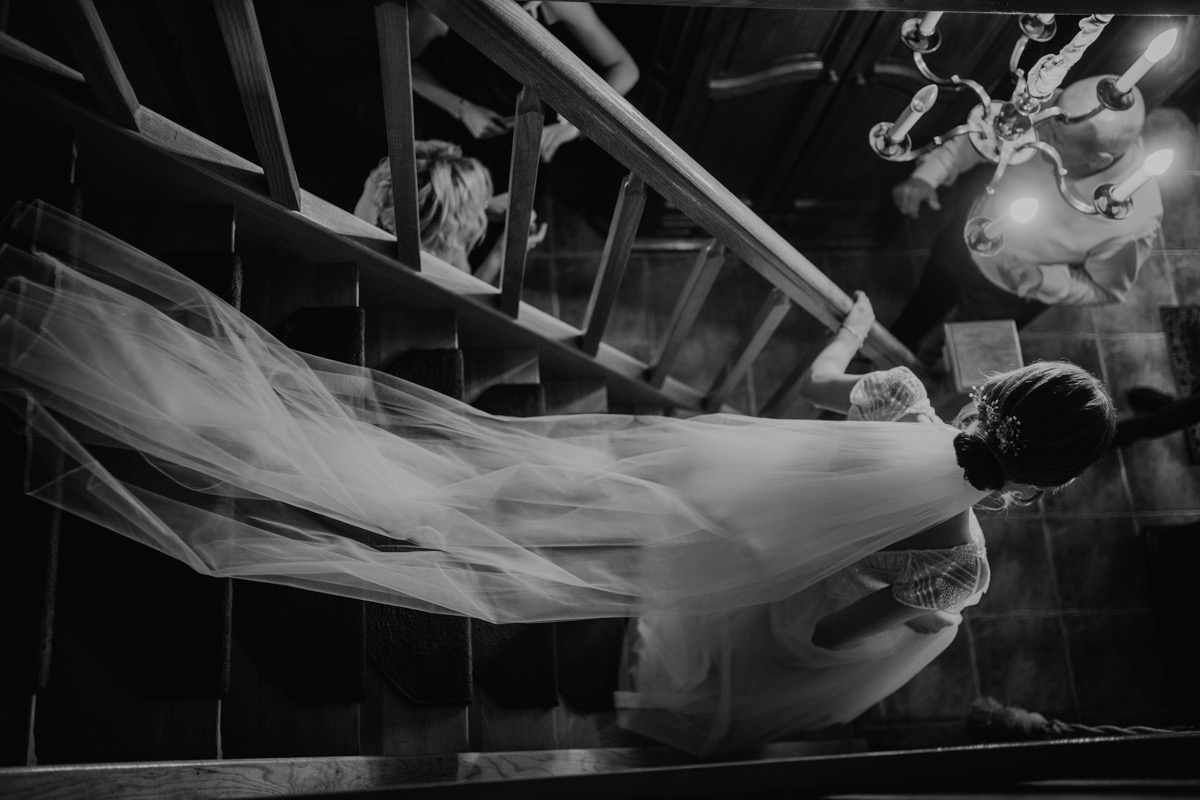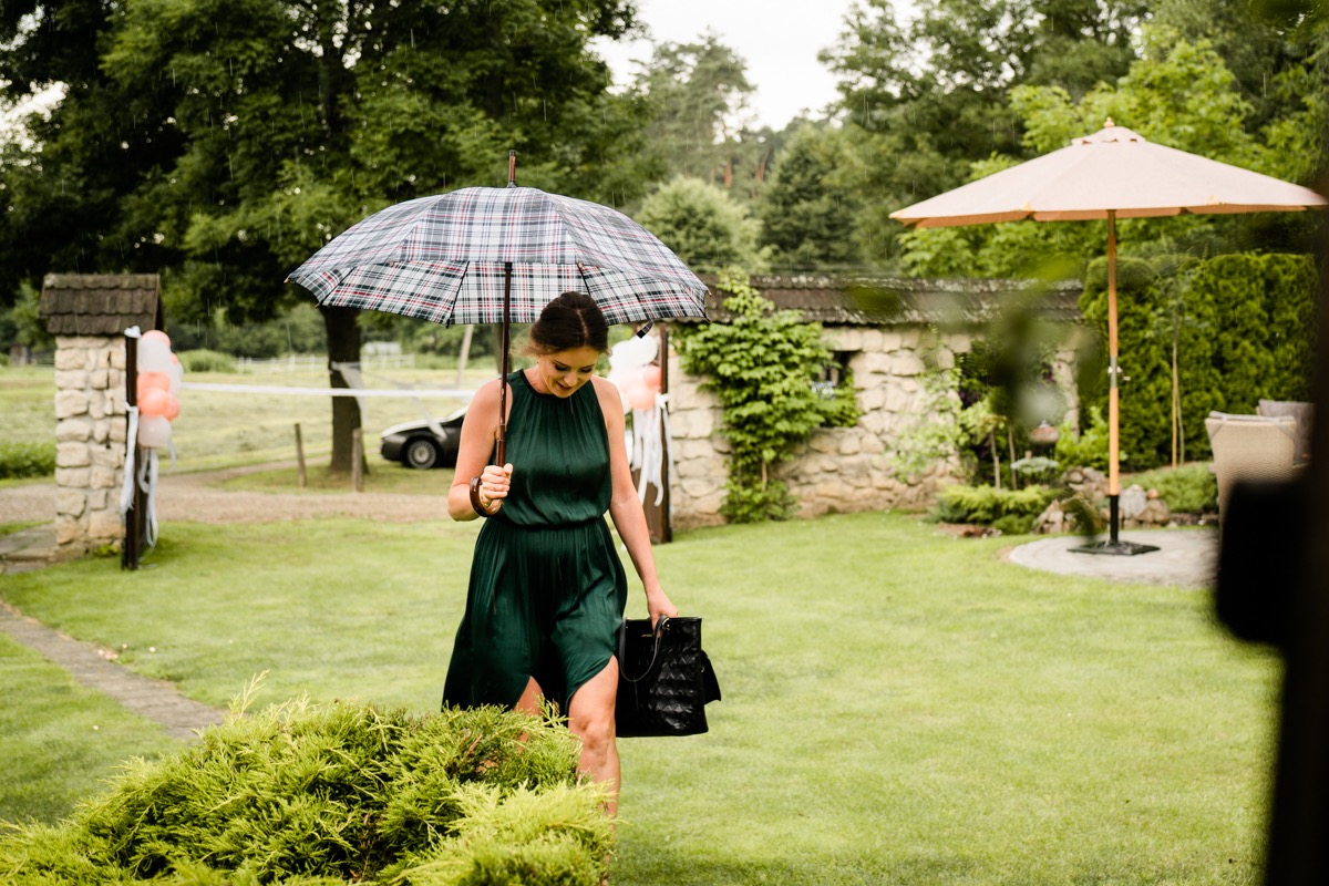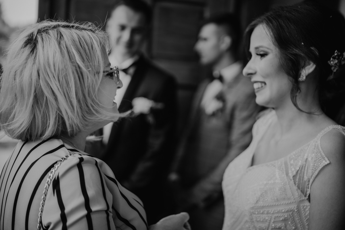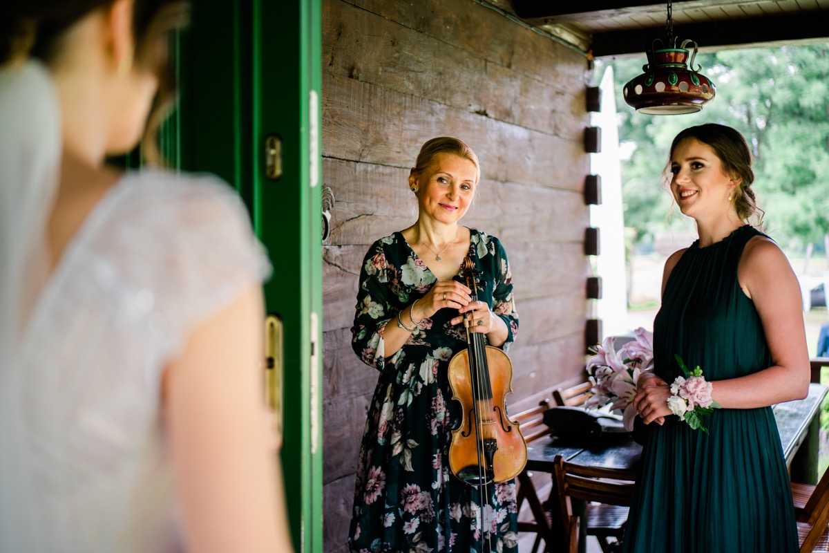 Przygotowania zaczęliśmy skoro świt, od mejkapu Ani w salonie urody – Kejt Maluje. Luźna, przyjazna atmosfera, pozwoliła nastroić się mega pozytywnie na resztę dnia i dać realną nadzieję na ciekawy reportaż. Kilka godzin odpoczynku i zawitałem u Szymona. Tam niemal cała rodzina, kilka pokoleń z uroczymi dziadkami na czele. Trochę śmiechów, ubierania, rozluźniaczy i Szymek gotowy! Do Ani udałem się ich mostkiem miłości. Mostek zarówno metaforyczny jak i dosłowny. Stworzonym przez nich samych, symbolizujący ich uczucie i łączący dwa podwórka. A jak wyglądały przygotowania u Ani? Tak jak jej dom – niezwykle klimatycznie, ciepło i rodzinnie:) Na miejscu okazało się, że świat jest mały. Mama Ani uczyła mnie języka niemieckiego w szkole, a na ścianie wśród wielu rodzinnych zdjęć wisiało to Ani i Szymona mojego autorstwa. Byłem fotografem na ich studniówce. Wiedziałem, że skądś znam te mordki 🙂 Trochę deszczu, kilka szybkich kanapeczek, ubieranie, dwa portrety i… przybył ten jeden jedyny. W asyście całej rodziny z pannami pod pachami 🙂 Zatrąbił – nie klaksonem, a prawdziwą trąbą! Przeciął wstęgę i ruszył do ukochanej. Następnie miał miejsce najbardziej wzruszający first look jaki miałem okazje zobaczyć. Łezka zakręciła się nie tylko narzeczonym ale chyba wszystkim obecnym. Jak dobrze, że mogłem schować się za aparatem i dalej udawać niewzruszonego twardziela 🙂
