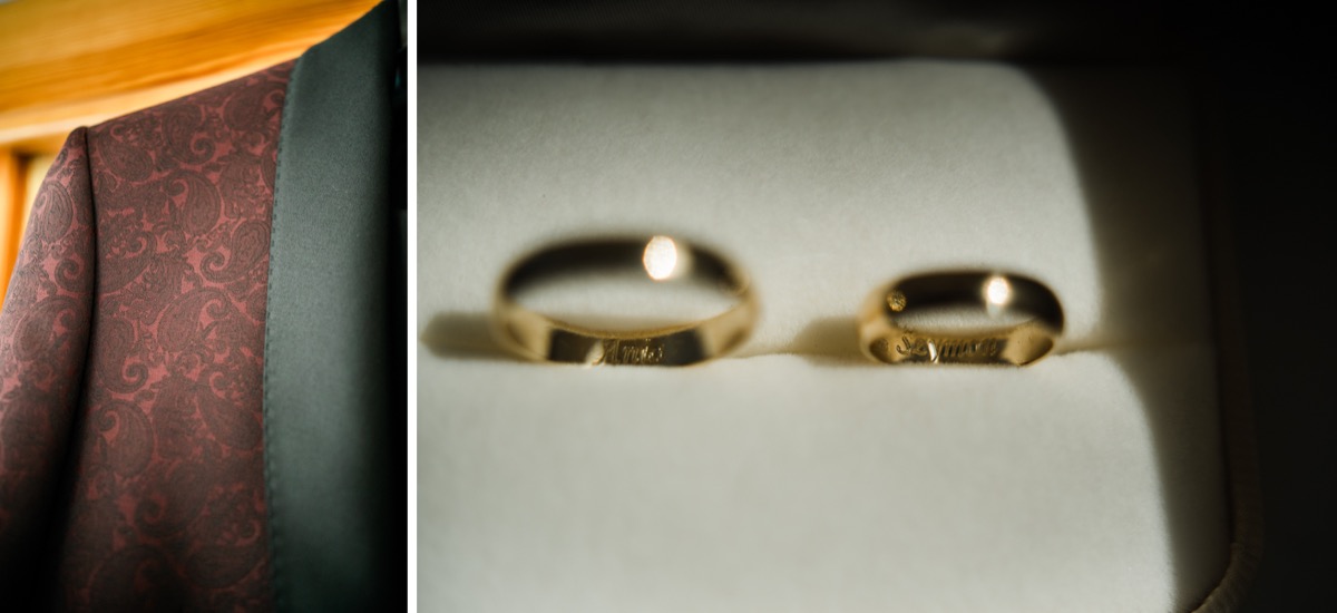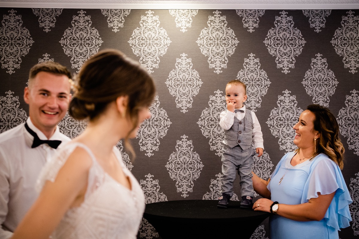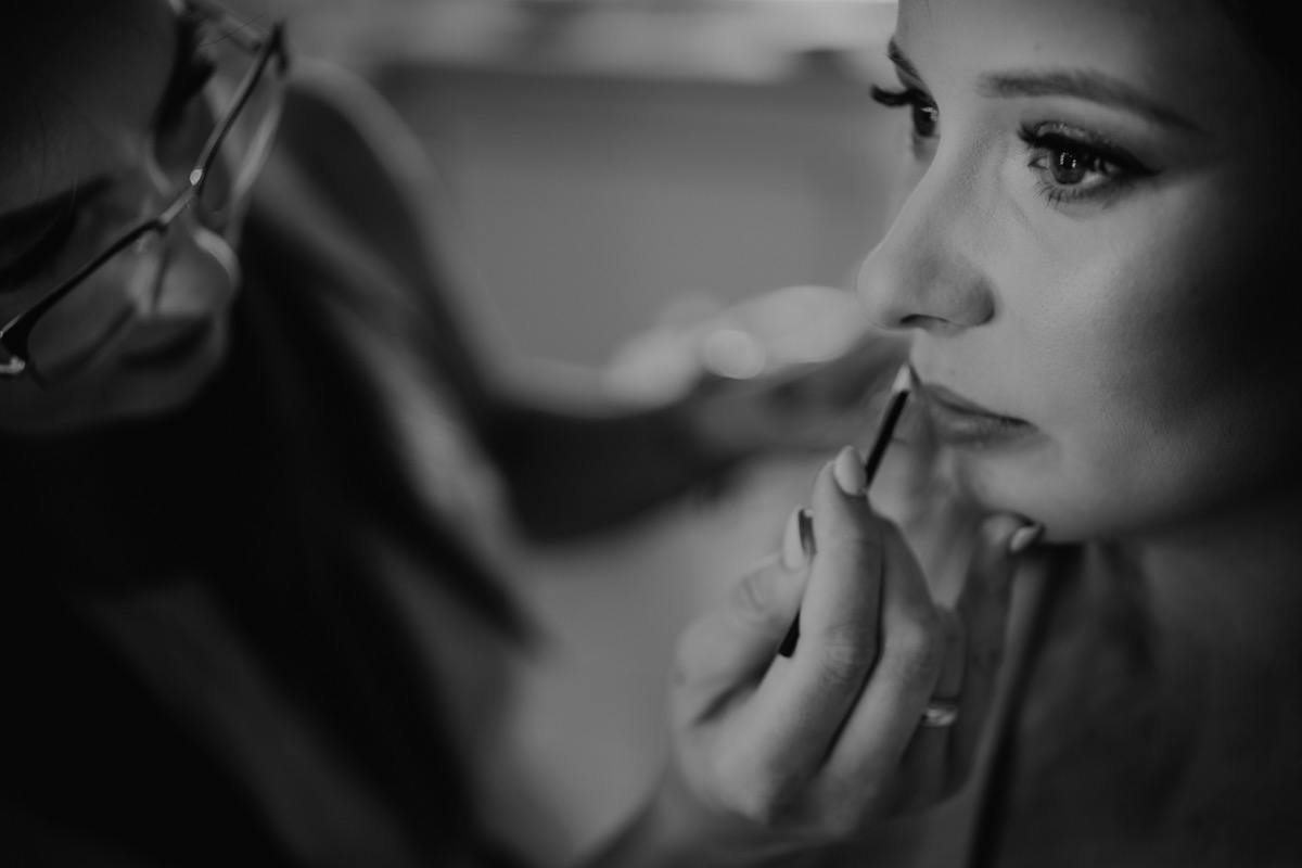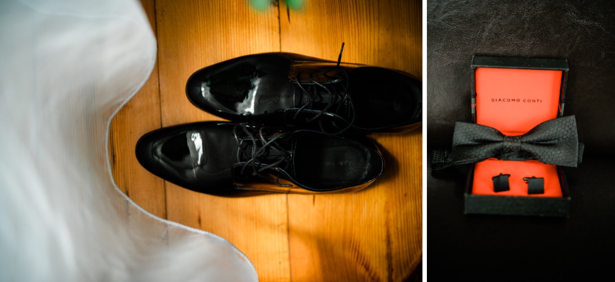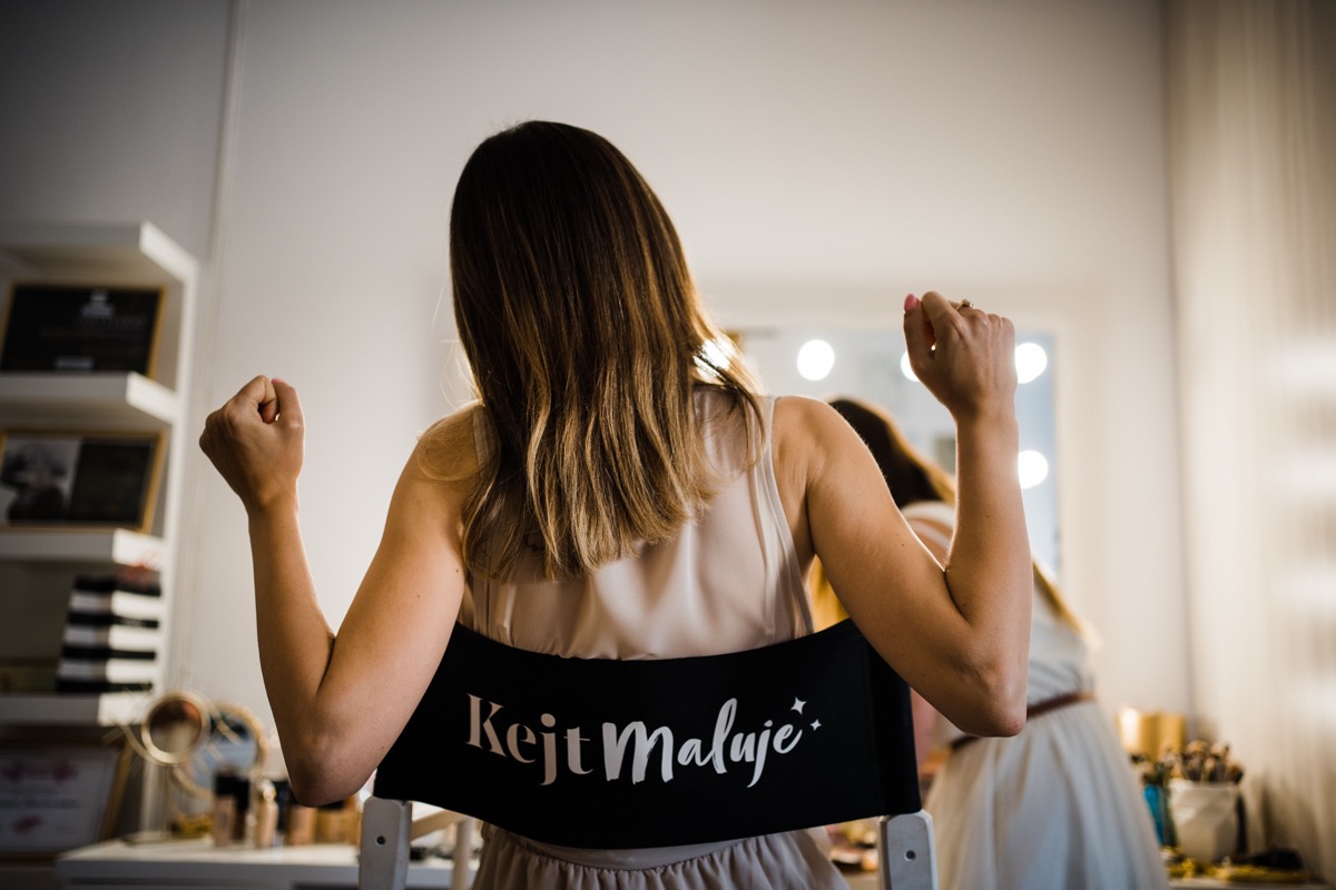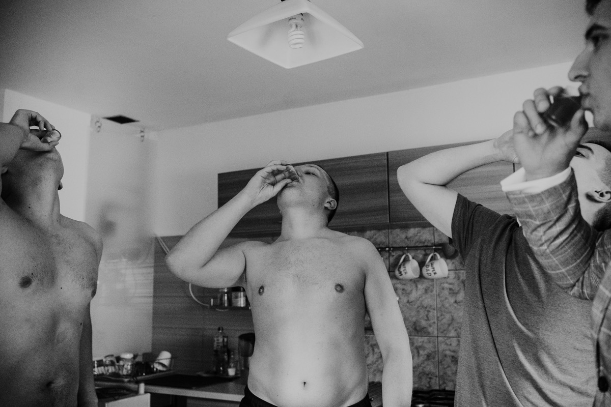 Przygotowania zaczęliśmy skoro świt, od mejkapu Ani w salonie urody – Kejt Maluje. Luźna, przyjazna atmosfera, pozwoliła nastroić się mega pozytywnie na resztę dnia i dać realną nadzieję na ciekawy reportaż. Kilka godzin odpoczynku i zawitałem u Szymona. Tam niemal cała rodzina, kilka pokoleń z uroczymi dziadkami na czele. Trochę śmiechów, ubierania, rozluźniaczy i Szymek gotowy! Do Ani udałem się ich mostkiem miłości. Mostek zarówno metaforyczny jak i dosłowny. Stworzonym przez nich samych, symbolizujący ich uczucie i łączący dwa podwórka. A jak wyglądały przygotowania u Ani? Tak jak jej dom – niezwykle klimatycznie, ciepło i rodzinnie:) Na miejscu okazało się, że świat jest mały. Mama Ani uczyła mnie języka niemieckiego w szkole, a na ścianie wśród wielu rodzinnych zdjęć wisiało to Ani i Szymona mojego autorstwa. Byłem fotografem na ich studniówce. Wiedziałem, że skądś znam te mordki 🙂 Trochę deszczu, kilka szybkich kanapeczek, ubieranie, dwa portrety i… przybył ten jeden jedyny. W asyście całej rodziny z pannami pod pachami 🙂 Zatrąbił – nie klaksonem, a prawdziwą trąbą! Przeciął wstęgę i ruszył do ukochanej. Następnie miał miejsce najbardziej wzruszający first look jaki miałem okazje zobaczyć. Łezka zakręciła się nie tylko narzeczonym ale chyba wszystkim obecnym. Jak dobrze, że mogłem schować się za aparatem i dalej udawać niewzruszonego twardziela 🙂