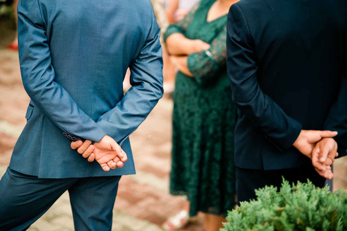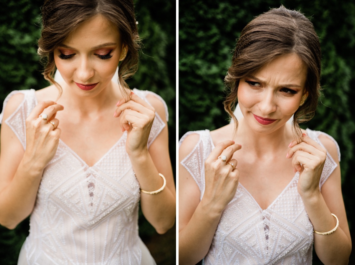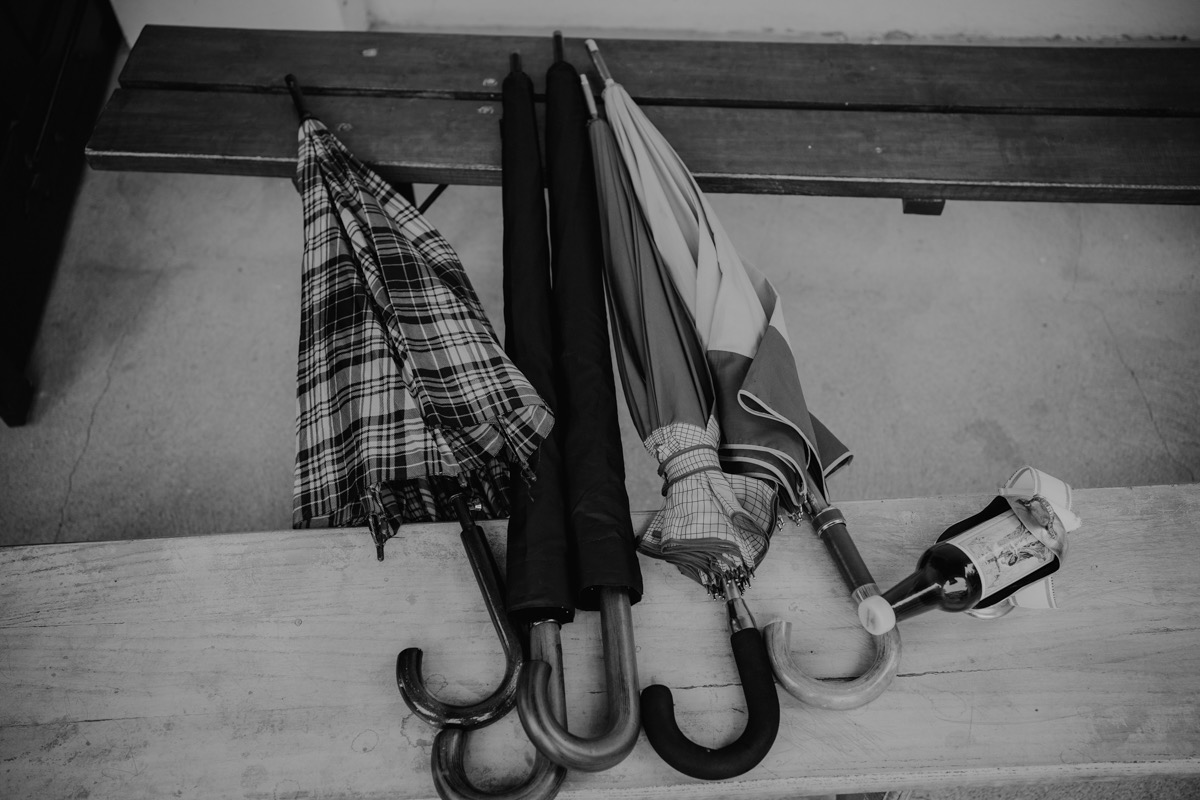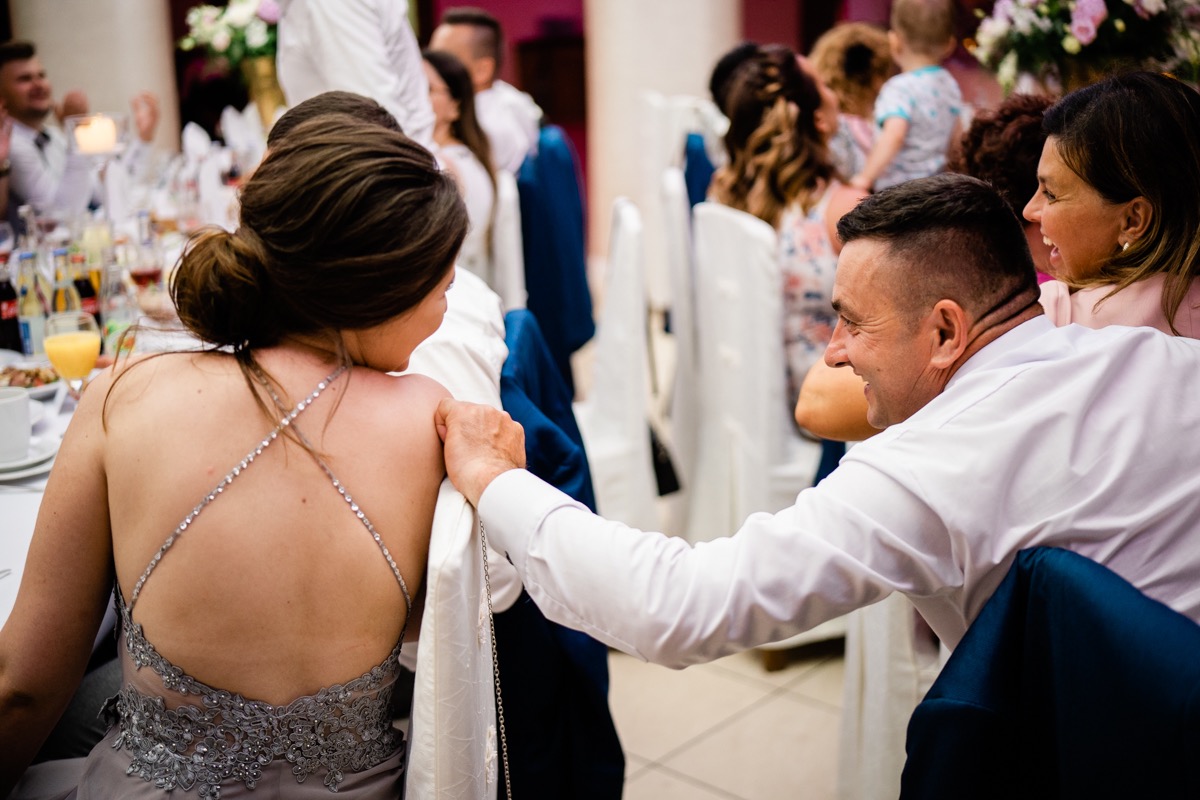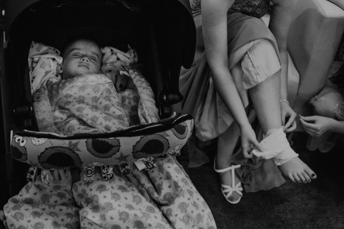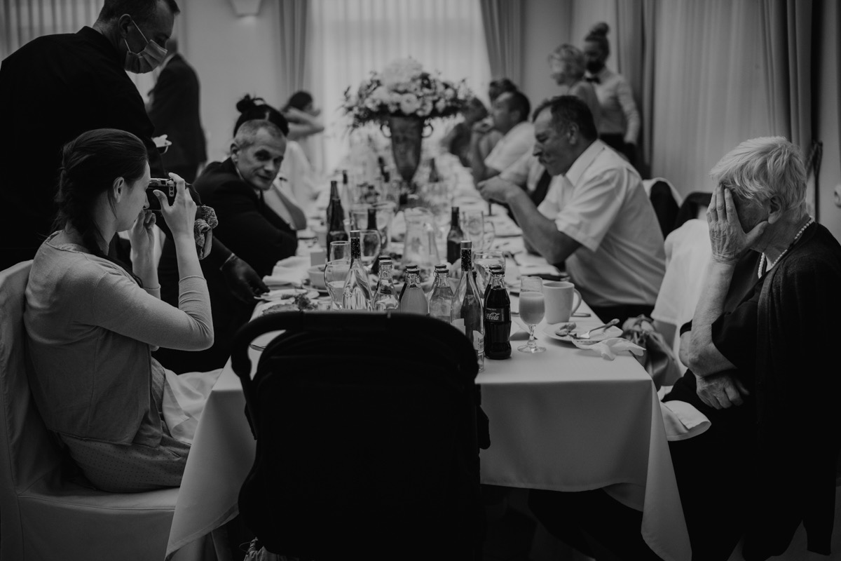 Przygotowania zaczęliśmy skoro świt, od mejkapu Ani w salonie urody – Kejt Maluje. Luźna, przyjazna atmosfera, pozwoliła nastroić się mega pozytywnie na resztę dnia i dać realną nadzieję na ciekawy reportaż. Kilka godzin odpoczynku i zawitałem u Szymona. Tam niemal cała rodzina, kilka pokoleń z uroczymi dziadkami na czele. Trochę śmiechów, ubierania, rozluźniaczy i Szymek gotowy! Do Ani udałem się ich mostkiem miłości. Mostek zarówno metaforyczny jak i dosłowny. Stworzonym przez nich samych, symbolizujący ich uczucie i łączący dwa podwórka. A jak wyglądały przygotowania u Ani? Tak jak jej dom – niezwykle klimatycznie, ciepło i rodzinnie:) Na miejscu okazało się, że świat jest mały. Mama Ani uczyła mnie języka niemieckiego w szkole, a na ścianie wśród wielu rodzinnych zdjęć wisiało to Ani i Szymona mojego autorstwa. Byłem fotografem na ich studniówce. Wiedziałem, że skądś znam te mordki 🙂 Trochę deszczu, kilka szybkich kanapeczek, ubieranie, dwa portrety i… przybył ten jeden jedyny. W asyście całej rodziny z pannami pod pachami 🙂 Zatrąbił – nie klaksonem, a prawdziwą trąbą! Przeciął wstęgę i ruszył do ukochanej. Następnie miał miejsce najbardziej wzruszający first look jaki miałem okazje zobaczyć. Łezka zakręciła się nie tylko narzeczonym ale chyba wszystkim obecnym. Jak dobrze, że mogłem schować się za aparatem i dalej udawać niewzruszonego twardziela 🙂