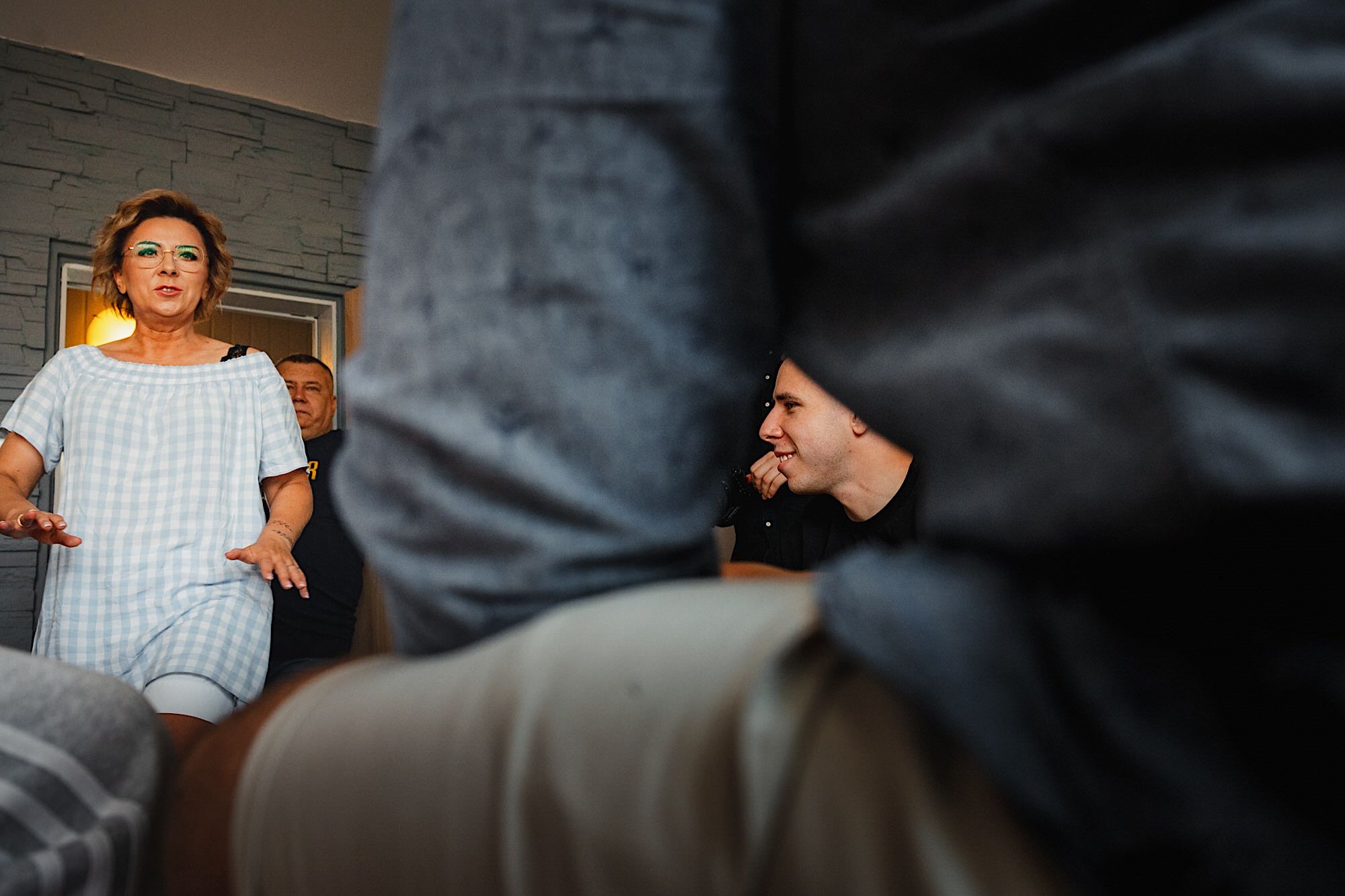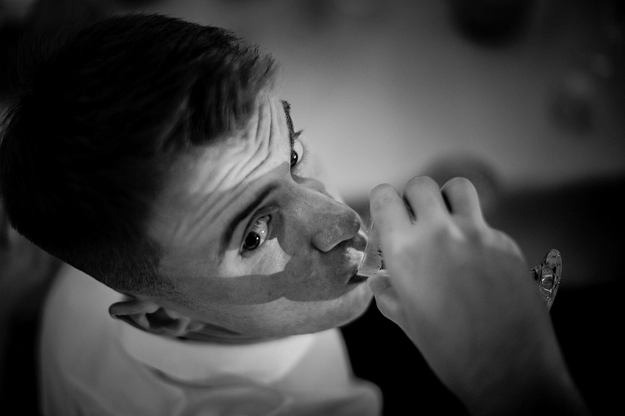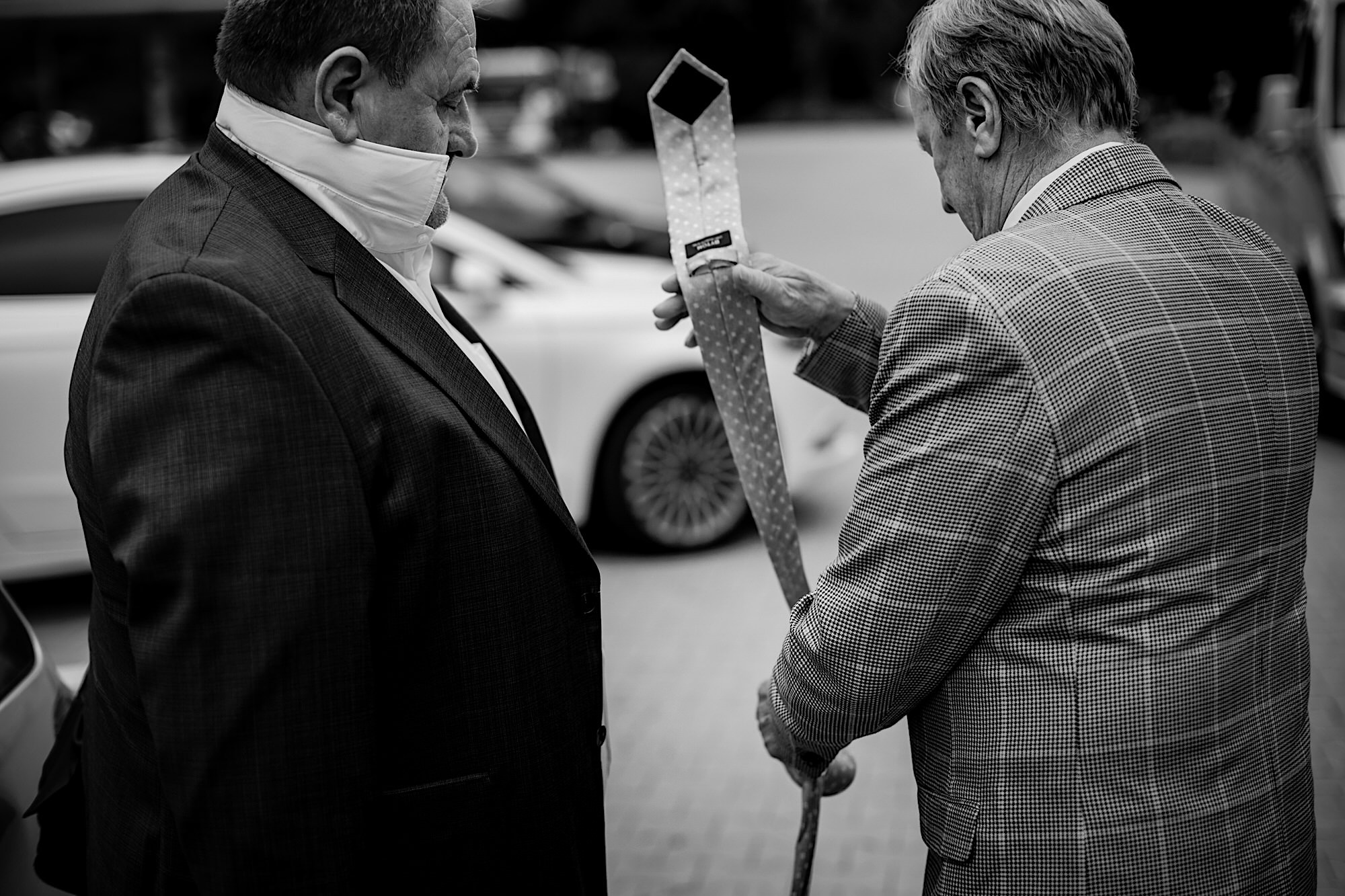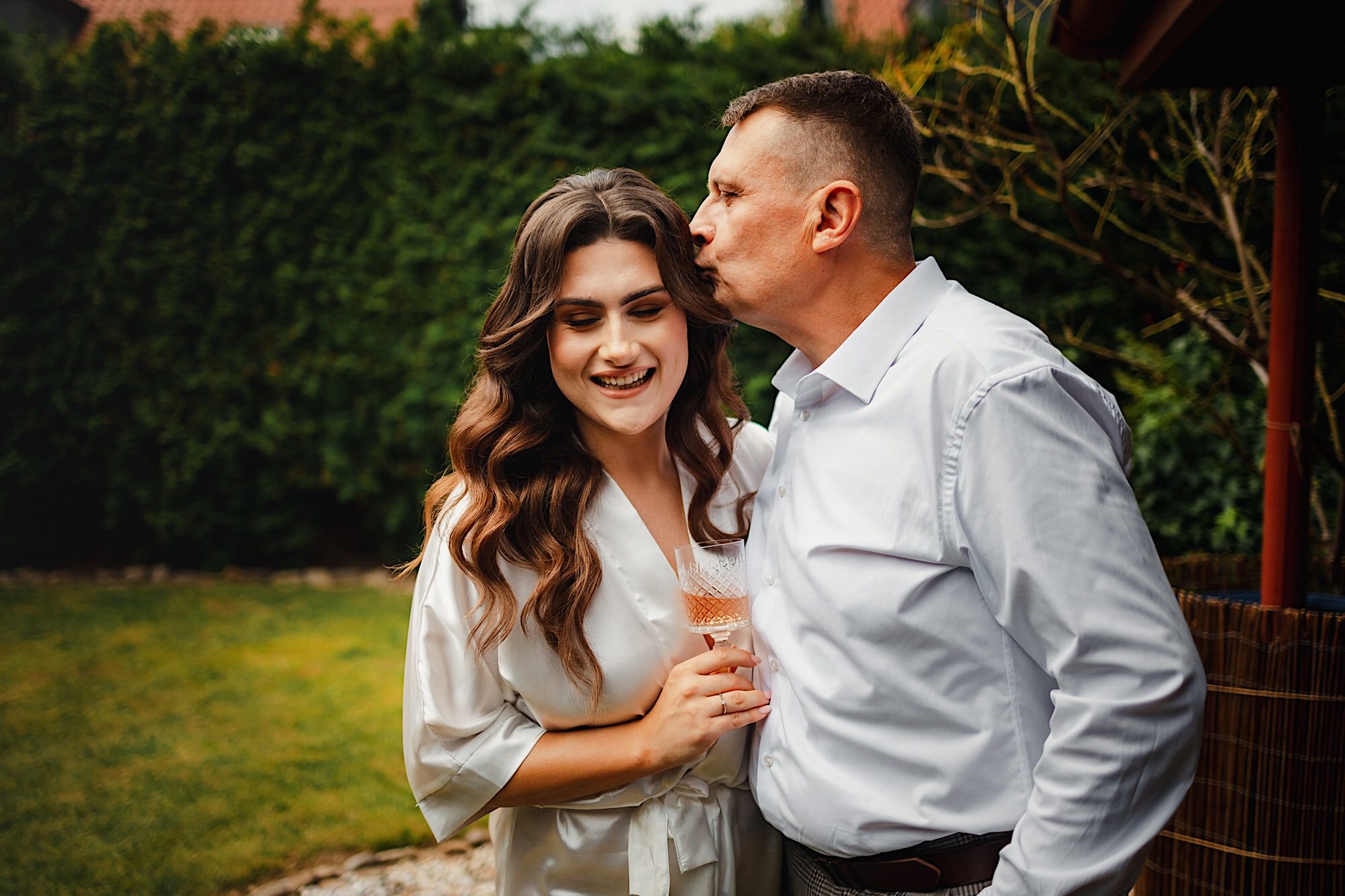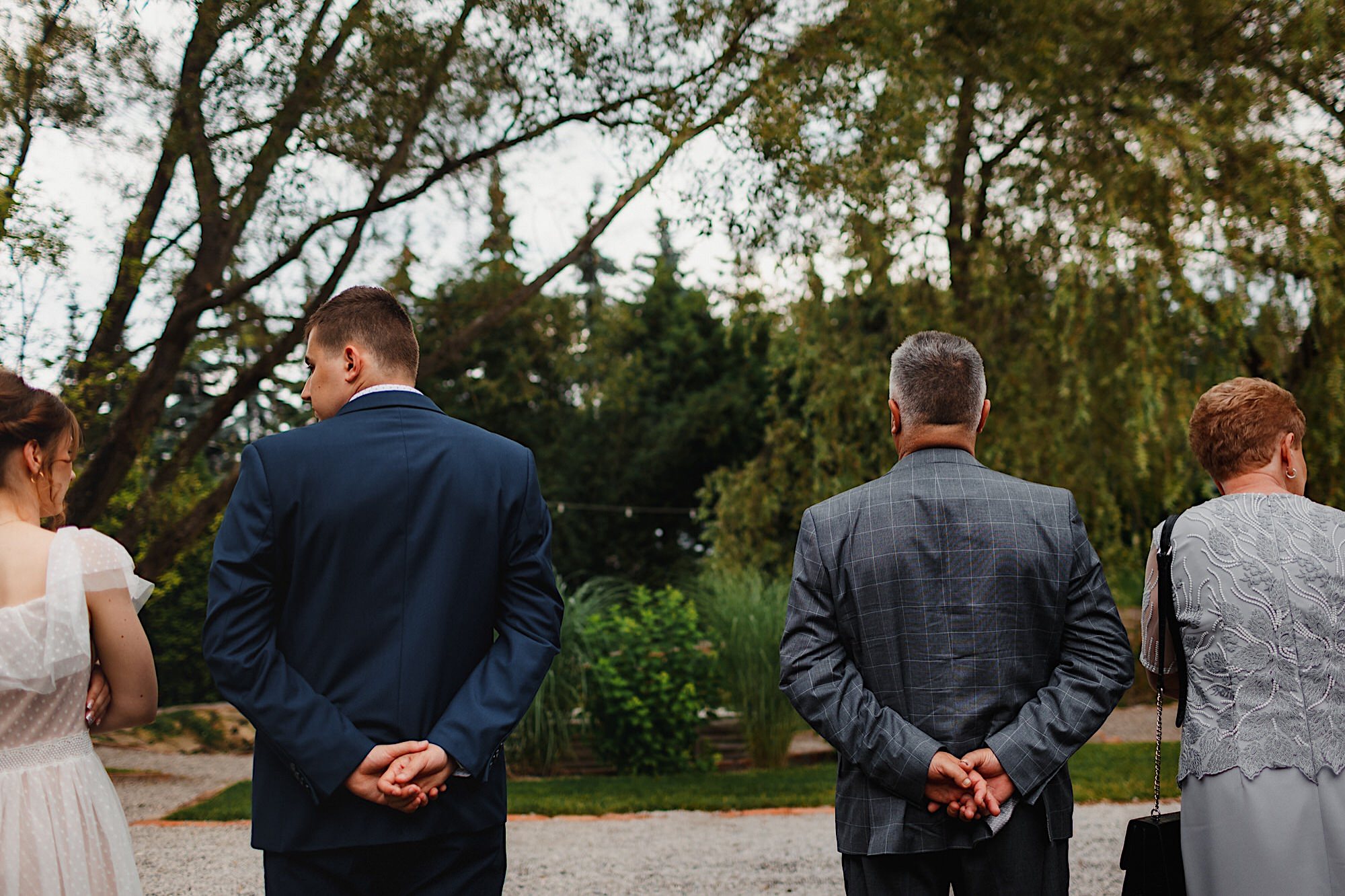 Ten gorący dzień rozpocząłem od przygotowań u Sebastiana w towarzystwie niemal samych samców i to tych alfa! 🙂 Była też przeurocza i bez przerwy uśmiechnięta Mamusia. Mnóstwo żartów, oglądanie zdjęć małego Sebusia w towarzystwie whisky i anegdot. Czułem się trochę jak w szatni piłkarskiej, a to klimat który uwielbiam. Na koniec ubieranie Pana Młodego przy loży szyderców i w drogę do Igi. A tam chaos, który bardzo lubię. Kobiety (i nie tylko) robiły się na bóstwo, biegający pies w sukni ślubnej, rozmowy z Dziadziem o życiu, szampejny i takie tam. Naprawdę sympatycznie i bez żadnego napięcia. Jeszcze tylko kilka portretów w ogrodzie i czas na ceremonię.