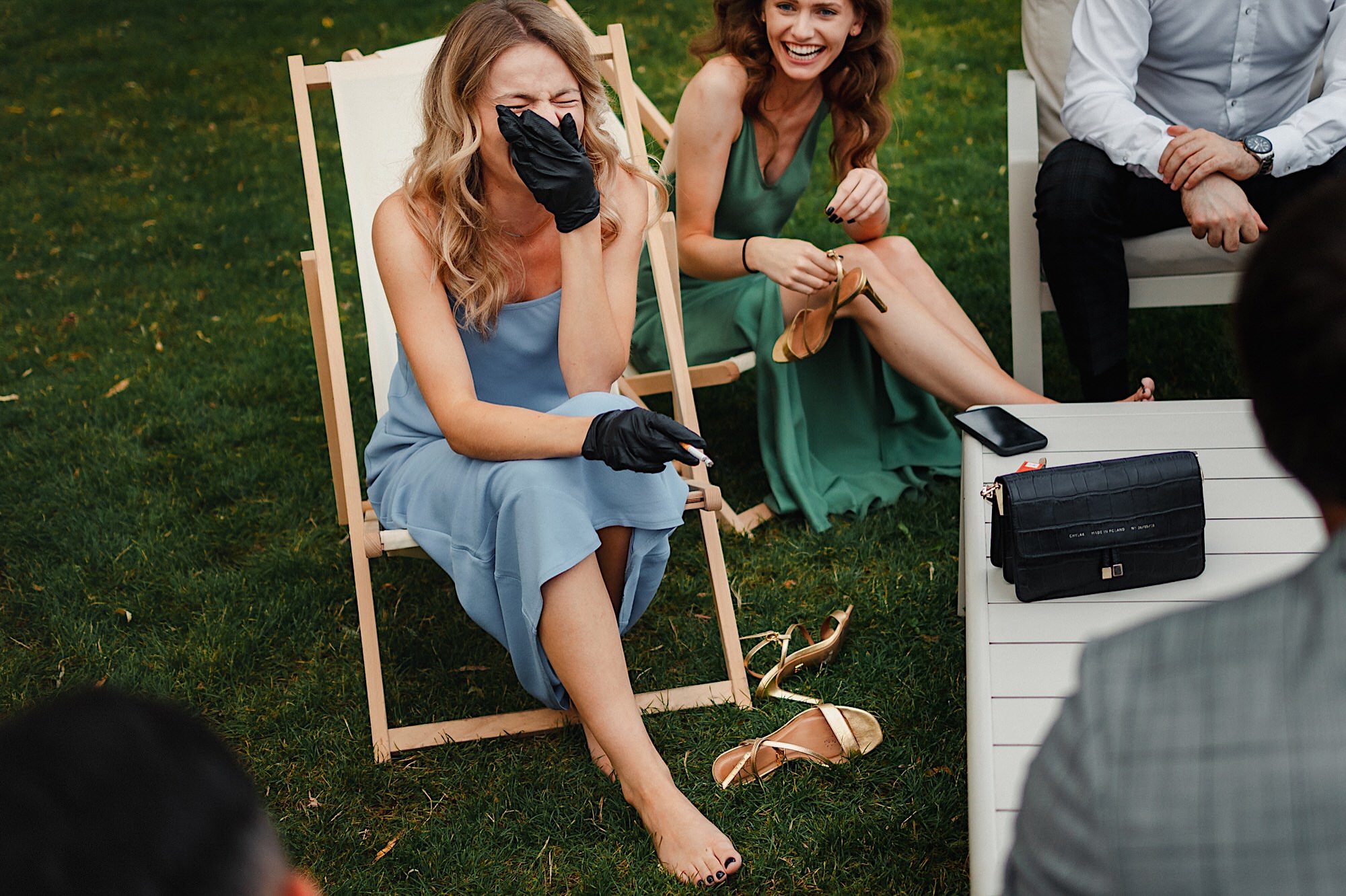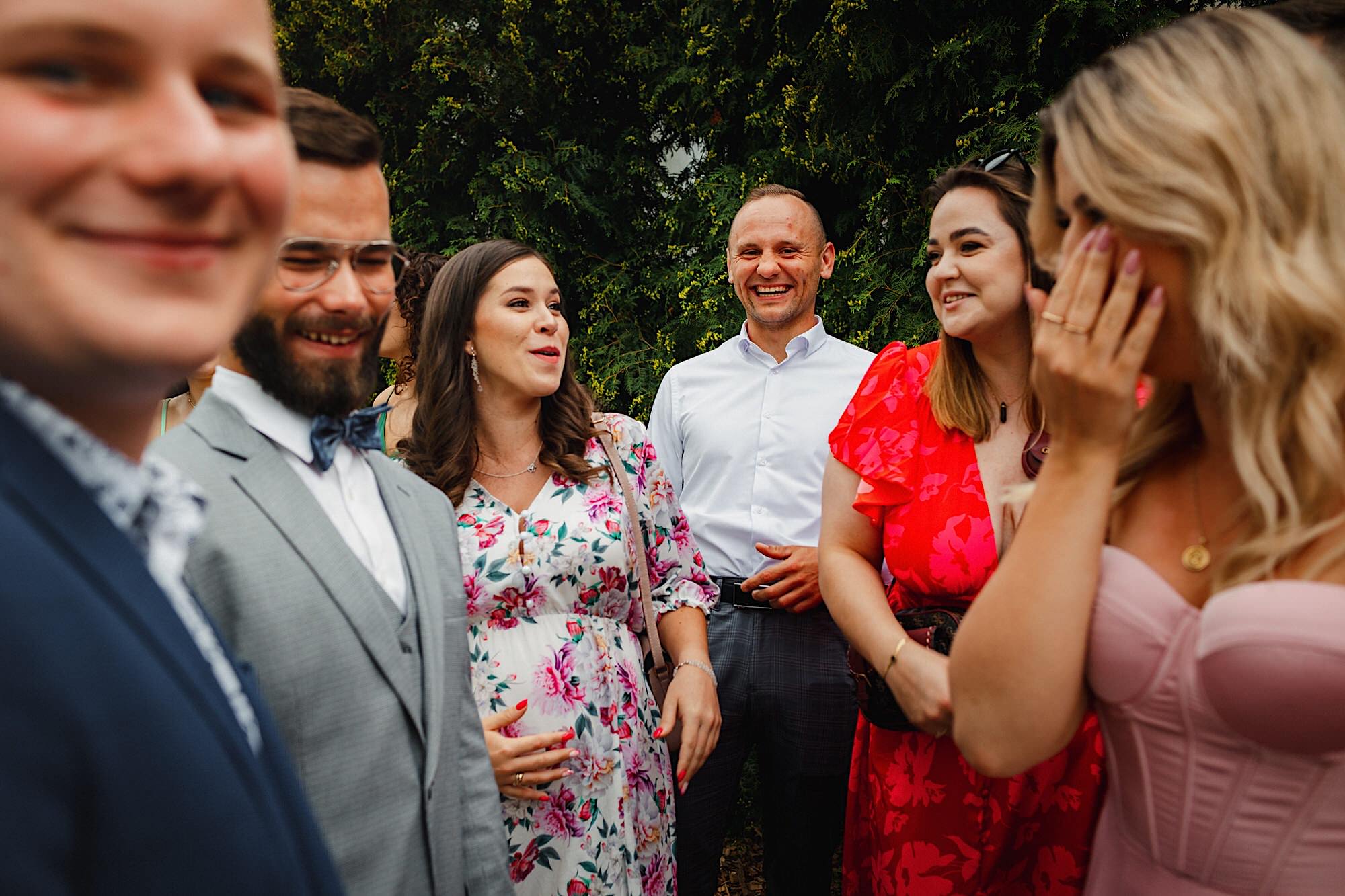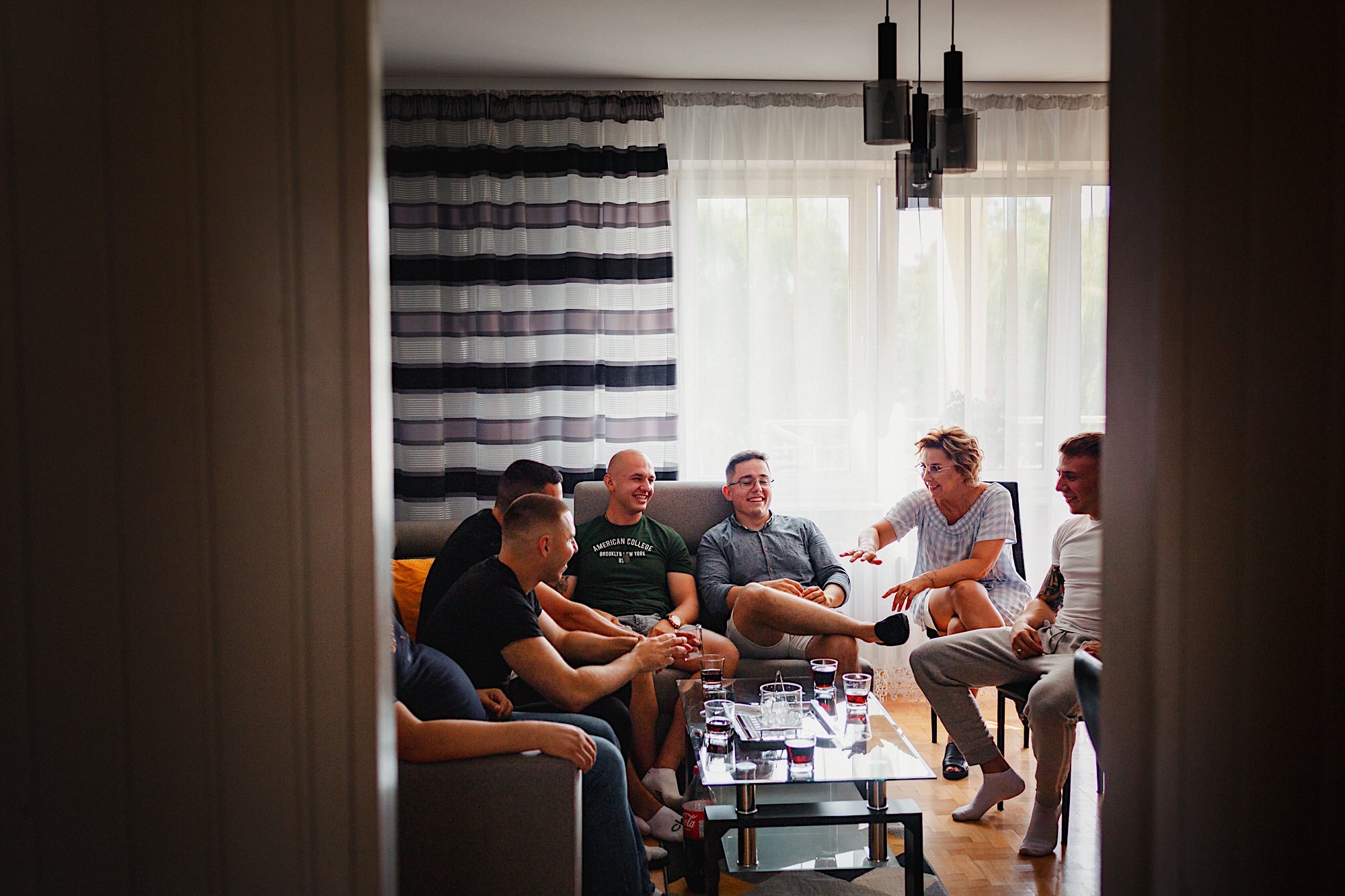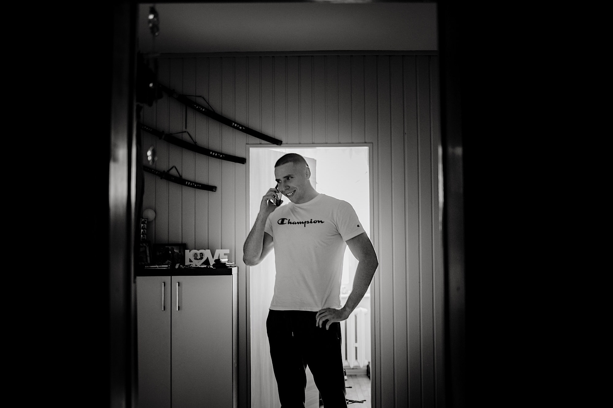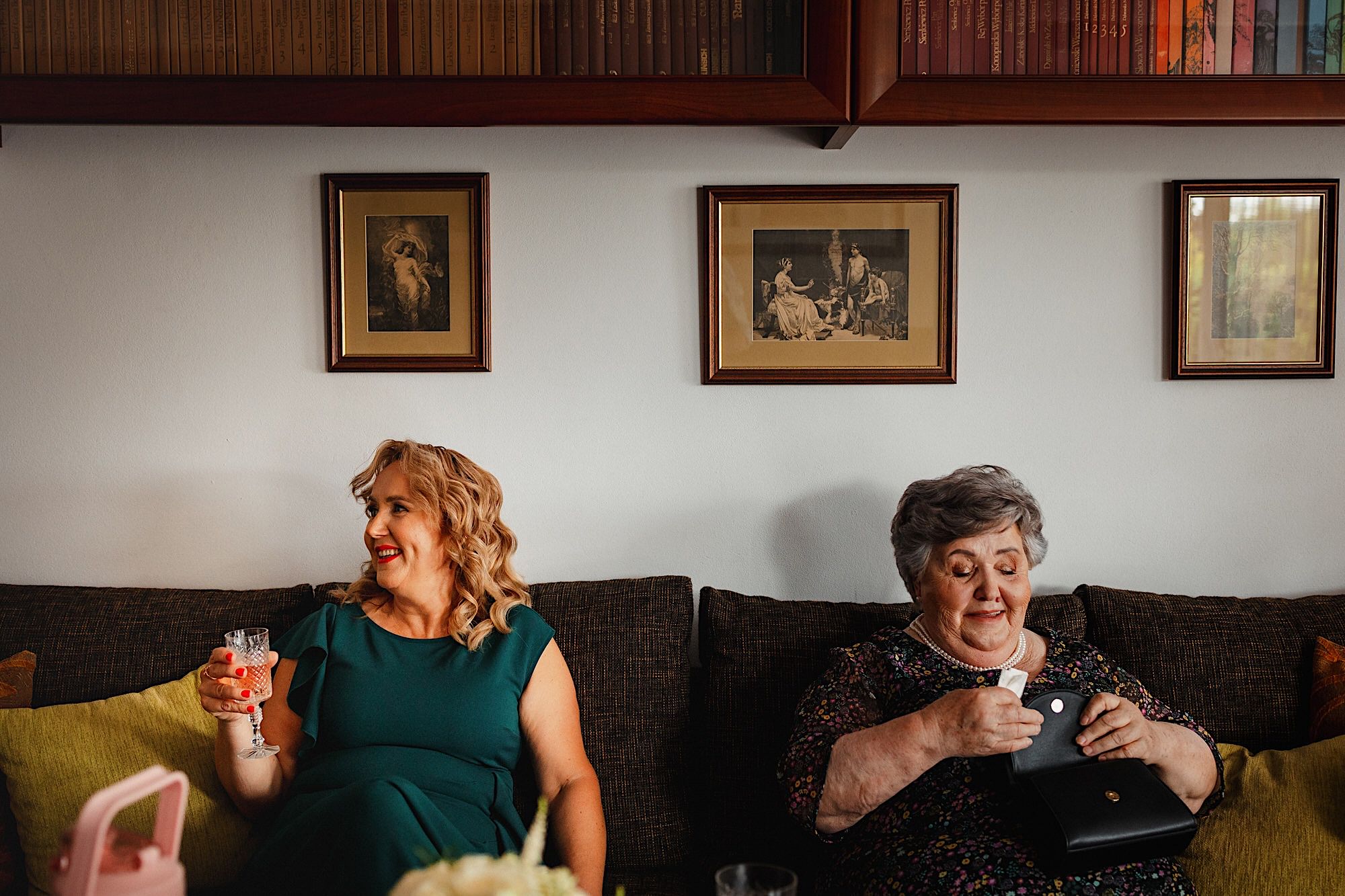 Ten gorący dzień rozpocząłem od przygotowań u Sebastiana w towarzystwie niemal samych samców i to tych alfa! 🙂 Była też przeurocza i bez przerwy uśmiechnięta Mamusia. Mnóstwo żartów, oglądanie zdjęć małego Sebusia w towarzystwie whisky i anegdot. Czułem się trochę jak w szatni piłkarskiej, a to klimat który uwielbiam. Na koniec ubieranie Pana Młodego przy loży szyderców i w drogę do Igi. A tam chaos, który bardzo lubię. Kobiety (i nie tylko) robiły się na bóstwo, biegający pies w sukni ślubnej, rozmowy z Dziadziem o życiu, szampejny i takie tam. Naprawdę sympatycznie i bez żadnego napięcia. Jeszcze tylko kilka portretów w ogrodzie i czas na ceremonię.