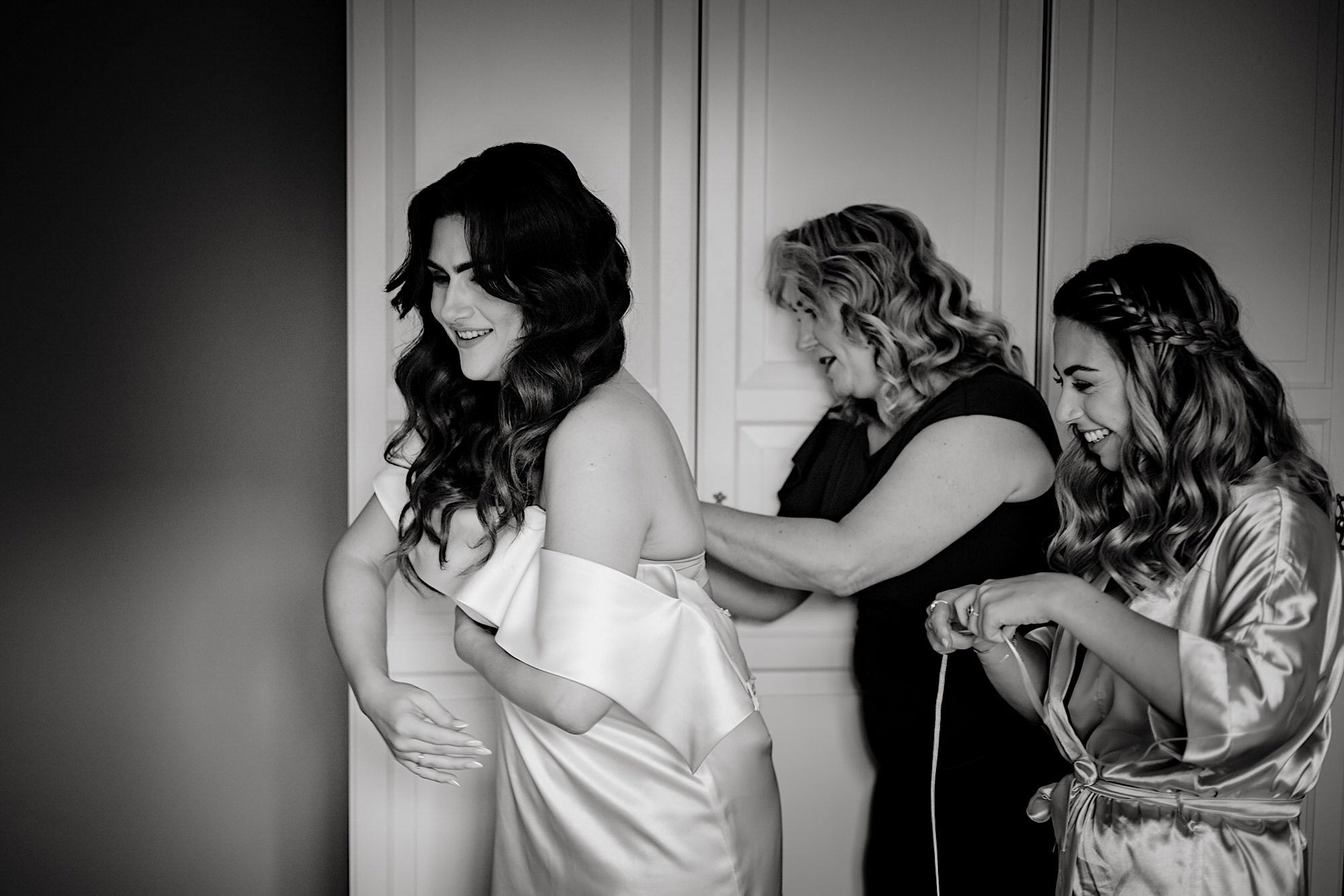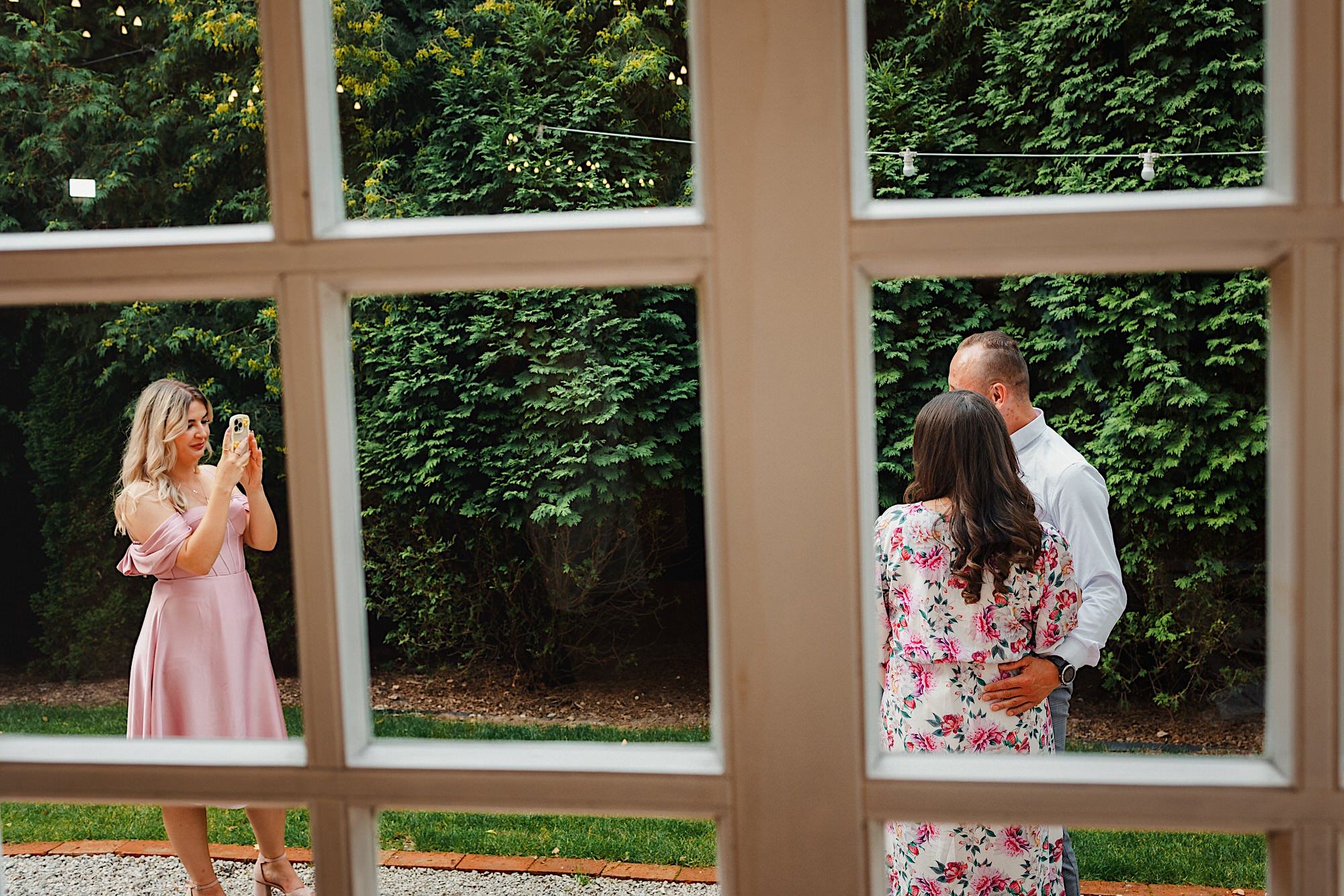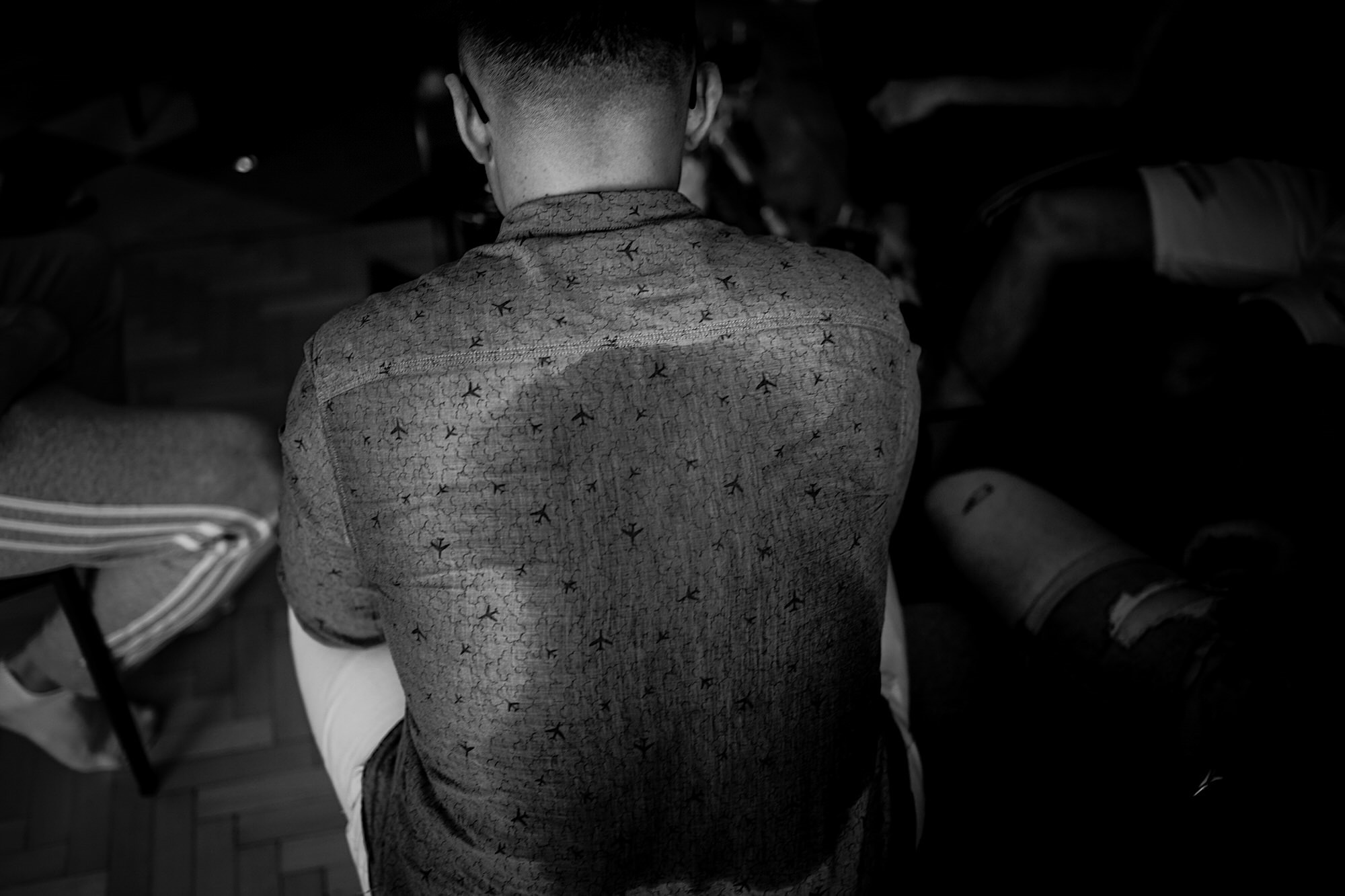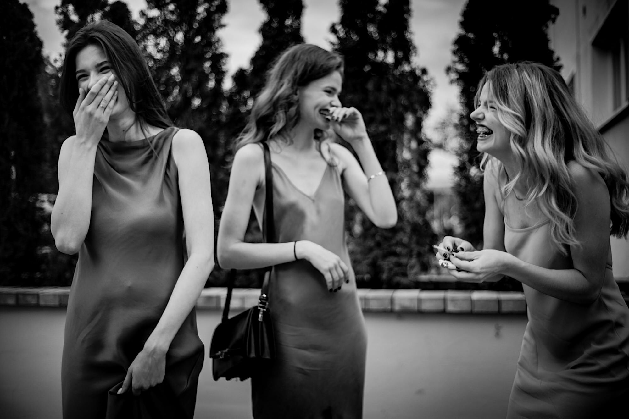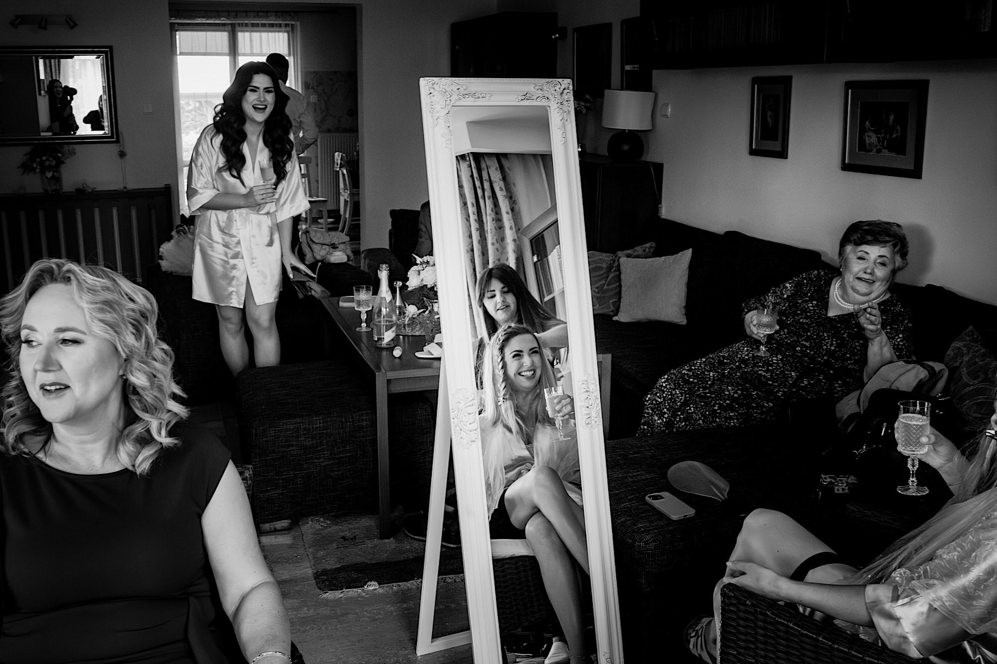 Ten gorący dzień rozpocząłem od przygotowań u Sebastiana w towarzystwie niemal samych samców i to tych alfa! 🙂 Była też przeurocza i bez przerwy uśmiechnięta Mamusia. Mnóstwo żartów, oglądanie zdjęć małego Sebusia w towarzystwie whisky i anegdot. Czułem się trochę jak w szatni piłkarskiej, a to klimat który uwielbiam. Na koniec ubieranie Pana Młodego przy loży szyderców i w drogę do Igi. A tam chaos, który bardzo lubię. Kobiety (i nie tylko) robiły się na bóstwo, biegający pies w sukni ślubnej, rozmowy z Dziadziem o życiu, szampejny i takie tam. Naprawdę sympatycznie i bez żadnego napięcia. Jeszcze tylko kilka portretów w ogrodzie i czas na ceremonię.