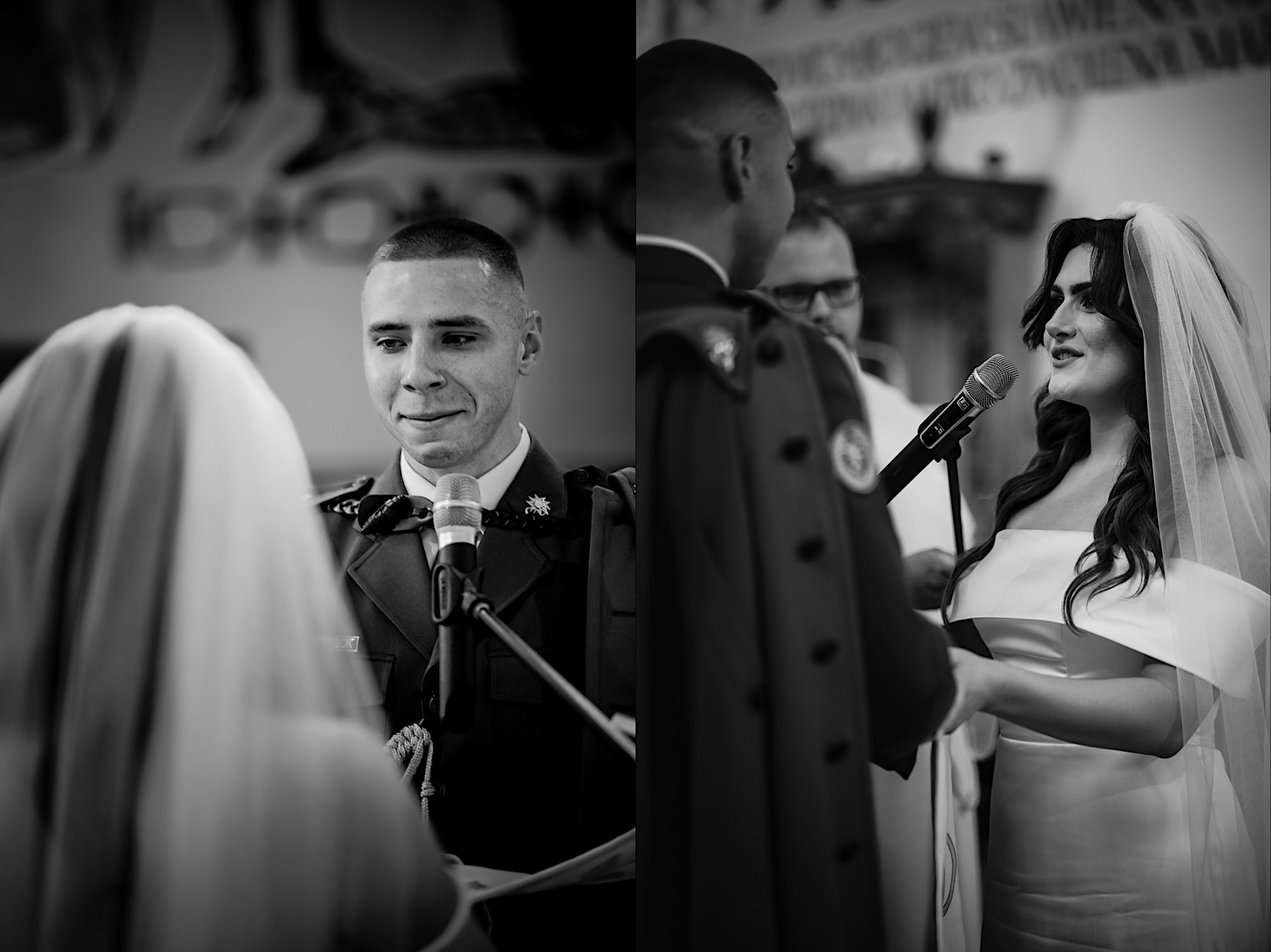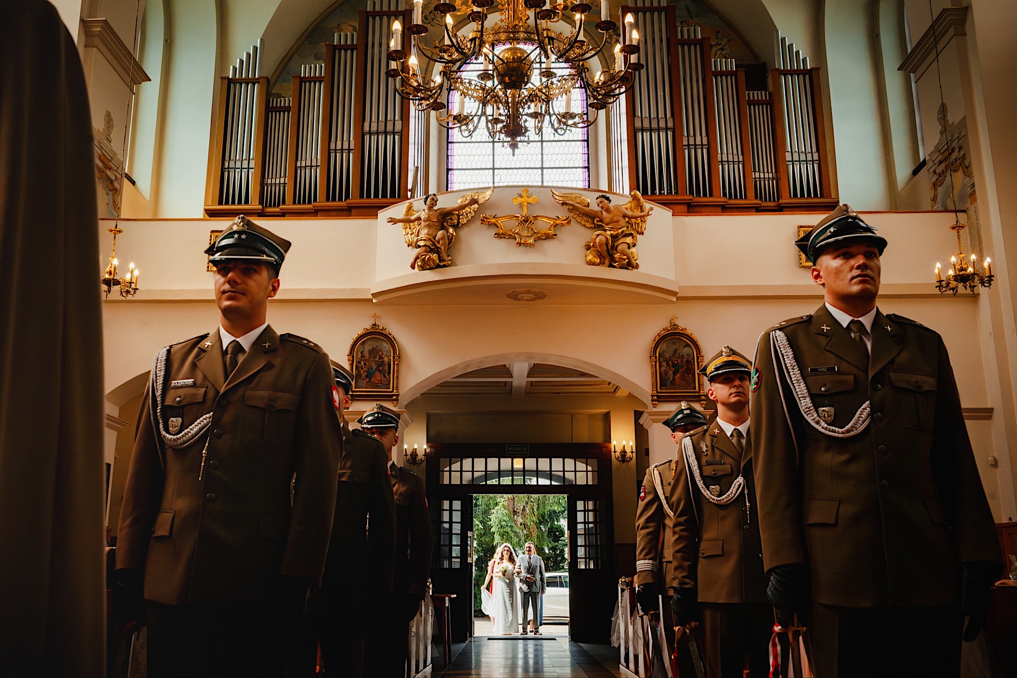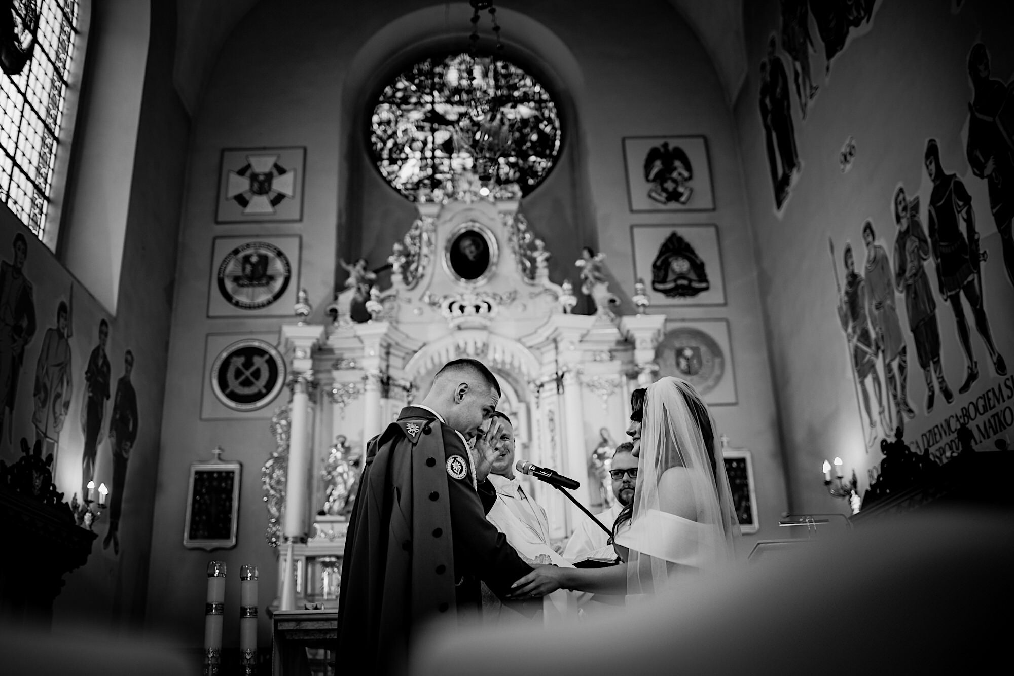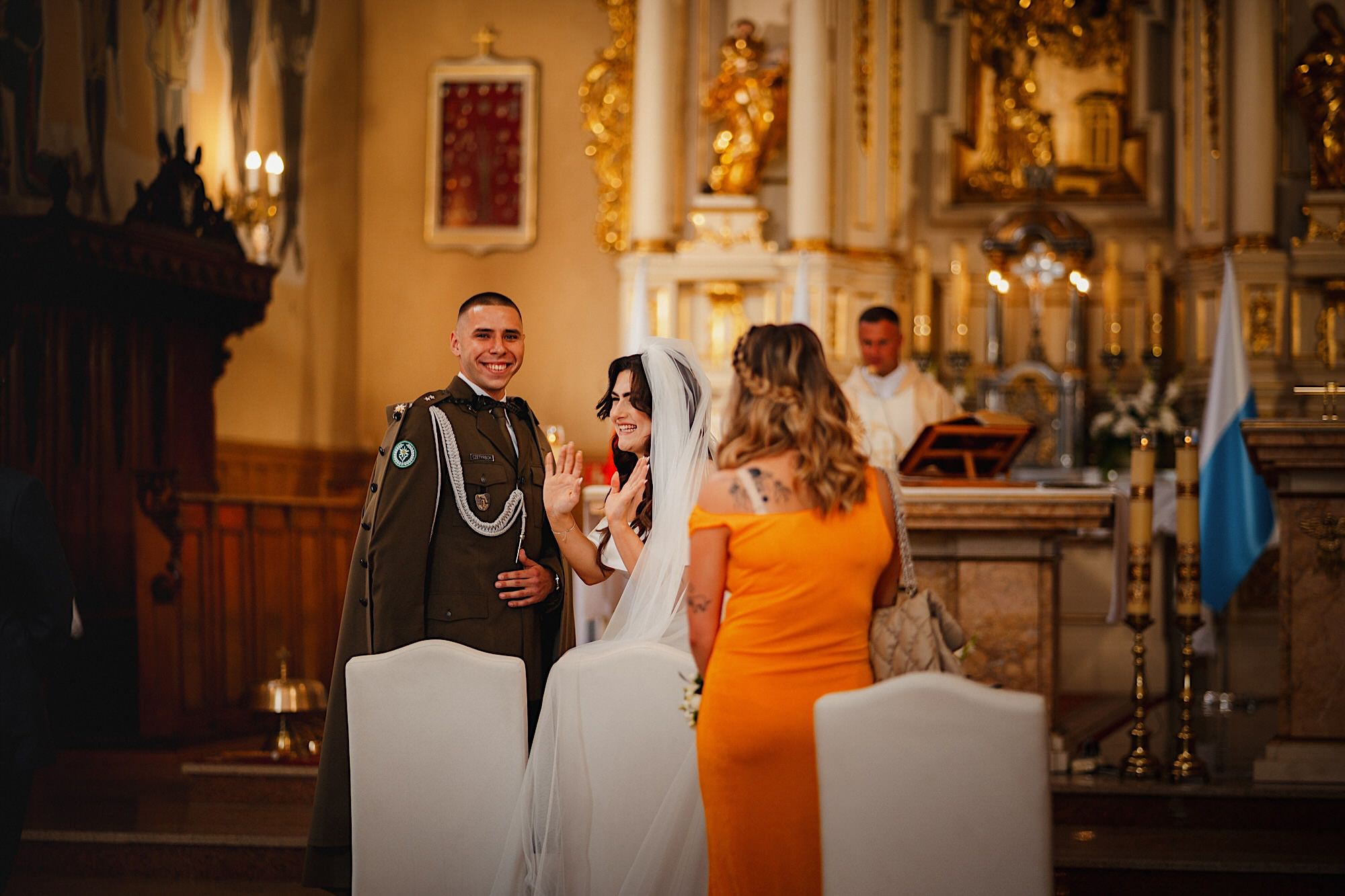 Ta odbyła się w Parafii Wojskowo – Cywilnej pw Matki Bożej Królowej Polski w Rzeszowie. Sebastian zobaczył Igę dopiero przed Ołtarzem w towarzystwie wielu mundurów i swoich łez wzruszenia. Piękne to było! Uwielbiam takie kontrasty. Wspominałem już, że to twardziel z dobrym i wrażliwym serduszkiem? Taki jaki początek, taka cała msza. Uśmiechy na zmianę z chwilami wzruszenia. Cudo! A po ceremonii…