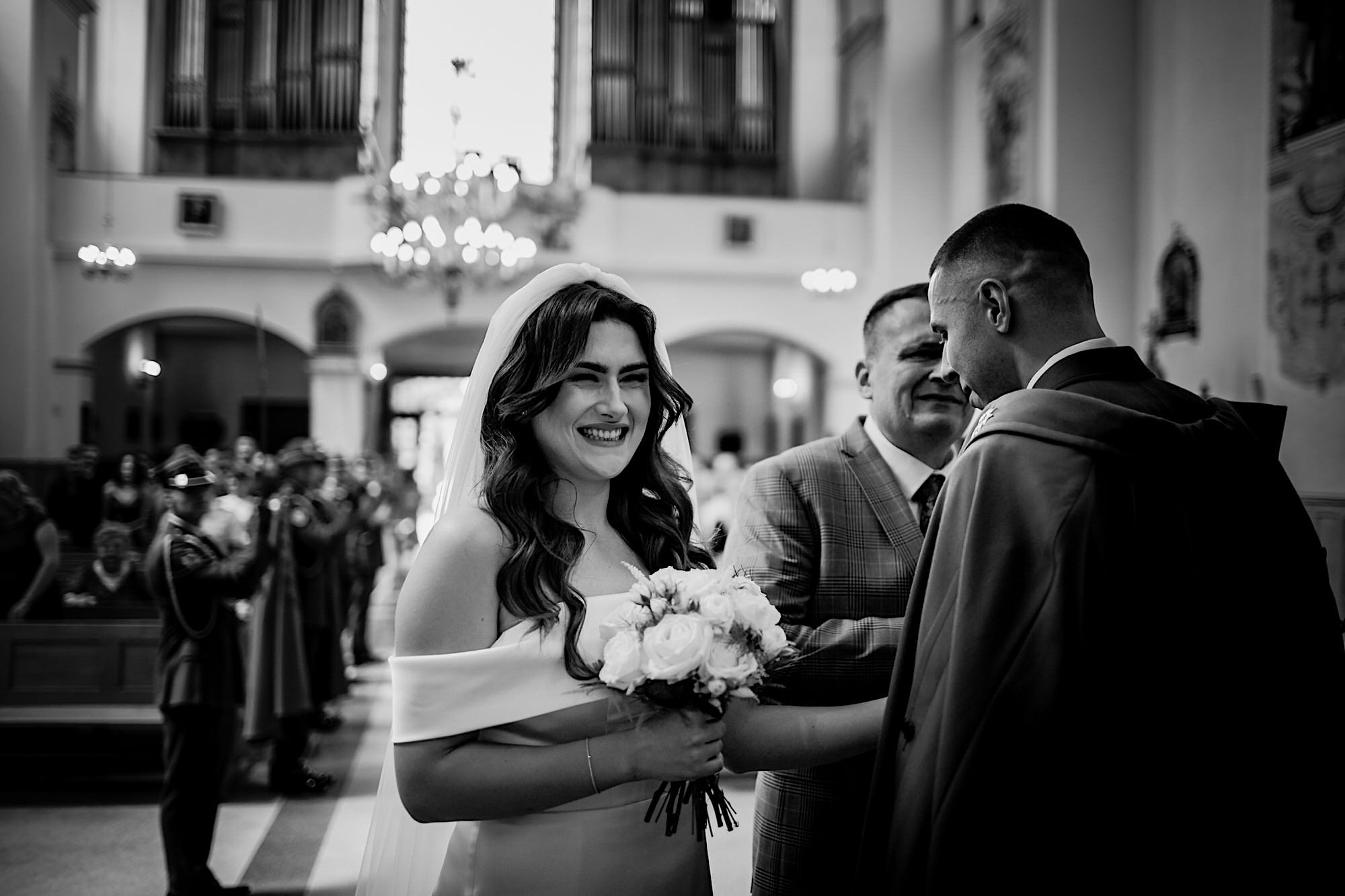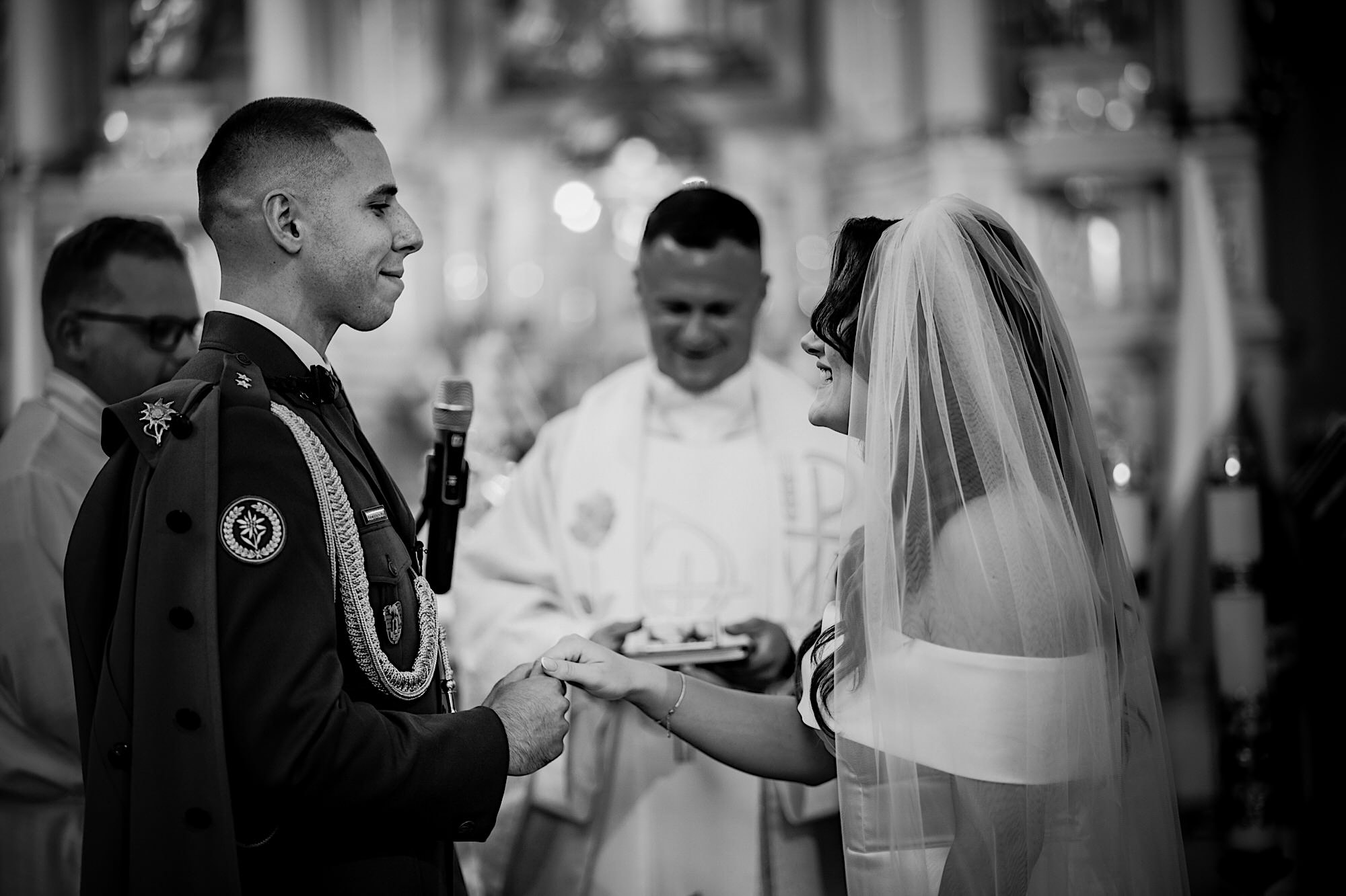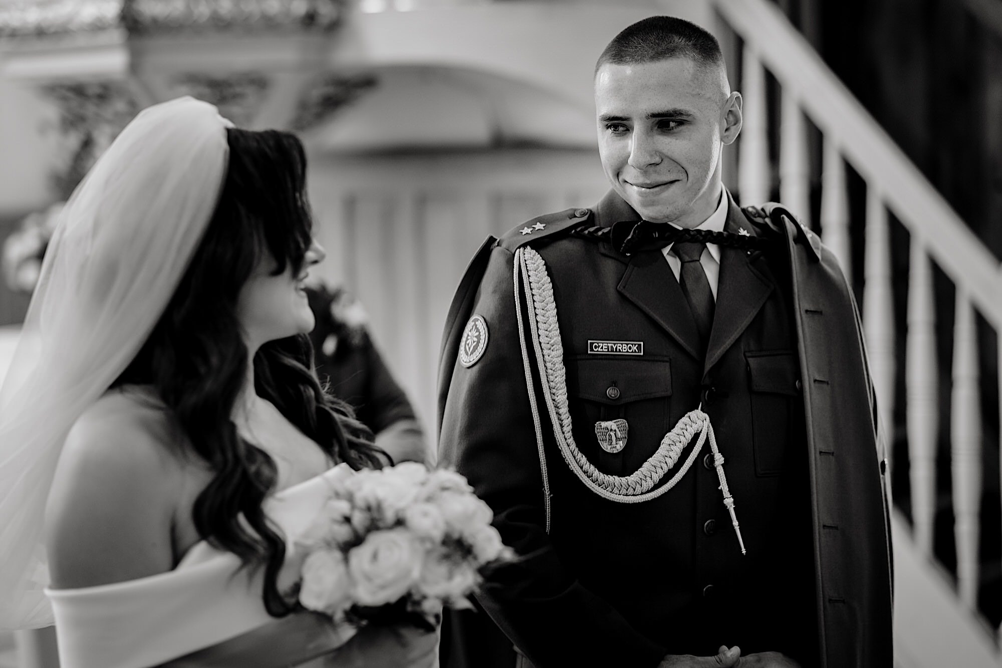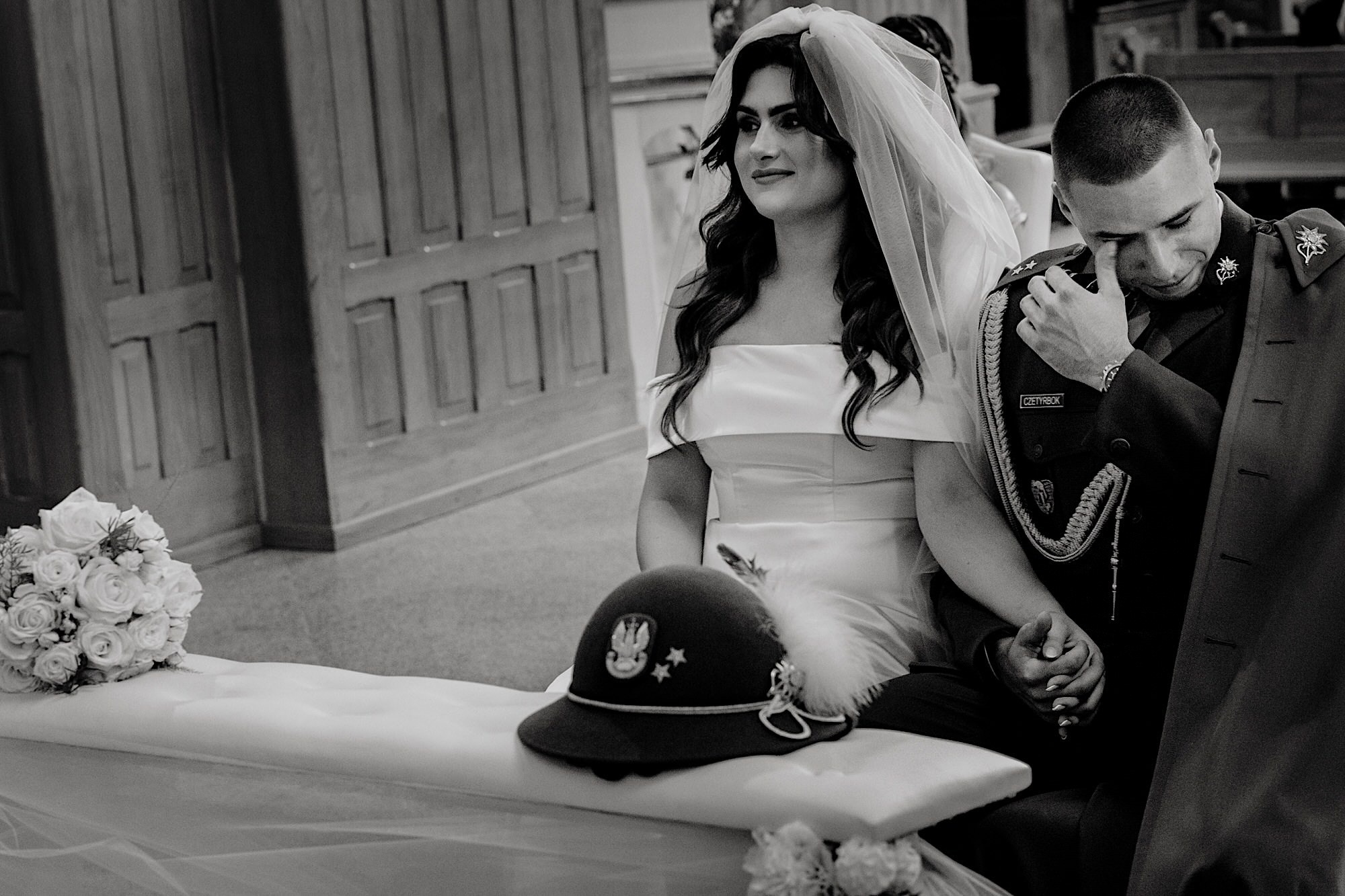 Ta odbyła się w Parafii Wojskowo – Cywilnej pw Matki Bożej Królowej Polski w Rzeszowie. Sebastian zobaczył Igę dopiero przed Ołtarzem w towarzystwie wielu mundurów i swoich łez wzruszenia. Piękne to było! Uwielbiam takie kontrasty. Wspominałem już, że to twardziel z dobrym i wrażliwym serduszkiem? Taki jaki początek, taka cała msza. Uśmiechy na zmianę z chwilami wzruszenia. Cudo! A po ceremonii…