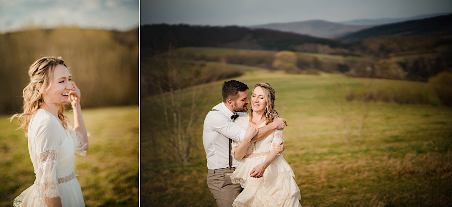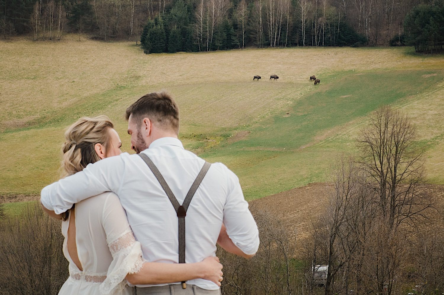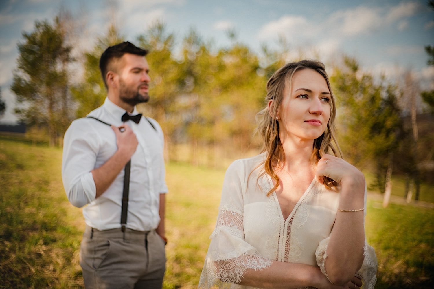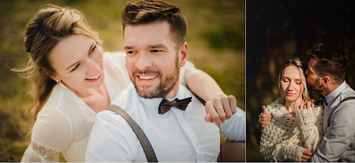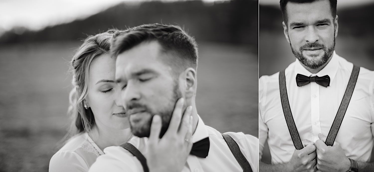 Na końcu (dosłownie!) długiej i krętej drogi ujrzałem bramę Maciejewki. Z daleka czuć niepowtarzalny Bieszczadzki klimat, który stworzyli niezwykle uśmiechnięci, gościnni i pełni pasji właścieciele. Zewsząd czuć rodzinną, przyjazną atmosferę. Po pokonaniu kilku (nastu) schodków spotkałem roześmianą i wyluzowaną bandę. Jeszcze bez dwójki najważniejszych bohaterów. Sporo rozmów, żartów, rodzinnej rywalizacji w tenisa stołowego (przecież nie napiszę ping-ponga we wpisie o absolwencie AWFu!). Ola z Markiem chcieli mieć lepsze wejście dlatego kazali na siebie trooooszkę poczekać. Takie też mieli 🙂 Ekspresowe ubieranie i w drogę do Urzędy Stanu Cywilnego w Baligrodzie. Tam przemiła Pani, która poprowadziła ceremonię w świetnej atmosferze 🙂 Obrączki na palce, kilka formalnych fotek i powrót do Maciejewki. Na miejscu czekała już rodzina i najbliżsi przyjaciele. Toast, emocjonalne życzenia, wegetariański pyszny obiadek, chwila strachu (chciał mnie zjeść przeuroczy pies, który jak zobaczył gościa z aparatami to pomylił mnie chyba z transformersem) i korzystając z pięknych i malowniczych okoliczności ruszyliśmy na 30 minutową sesję. Liska na sesji już miałem, tym razem przyszła pora na Żubry i to nie te na butelce, a prawdziwe! Troszkę przytulania, wygłupów, biegania i powrót do gości, którzy czekali już przy grillu. A tam jak przez cały dzień. Na luzie, bez zbędnej napinki, z wszechobecnym uśmiechem. Wyczekałem pierwszych tańców i na tym mój udział w tym pięknym i wyjątkowym wydarzeniu się skończył.
