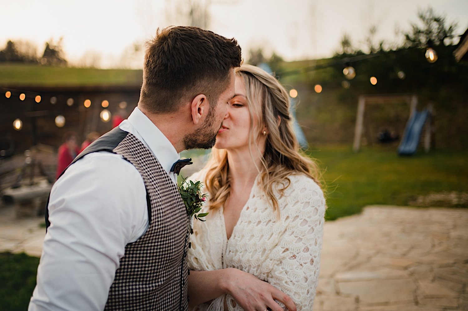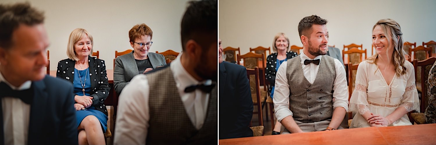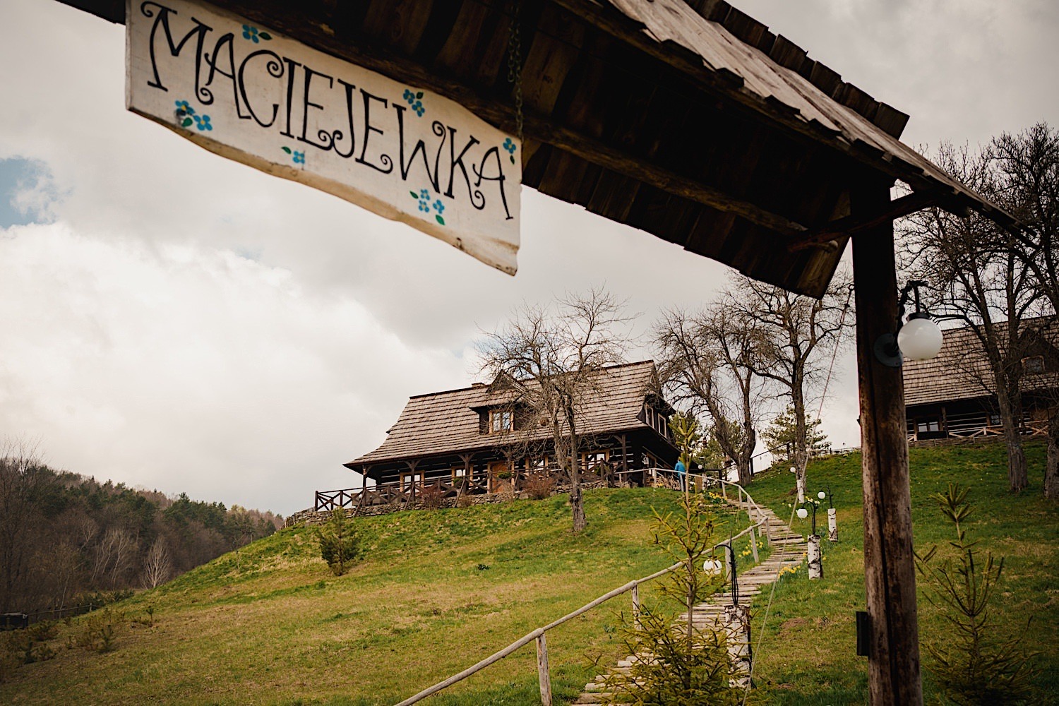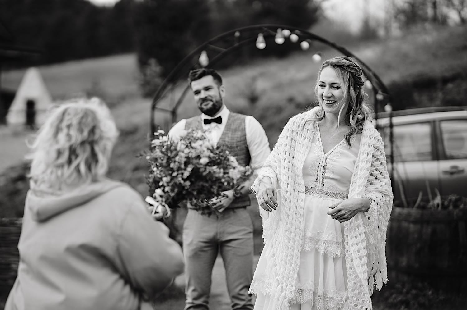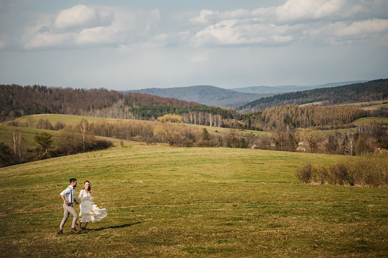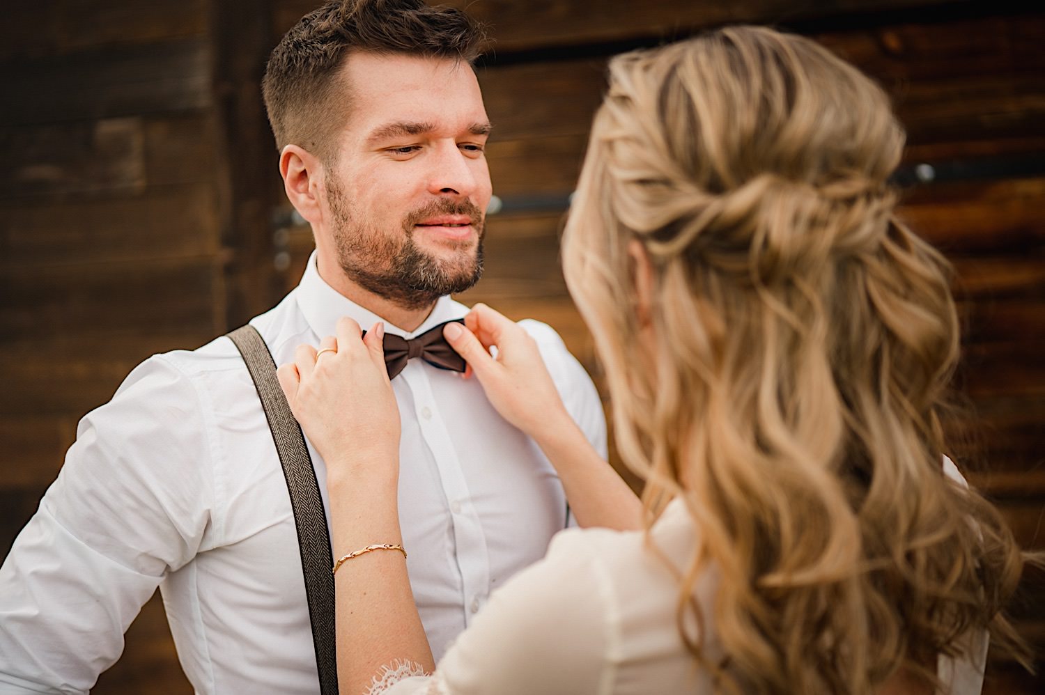 Na końcu (dosłownie!) długiej i krętej drogi ujrzałem bramę Maciejewki. Z daleka czuć niepowtarzalny Bieszczadzki klimat, który stworzyli niezwykle uśmiechnięci, gościnni i pełni pasji właścieciele. Zewsząd czuć rodzinną, przyjazną atmosferę. Po pokonaniu kilku (nastu) schodków spotkałem roześmianą i wyluzowaną bandę. Jeszcze bez dwójki najważniejszych bohaterów. Sporo rozmów, żartów, rodzinnej rywalizacji w tenisa stołowego (przecież nie napiszę ping-ponga we wpisie o absolwencie AWFu!). Ola z Markiem chcieli mieć lepsze wejście dlatego kazali na siebie trooooszkę poczekać. Takie też mieli 🙂 Ekspresowe ubieranie i w drogę do Urzędy Stanu Cywilnego w Baligrodzie. Tam przemiła Pani, która poprowadziła ceremonię w świetnej atmosferze 🙂 Obrączki na palce, kilka formalnych fotek i powrót do Maciejewki. Na miejscu czekała już rodzina i najbliżsi przyjaciele. Toast, emocjonalne życzenia, wegetariański pyszny obiadek, chwila strachu (chciał mnie zjeść przeuroczy pies, który jak zobaczył gościa z aparatami to pomylił mnie chyba z transformersem) i korzystając z pięknych i malowniczych okoliczności ruszyliśmy na 30 minutową sesję. Liska na sesji już miałem, tym razem przyszła pora na Żubry i to nie te na butelce, a prawdziwe! Troszkę przytulania, wygłupów, biegania i powrót do gości, którzy czekali już przy grillu. A tam jak przez cały dzień. Na luzie, bez zbędnej napinki, z wszechobecnym uśmiechem. Wyczekałem pierwszych tańców i na tym mój udział w tym pięknym i wyjątkowym wydarzeniu się skończył.