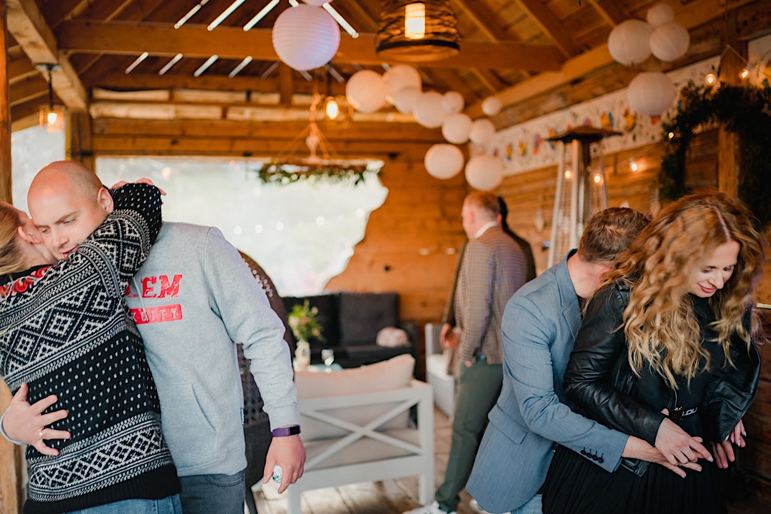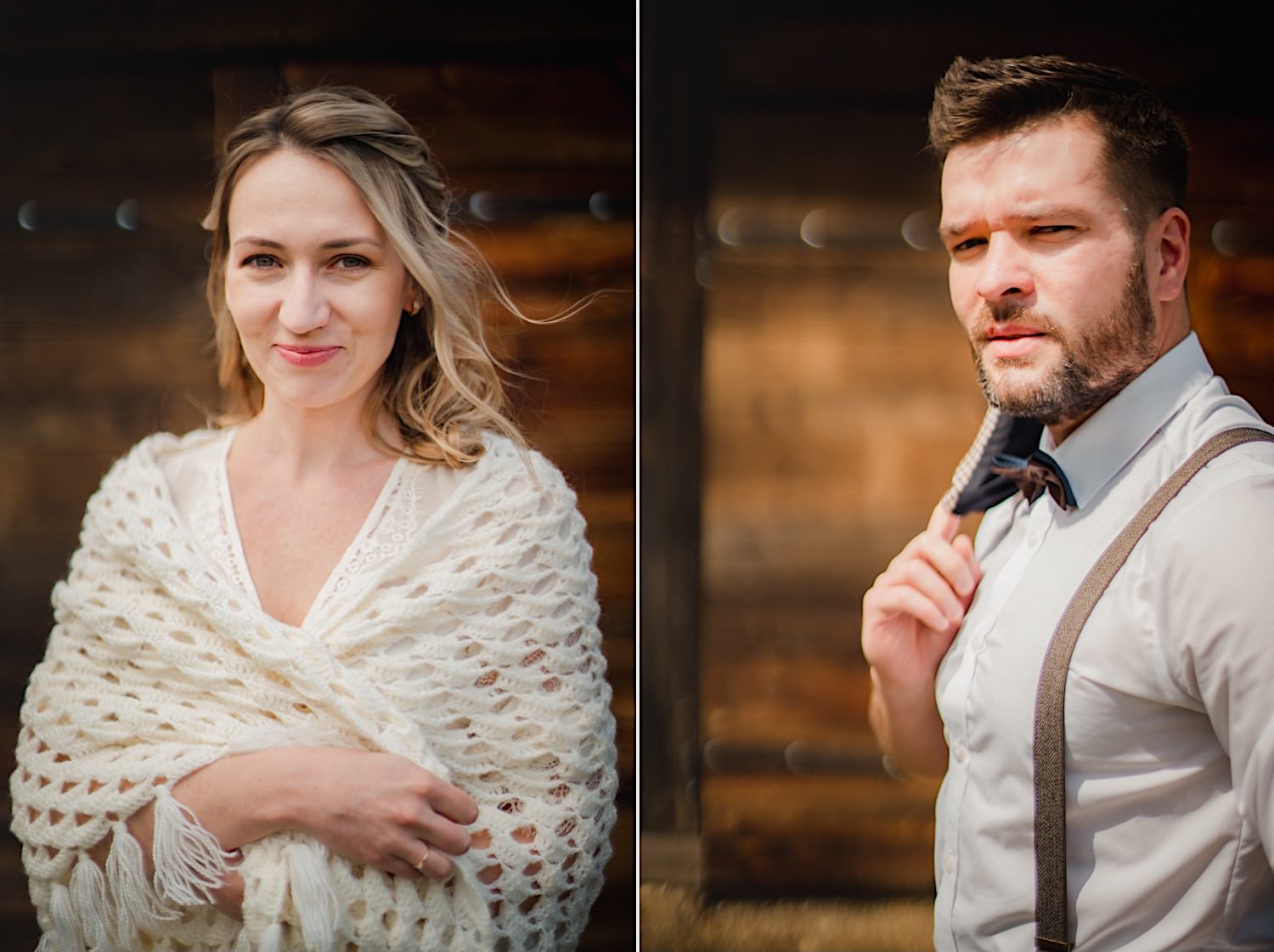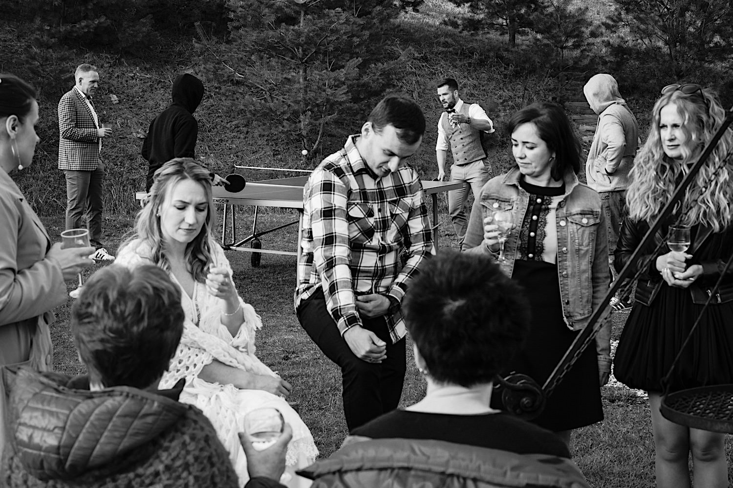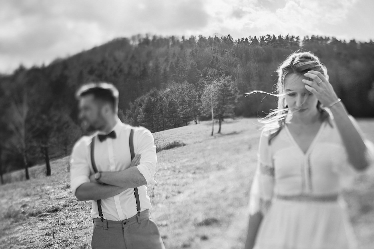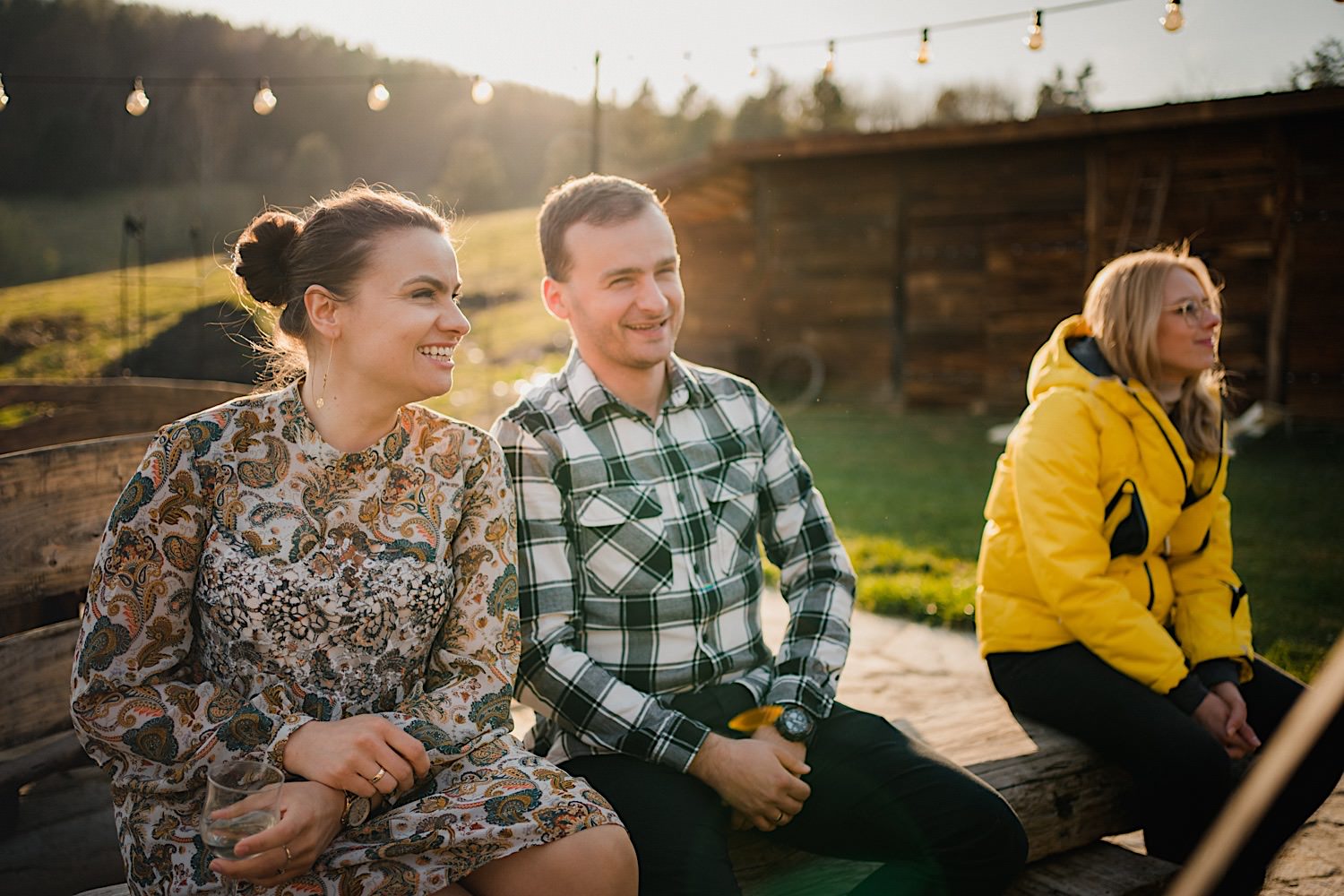 Na końcu (dosłownie!) długiej i krętej drogi ujrzałem bramę Maciejewki. Z daleka czuć niepowtarzalny Bieszczadzki klimat, który stworzyli niezwykle uśmiechnięci, gościnni i pełni pasji właścieciele. Zewsząd czuć rodzinną, przyjazną atmosferę. Po pokonaniu kilku (nastu) schodków spotkałem roześmianą i wyluzowaną bandę. Jeszcze bez dwójki najważniejszych bohaterów. Sporo rozmów, żartów, rodzinnej rywalizacji w tenisa stołowego (przecież nie napiszę ping-ponga we wpisie o absolwencie AWFu!). Ola z Markiem chcieli mieć lepsze wejście dlatego kazali na siebie trooooszkę poczekać. Takie też mieli 🙂 Ekspresowe ubieranie i w drogę do Urzędy Stanu Cywilnego w Baligrodzie. Tam przemiła Pani, która poprowadziła ceremonię w świetnej atmosferze 🙂 Obrączki na palce, kilka formalnych fotek i powrót do Maciejewki. Na miejscu czekała już rodzina i najbliżsi przyjaciele. Toast, emocjonalne życzenia, wegetariański pyszny obiadek, chwila strachu (chciał mnie zjeść przeuroczy pies, który jak zobaczył gościa z aparatami to pomylił mnie chyba z transformersem) i korzystając z pięknych i malowniczych okoliczności ruszyliśmy na 30 minutową sesję. Liska na sesji już miałem, tym razem przyszła pora na Żubry i to nie te na butelce, a prawdziwe! Troszkę przytulania, wygłupów, biegania i powrót do gości, którzy czekali już przy grillu. A tam jak przez cały dzień. Na luzie, bez zbędnej napinki, z wszechobecnym uśmiechem. Wyczekałem pierwszych tańców i na tym mój udział w tym pięknym i wyjątkowym wydarzeniu się skończył.