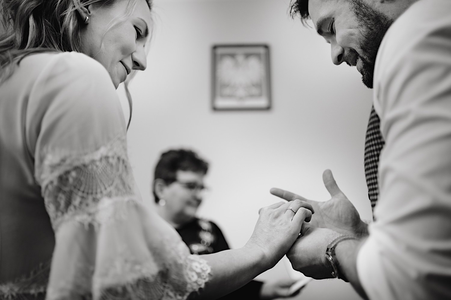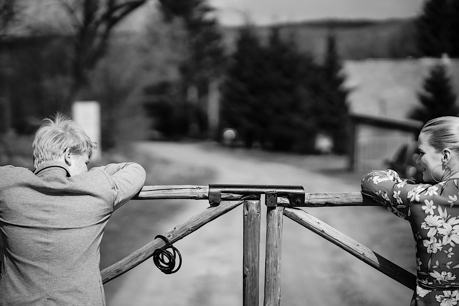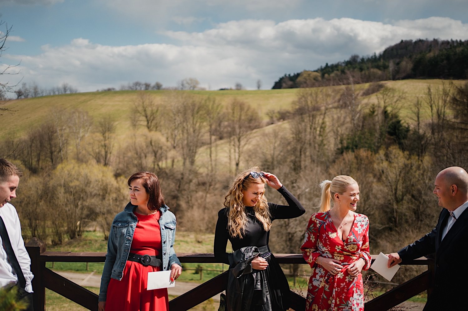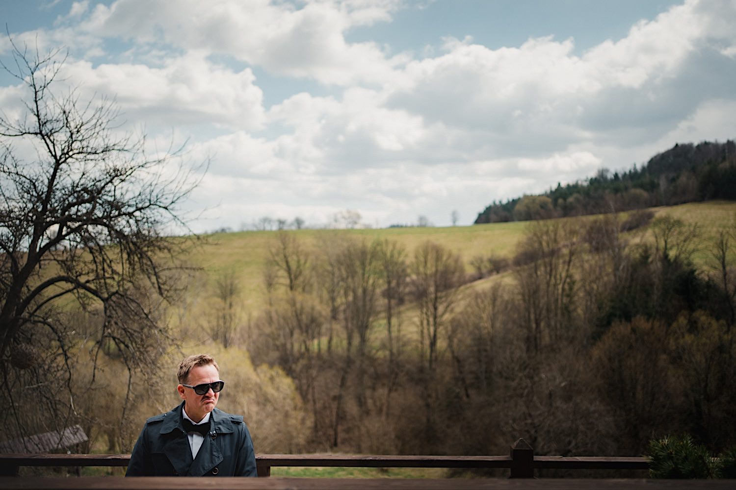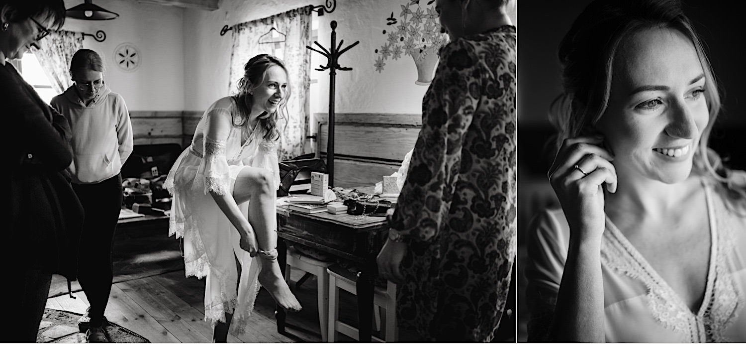 Na końcu (dosłownie!) długiej i krętej drogi ujrzałem bramę Maciejewki. Z daleka czuć niepowtarzalny Bieszczadzki klimat, który stworzyli niezwykle uśmiechnięci, gościnni i pełni pasji właścieciele. Zewsząd czuć rodzinną, przyjazną atmosferę. Po pokonaniu kilku (nastu) schodków spotkałem roześmianą i wyluzowaną bandę. Jeszcze bez dwójki najważniejszych bohaterów. Sporo rozmów, żartów, rodzinnej rywalizacji w tenisa stołowego (przecież nie napiszę ping-ponga we wpisie o absolwencie AWFu!). Ola z Markiem chcieli mieć lepsze wejście dlatego kazali na siebie trooooszkę poczekać. Takie też mieli 🙂 Ekspresowe ubieranie i w drogę do Urzędy Stanu Cywilnego w Baligrodzie. Tam przemiła Pani, która poprowadziła ceremonię w świetnej atmosferze 🙂 Obrączki na palce, kilka formalnych fotek i powrót do Maciejewki. Na miejscu czekała już rodzina i najbliżsi przyjaciele. Toast, emocjonalne życzenia, wegetariański pyszny obiadek, chwila strachu (chciał mnie zjeść przeuroczy pies, który jak zobaczył gościa z aparatami to pomylił mnie chyba z transformersem) i korzystając z pięknych i malowniczych okoliczności ruszyliśmy na 30 minutową sesję. Liska na sesji już miałem, tym razem przyszła pora na Żubry i to nie te na butelce, a prawdziwe! Troszkę przytulania, wygłupów, biegania i powrót do gości, którzy czekali już przy grillu. A tam jak przez cały dzień. Na luzie, bez zbędnej napinki, z wszechobecnym uśmiechem. Wyczekałem pierwszych tańców i na tym mój udział w tym pięknym i wyjątkowym wydarzeniu się skończył.