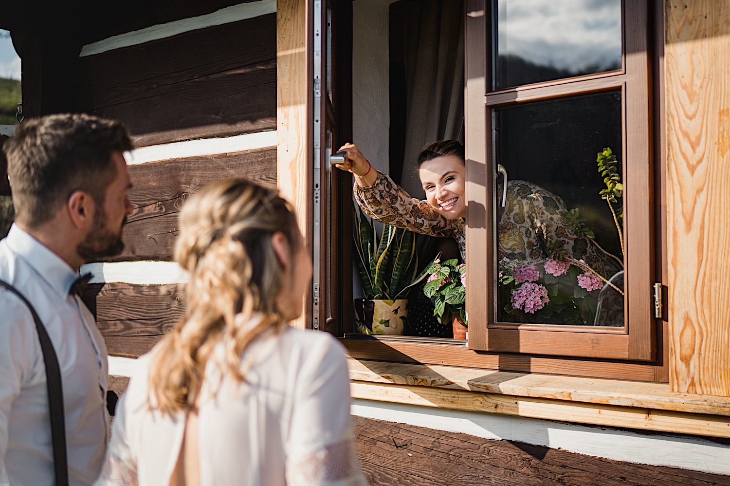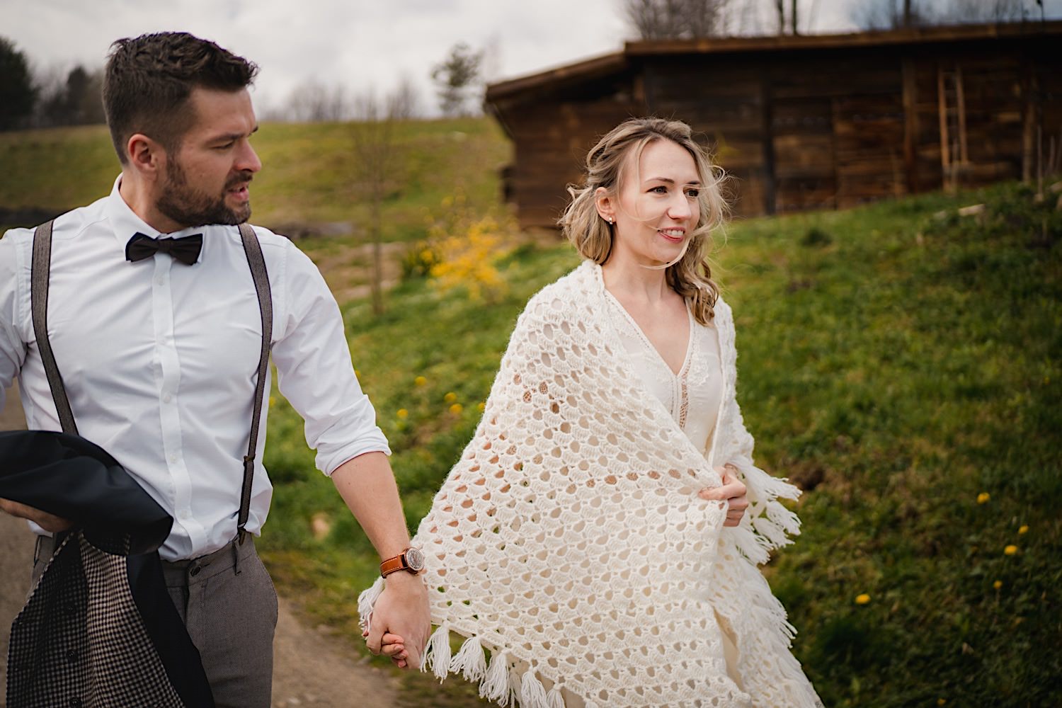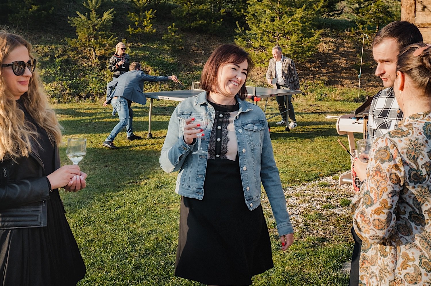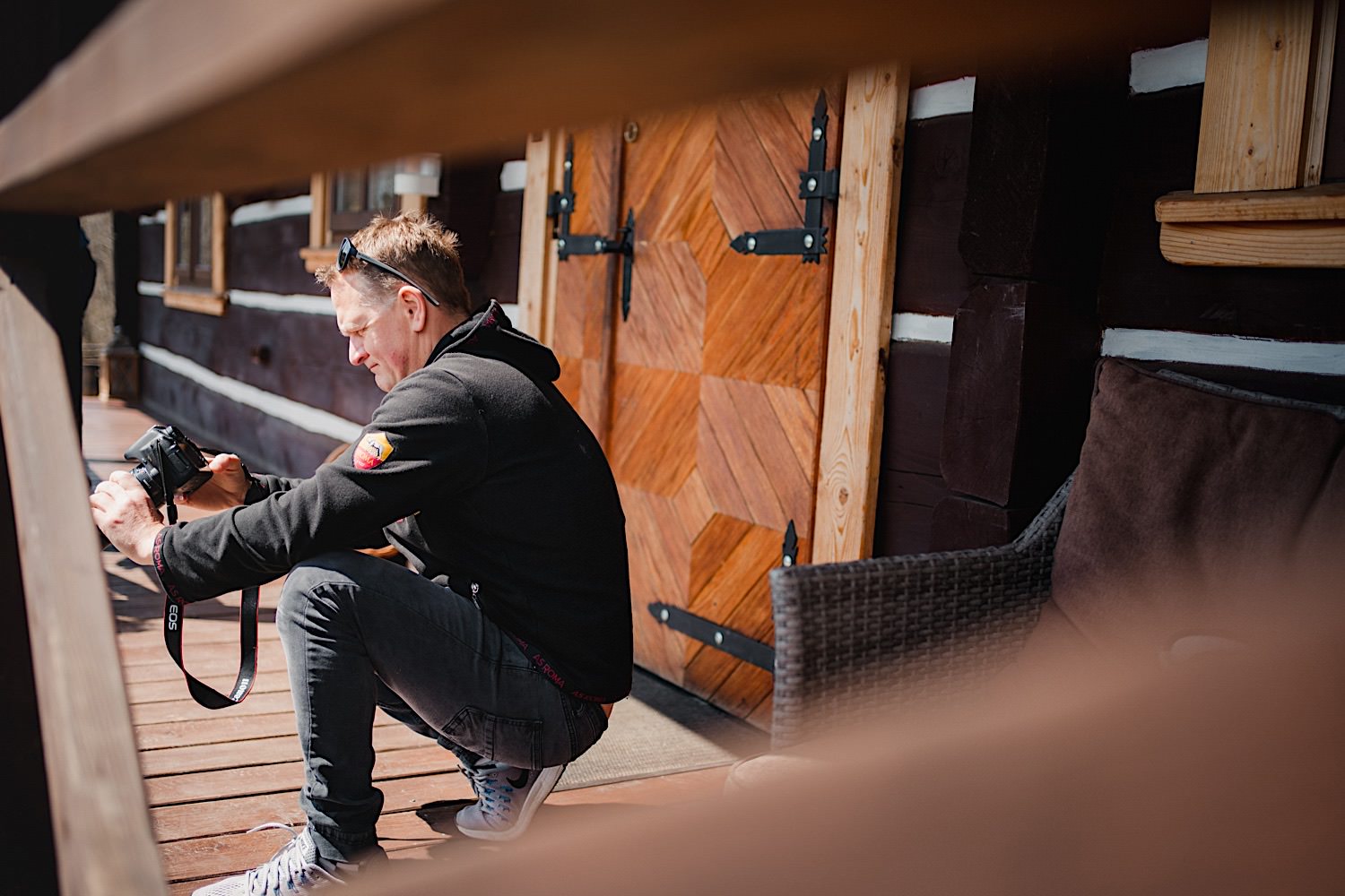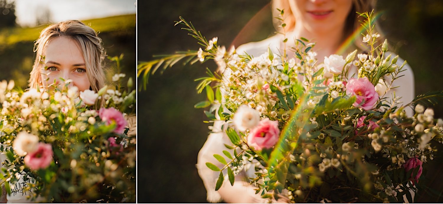Na końcu (dosłownie!) długiej i krętej drogi ujrzałem bramę Maciejewki. Z daleka czuć niepowtarzalny Bieszczadzki klimat, który stworzyli niezwykle uśmiechnięci, gościnni i pełni pasji właścieciele. Zewsząd czuć rodzinną, przyjazną atmosferę. Po pokonaniu kilku (nastu) schodków spotkałem roześmianą i wyluzowaną bandę. Jeszcze bez dwójki najważniejszych bohaterów. Sporo rozmów, żartów, rodzinnej rywalizacji w tenisa stołowego (przecież nie napiszę ping-ponga we wpisie o absolwencie AWFu!). Ola z Markiem chcieli mieć lepsze wejście dlatego kazali na siebie trooooszkę poczekać. Takie też mieli 🙂 Ekspresowe ubieranie i w drogę do Urzędy Stanu Cywilnego w Baligrodzie. Tam przemiła Pani, która poprowadziła ceremonię w świetnej atmosferze 🙂 Obrączki na palce, kilka formalnych fotek i powrót do Maciejewki. Na miejscu czekała już rodzina i najbliżsi przyjaciele. Toast, emocjonalne życzenia, wegetariański pyszny obiadek, chwila strachu (chciał mnie zjeść przeuroczy pies, który jak zobaczył gościa z aparatami to pomylił mnie chyba z transformersem) i korzystając z pięknych i malowniczych okoliczności ruszyliśmy na 30 minutową sesję. Liska na sesji już miałem, tym razem przyszła pora na Żubry i to nie te na butelce, a prawdziwe! Troszkę przytulania, wygłupów, biegania i powrót do gości, którzy czekali już przy grillu. A tam jak przez cały dzień. Na luzie, bez zbędnej napinki, z wszechobecnym uśmiechem. Wyczekałem pierwszych tańców i na tym mój udział w tym pięknym i wyjątkowym wydarzeniu się skończył.