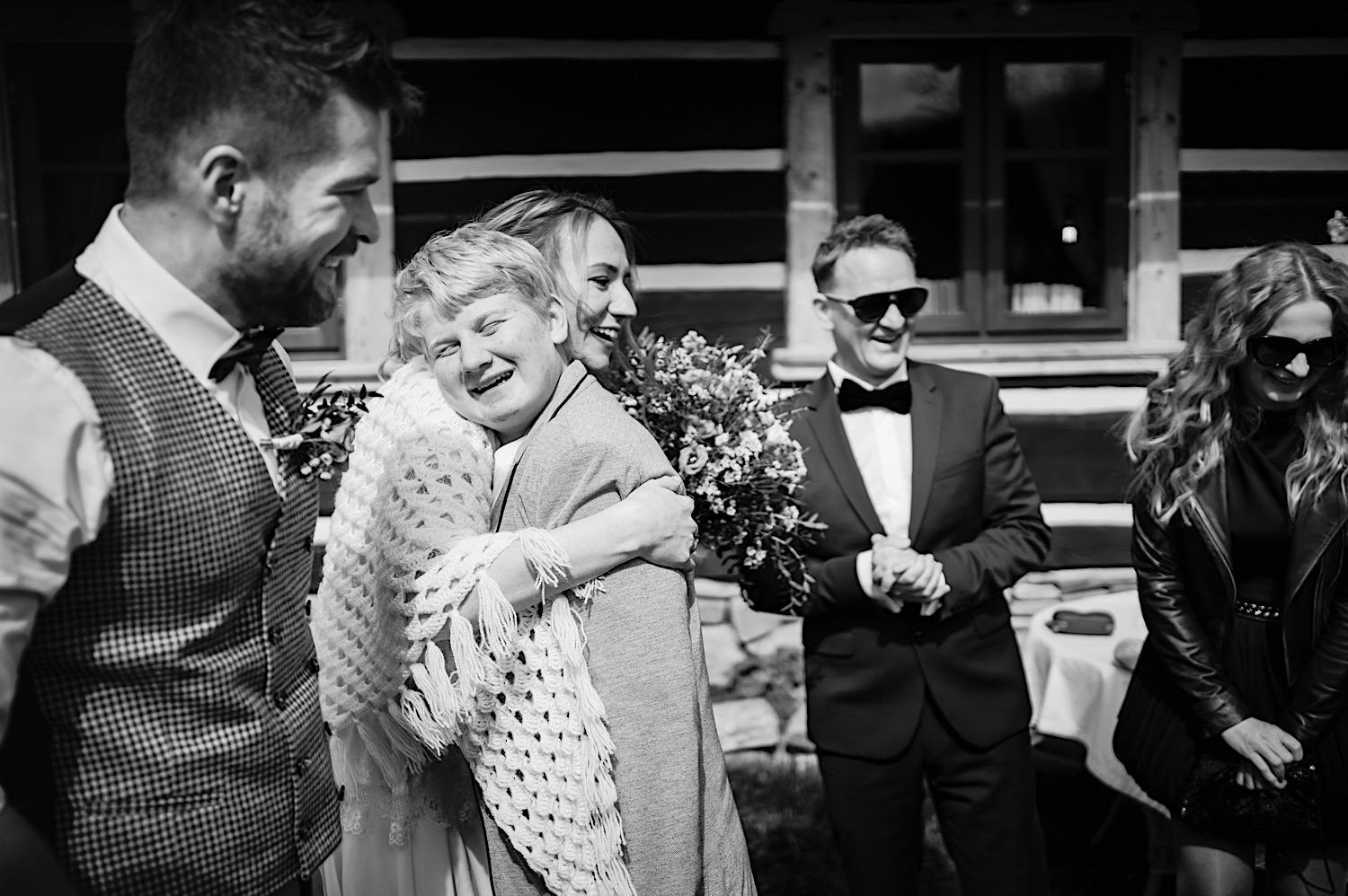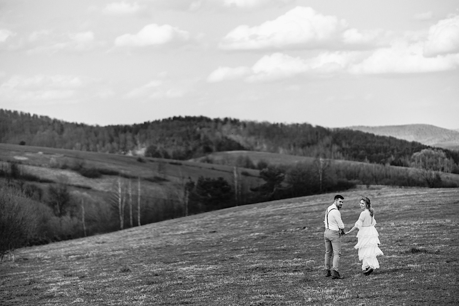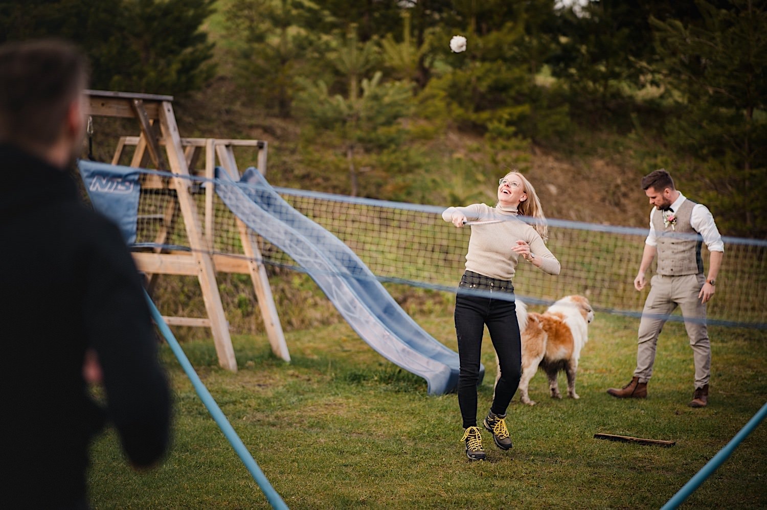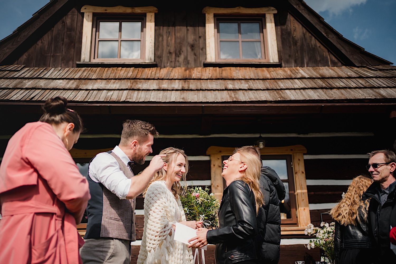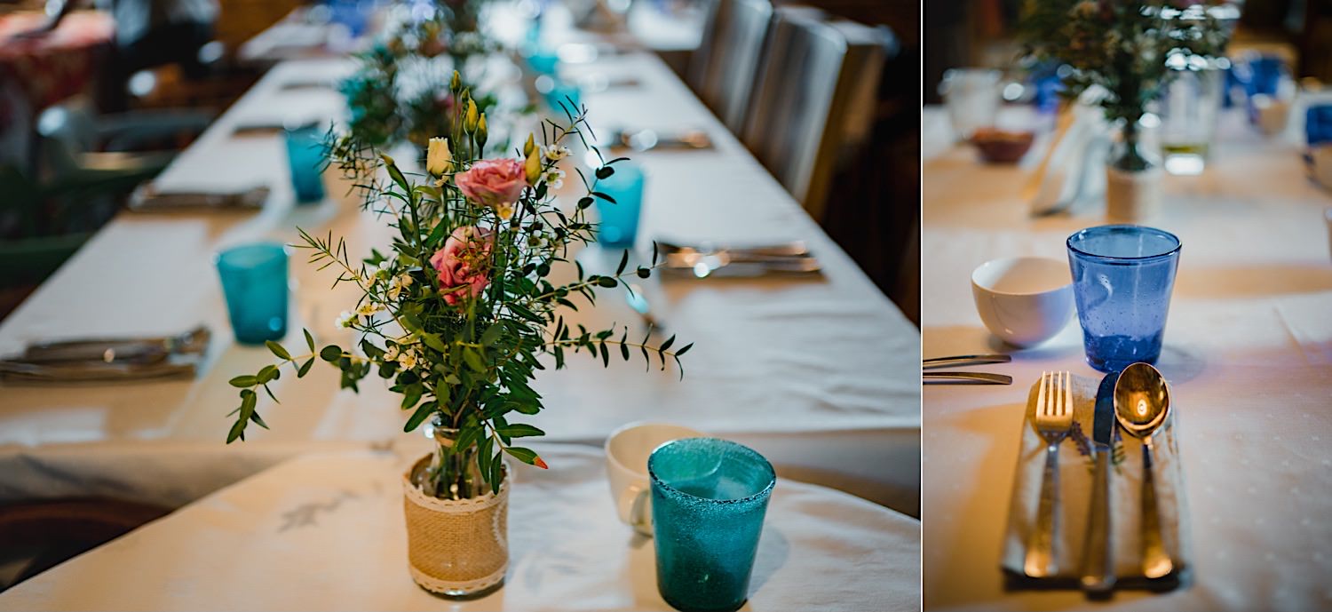 Na końcu (dosłownie!) długiej i krętej drogi ujrzałem bramę Maciejewki. Z daleka czuć niepowtarzalny Bieszczadzki klimat, który stworzyli niezwykle uśmiechnięci, gościnni i pełni pasji właścieciele. Zewsząd czuć rodzinną, przyjazną atmosferę. Po pokonaniu kilku (nastu) schodków spotkałem roześmianą i wyluzowaną bandę. Jeszcze bez dwójki najważniejszych bohaterów. Sporo rozmów, żartów, rodzinnej rywalizacji w tenisa stołowego (przecież nie napiszę ping-ponga we wpisie o absolwencie AWFu!). Ola z Markiem chcieli mieć lepsze wejście dlatego kazali na siebie trooooszkę poczekać. Takie też mieli 🙂 Ekspresowe ubieranie i w drogę do Urzędy Stanu Cywilnego w Baligrodzie. Tam przemiła Pani, która poprowadziła ceremonię w świetnej atmosferze 🙂 Obrączki na palce, kilka formalnych fotek i powrót do Maciejewki. Na miejscu czekała już rodzina i najbliżsi przyjaciele. Toast, emocjonalne życzenia, wegetariański pyszny obiadek, chwila strachu (chciał mnie zjeść przeuroczy pies, który jak zobaczył gościa z aparatami to pomylił mnie chyba z transformersem) i korzystając z pięknych i malowniczych okoliczności ruszyliśmy na 30 minutową sesję. Liska na sesji już miałem, tym razem przyszła pora na Żubry i to nie te na butelce, a prawdziwe! Troszkę przytulania, wygłupów, biegania i powrót do gości, którzy czekali już przy grillu. A tam jak przez cały dzień. Na luzie, bez zbędnej napinki, z wszechobecnym uśmiechem. Wyczekałem pierwszych tańców i na tym mój udział w tym pięknym i wyjątkowym wydarzeniu się skończył.