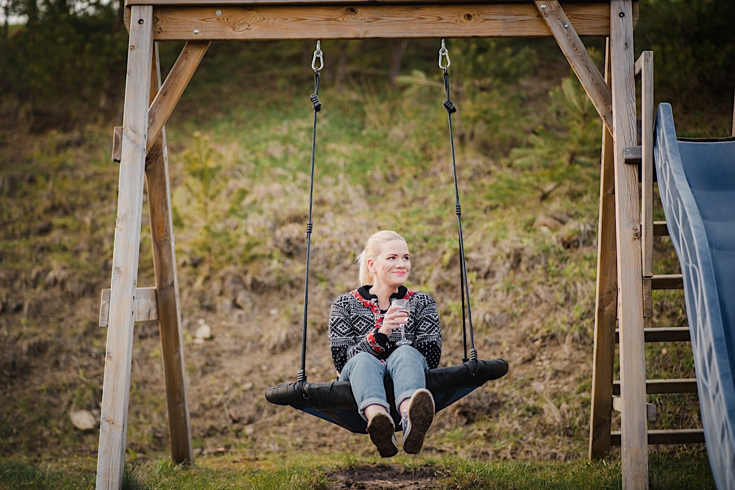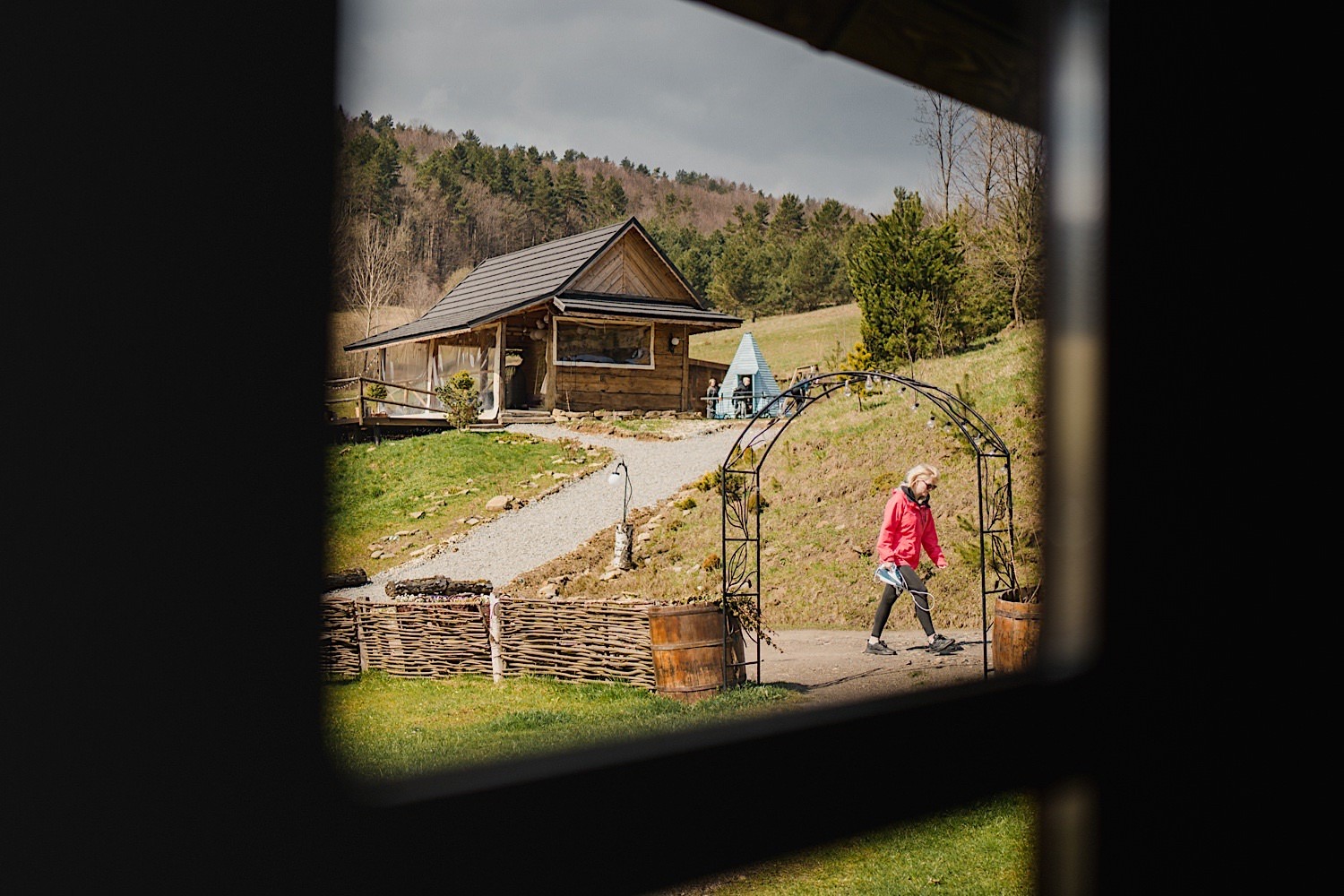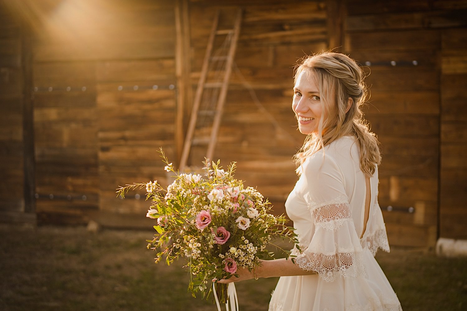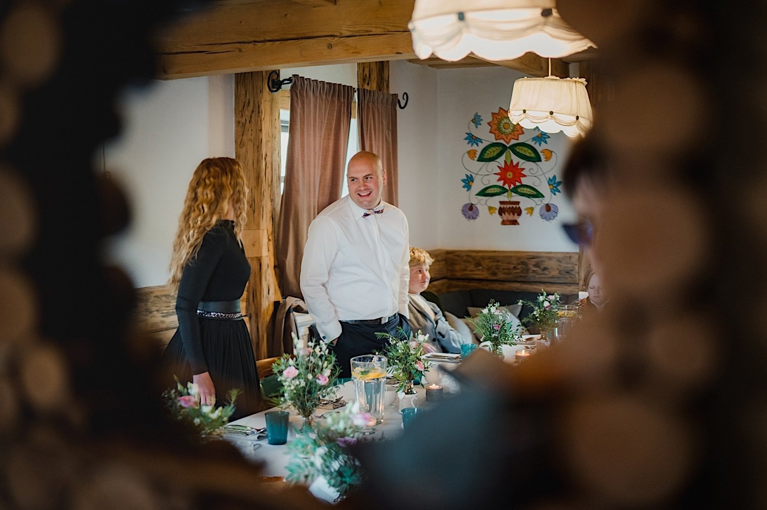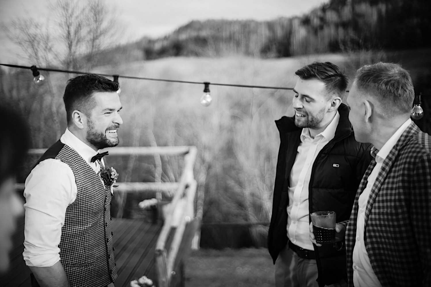 Na końcu (dosłownie!) długiej i krętej drogi ujrzałem bramę Maciejewki. Z daleka czuć niepowtarzalny Bieszczadzki klimat, który stworzyli niezwykle uśmiechnięci, gościnni i pełni pasji właścieciele. Zewsząd czuć rodzinną, przyjazną atmosferę. Po pokonaniu kilku (nastu) schodków spotkałem roześmianą i wyluzowaną bandę. Jeszcze bez dwójki najważniejszych bohaterów. Sporo rozmów, żartów, rodzinnej rywalizacji w tenisa stołowego (przecież nie napiszę ping-ponga we wpisie o absolwencie AWFu!). Ola z Markiem chcieli mieć lepsze wejście dlatego kazali na siebie trooooszkę poczekać. Takie też mieli 🙂 Ekspresowe ubieranie i w drogę do Urzędy Stanu Cywilnego w Baligrodzie. Tam przemiła Pani, która poprowadziła ceremonię w świetnej atmosferze 🙂 Obrączki na palce, kilka formalnych fotek i powrót do Maciejewki. Na miejscu czekała już rodzina i najbliżsi przyjaciele. Toast, emocjonalne życzenia, wegetariański pyszny obiadek, chwila strachu (chciał mnie zjeść przeuroczy pies, który jak zobaczył gościa z aparatami to pomylił mnie chyba z transformersem) i korzystając z pięknych i malowniczych okoliczności ruszyliśmy na 30 minutową sesję. Liska na sesji już miałem, tym razem przyszła pora na Żubry i to nie te na butelce, a prawdziwe! Troszkę przytulania, wygłupów, biegania i powrót do gości, którzy czekali już przy grillu. A tam jak przez cały dzień. Na luzie, bez zbędnej napinki, z wszechobecnym uśmiechem. Wyczekałem pierwszych tańców i na tym mój udział w tym pięknym i wyjątkowym wydarzeniu się skończył.