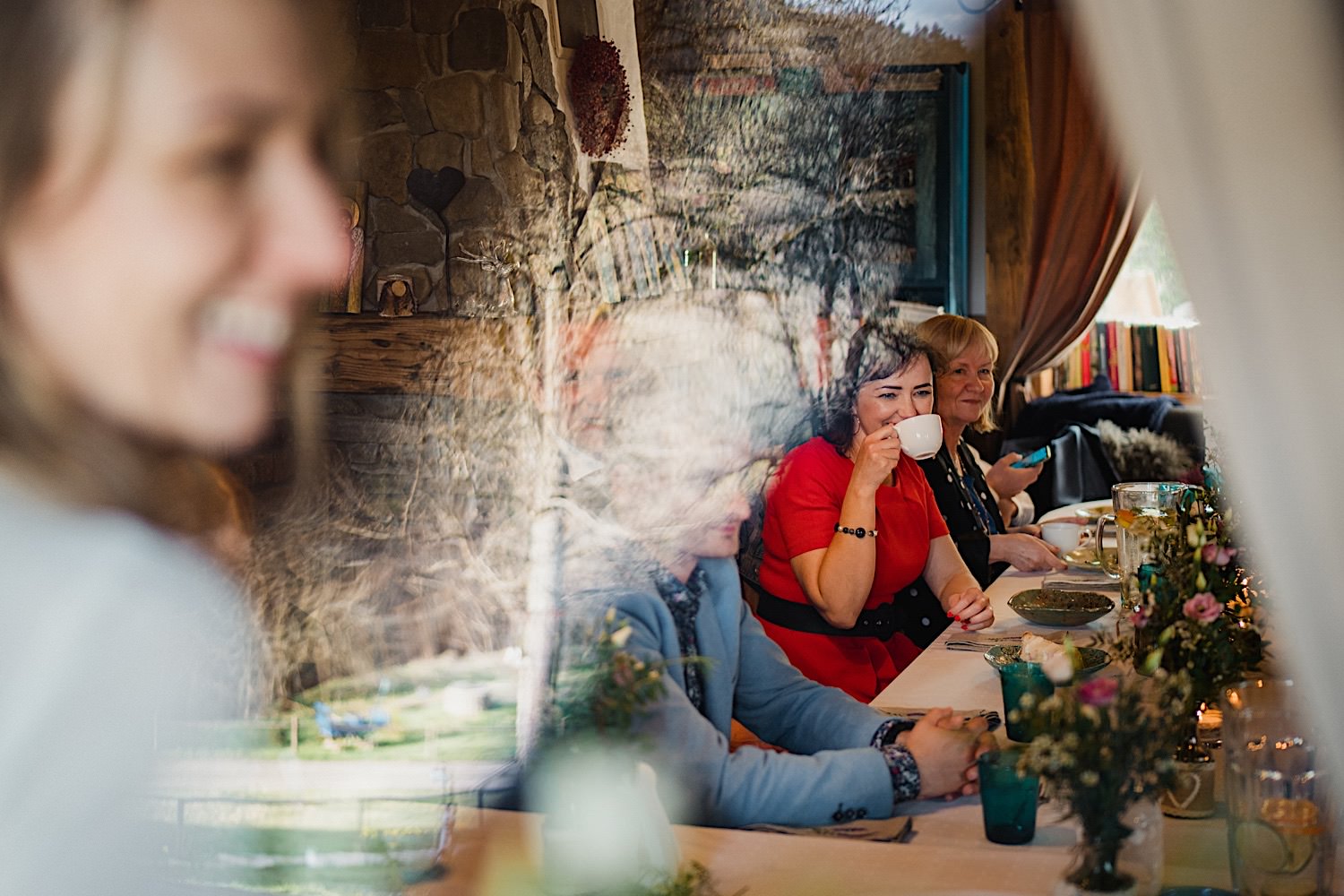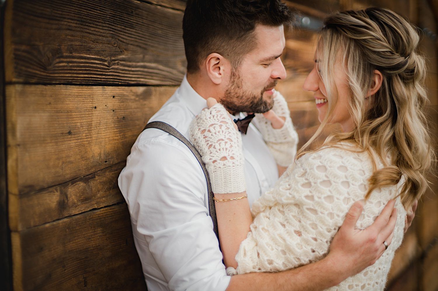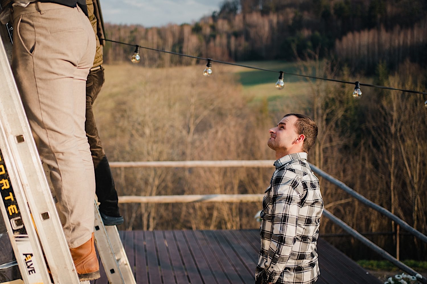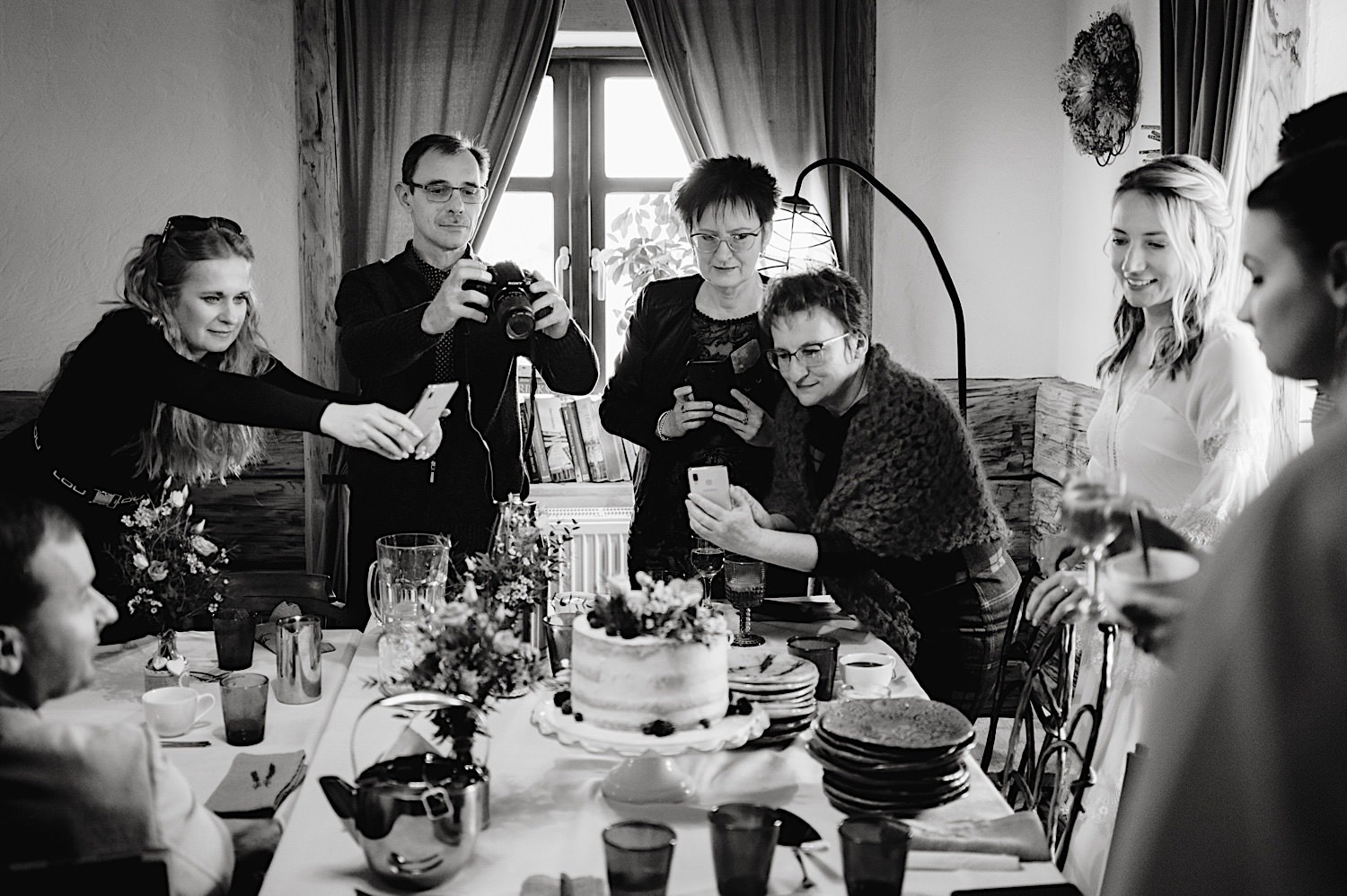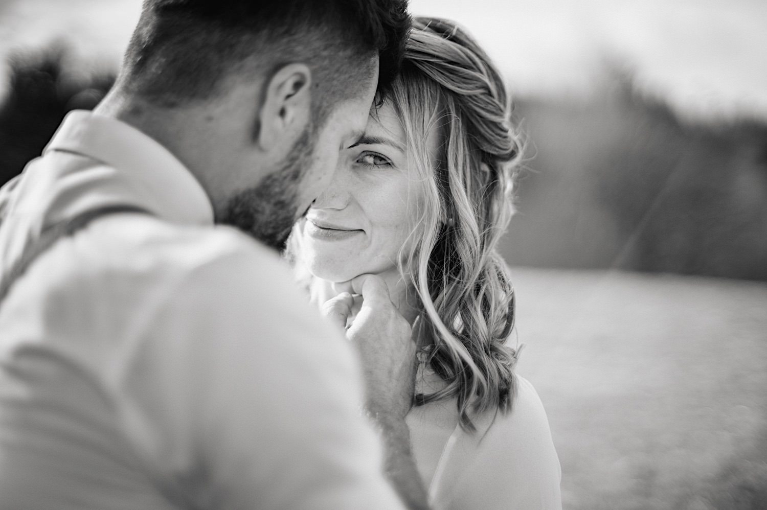 Na końcu (dosłownie!) długiej i krętej drogi ujrzałem bramę Maciejewki. Z daleka czuć niepowtarzalny Bieszczadzki klimat, który stworzyli niezwykle uśmiechnięci, gościnni i pełni pasji właścieciele. Zewsząd czuć rodzinną, przyjazną atmosferę. Po pokonaniu kilku (nastu) schodków spotkałem roześmianą i wyluzowaną bandę. Jeszcze bez dwójki najważniejszych bohaterów. Sporo rozmów, żartów, rodzinnej rywalizacji w tenisa stołowego (przecież nie napiszę ping-ponga we wpisie o absolwencie AWFu!). Ola z Markiem chcieli mieć lepsze wejście dlatego kazali na siebie trooooszkę poczekać. Takie też mieli 🙂 Ekspresowe ubieranie i w drogę do Urzędy Stanu Cywilnego w Baligrodzie. Tam przemiła Pani, która poprowadziła ceremonię w świetnej atmosferze 🙂 Obrączki na palce, kilka formalnych fotek i powrót do Maciejewki. Na miejscu czekała już rodzina i najbliżsi przyjaciele. Toast, emocjonalne życzenia, wegetariański pyszny obiadek, chwila strachu (chciał mnie zjeść przeuroczy pies, który jak zobaczył gościa z aparatami to pomylił mnie chyba z transformersem) i korzystając z pięknych i malowniczych okoliczności ruszyliśmy na 30 minutową sesję. Liska na sesji już miałem, tym razem przyszła pora na Żubry i to nie te na butelce, a prawdziwe! Troszkę przytulania, wygłupów, biegania i powrót do gości, którzy czekali już przy grillu. A tam jak przez cały dzień. Na luzie, bez zbędnej napinki, z wszechobecnym uśmiechem. Wyczekałem pierwszych tańców i na tym mój udział w tym pięknym i wyjątkowym wydarzeniu się skończył.